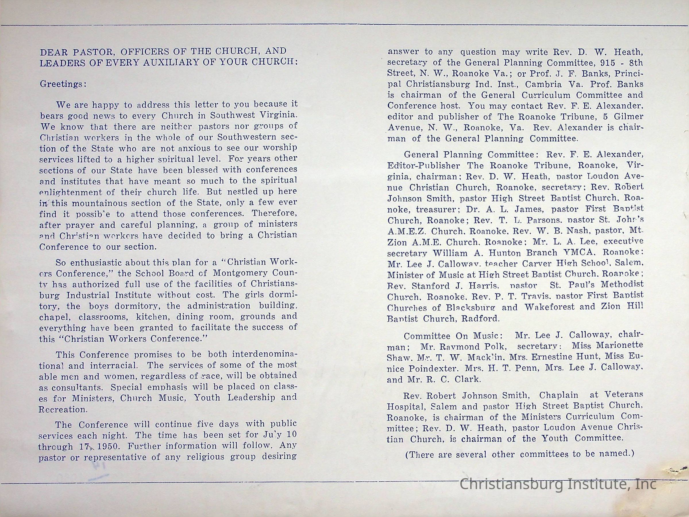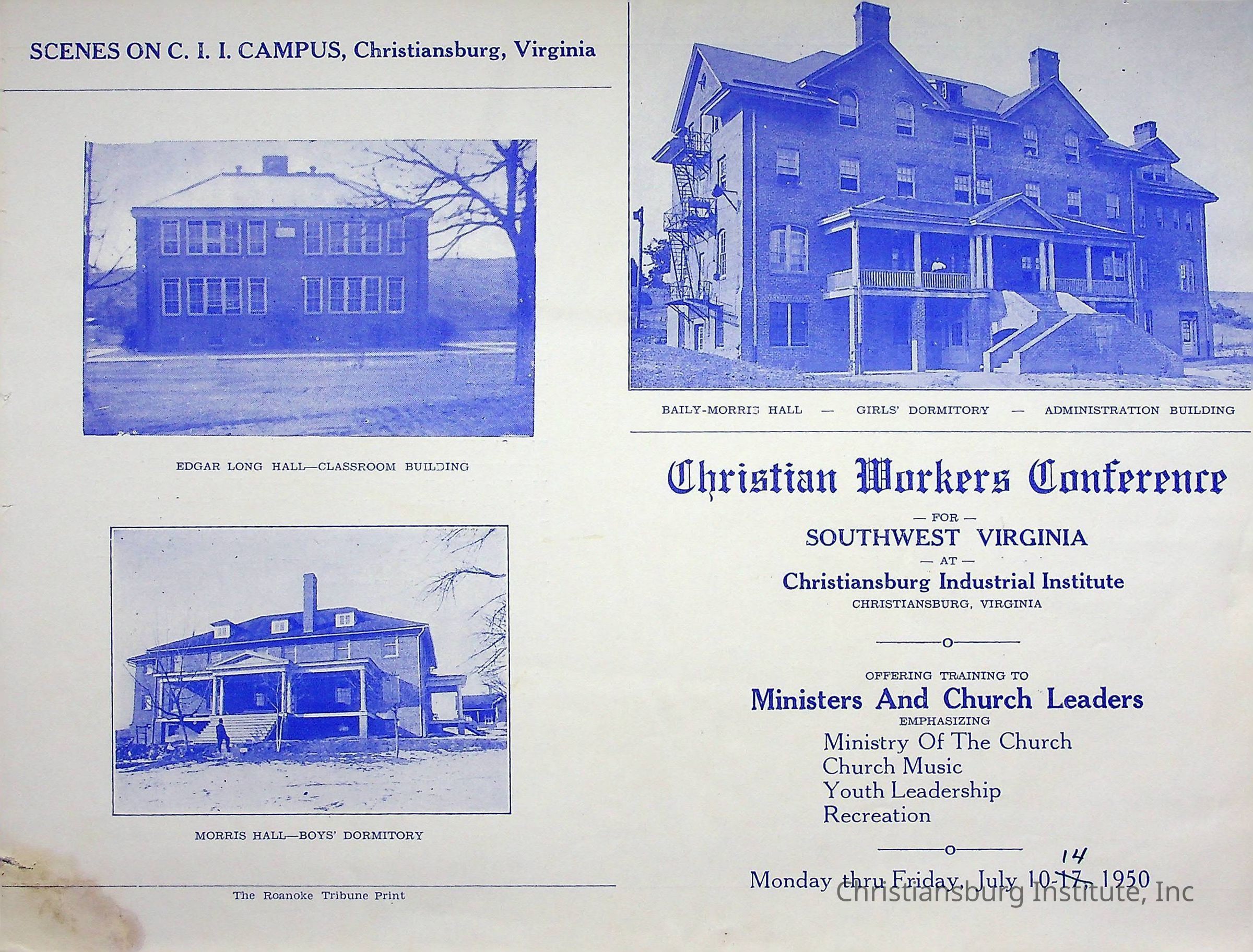 A brochure for the Christian Workers Conference and program for the VPI Ministers Summer School program held at Christiansburg Industrial Institute from July 10th-14th, 1950.Creator
