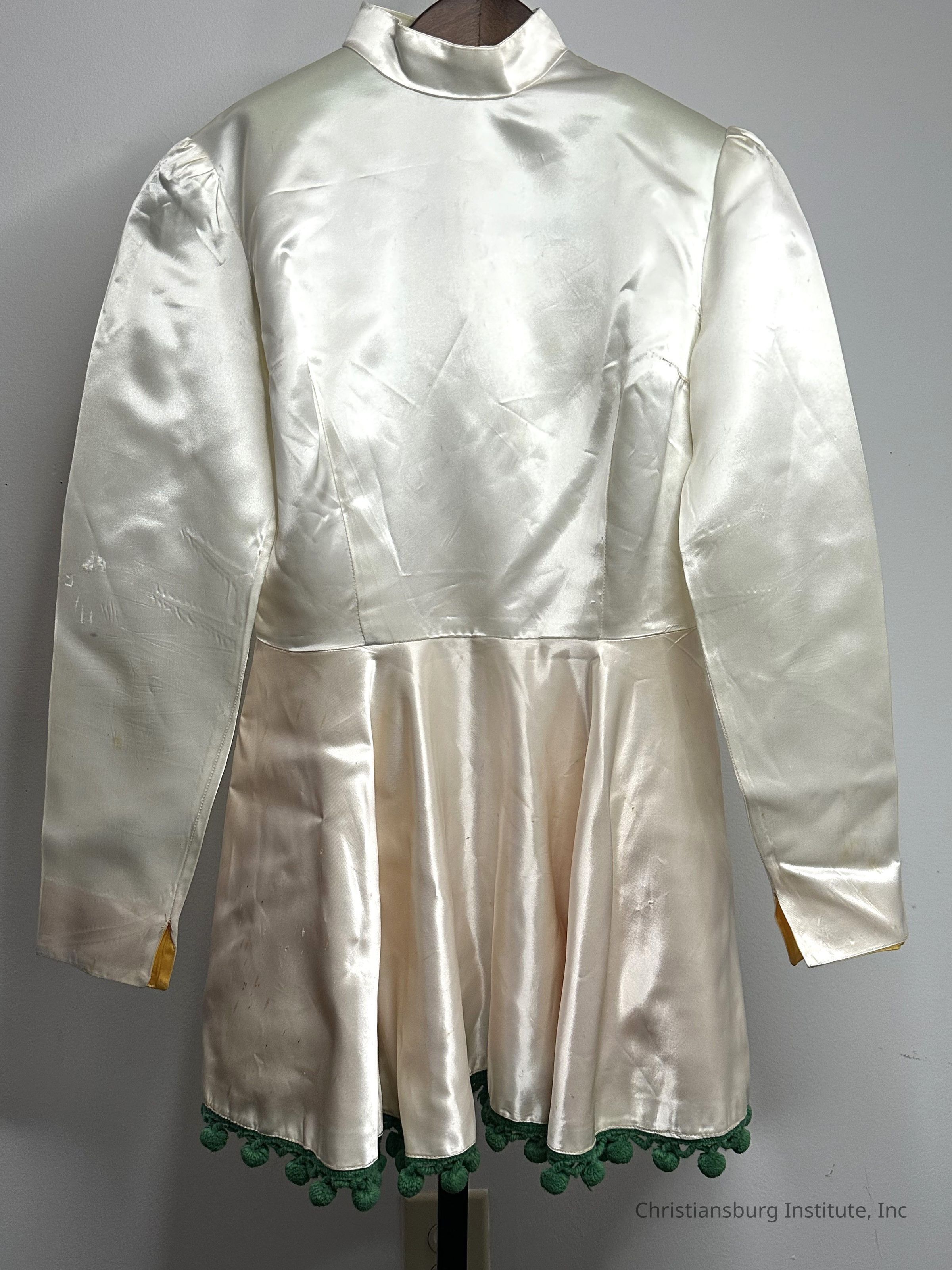 A white silk Christiansburg Institute cheerleader uniform with green trim on hem in fair condition, undated.Collection