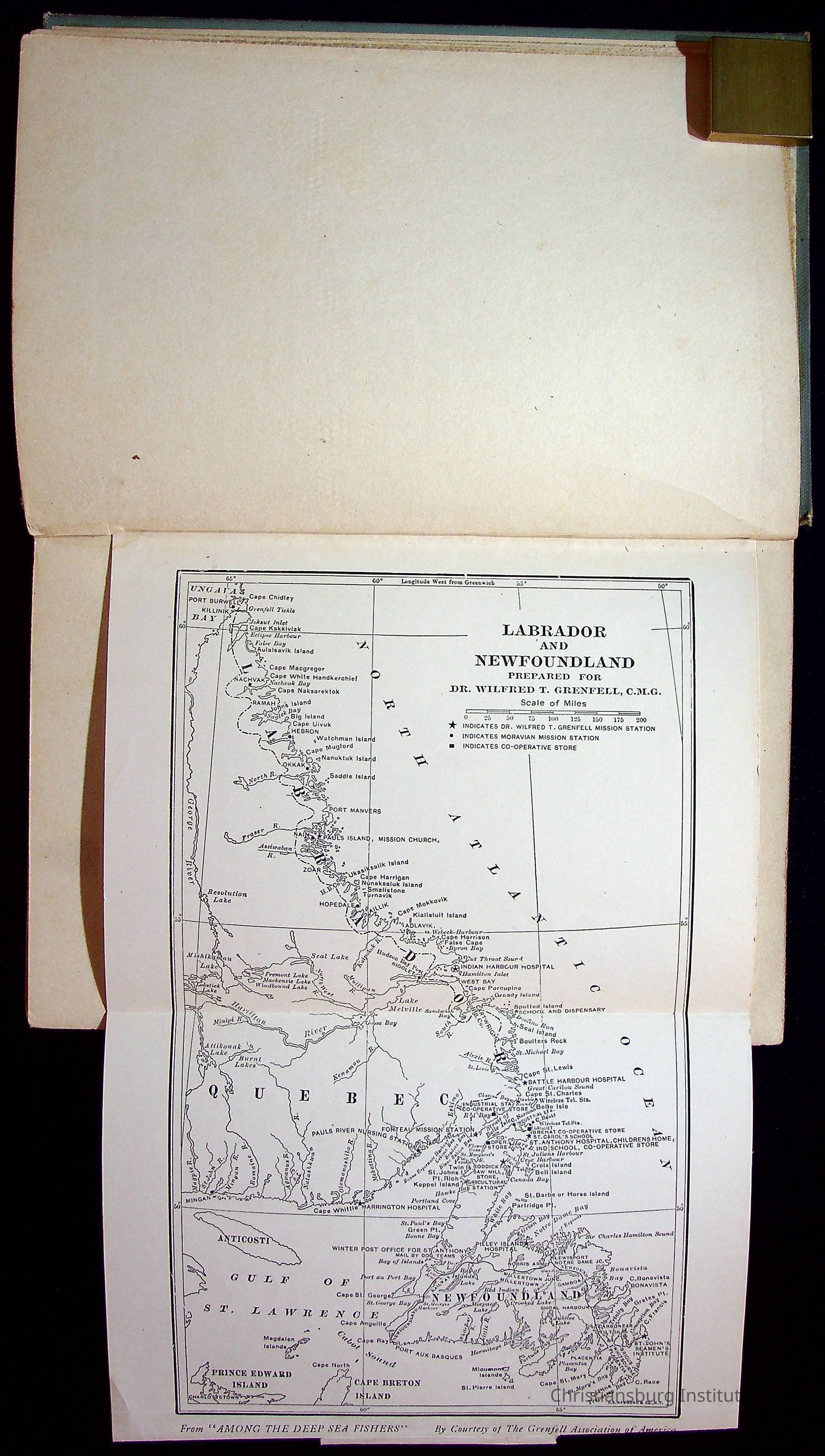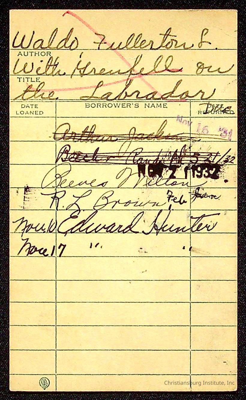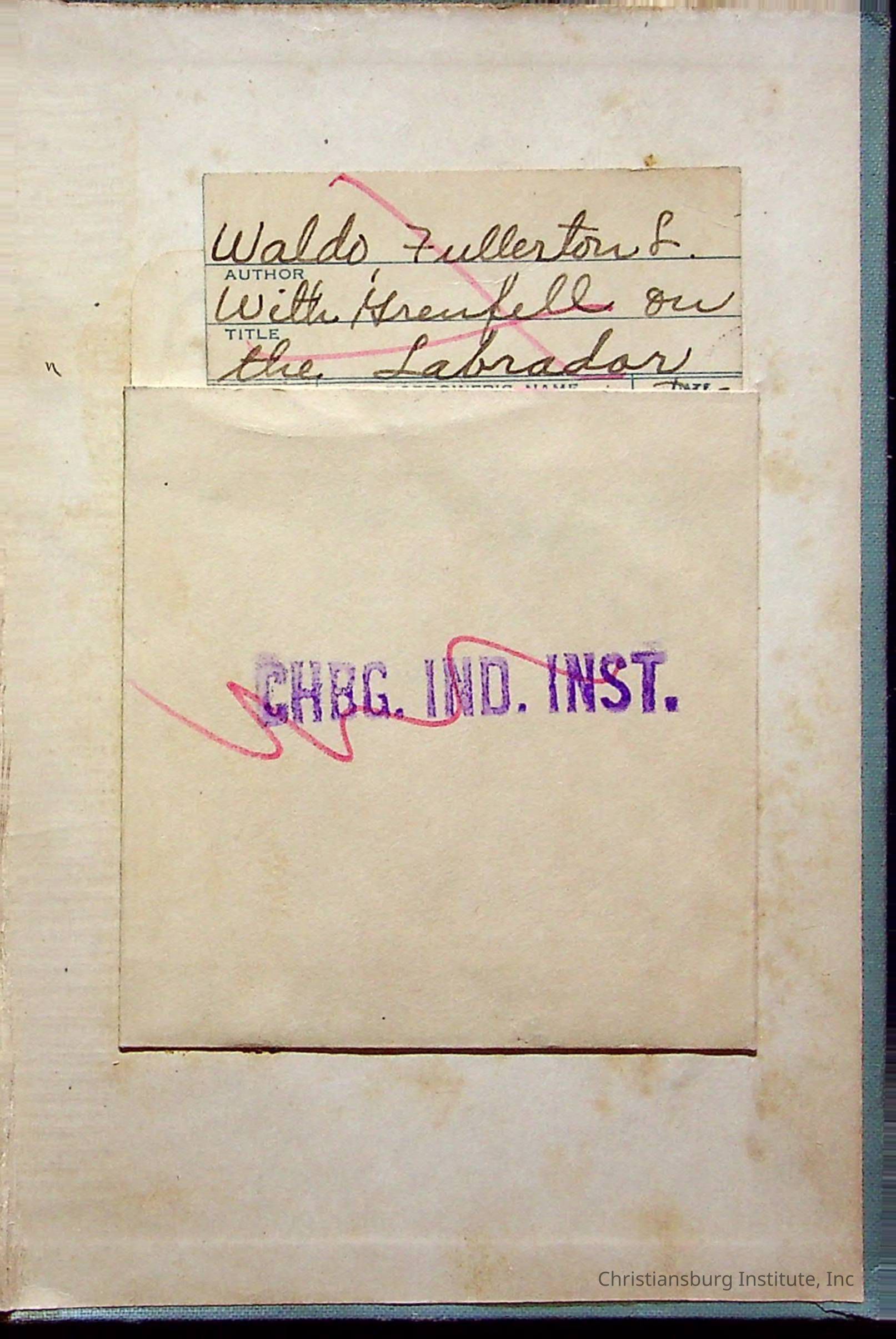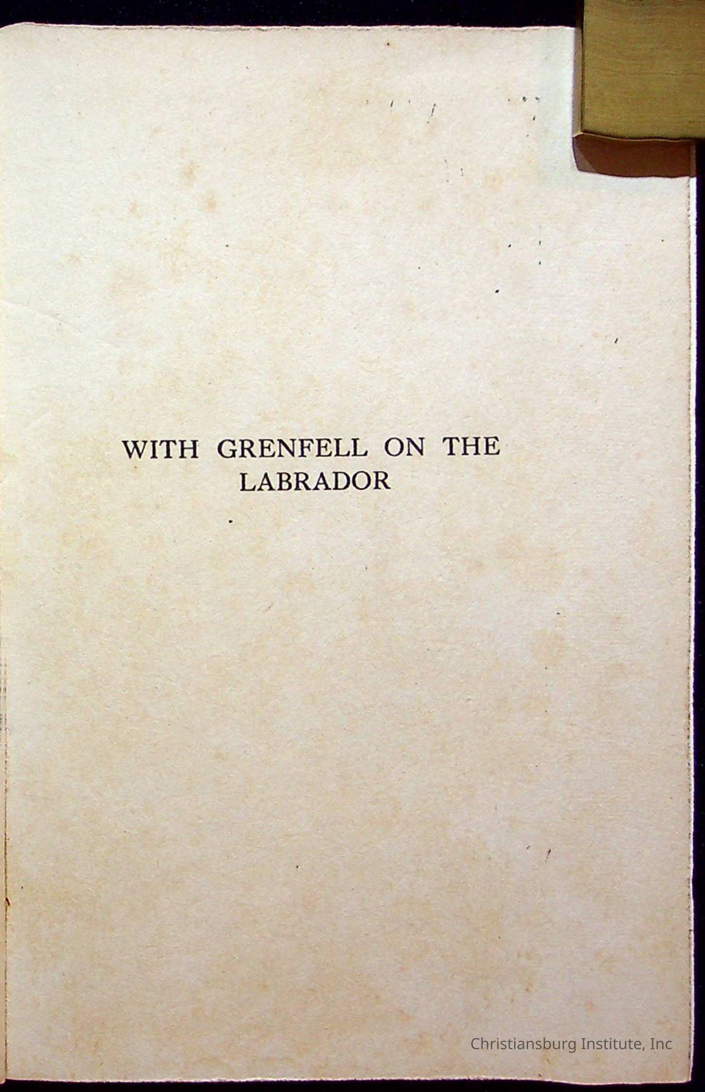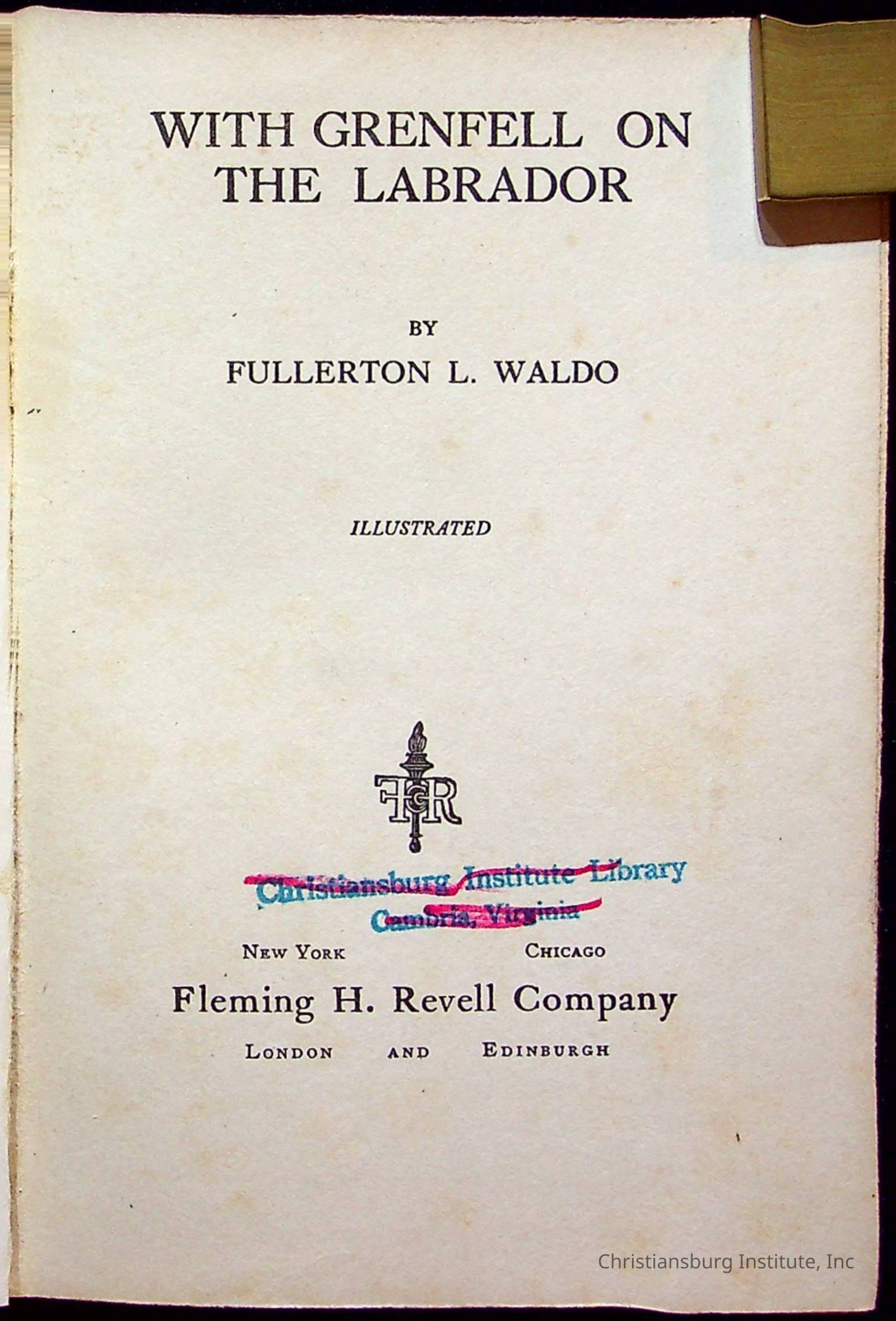 "With Grenfell on The Labrador" written by Fullerton L. Waldo and published by the Fleming H. Revell Company in the year 1920. The book was in the Christiansburg Institute library.
