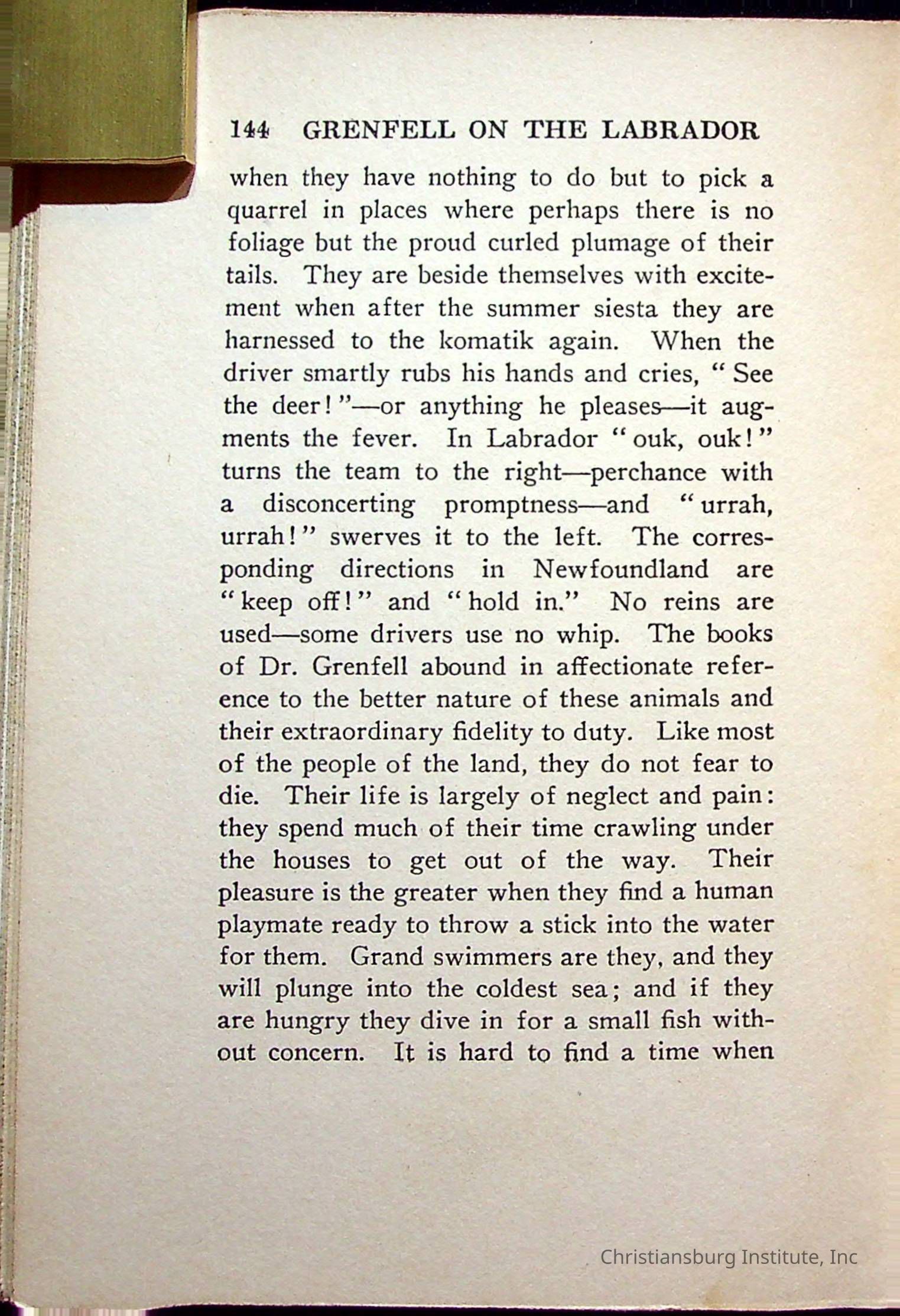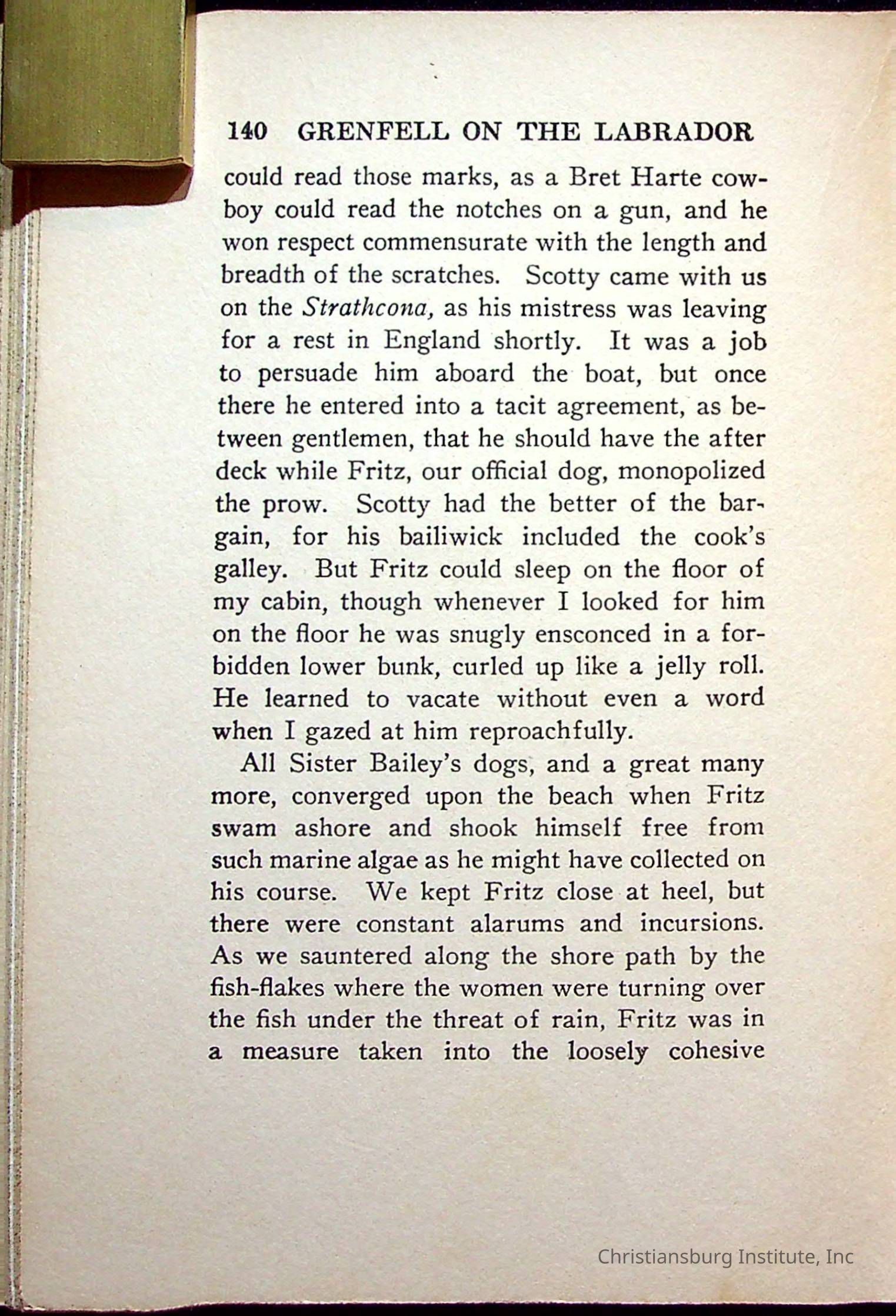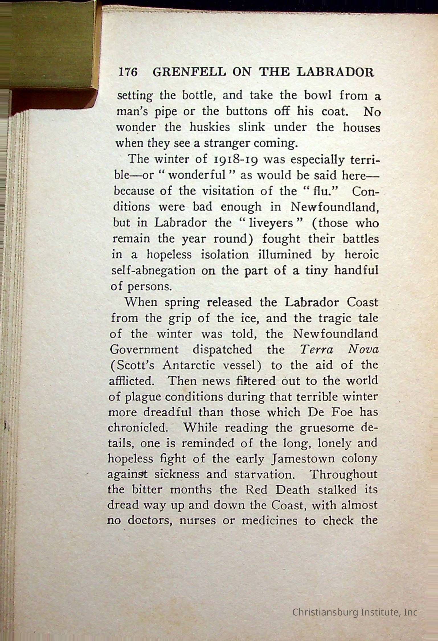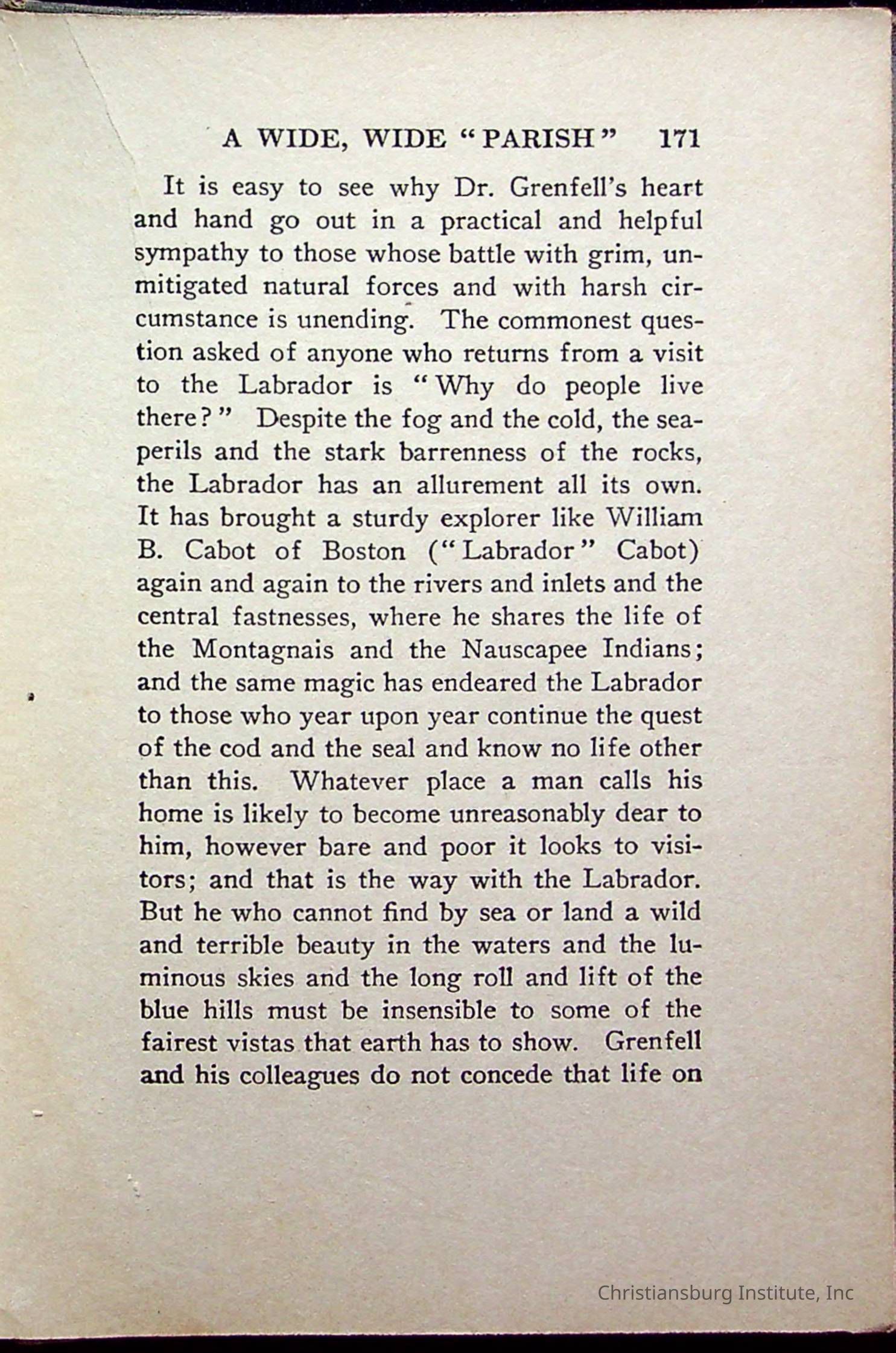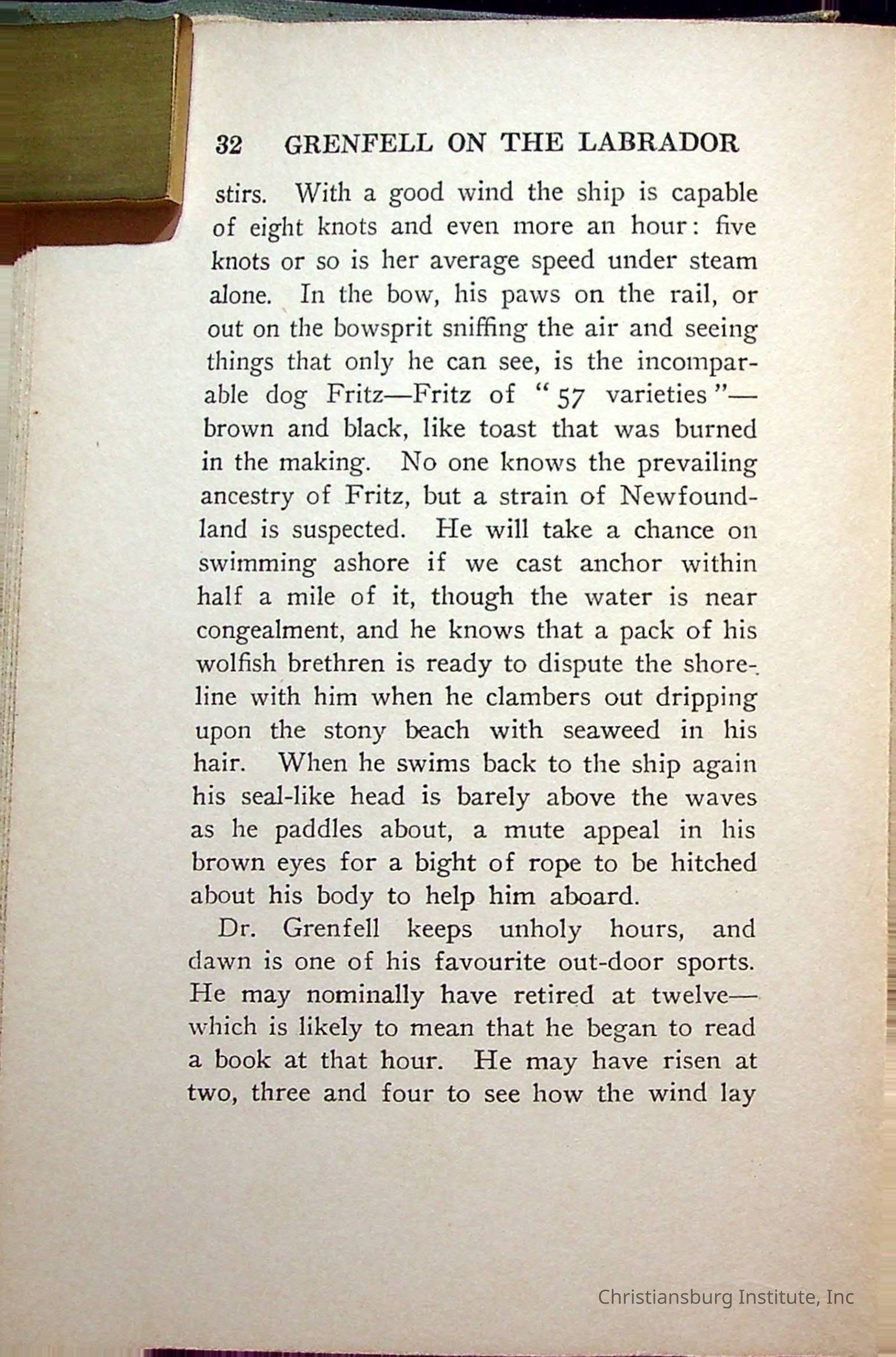 "With Grenfell on The Labrador" written by Fullerton L. Waldo and published by the Fleming H. Revell Company in the year 1920. The book was in the Christiansburg Institute library.