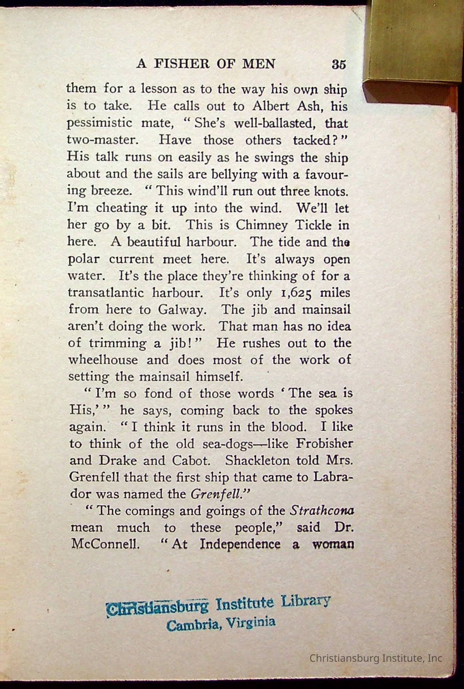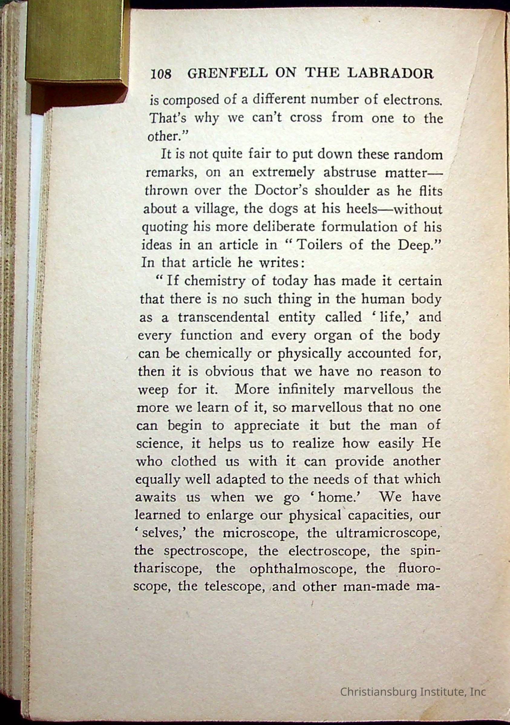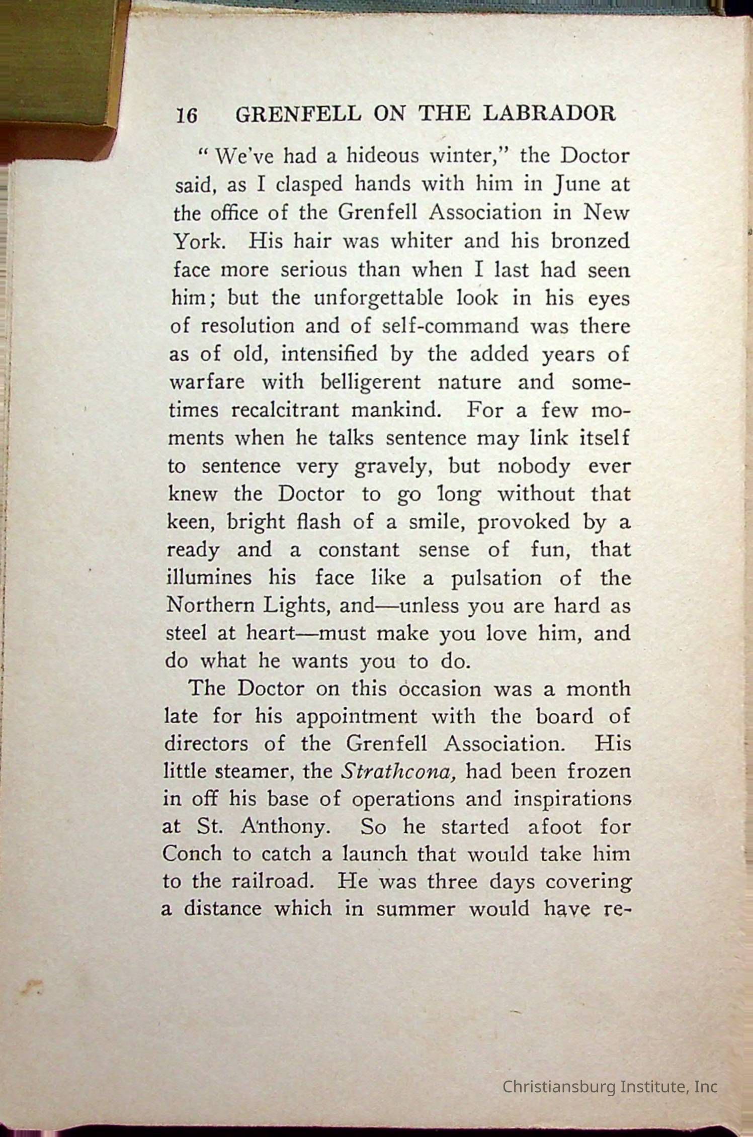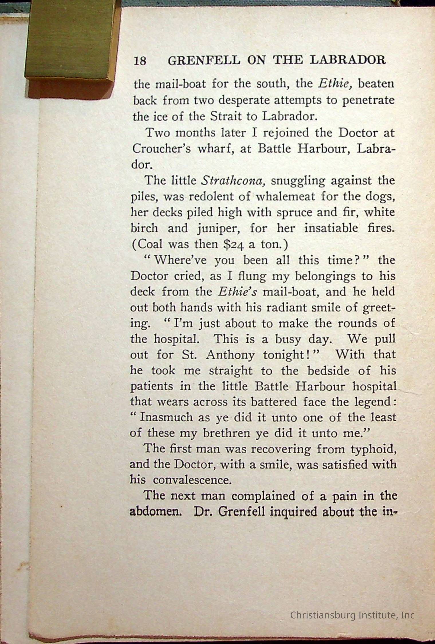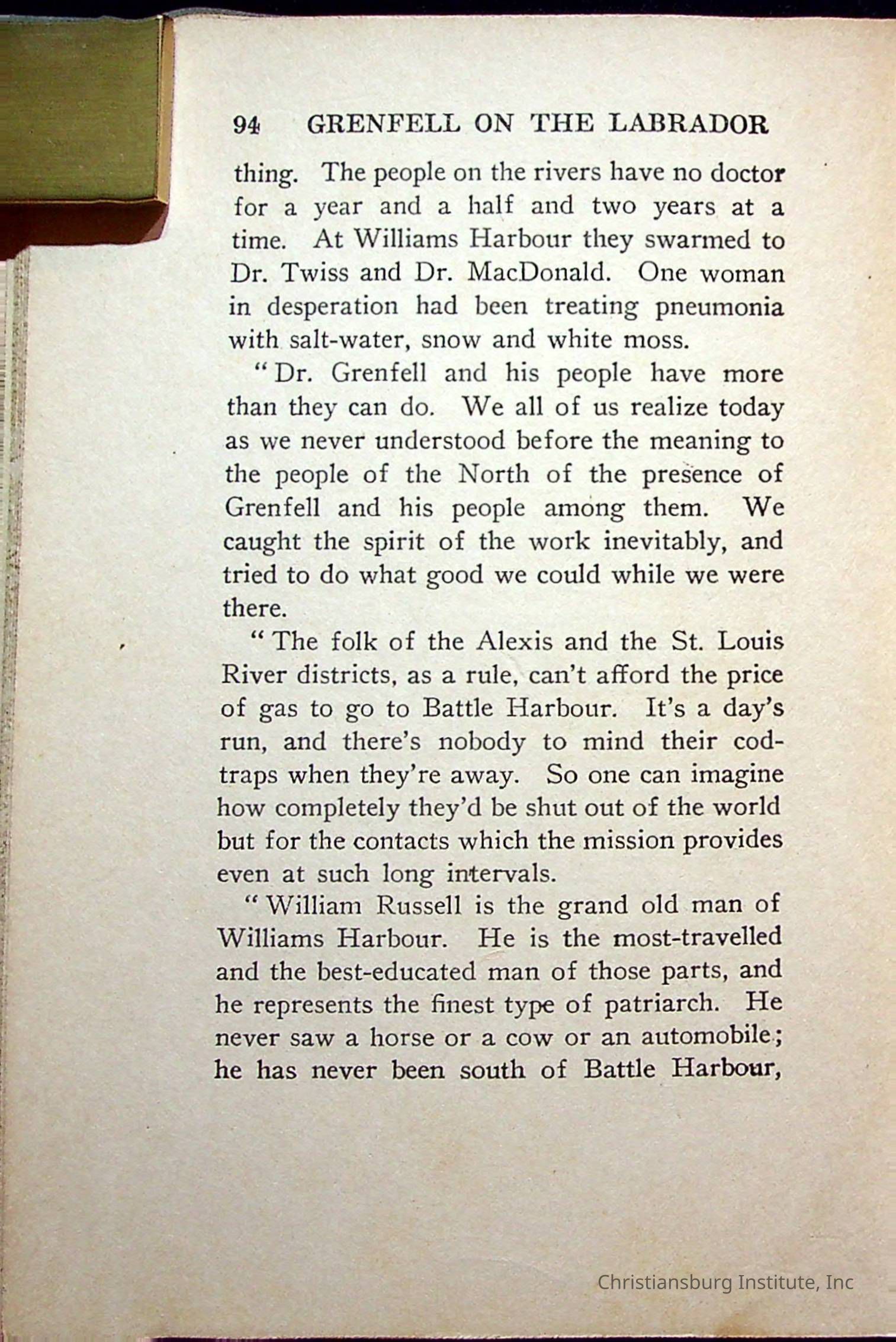 "With Grenfell on The Labrador" written by Fullerton L. Waldo and published by the Fleming H. Revell Company in the year 1920. The book was in the Christiansburg Institute library.