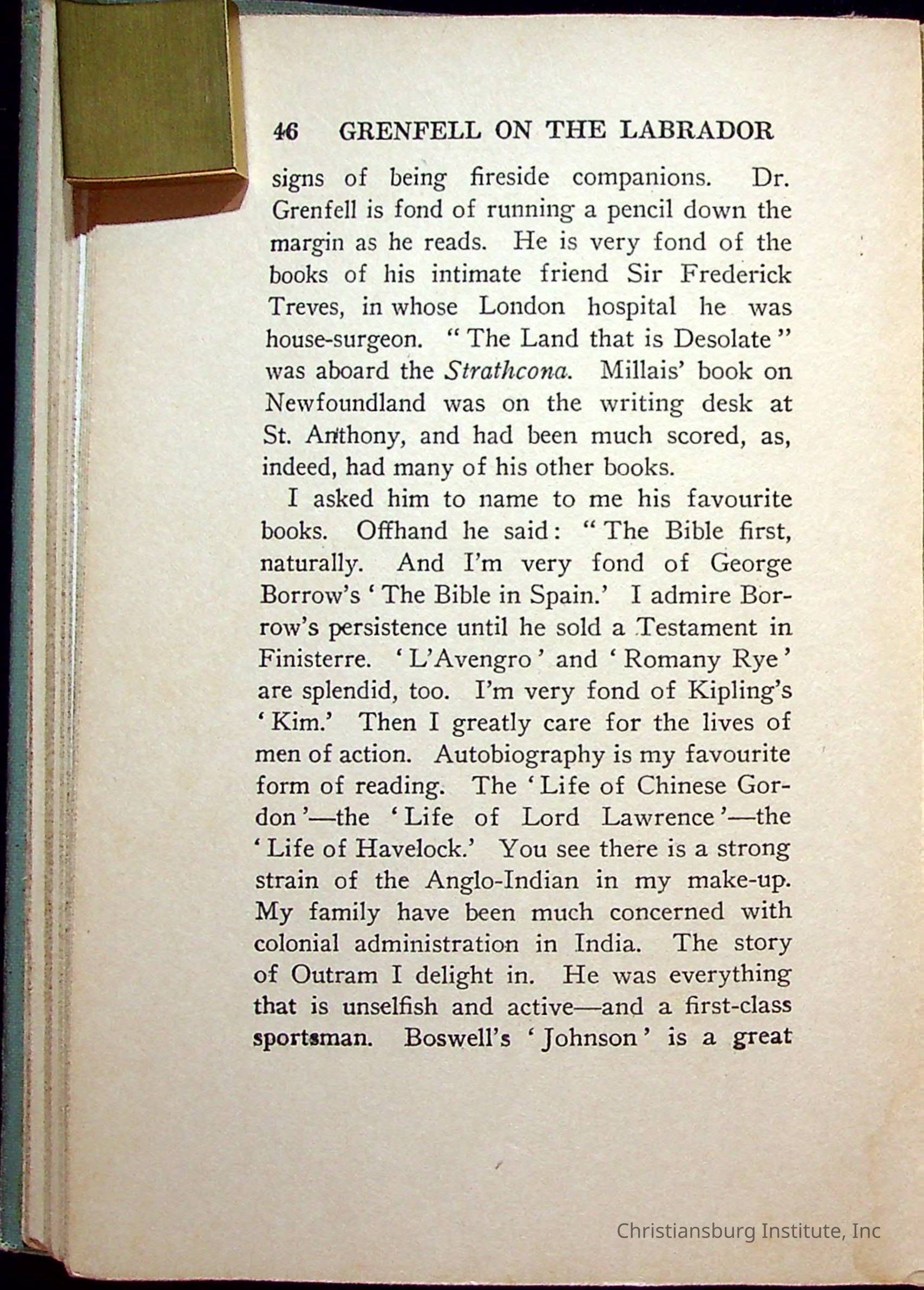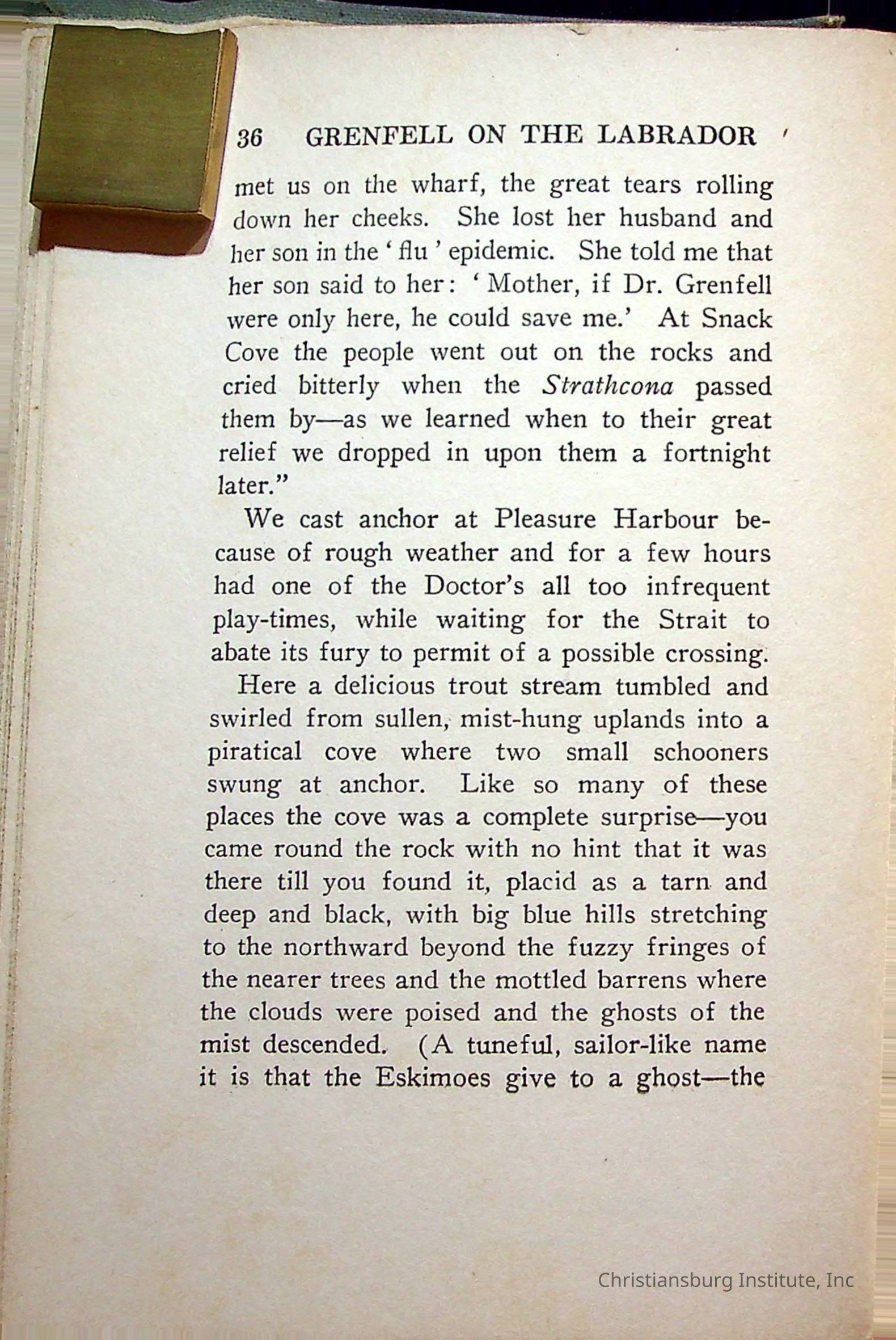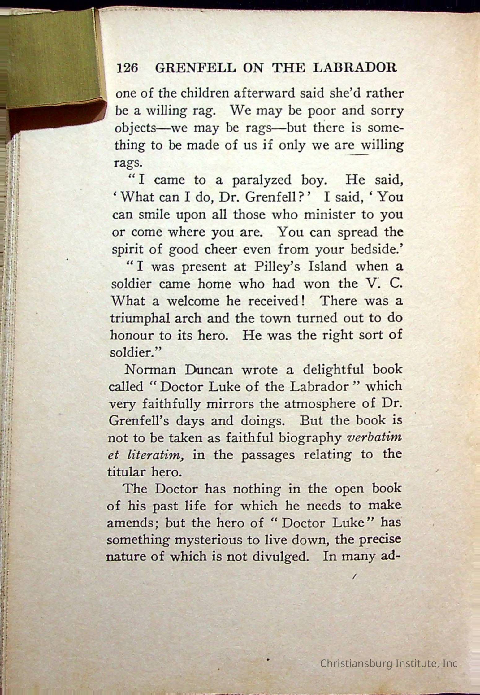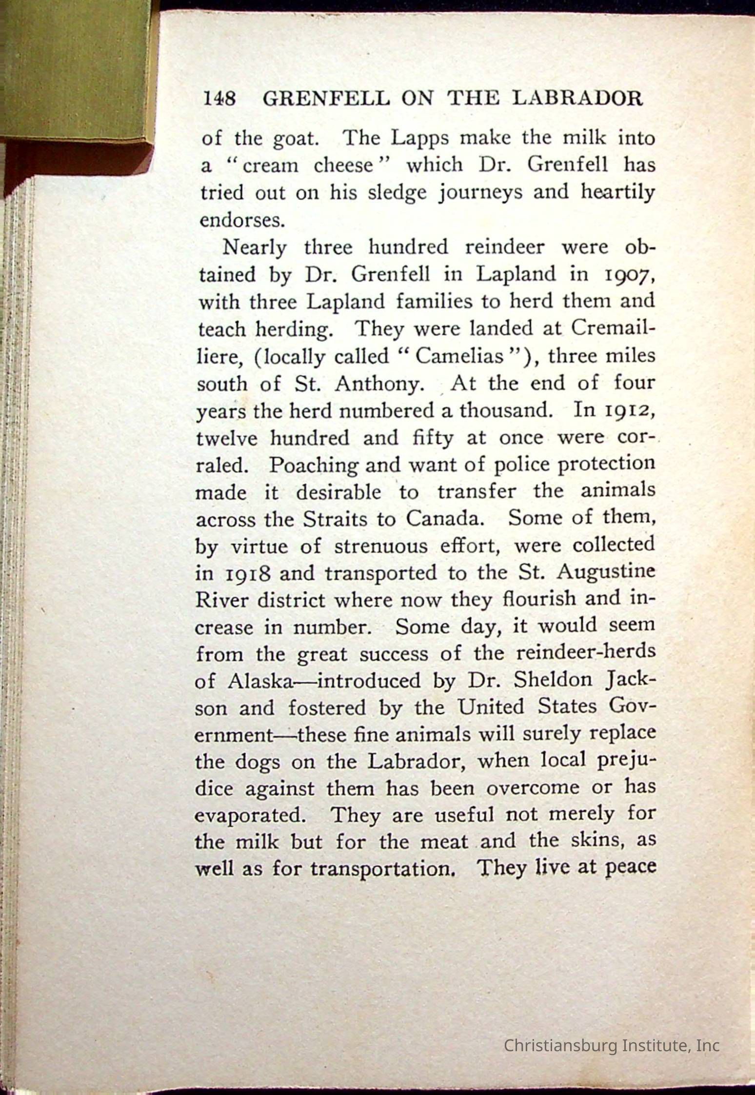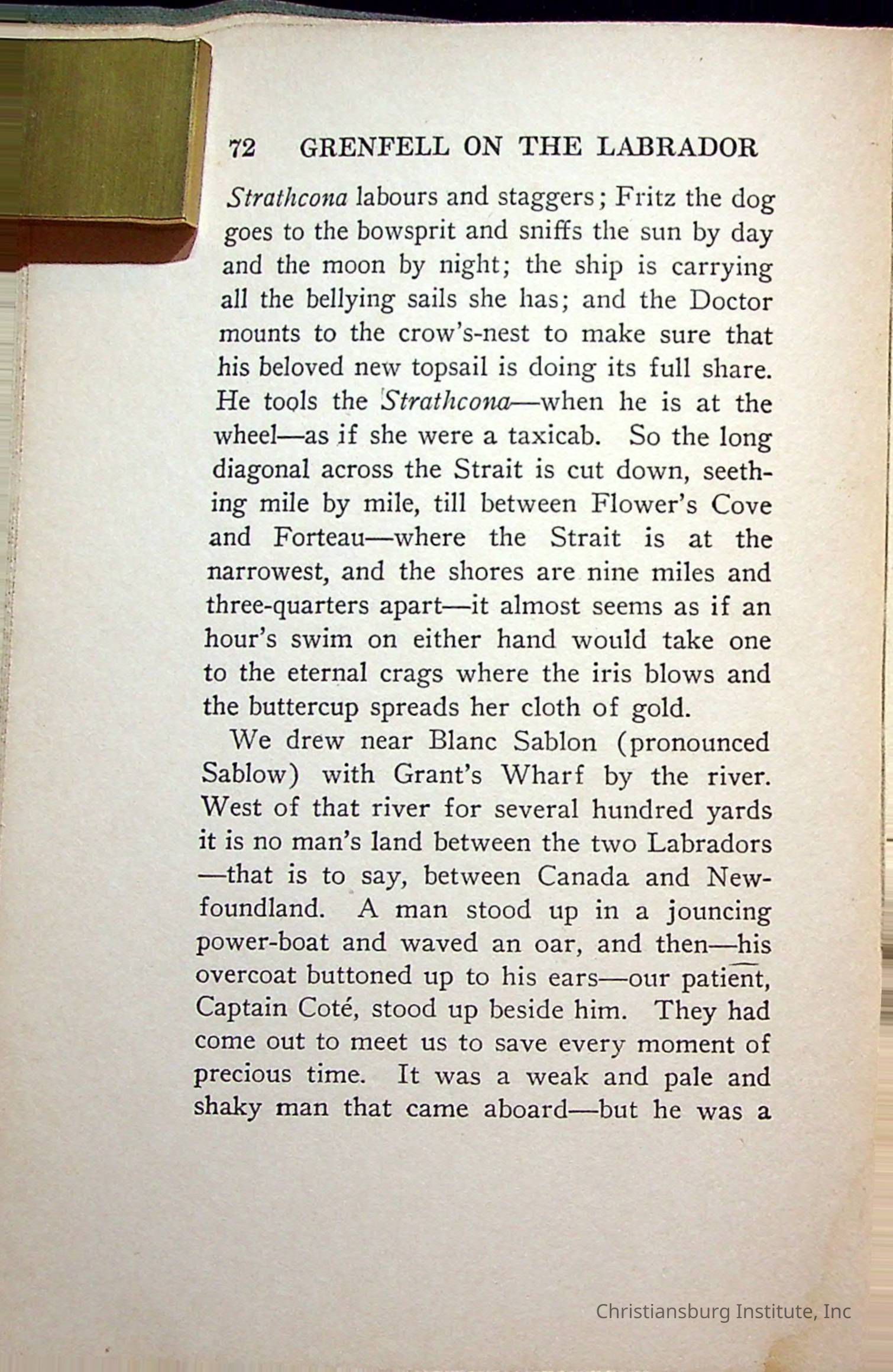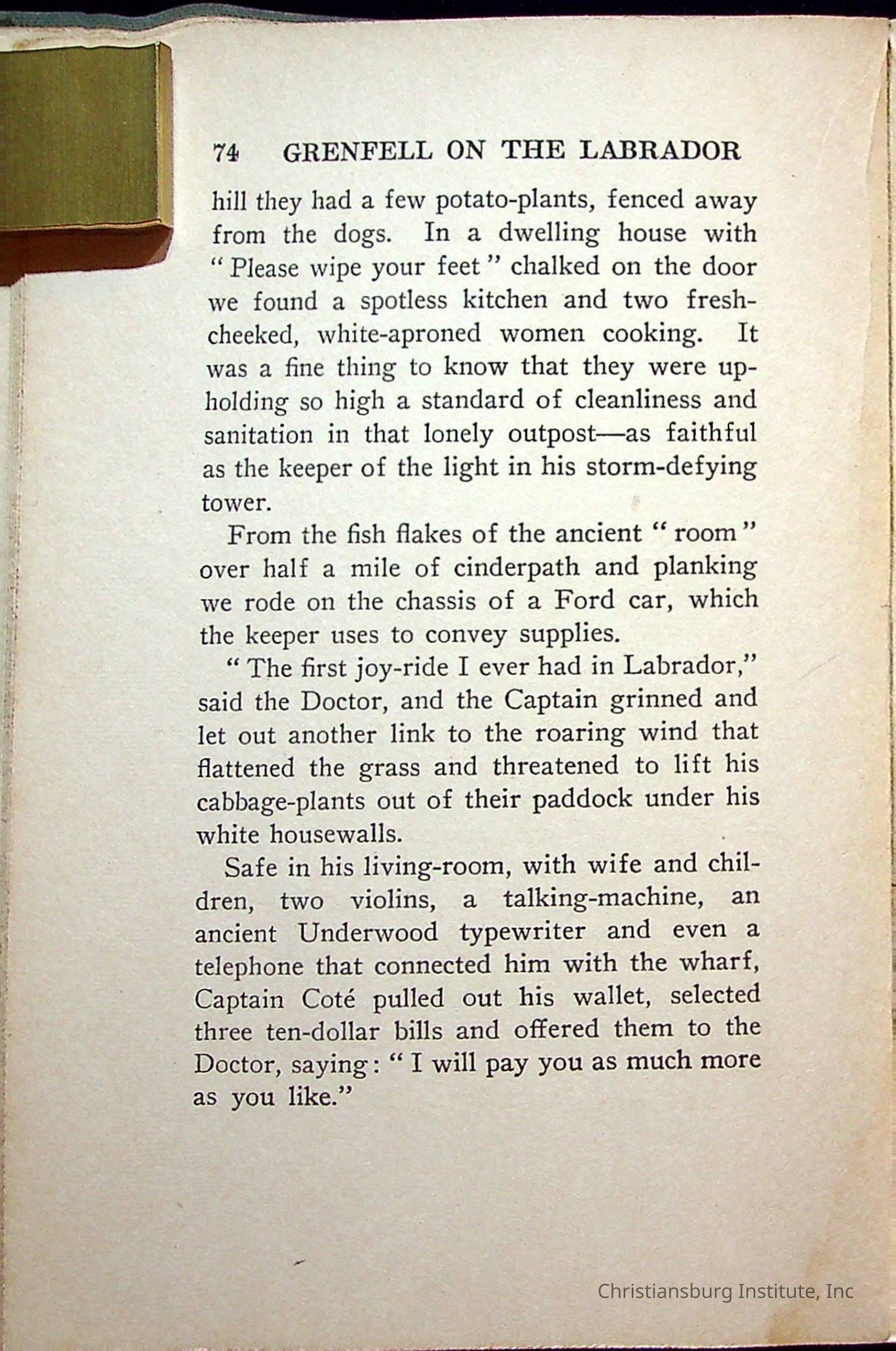 "With Grenfell on The Labrador" written by Fullerton L. Waldo and published by the Fleming H. Revell Company in the year 1920. The book was in the Christiansburg Institute library.