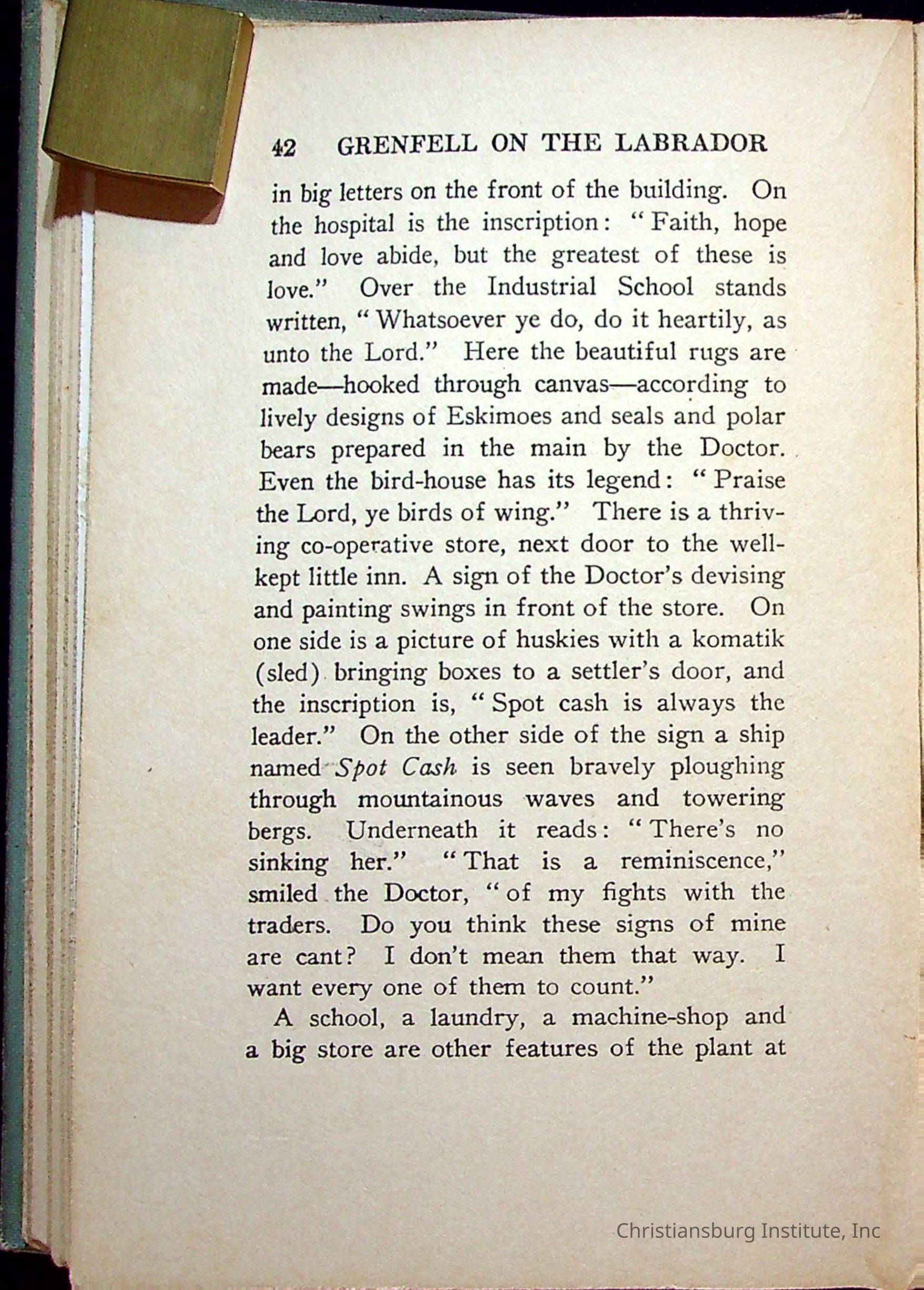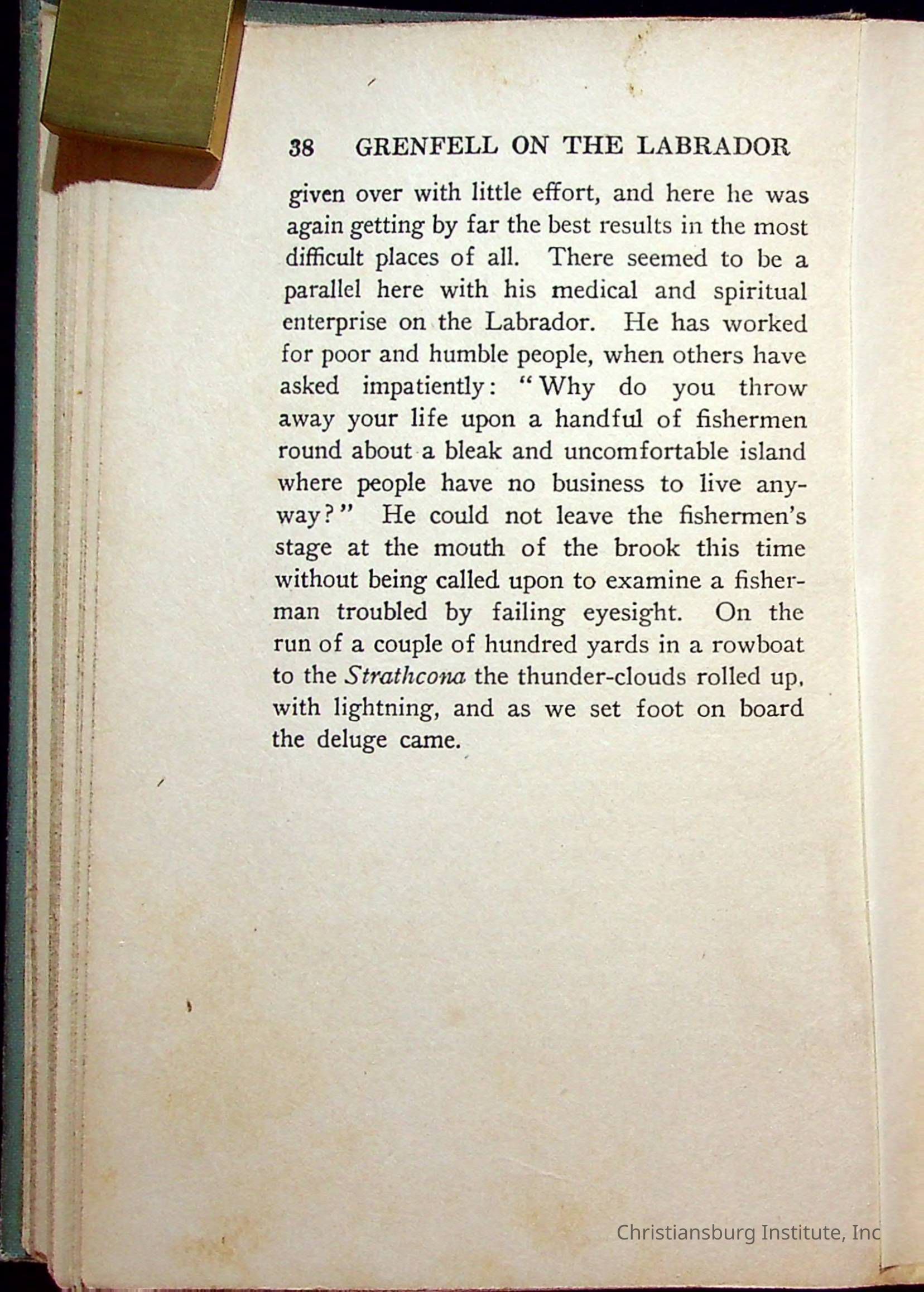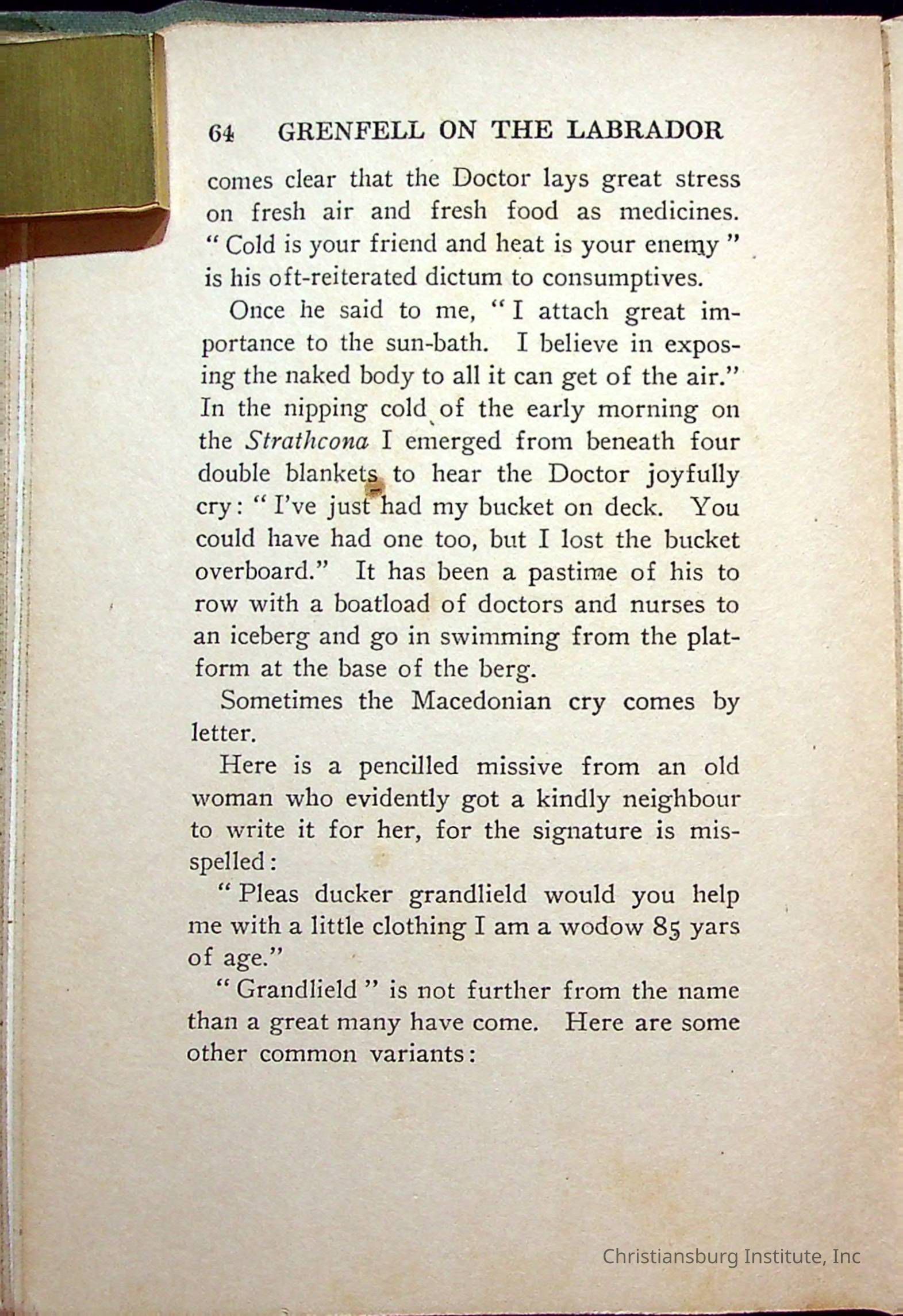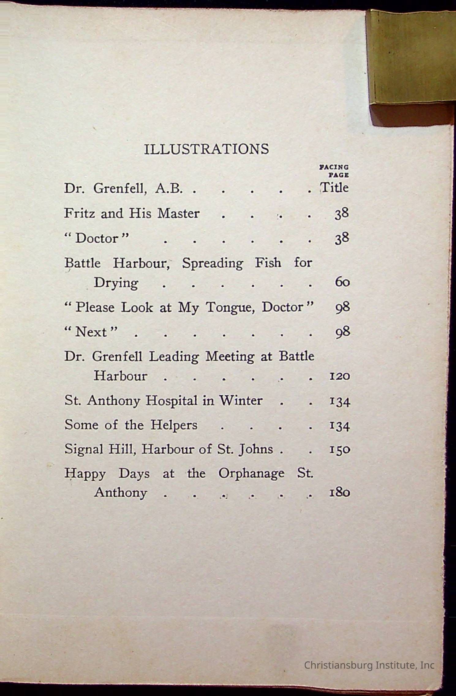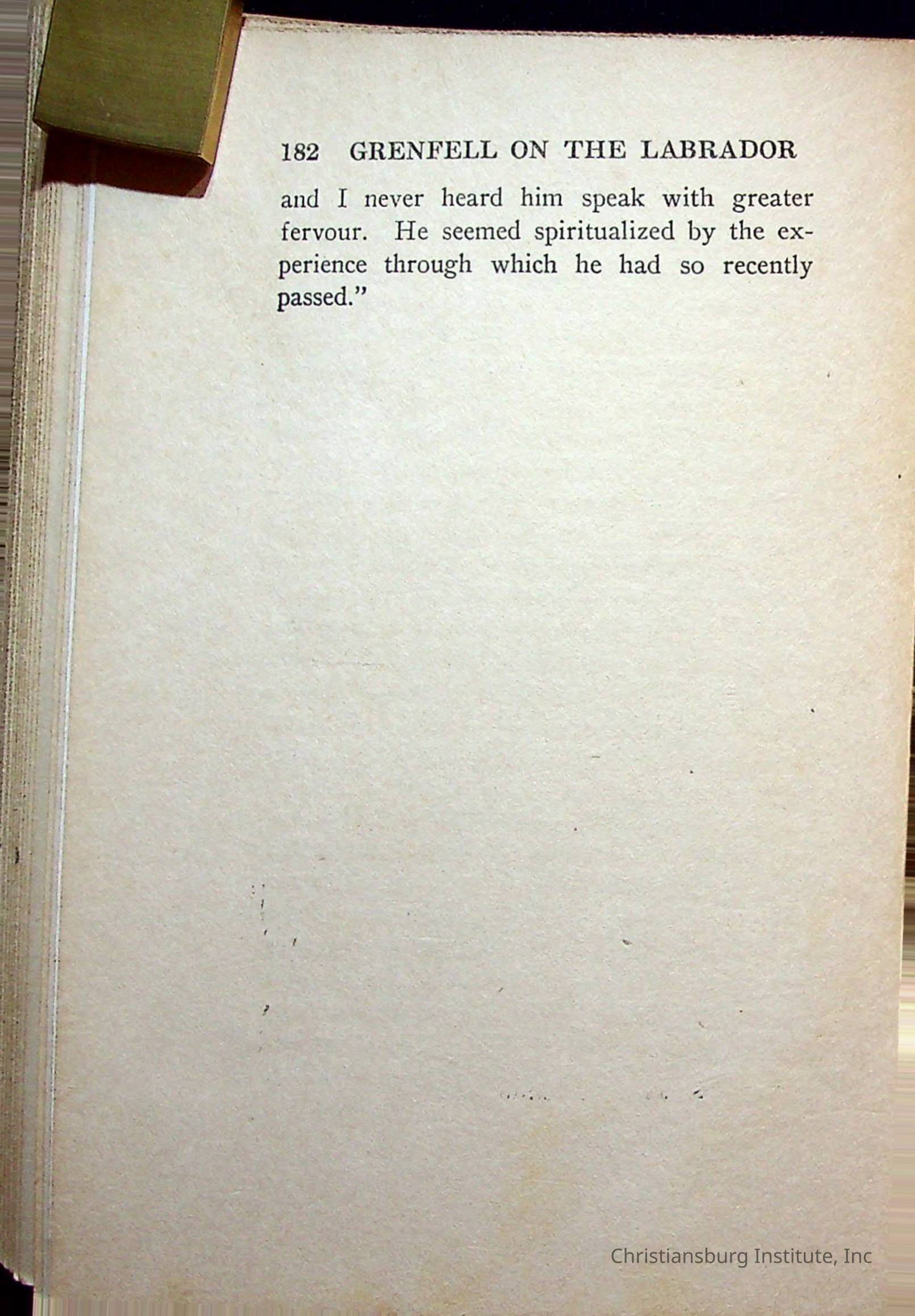 "With Grenfell on The Labrador" written by Fullerton L. Waldo and published by the Fleming H. Revell Company in the year 1920. The book was in the Christiansburg Institute library.