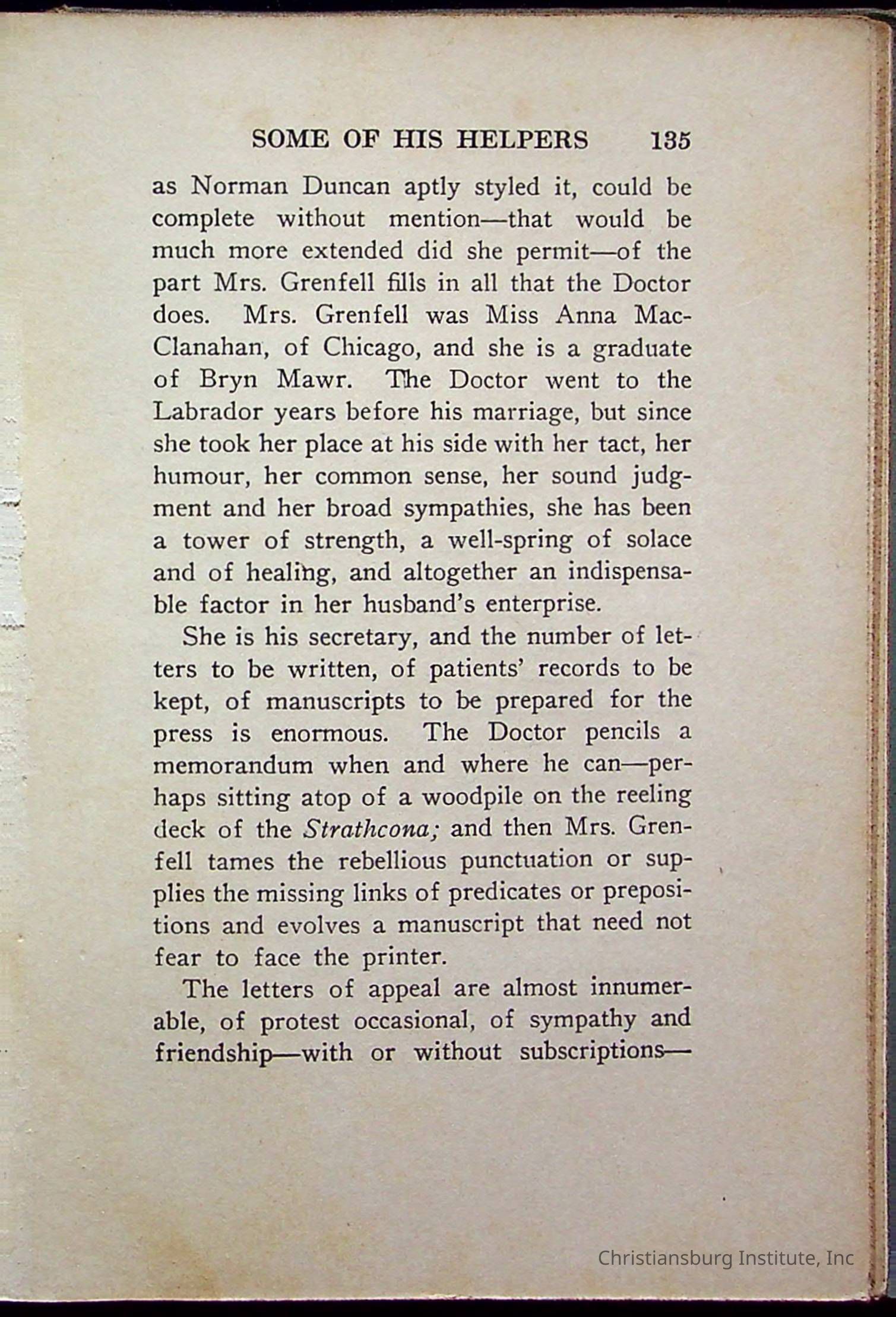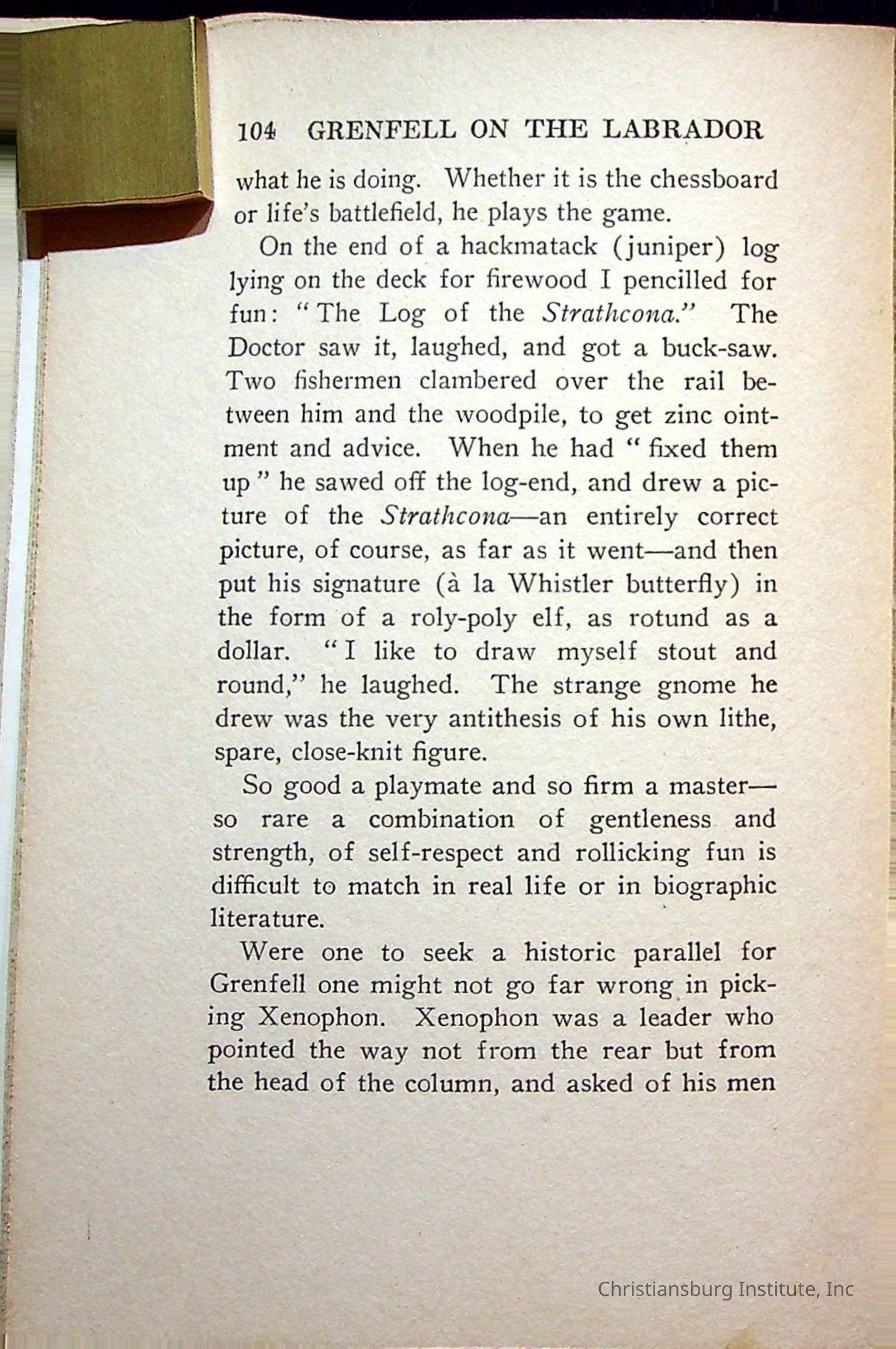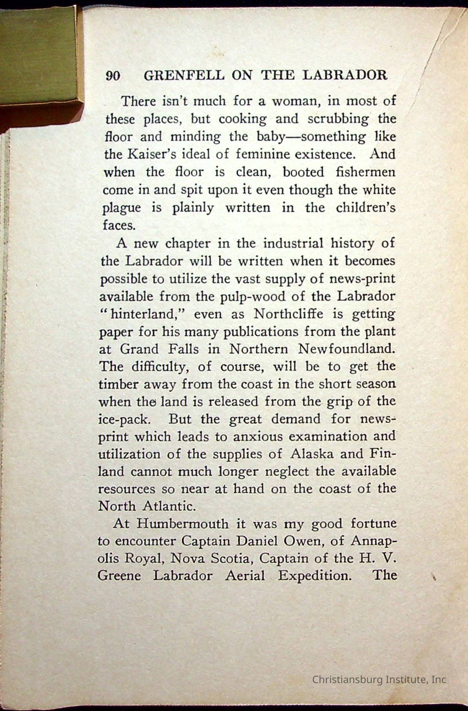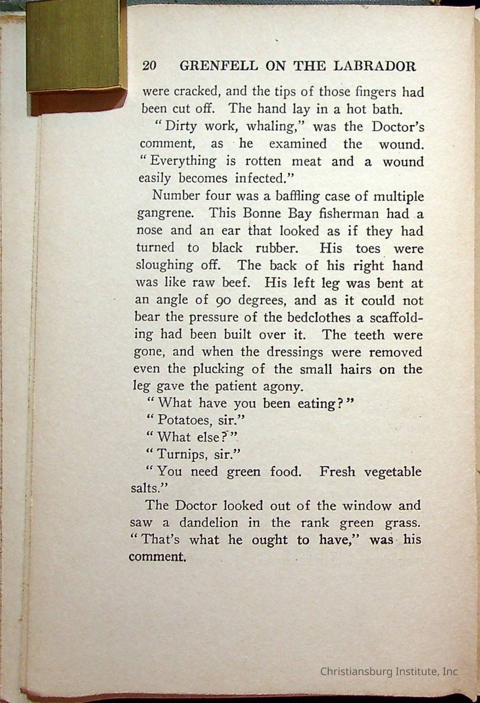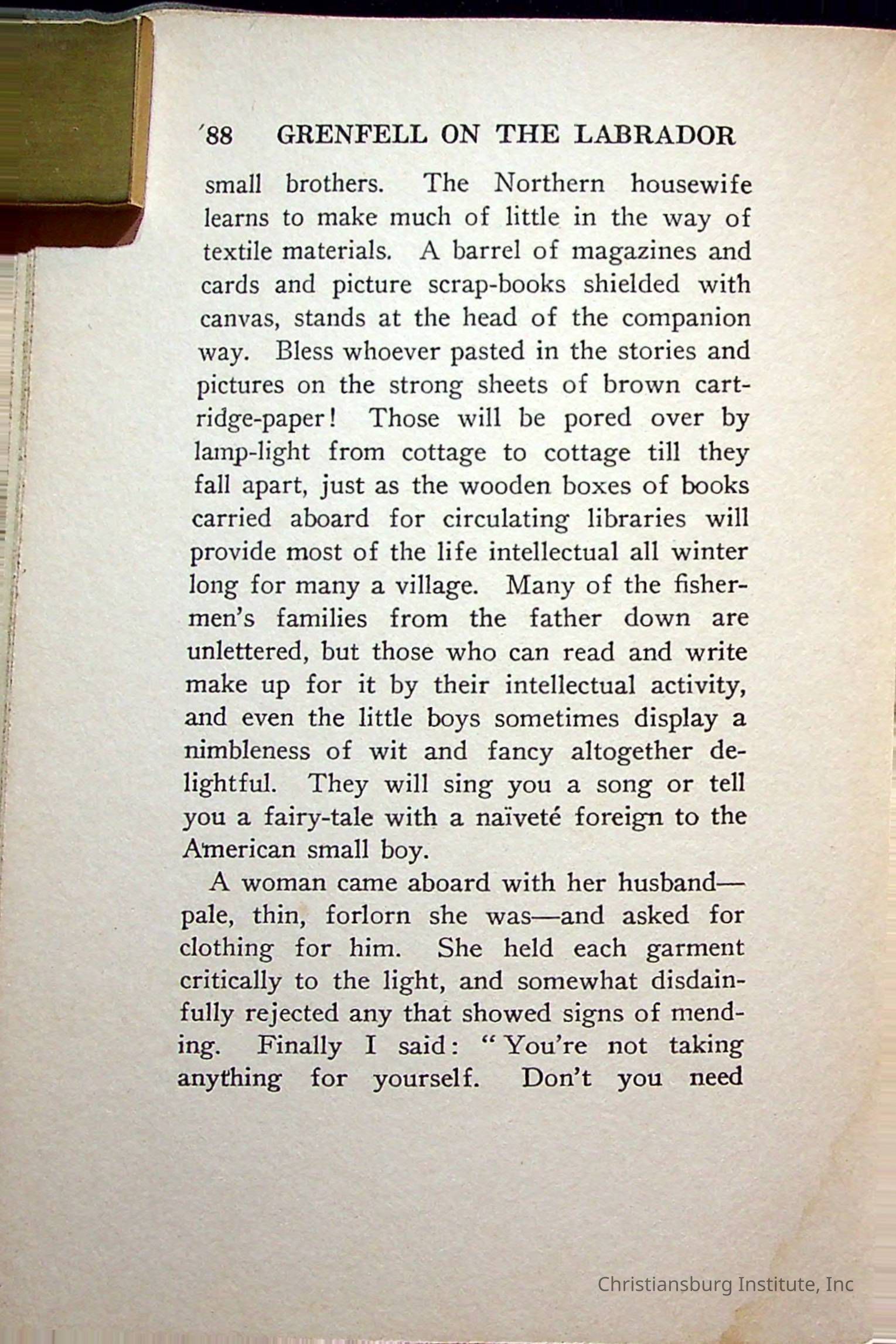 "With Grenfell on The Labrador" written by Fullerton L. Waldo and published by the Fleming H. Revell Company in the year 1920. The book was in the Christiansburg Institute library.