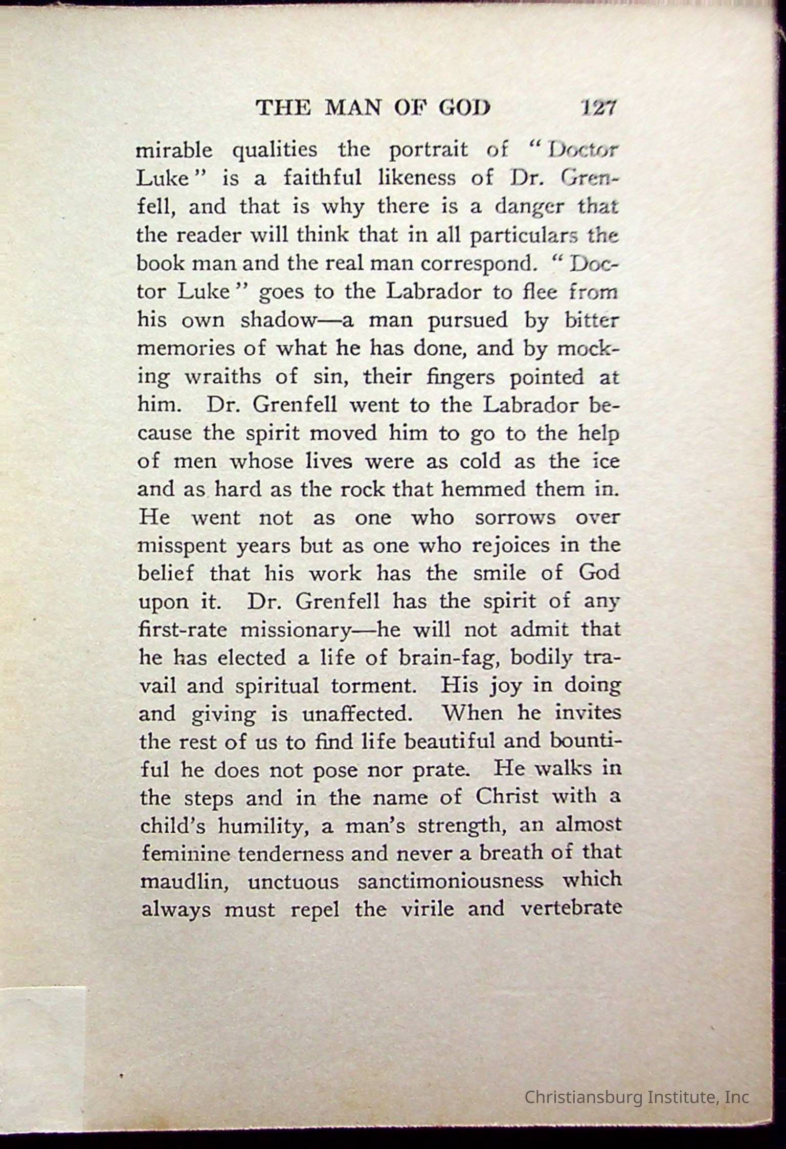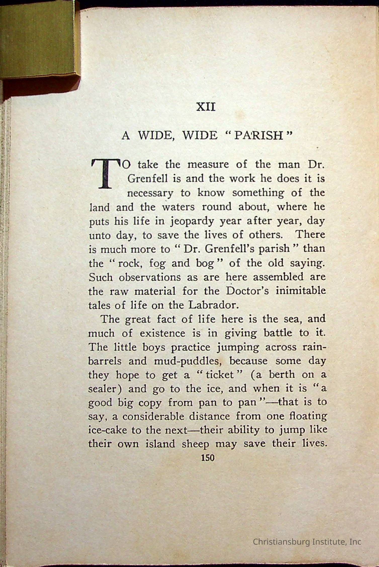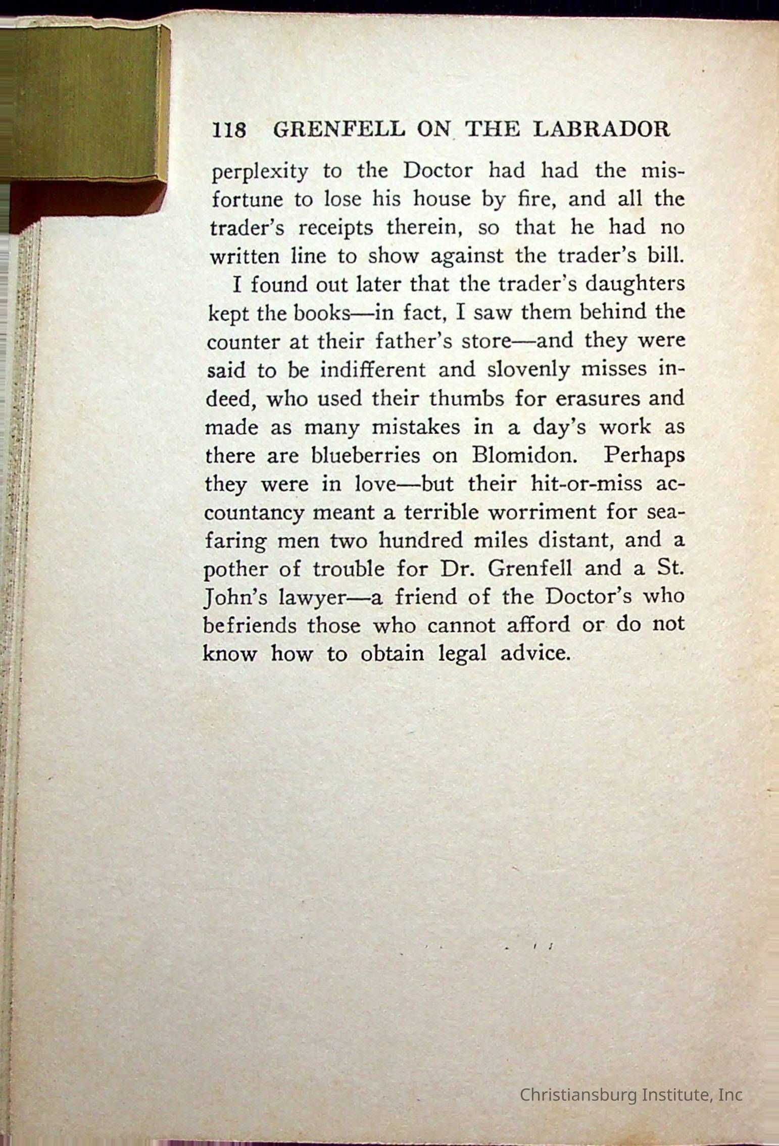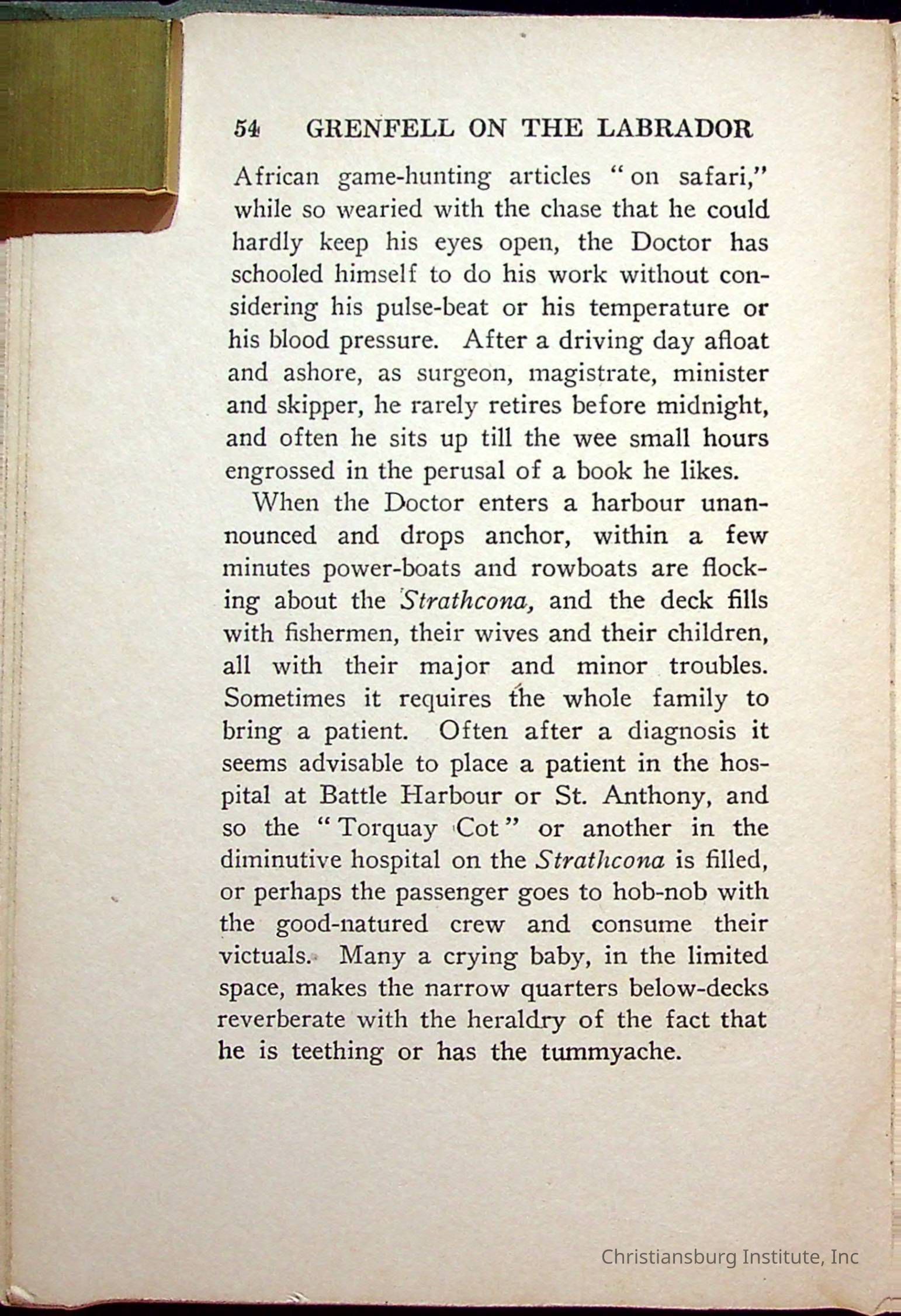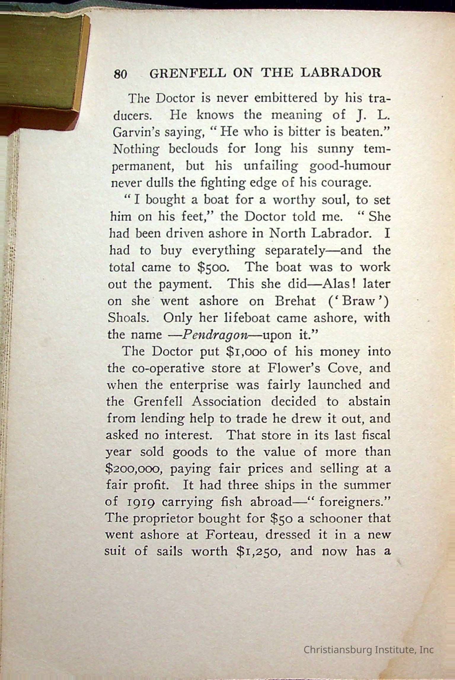 "With Grenfell on The Labrador" written by Fullerton L. Waldo and published by the Fleming H. Revell Company in the year 1920. The book was in the Christiansburg Institute library.