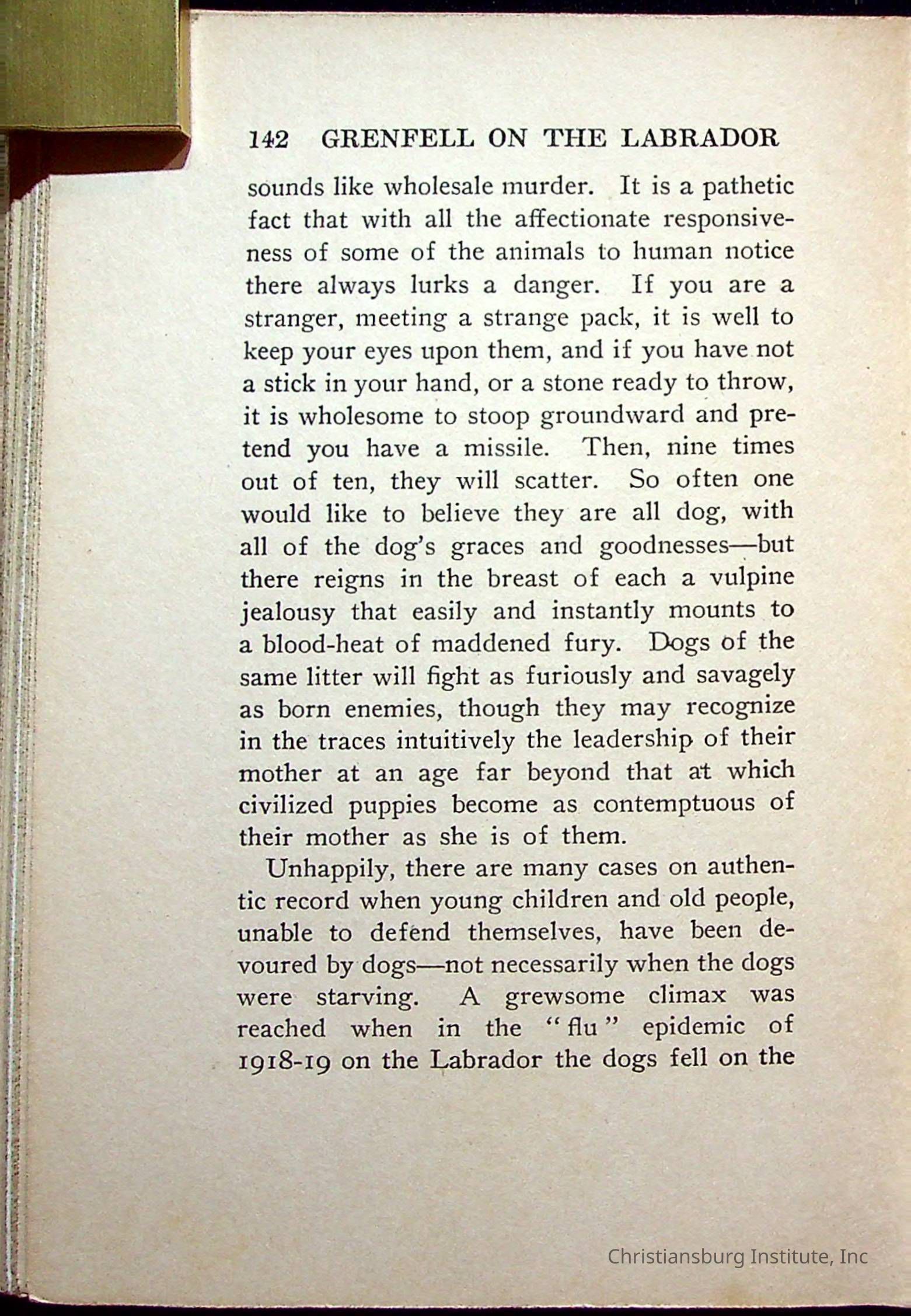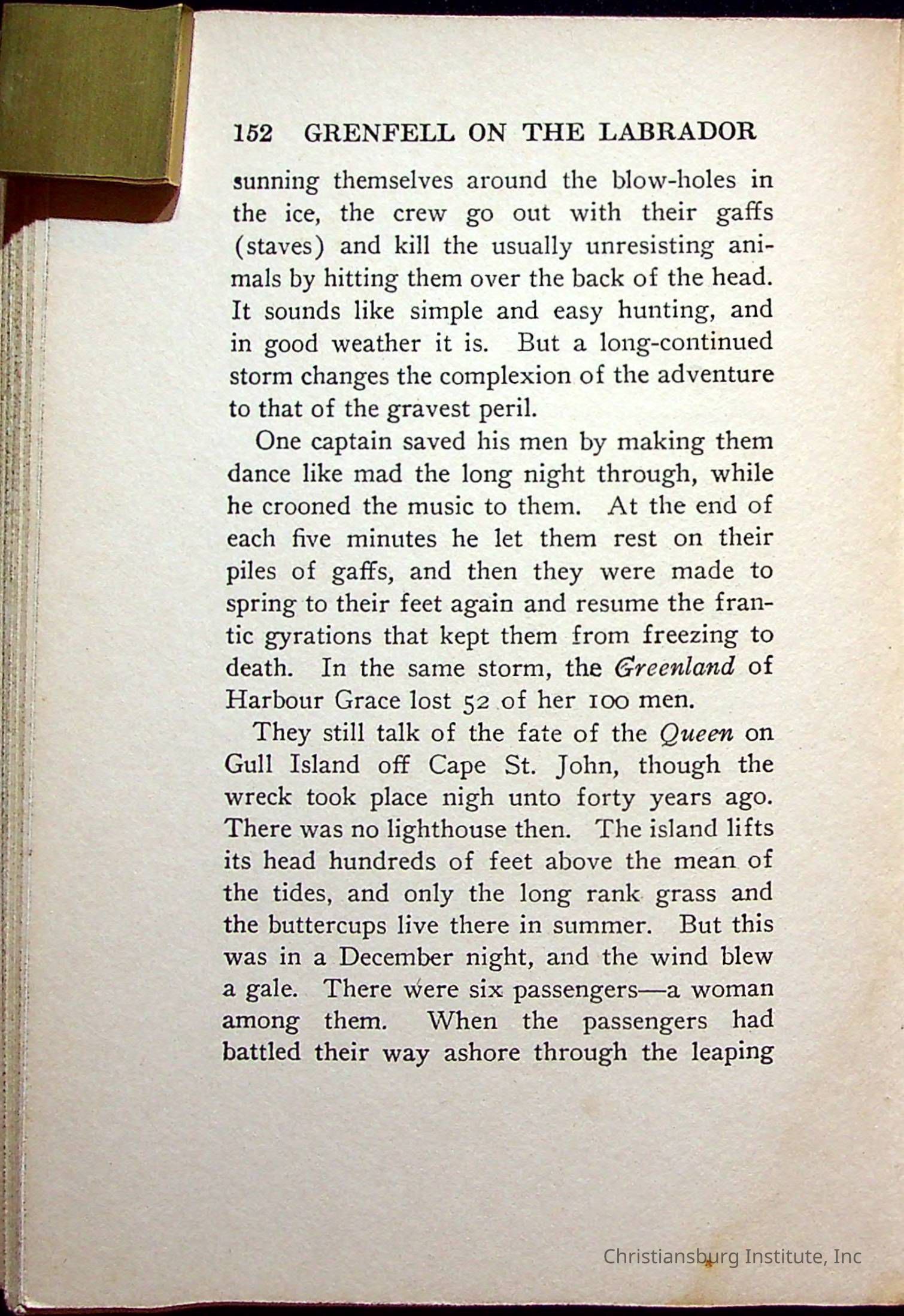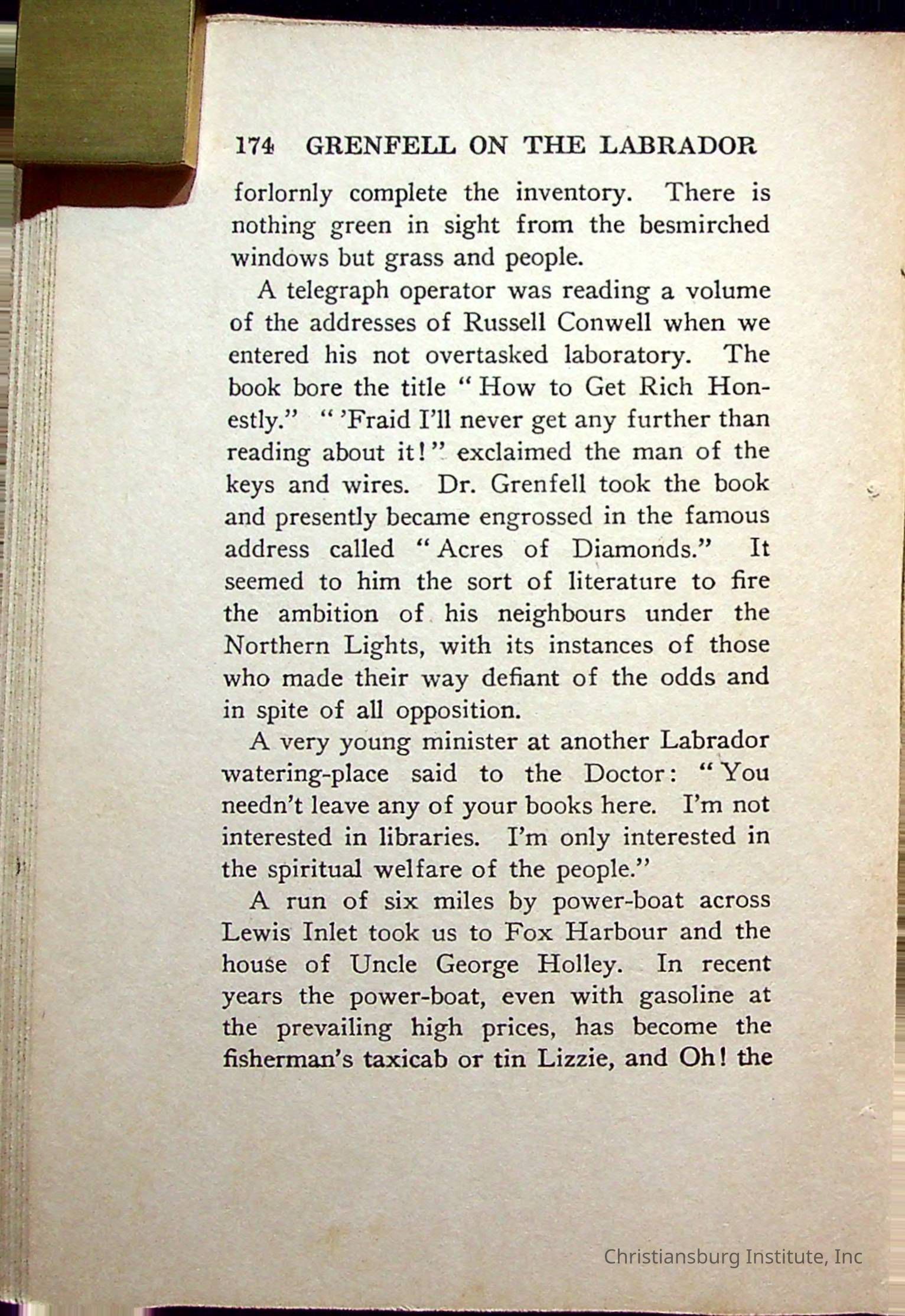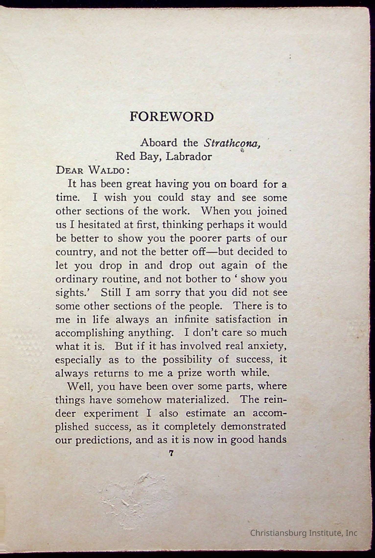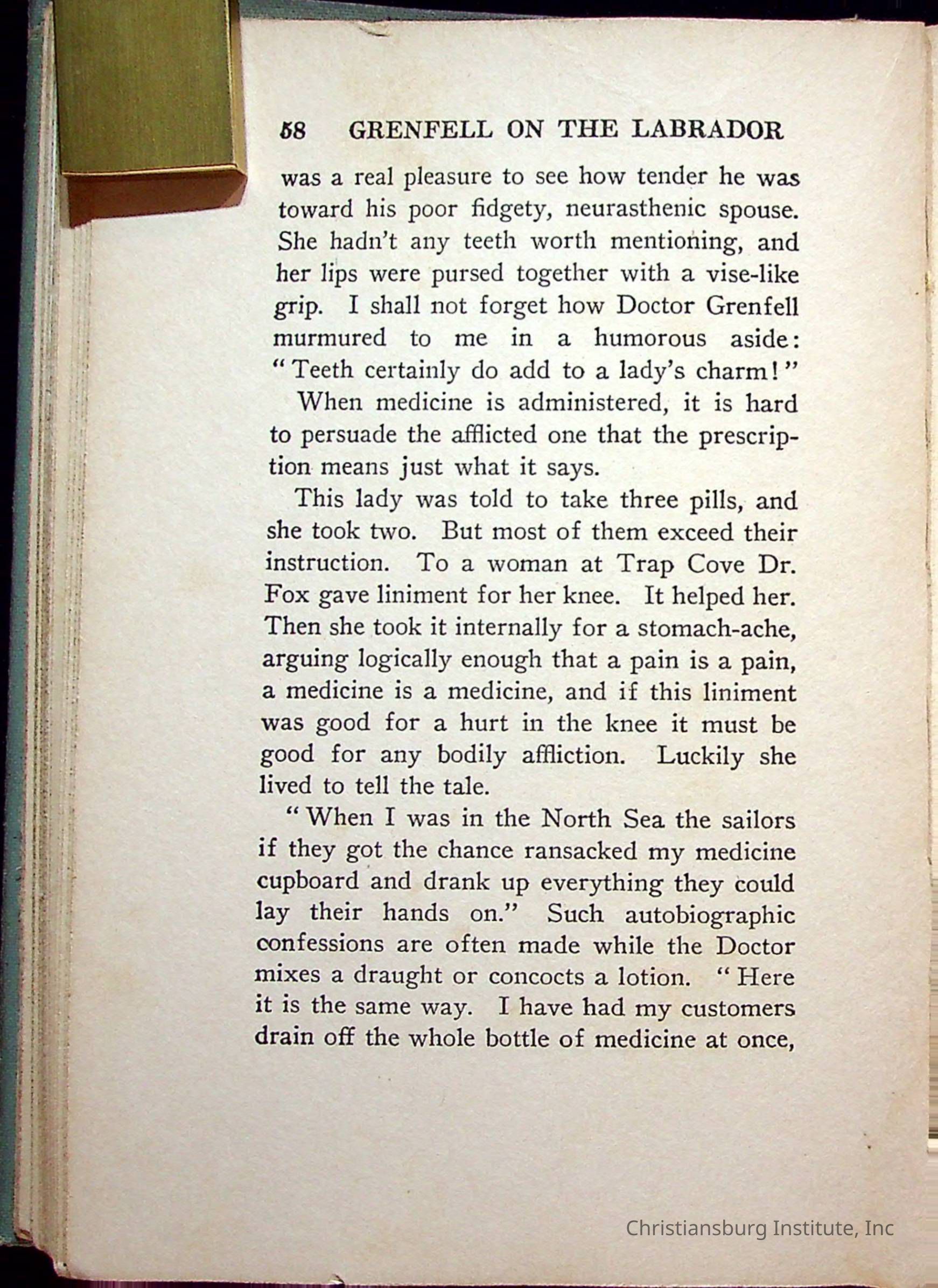 "With Grenfell on The Labrador" written by Fullerton L. Waldo and published by the Fleming H. Revell Company in the year 1920. The book was in the Christiansburg Institute library.