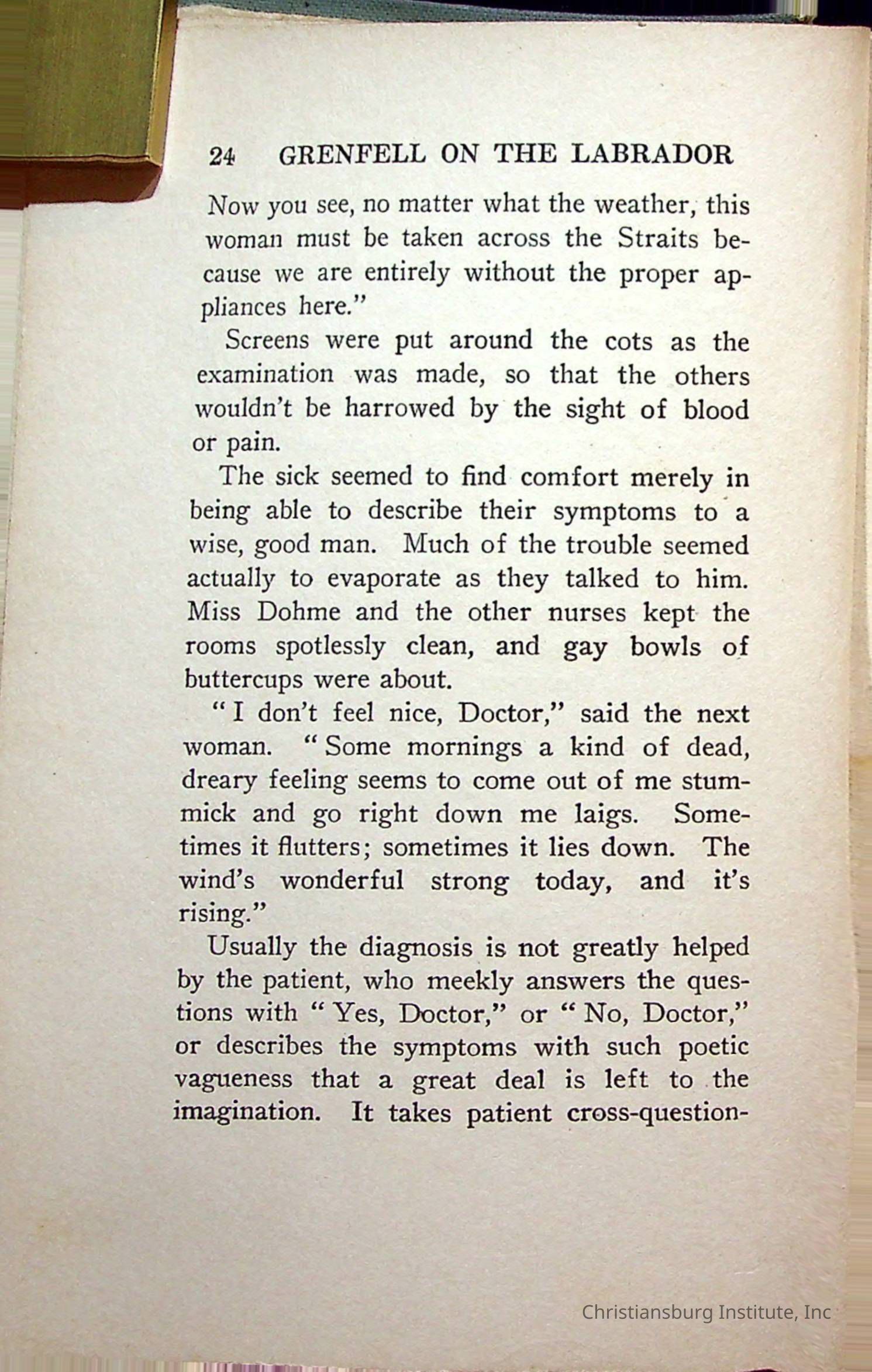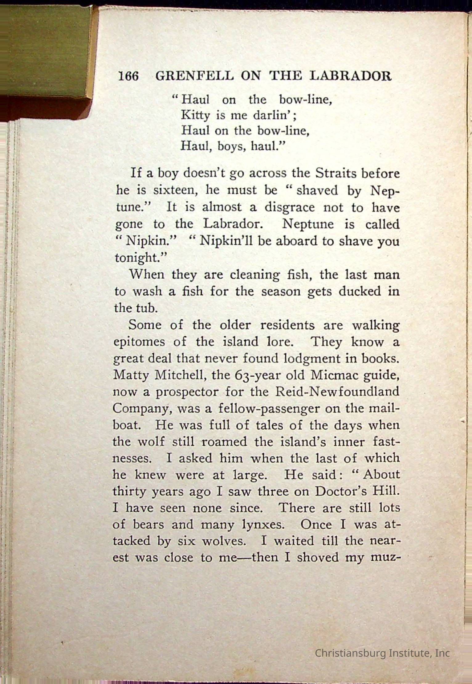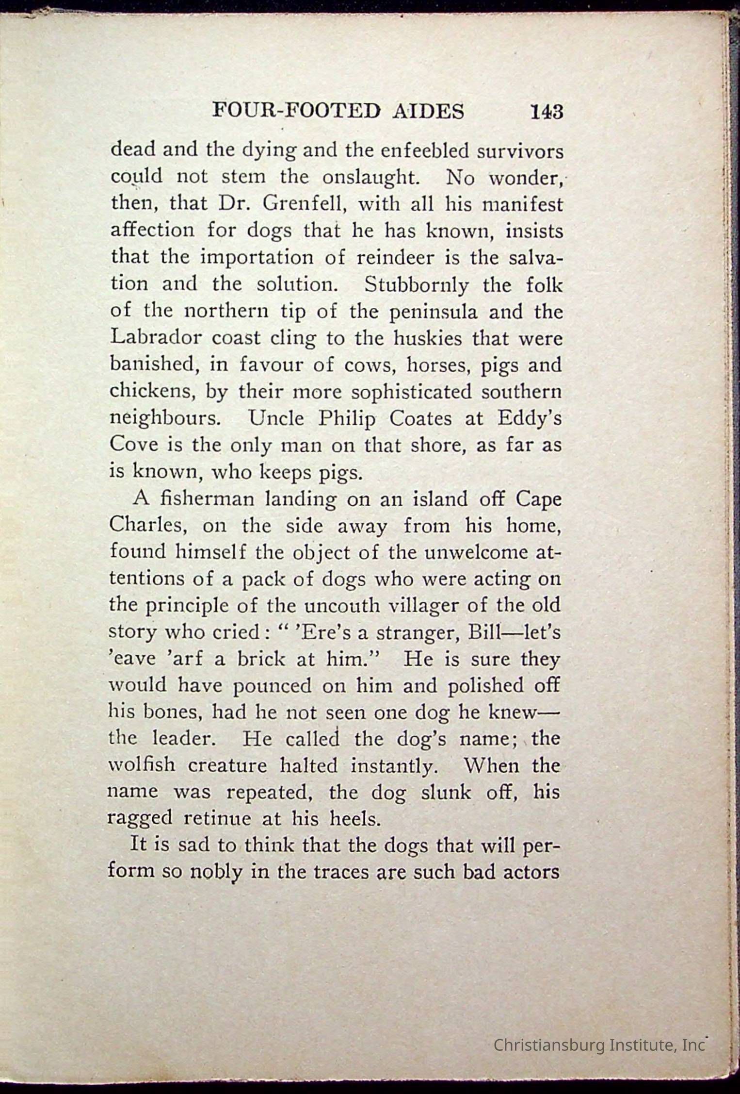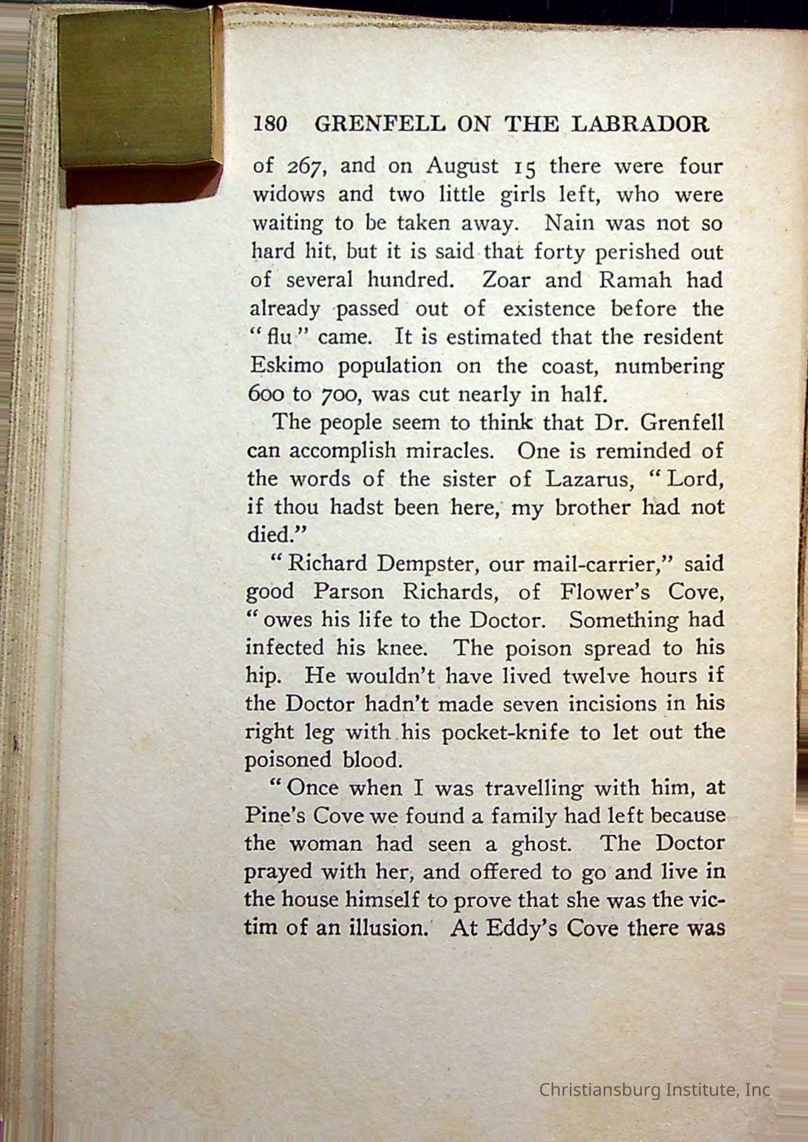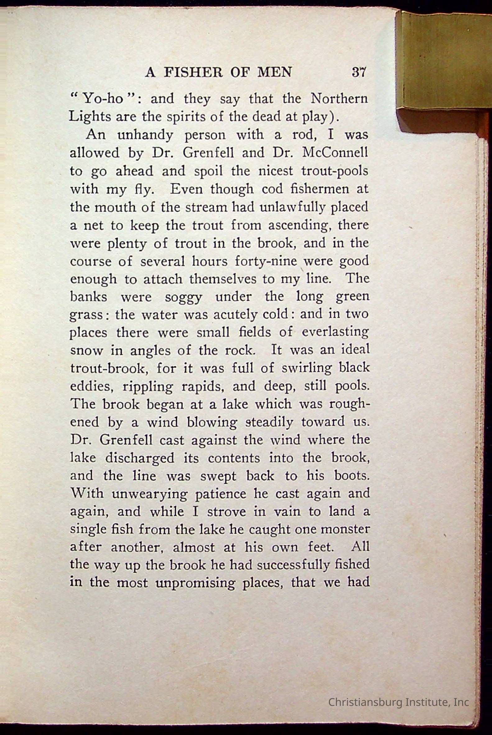 "With Grenfell on The Labrador" written by Fullerton L. Waldo and published by the Fleming H. Revell Company in the year 1920. The book was in the Christiansburg Institute library.
