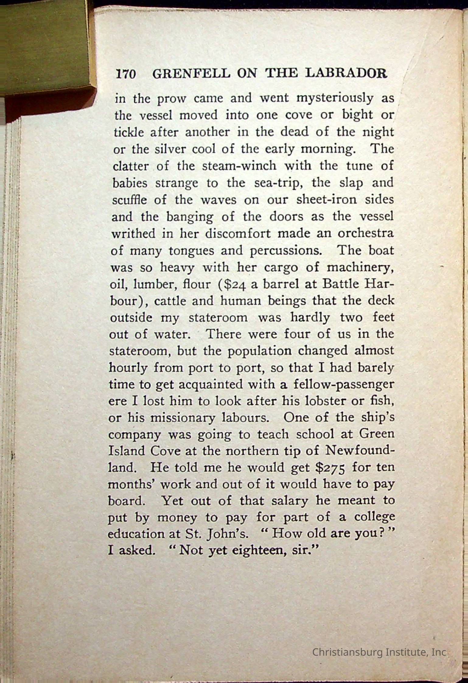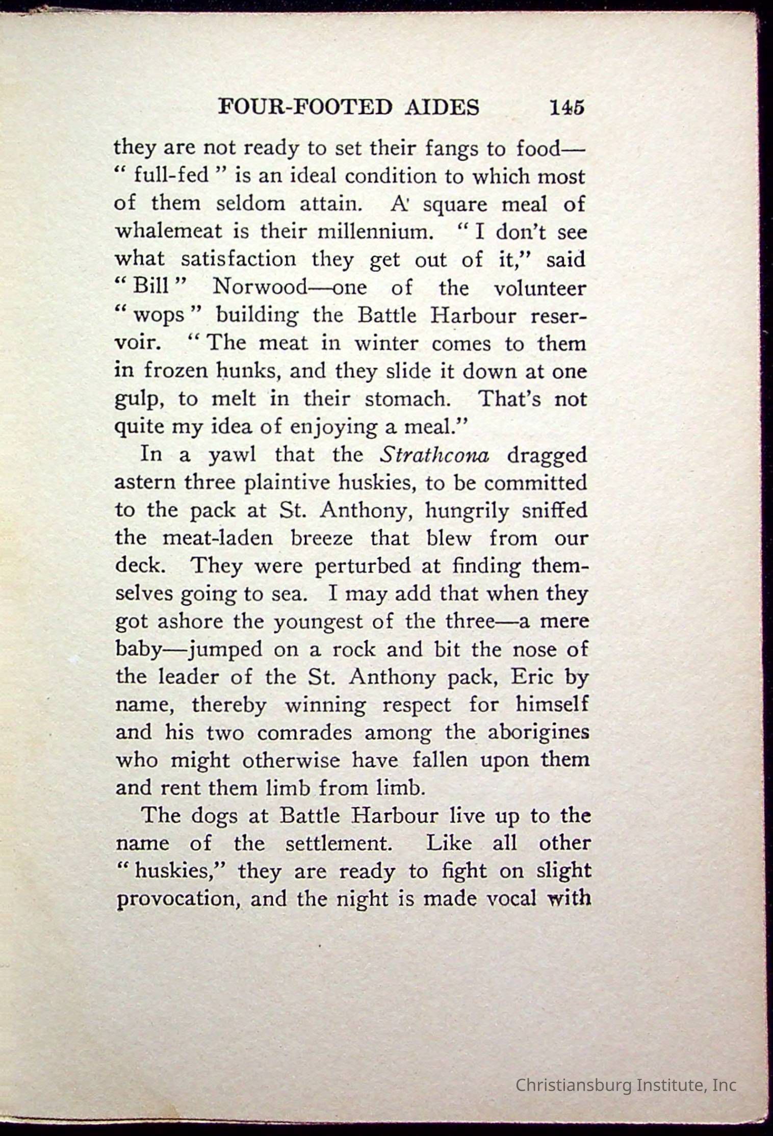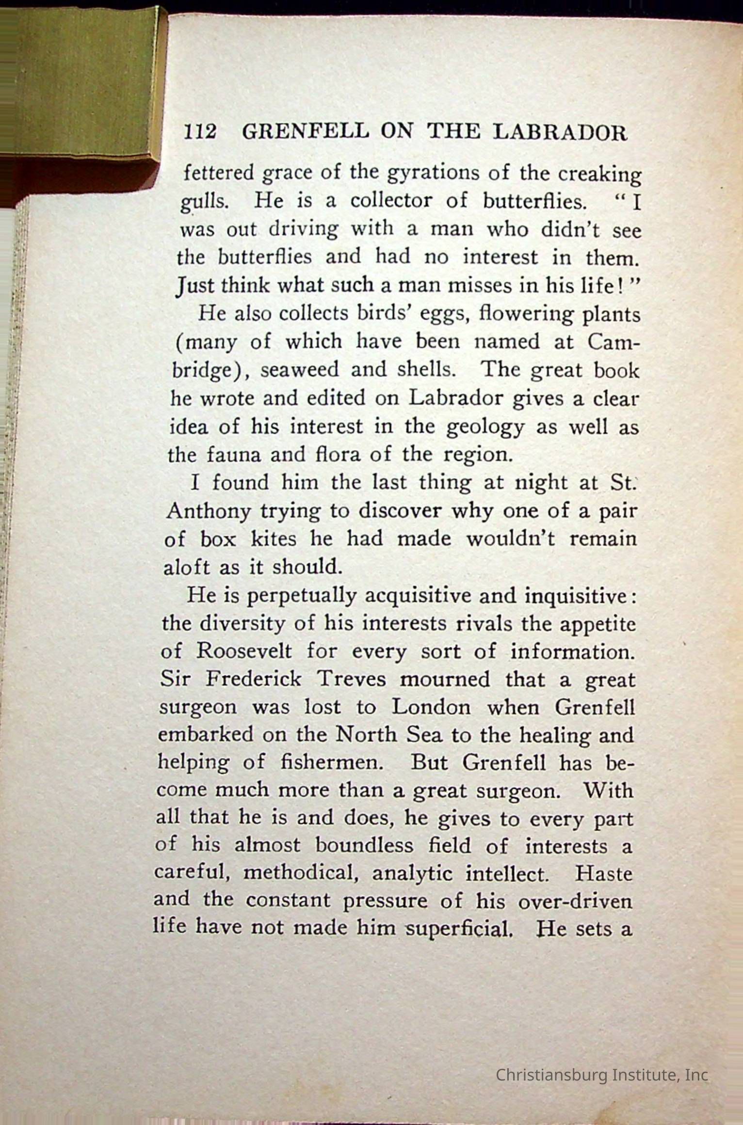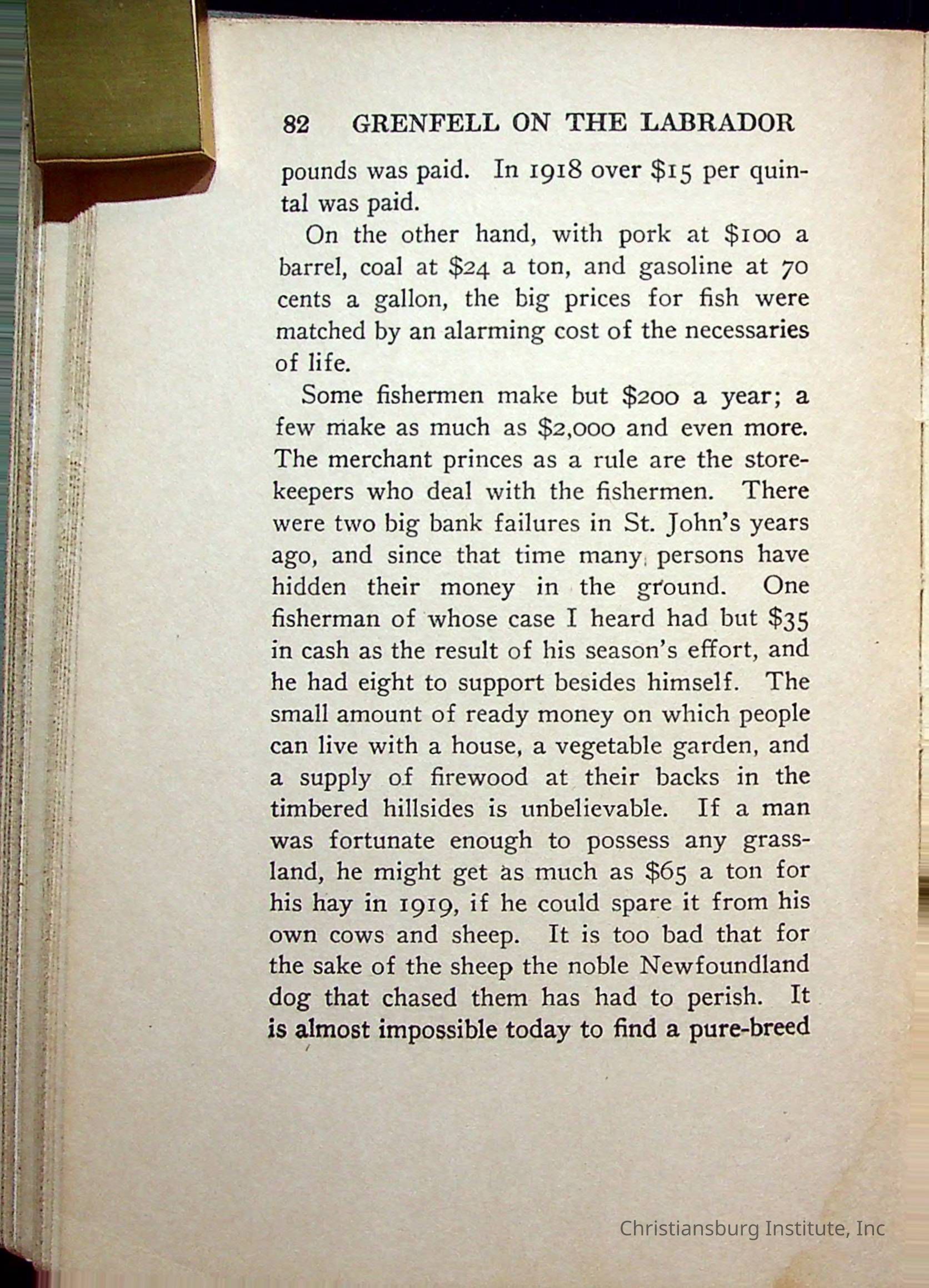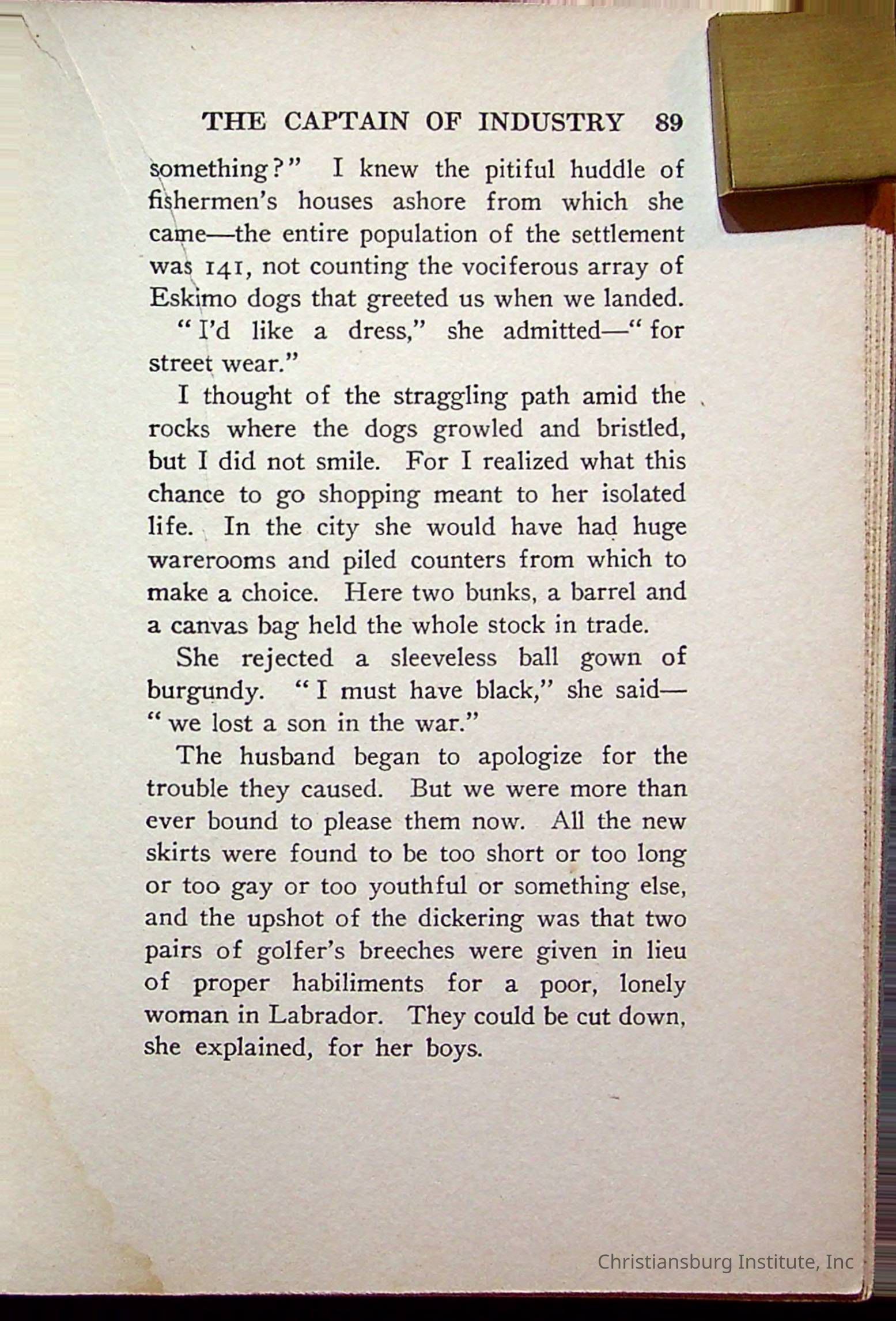 "With Grenfell on The Labrador" written by Fullerton L. Waldo and published by the Fleming H. Revell Company in the year 1920. The book was in the Christiansburg Institute library.