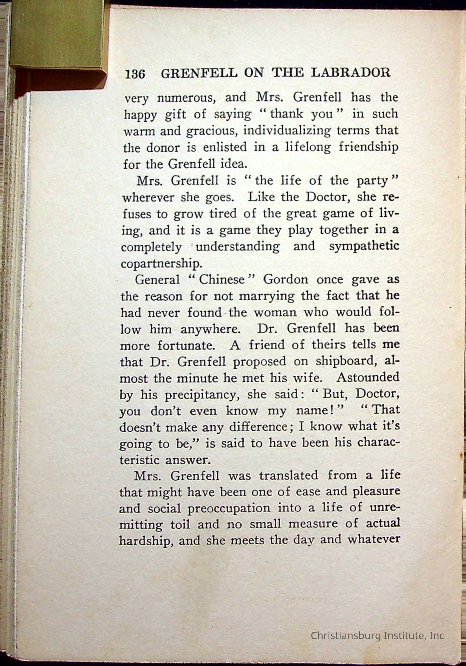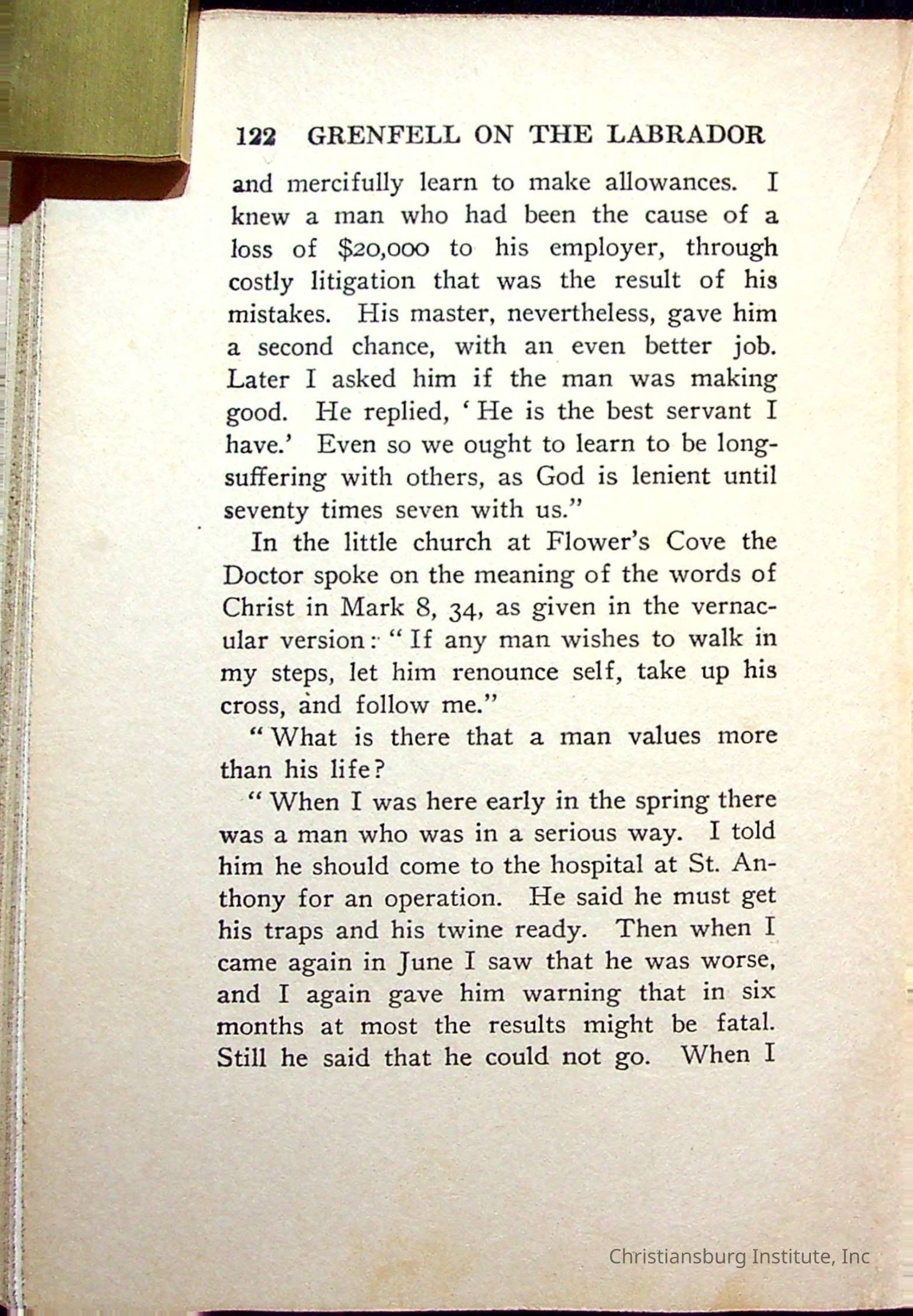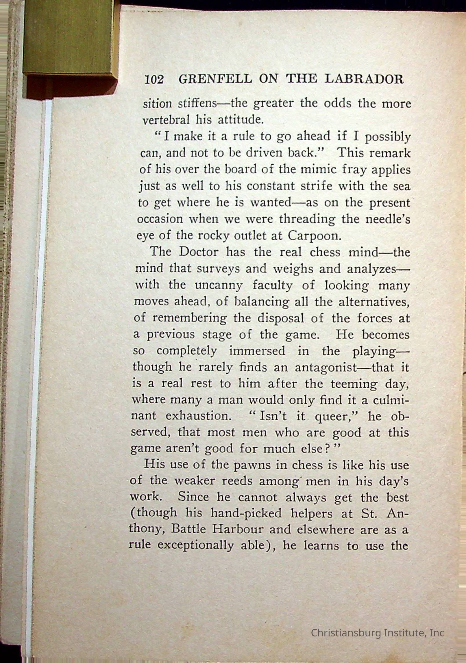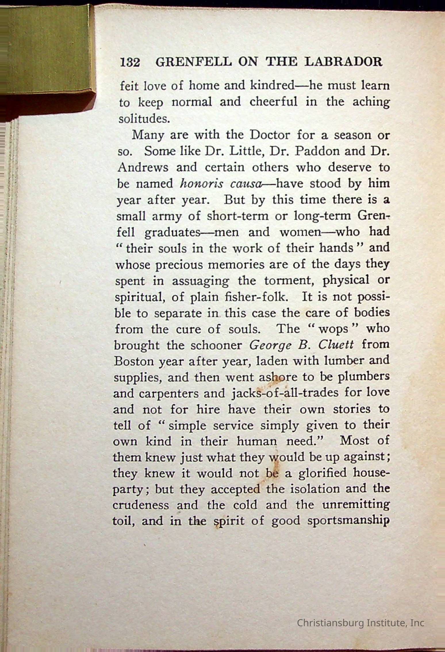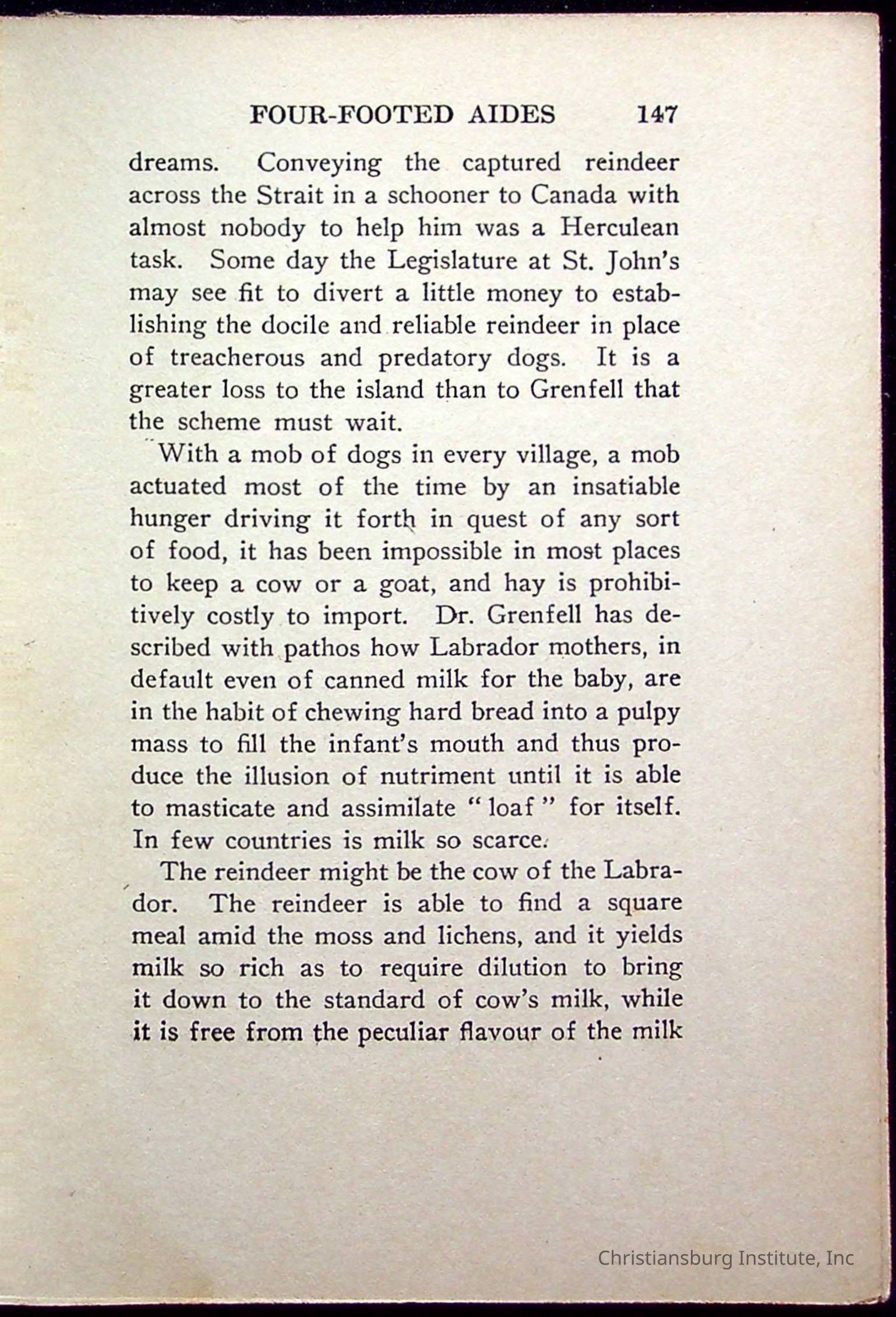 "With Grenfell on The Labrador" written by Fullerton L. Waldo and published by the Fleming H. Revell Company in the year 1920. The book was in the Christiansburg Institute library.