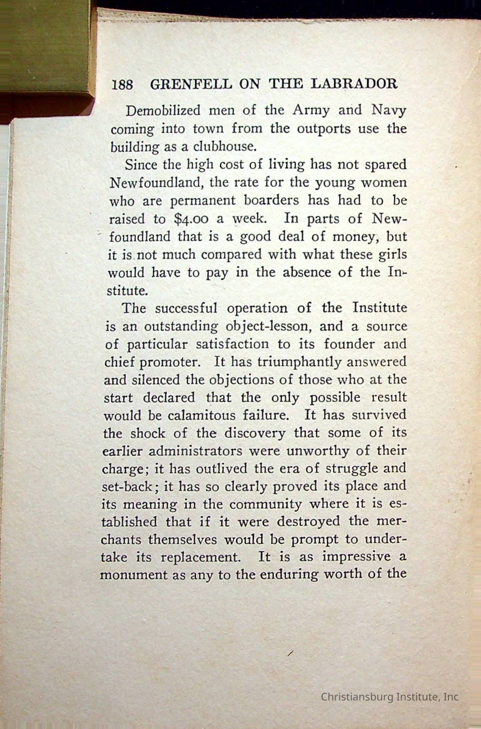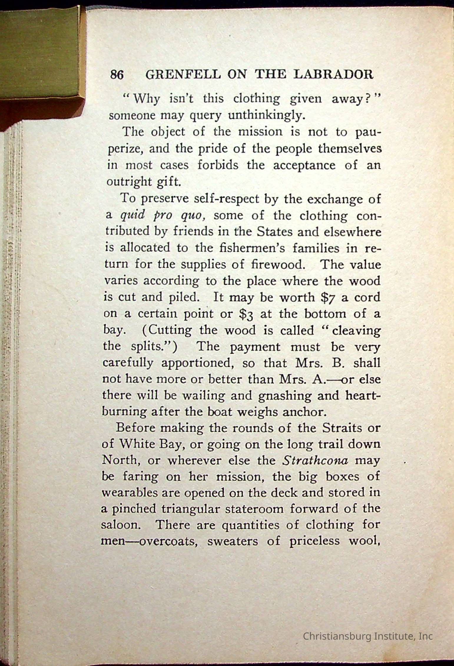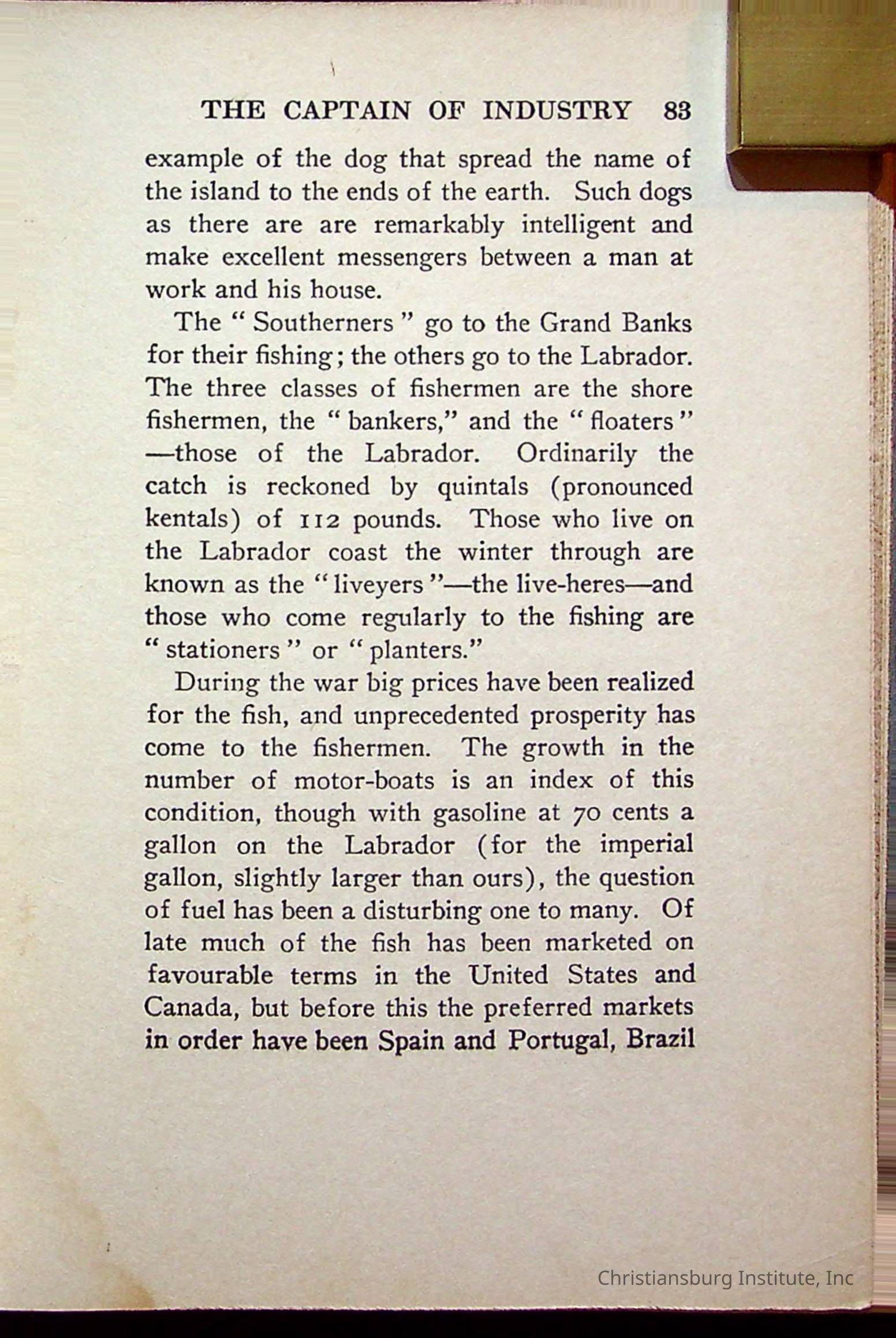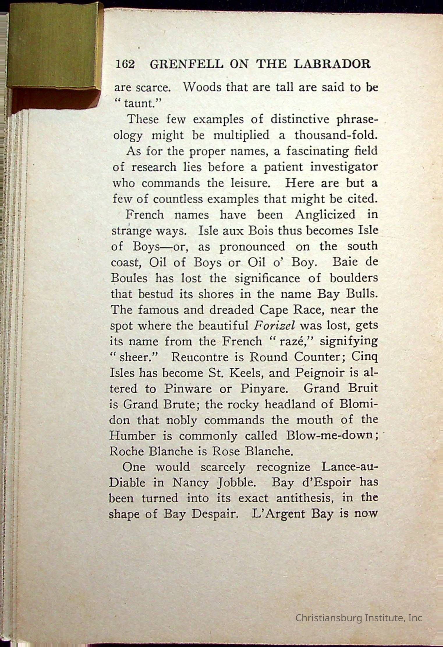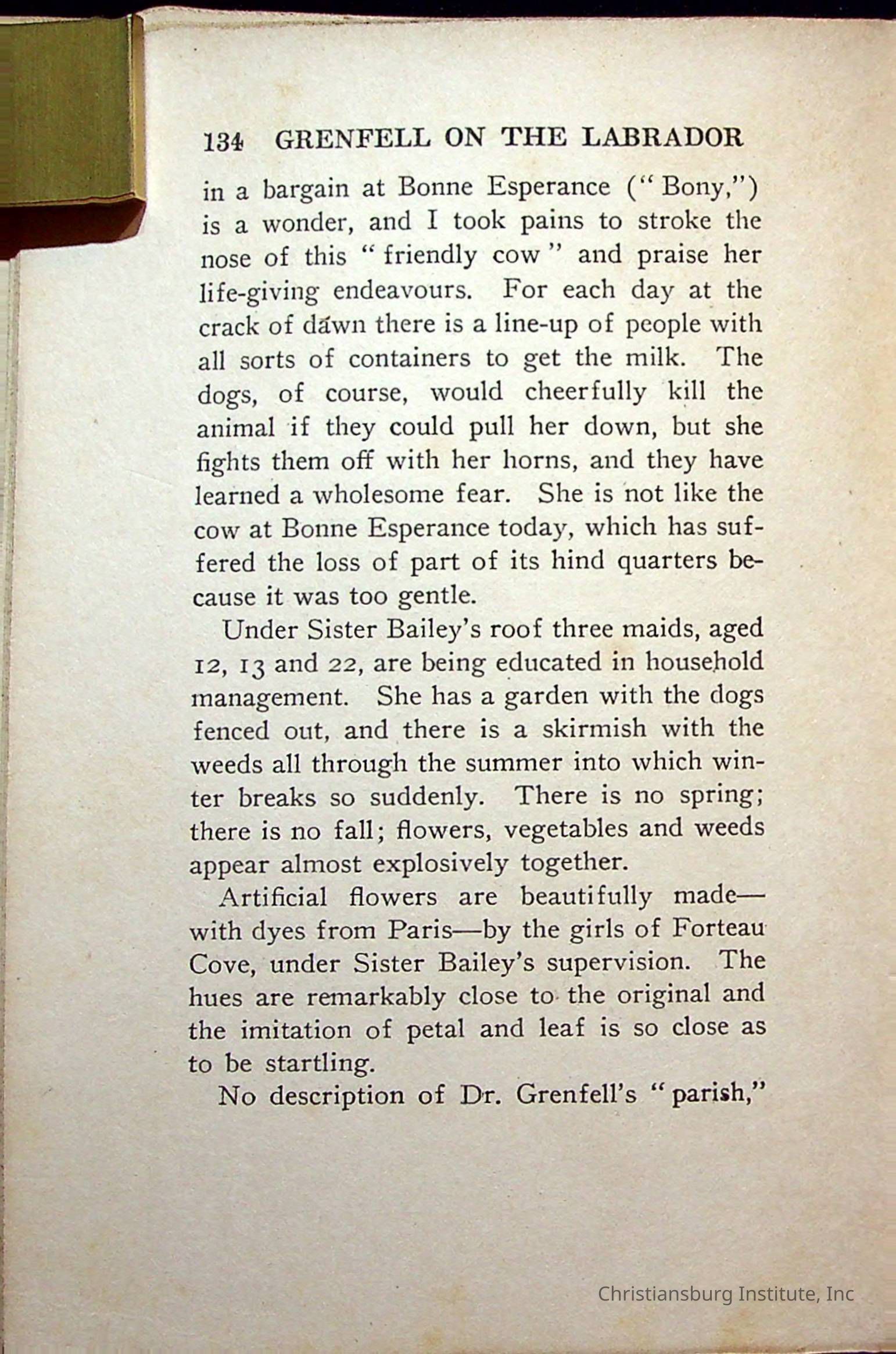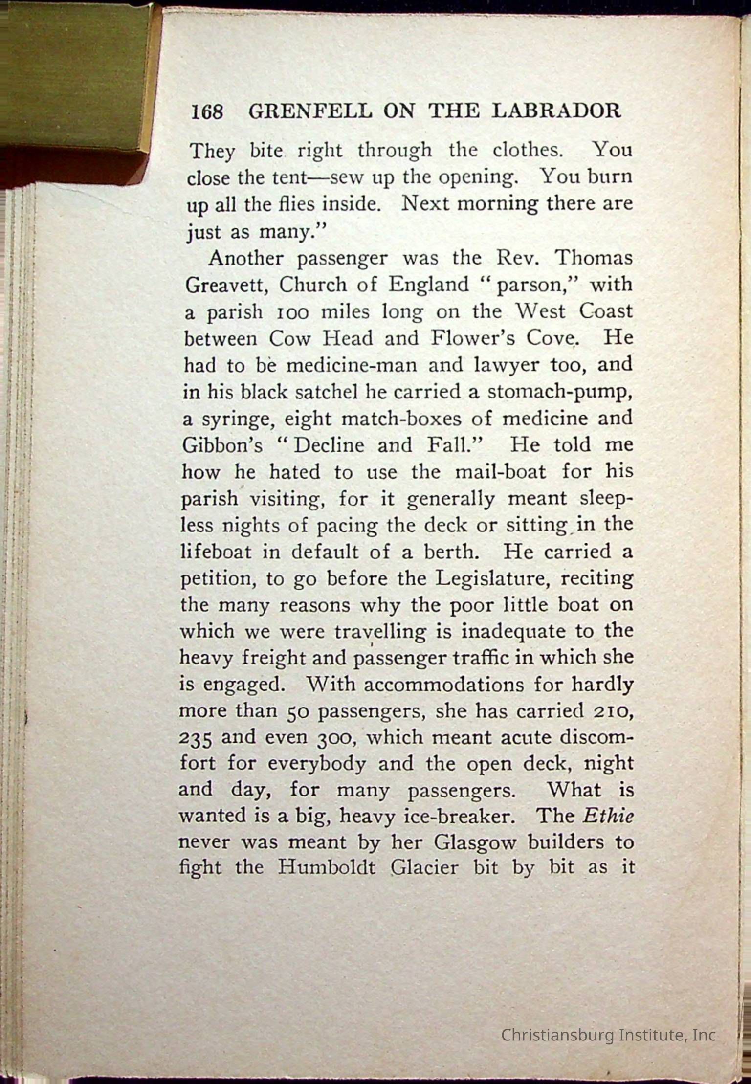 "With Grenfell on The Labrador" written by Fullerton L. Waldo and published by the Fleming H. Revell Company in the year 1920. The book was in the Christiansburg Institute library.