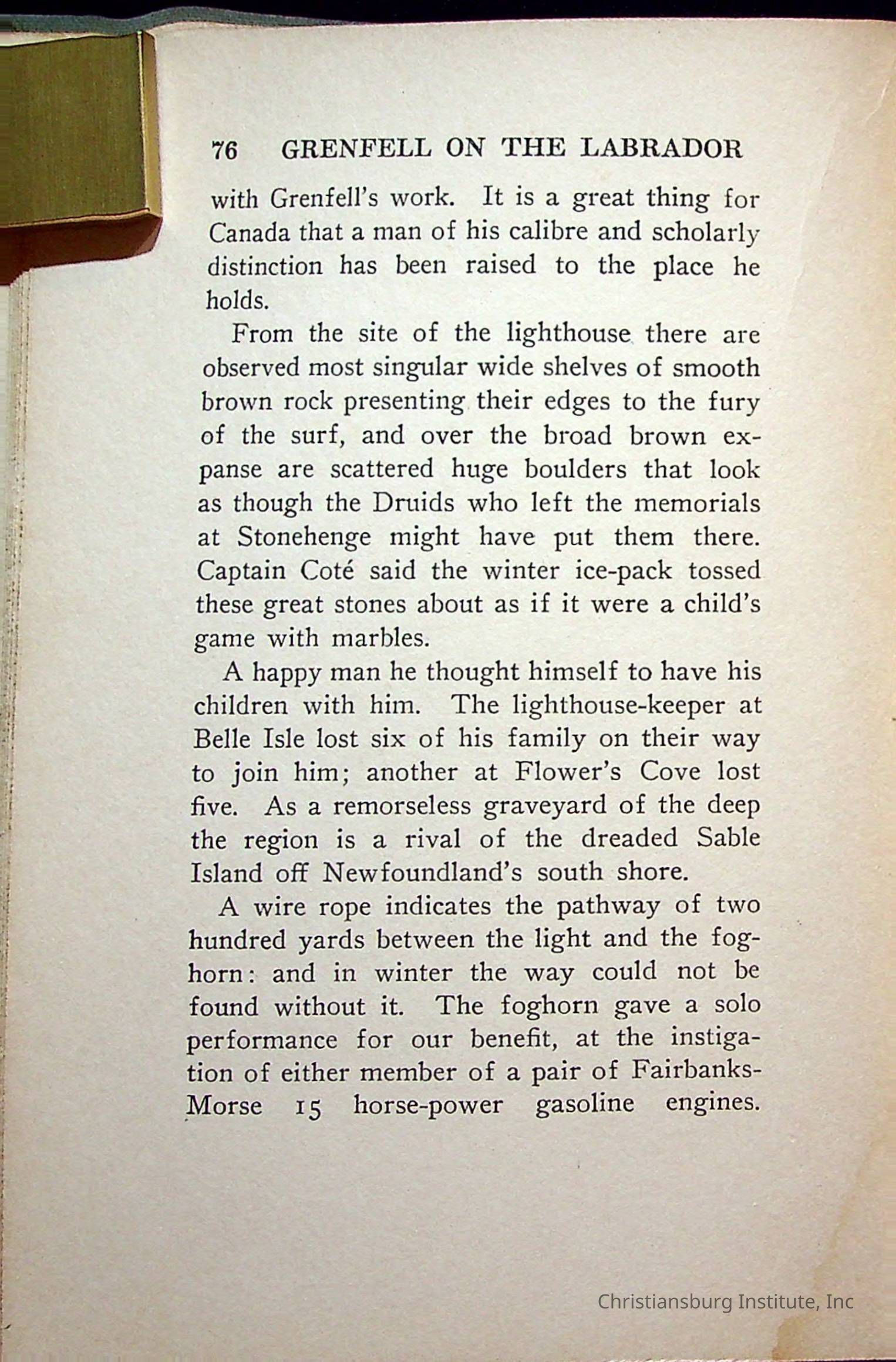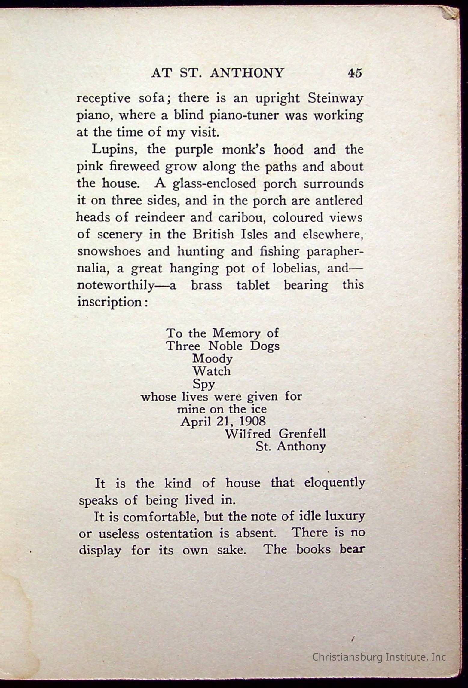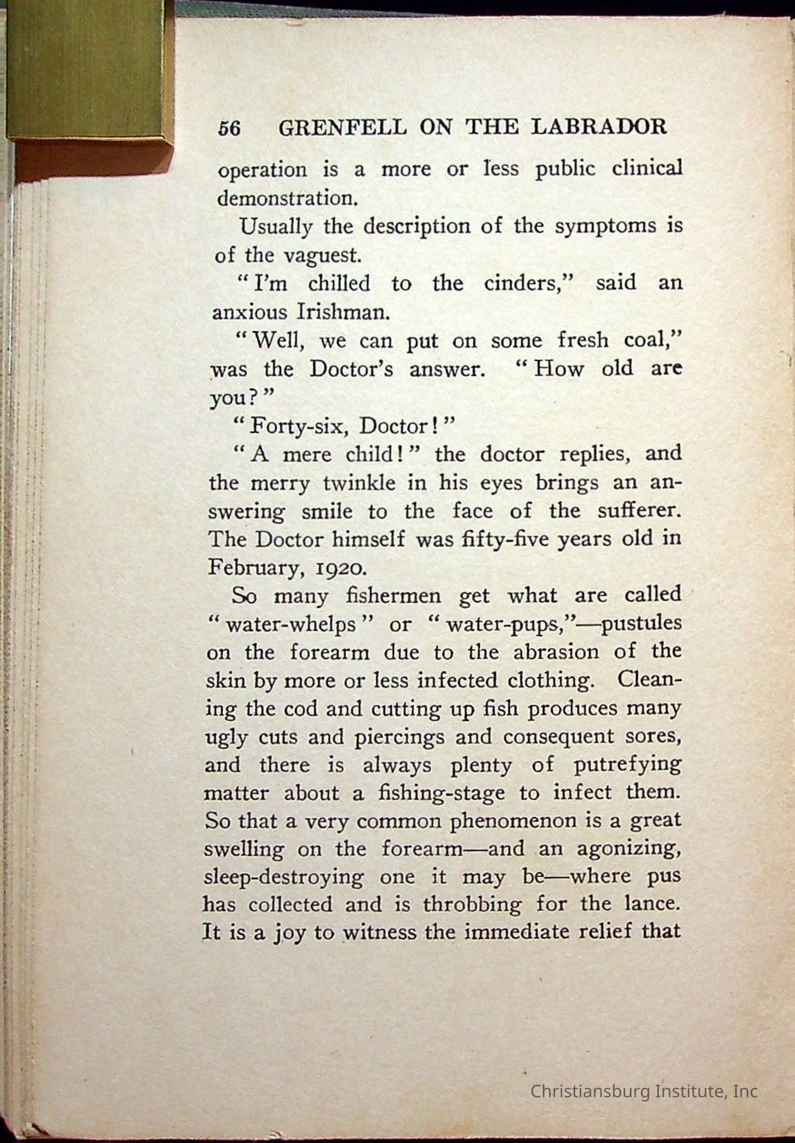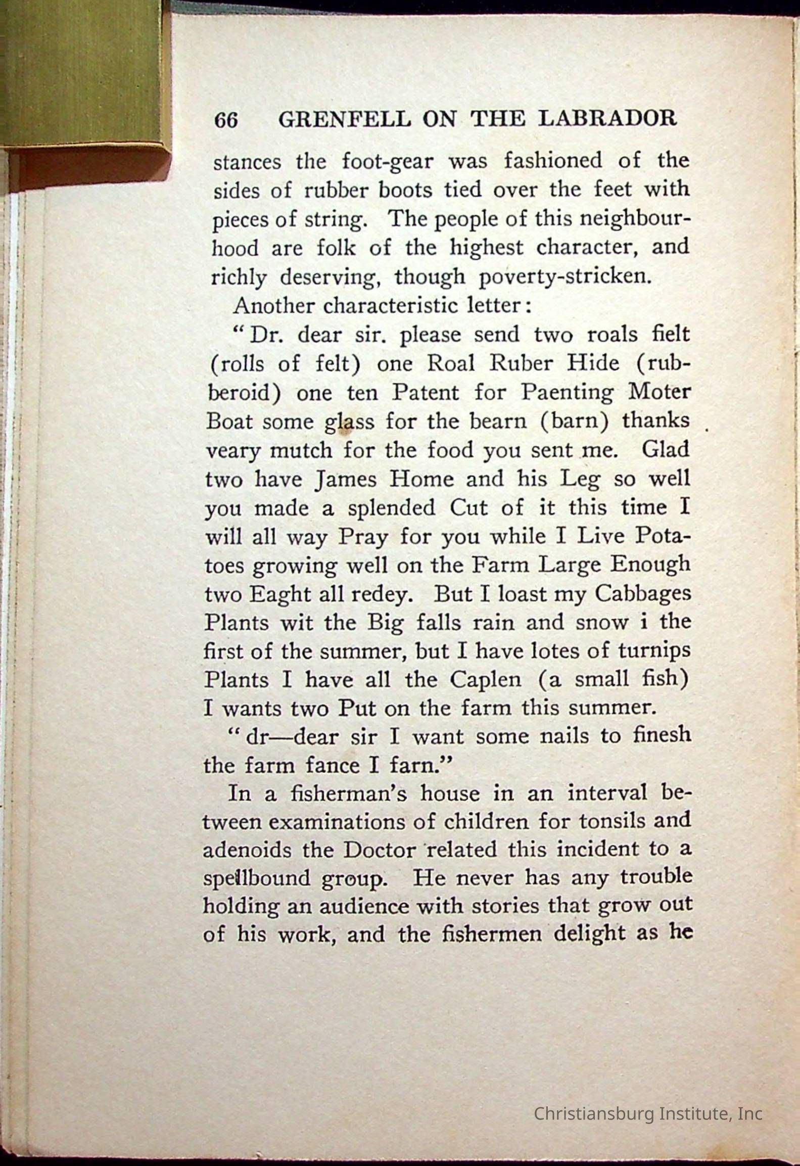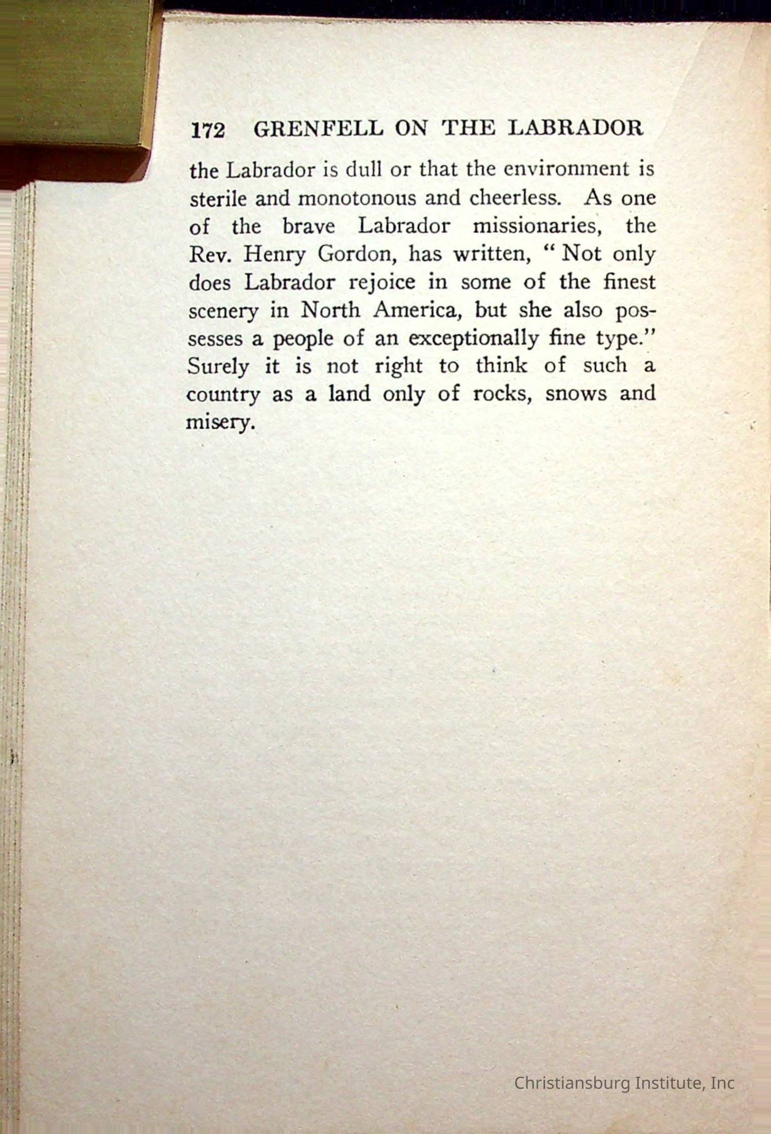 "With Grenfell on The Labrador" written by Fullerton L. Waldo and published by the Fleming H. Revell Company in the year 1920. The book was in the Christiansburg Institute library.