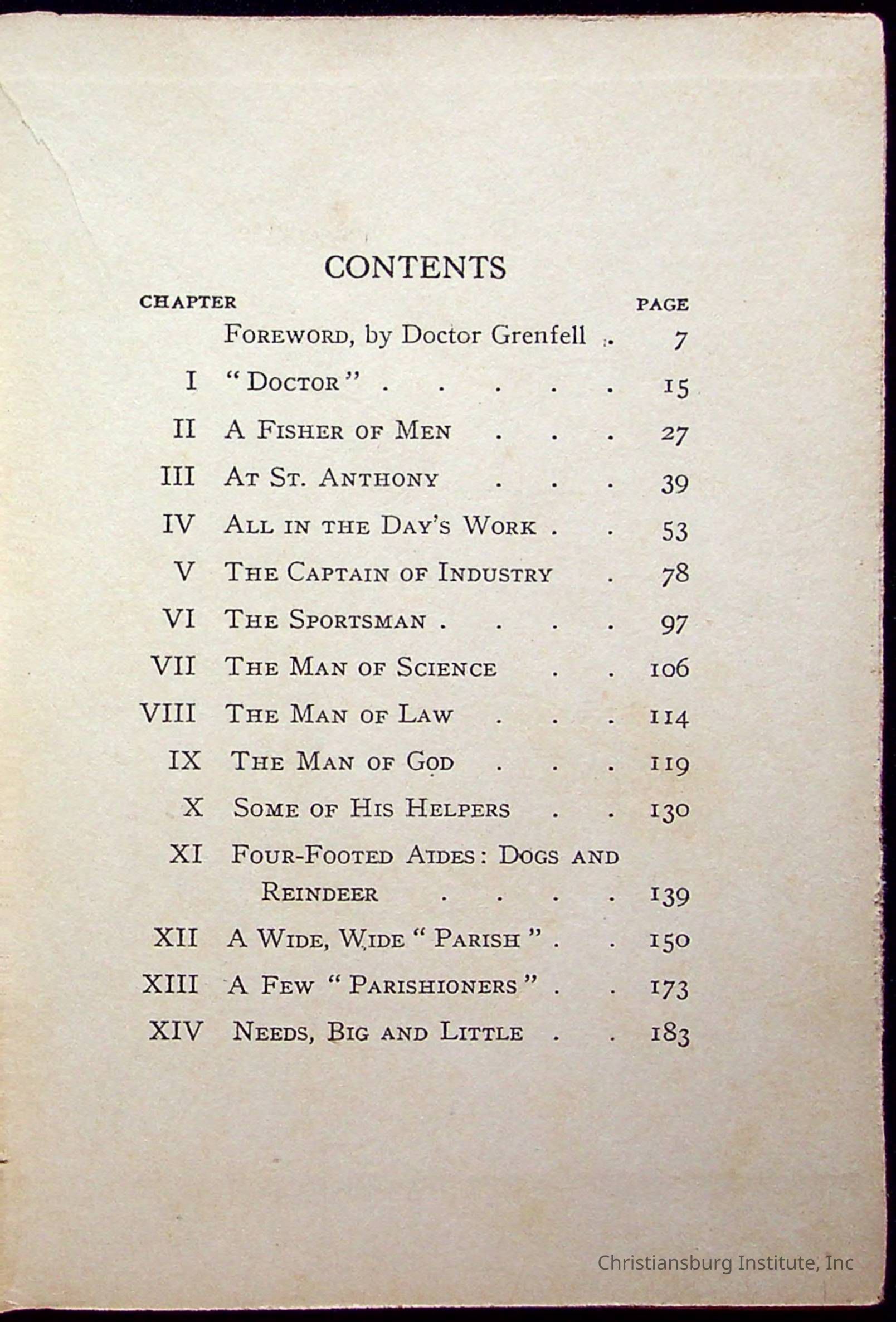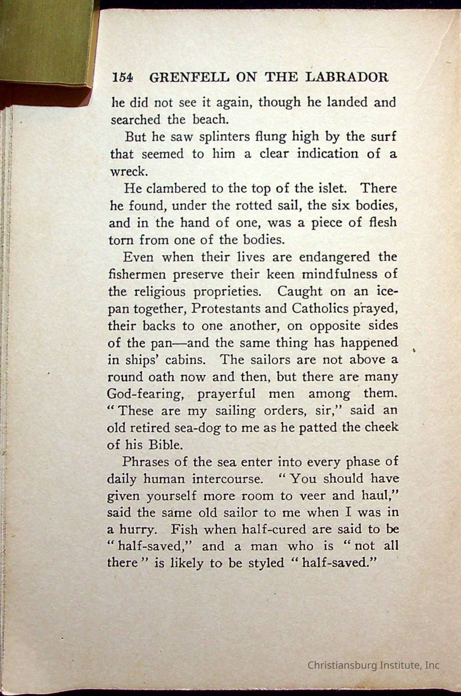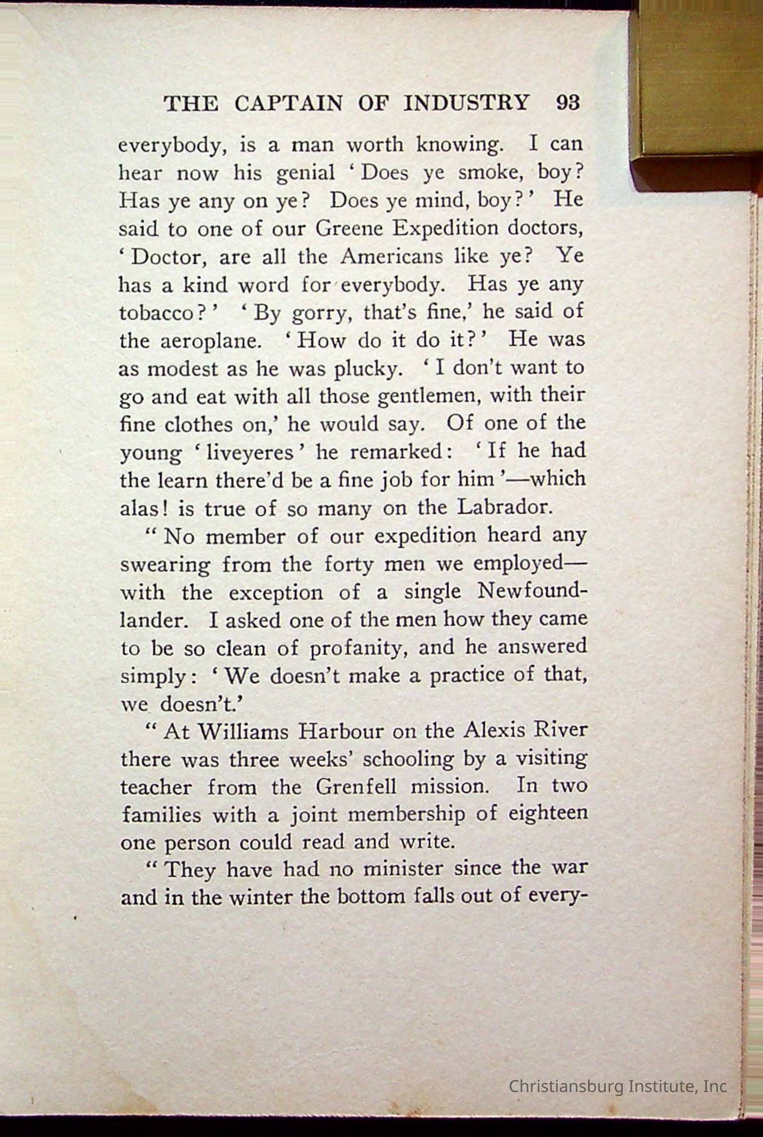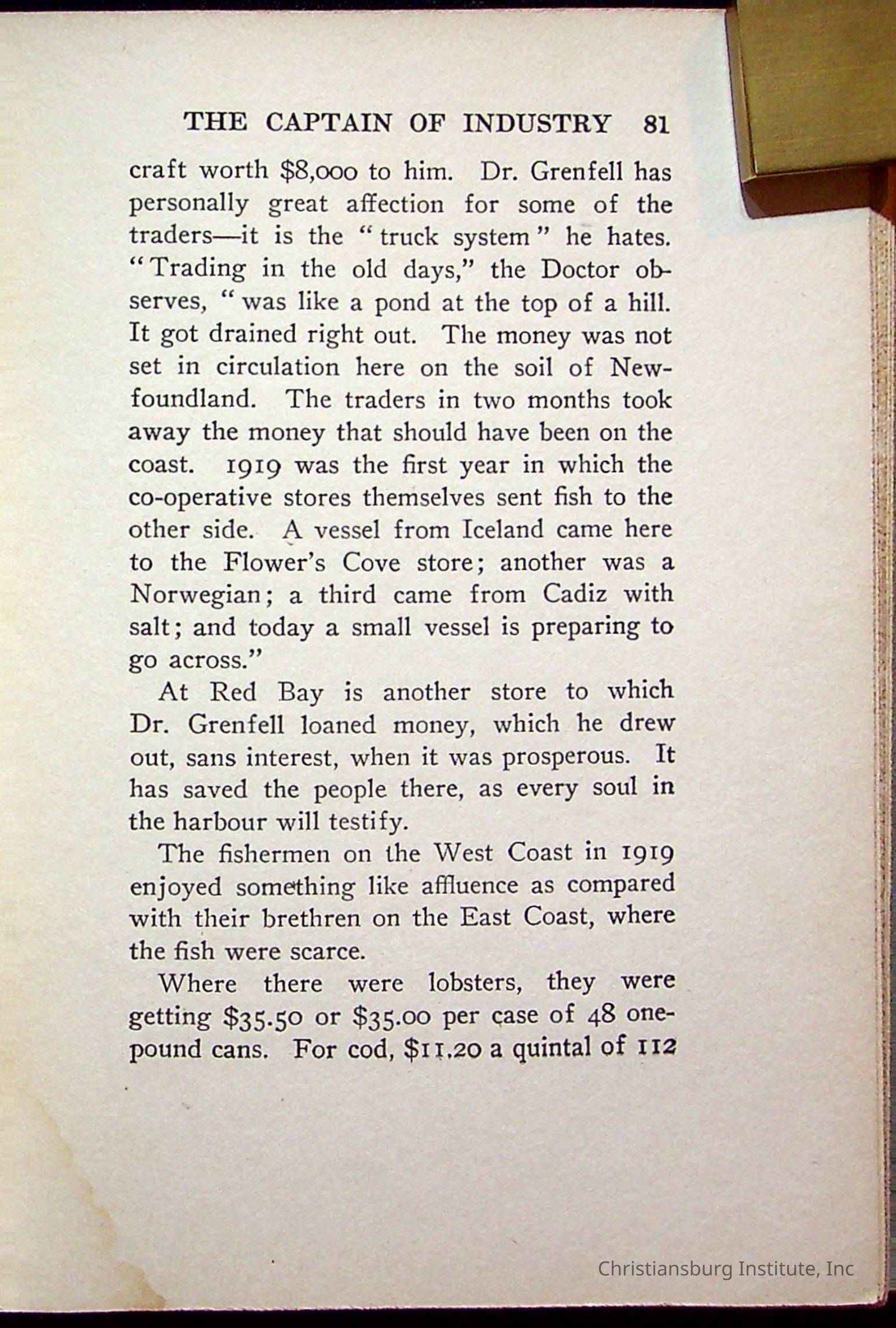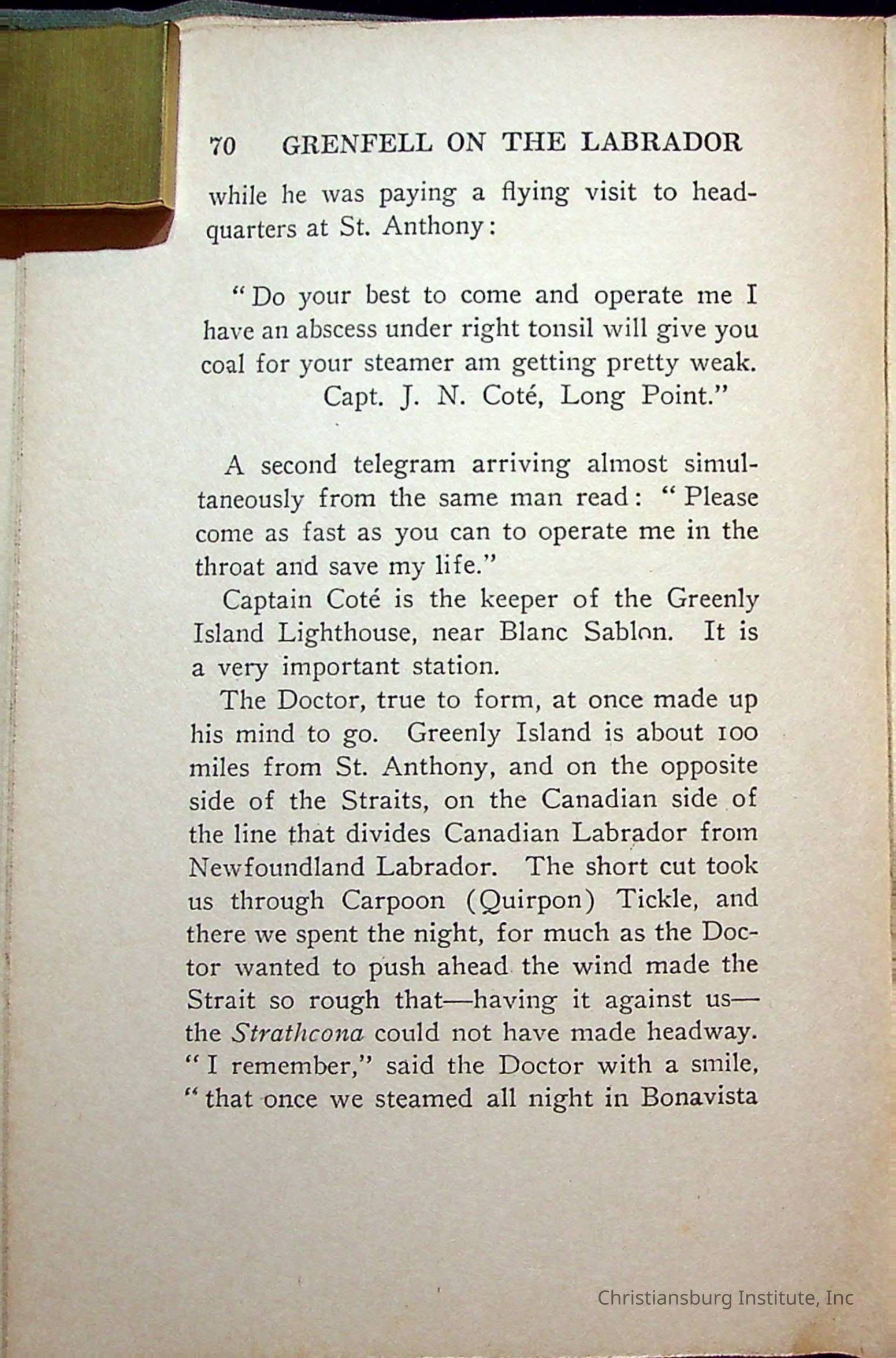 "With Grenfell on The Labrador" written by Fullerton L. Waldo and published by the Fleming H. Revell Company in the year 1920. The book was in the Christiansburg Institute library.