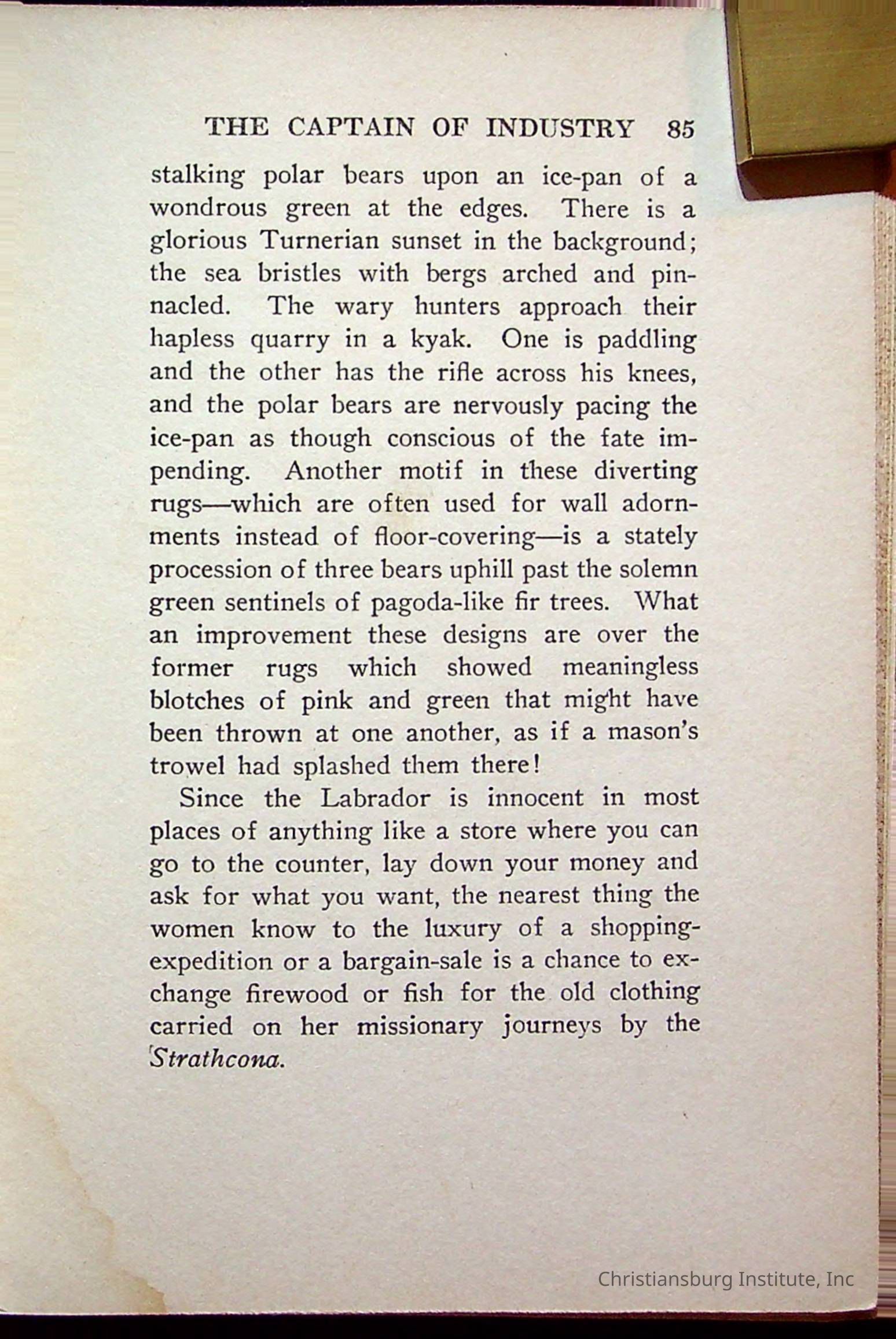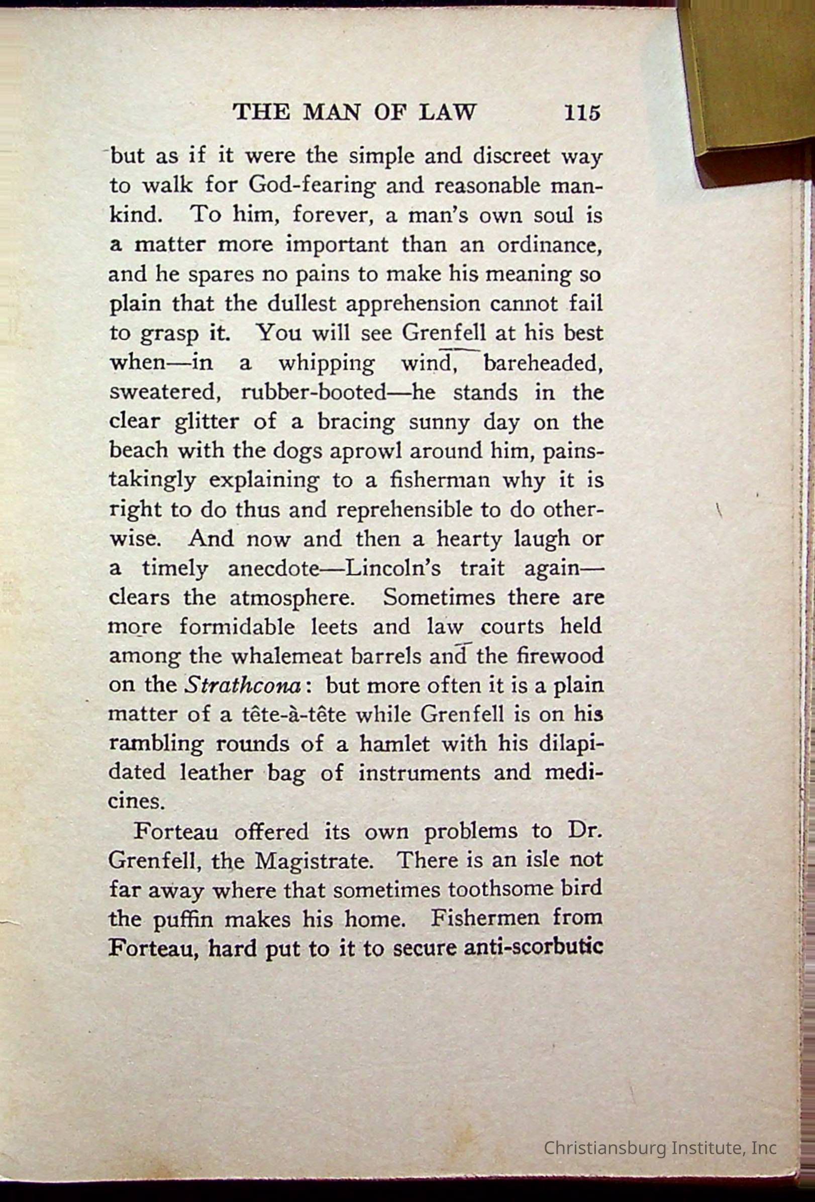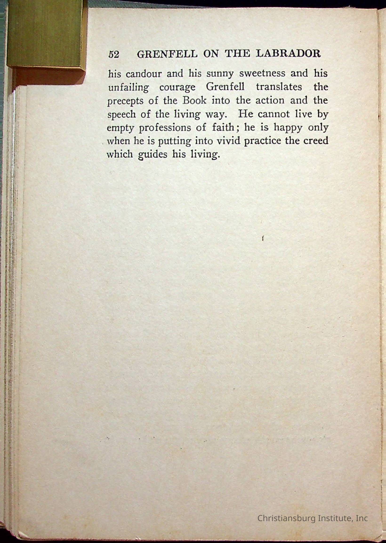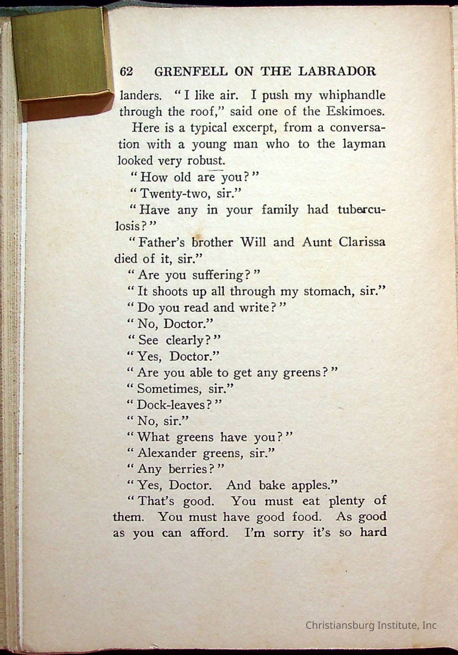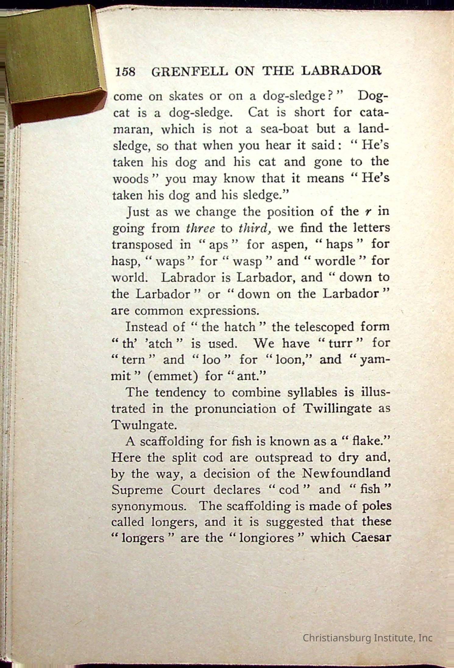 "With Grenfell on The Labrador" written by Fullerton L. Waldo and published by the Fleming H. Revell Company in the year 1920. The book was in the Christiansburg Institute library.