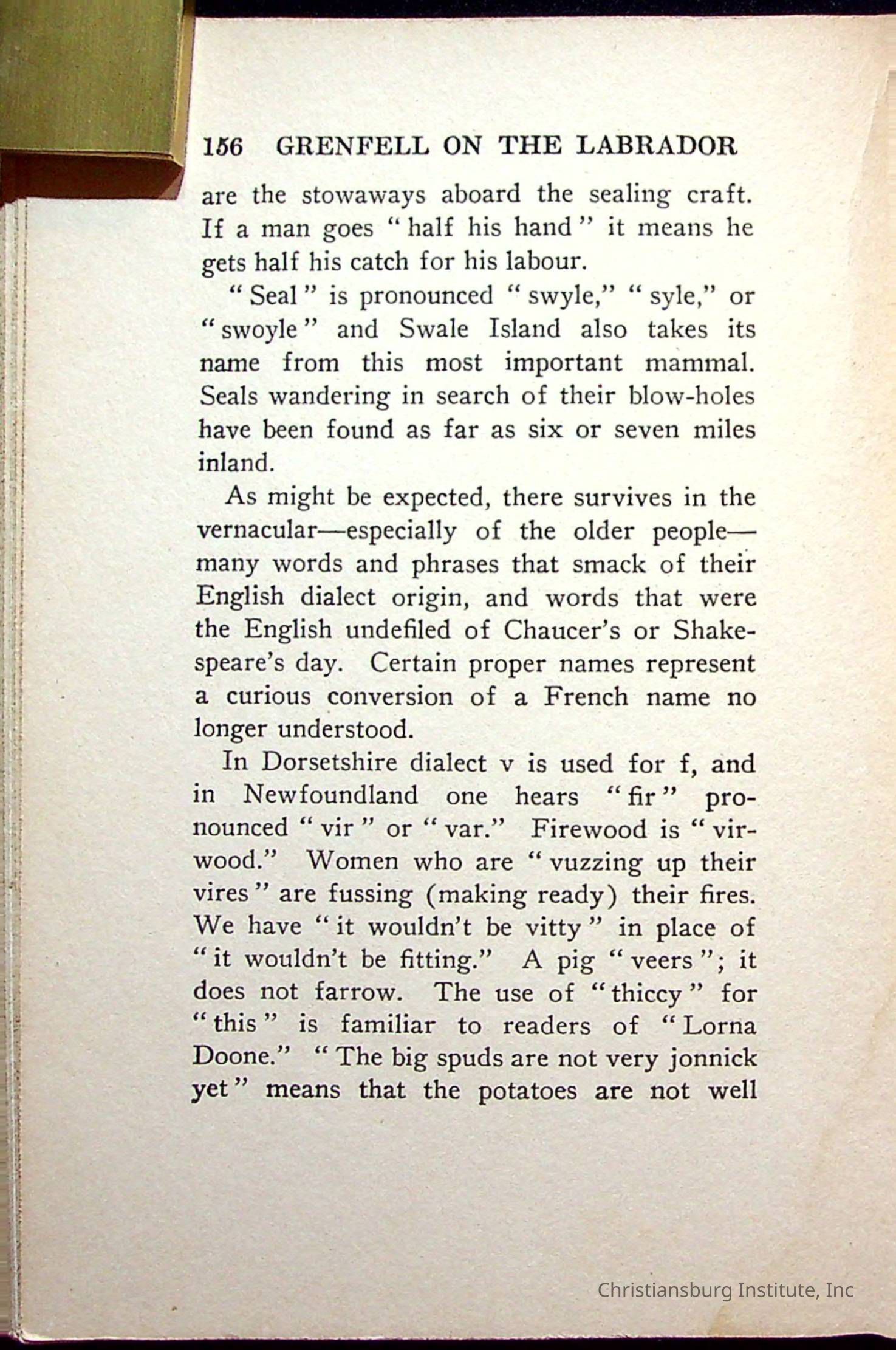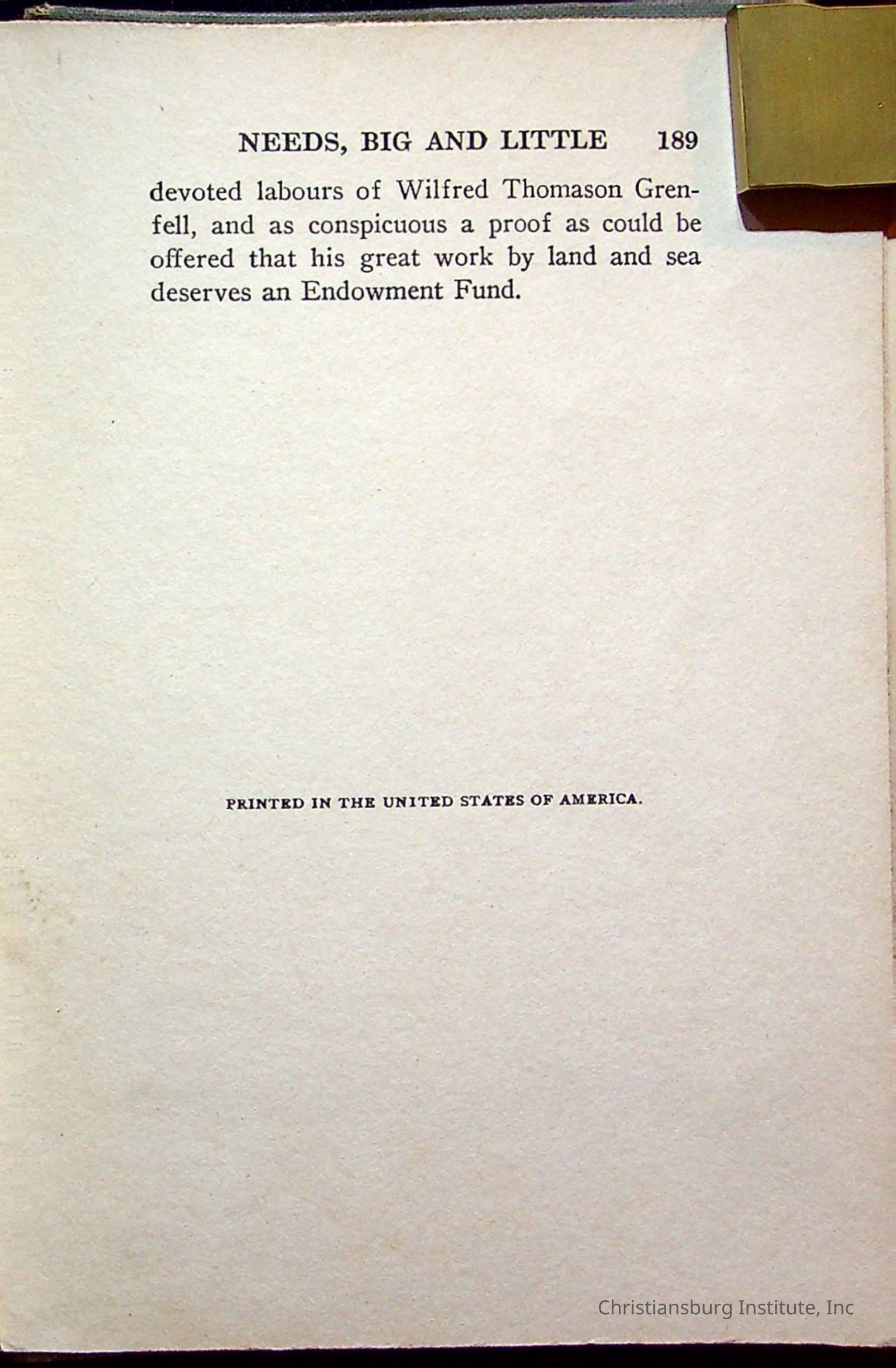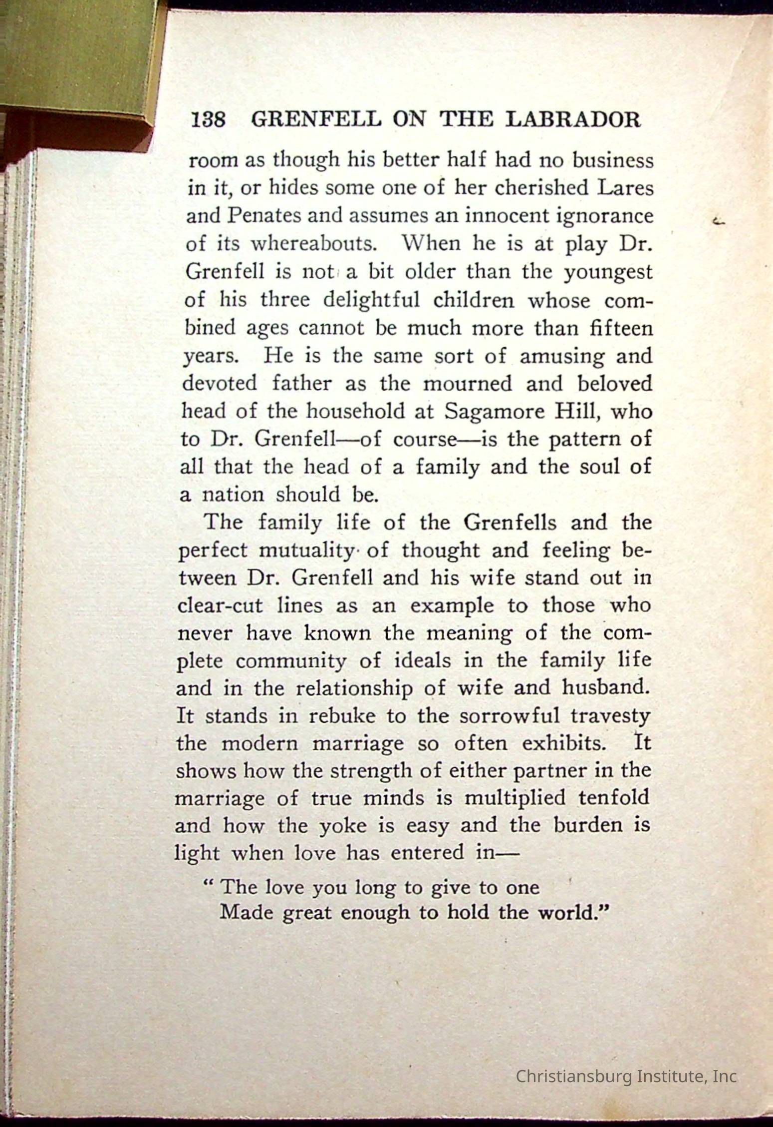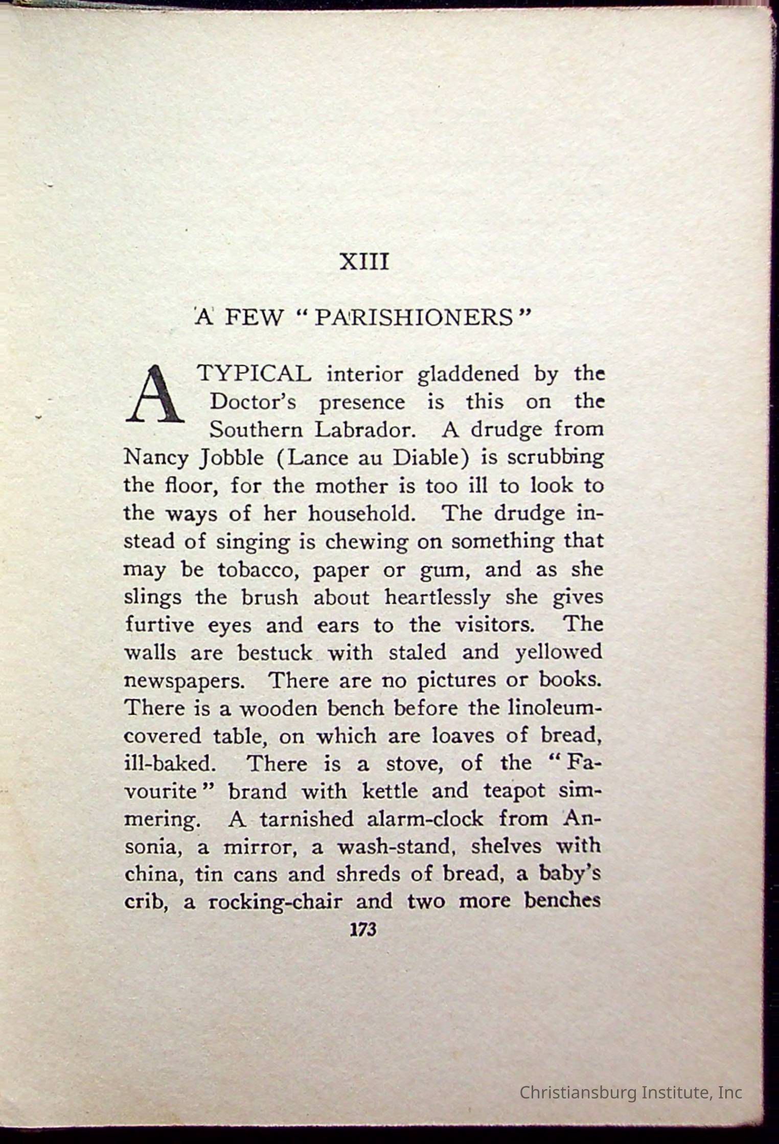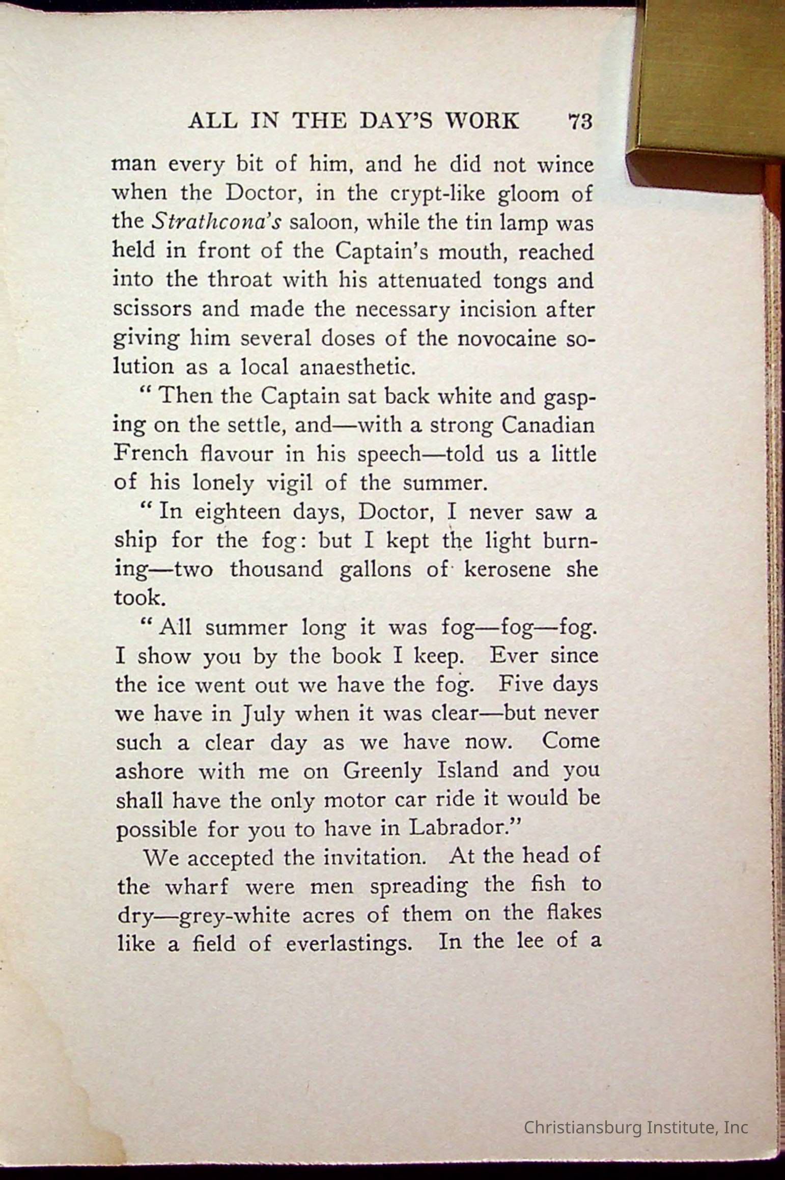 "With Grenfell on The Labrador" written by Fullerton L. Waldo and published by the Fleming H. Revell Company in the year 1920. The book was in the Christiansburg Institute library.