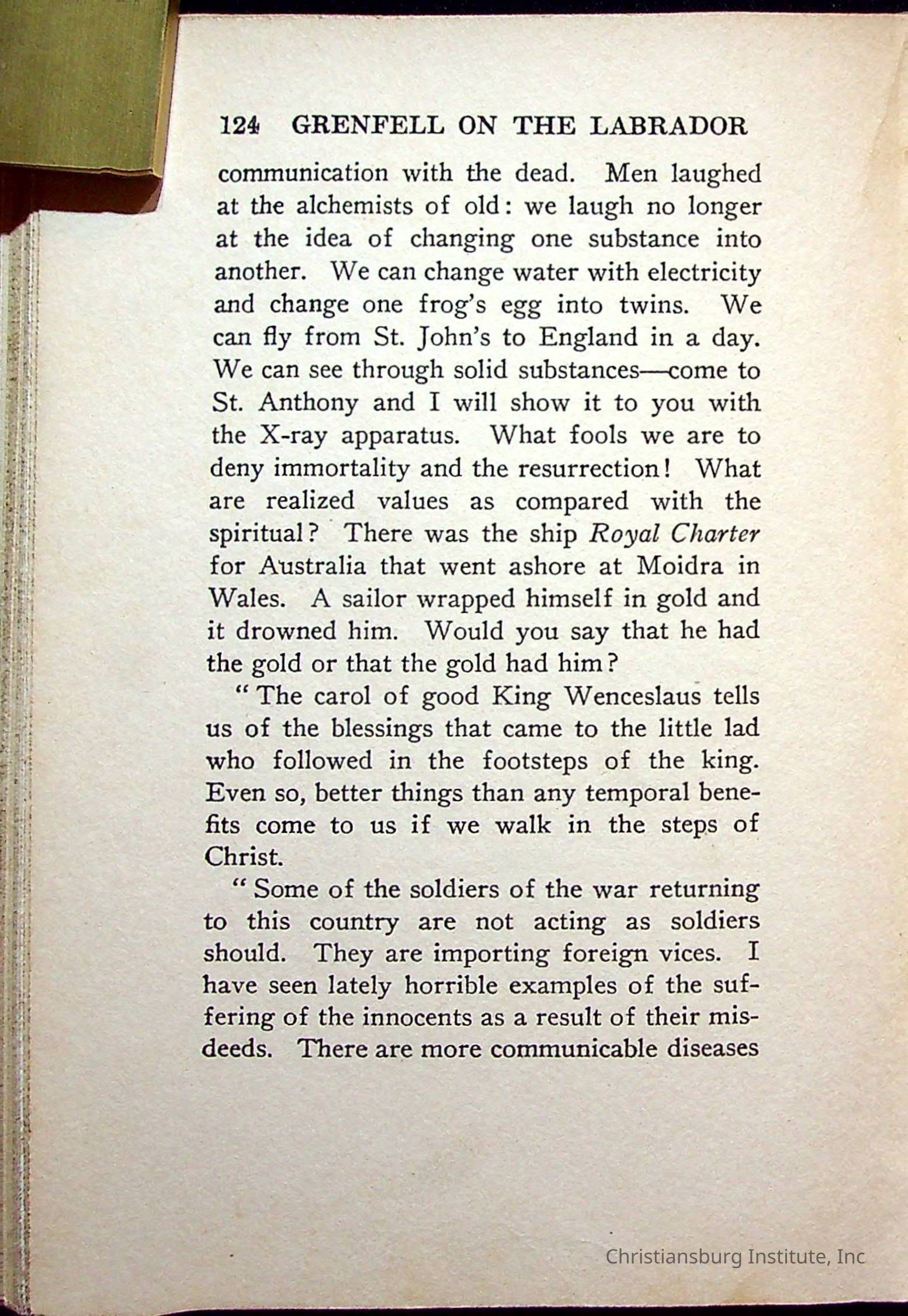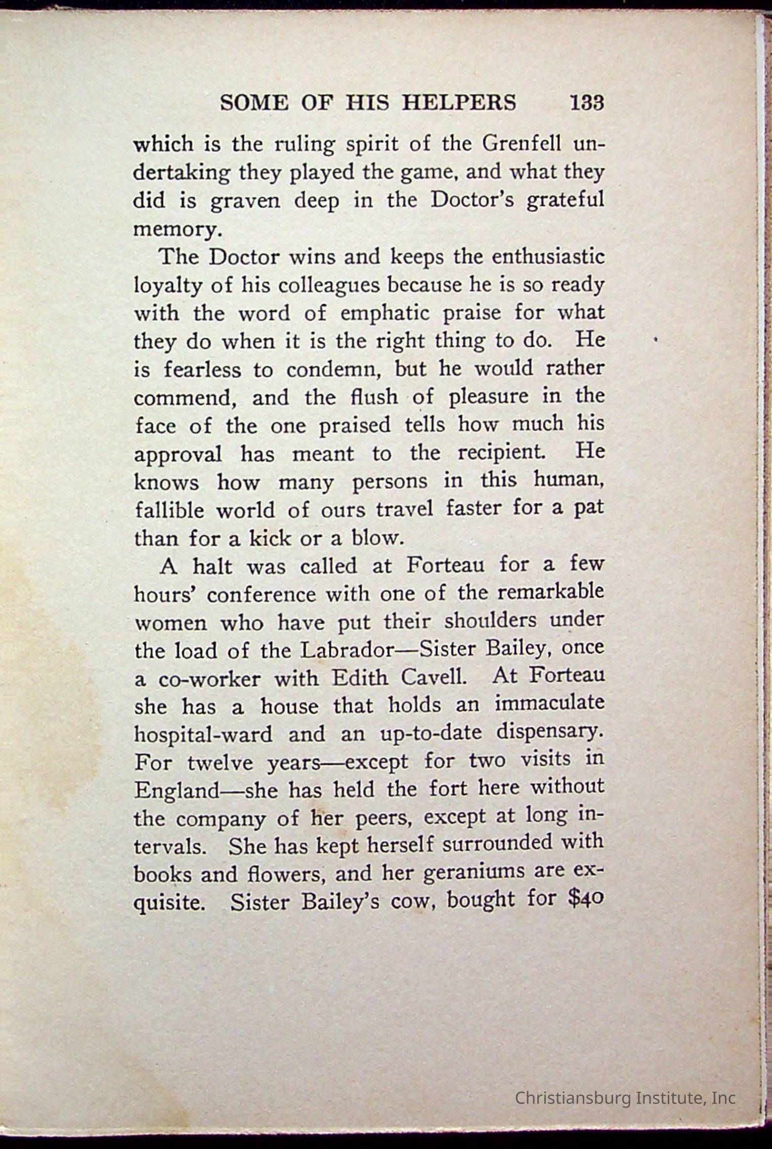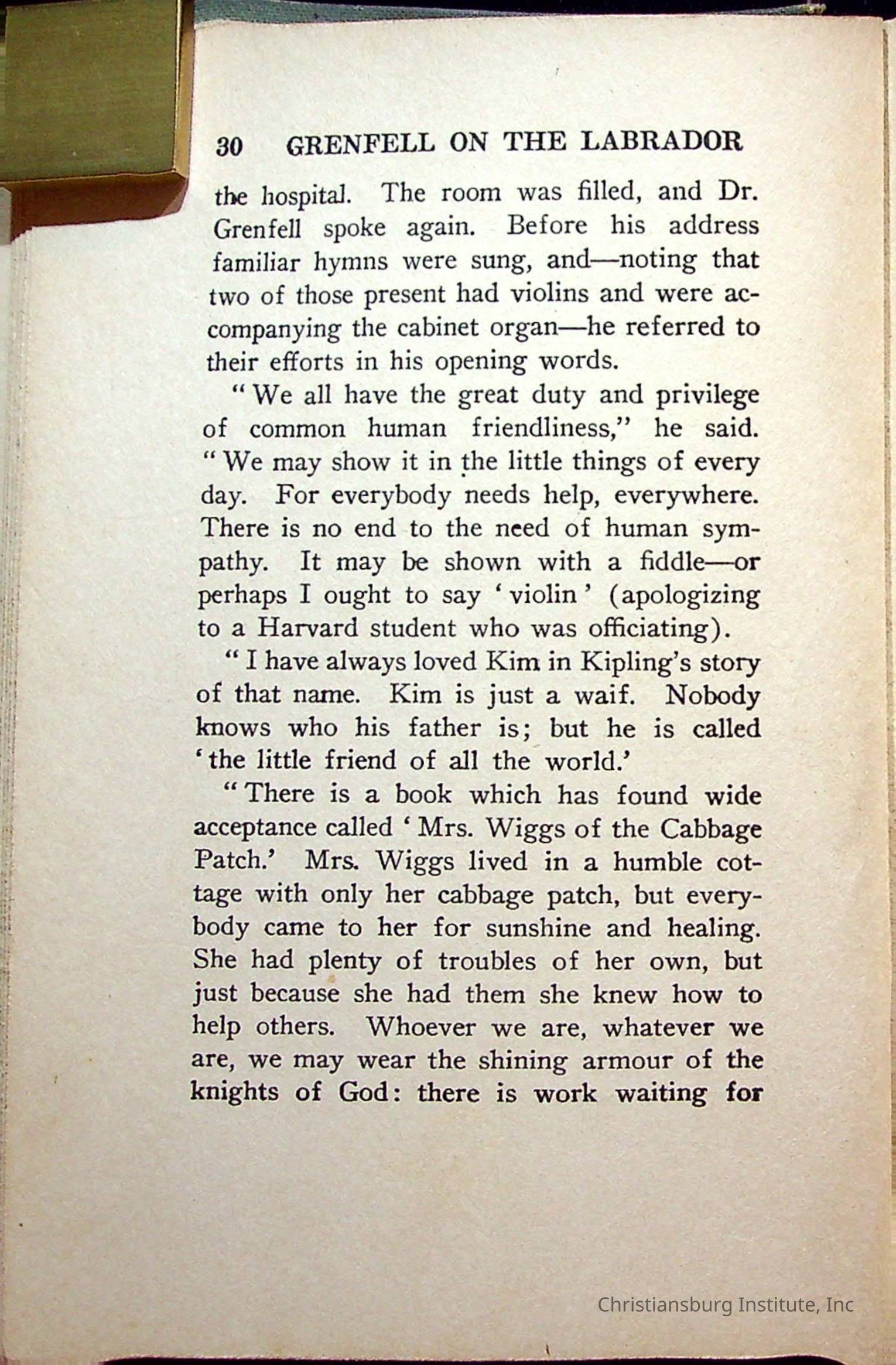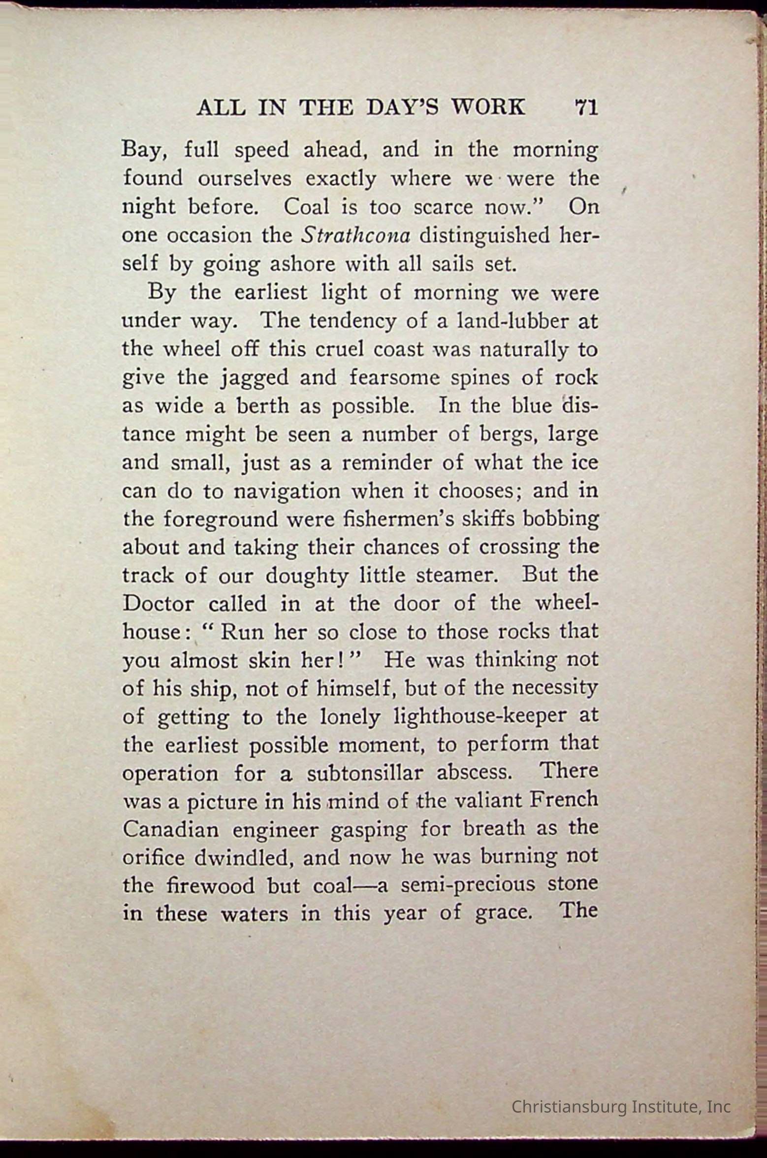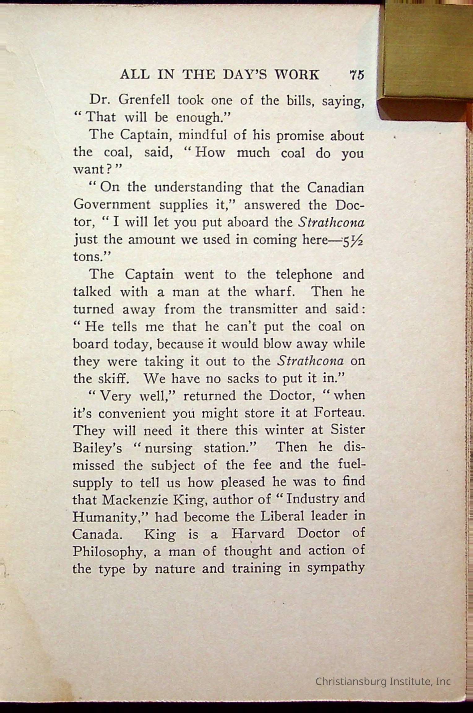 "With Grenfell on The Labrador" written by Fullerton L. Waldo and published by the Fleming H. Revell Company in the year 1920. The book was in the Christiansburg Institute library.