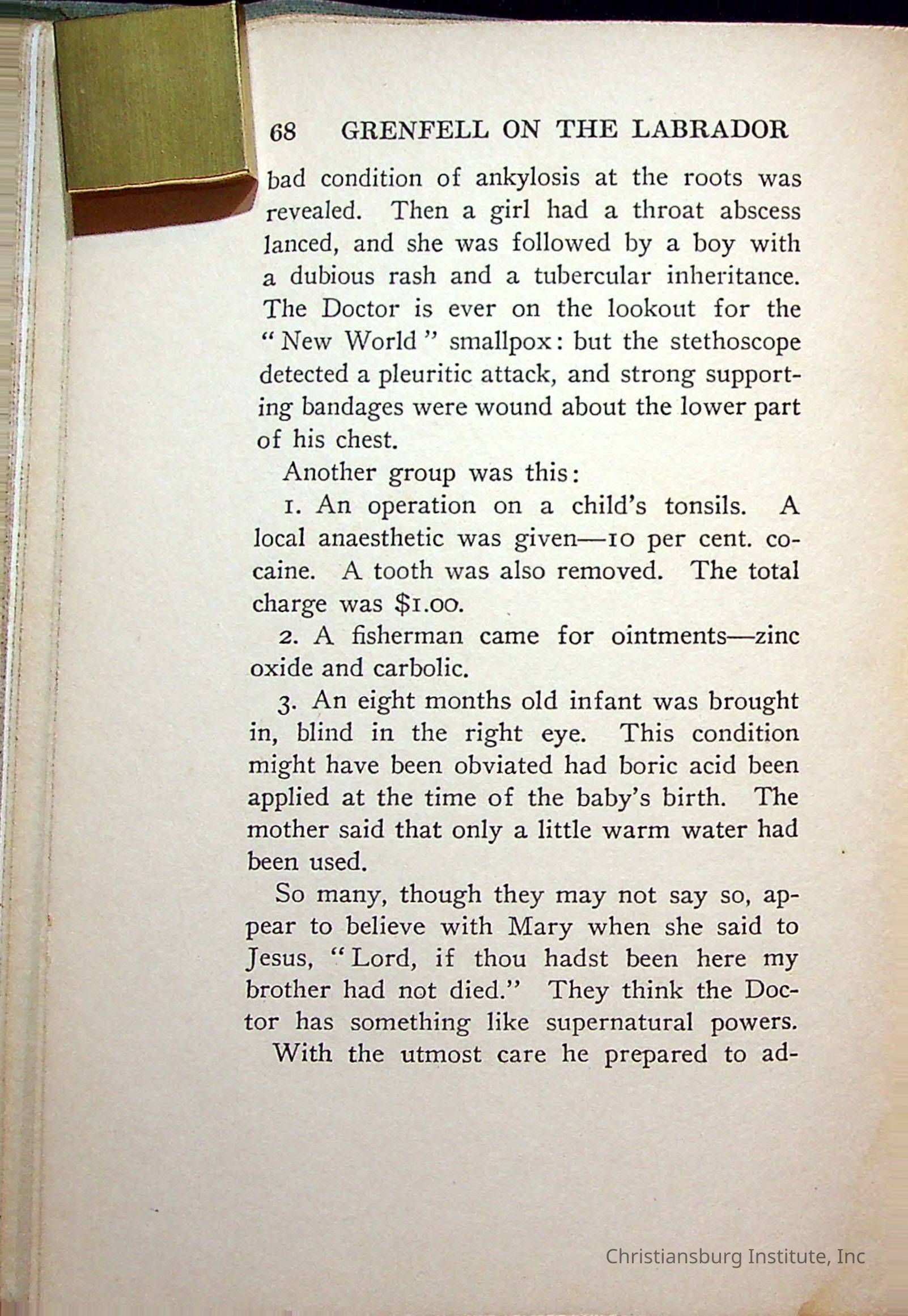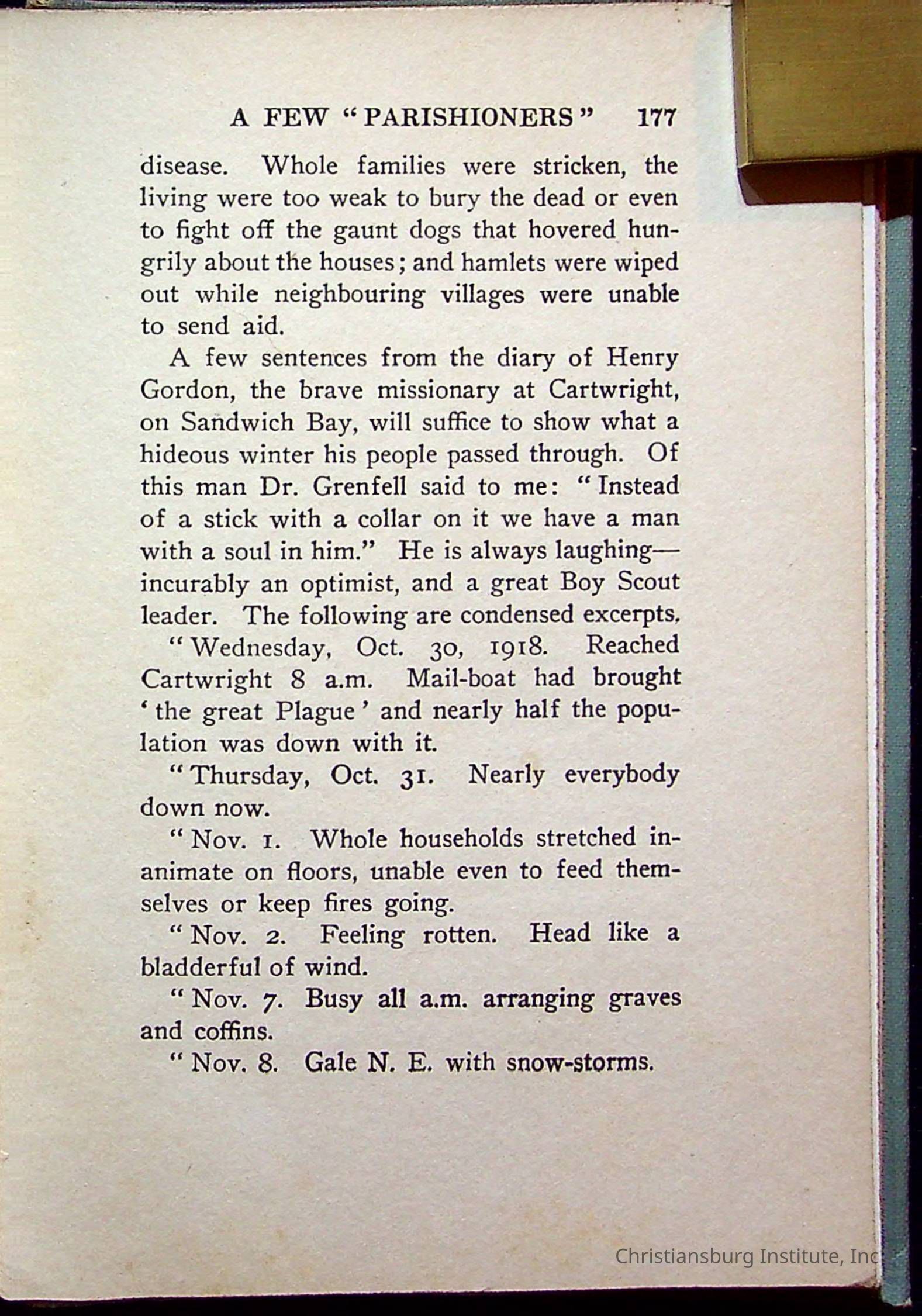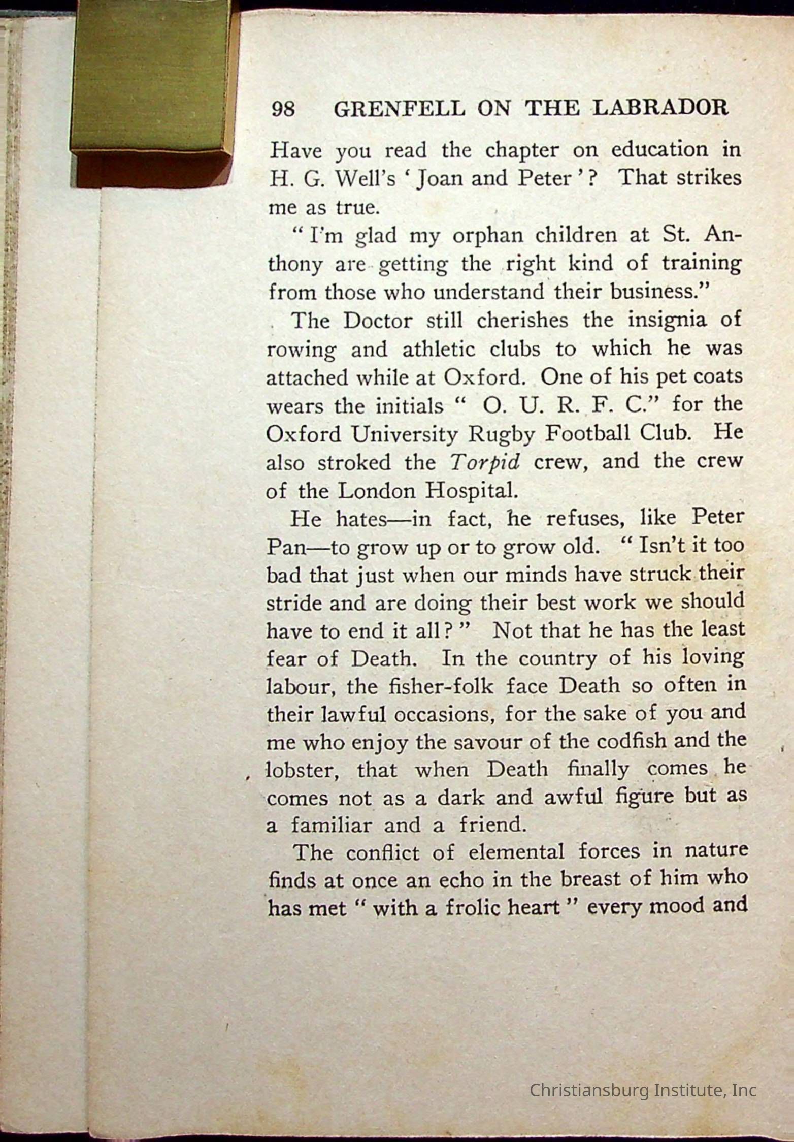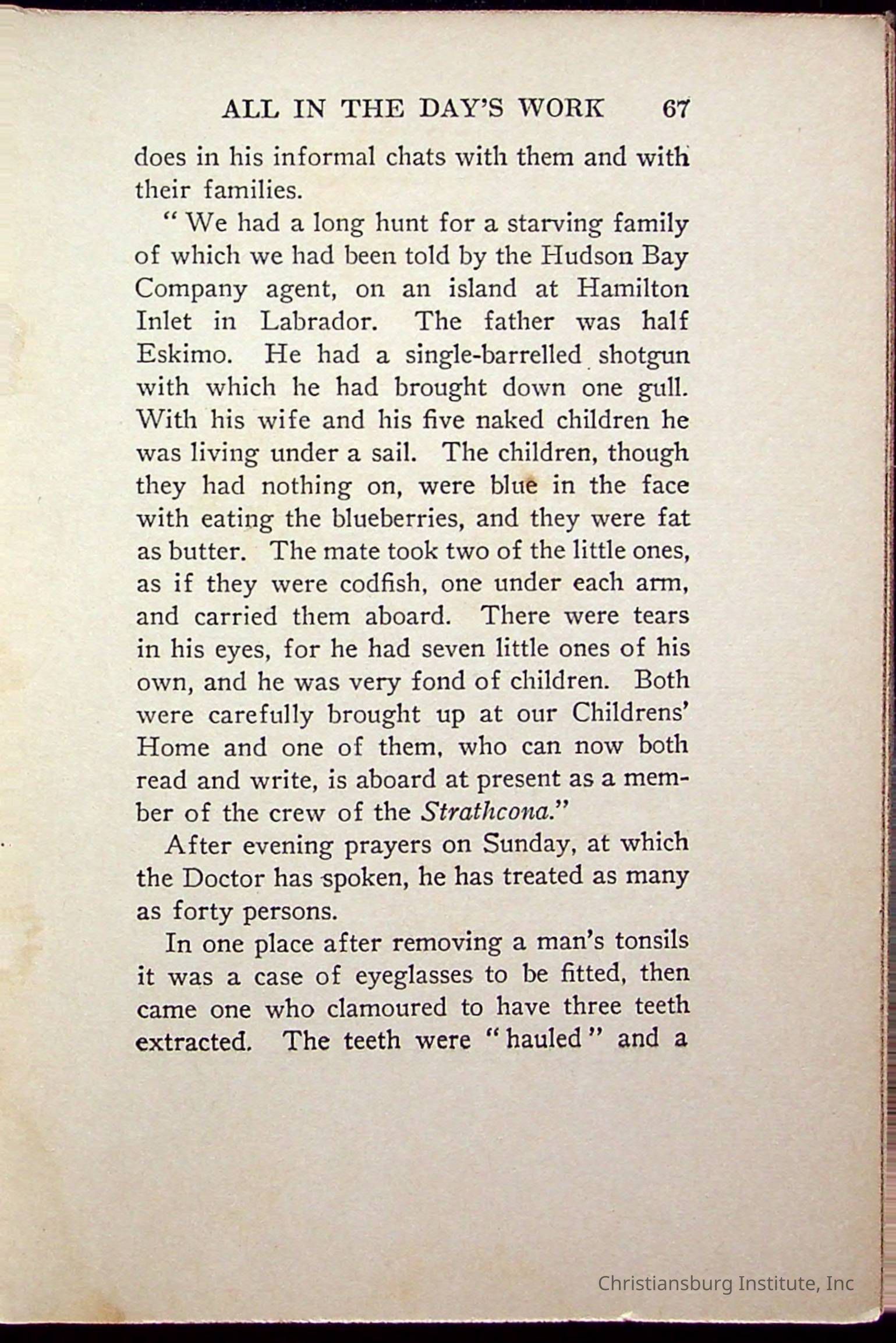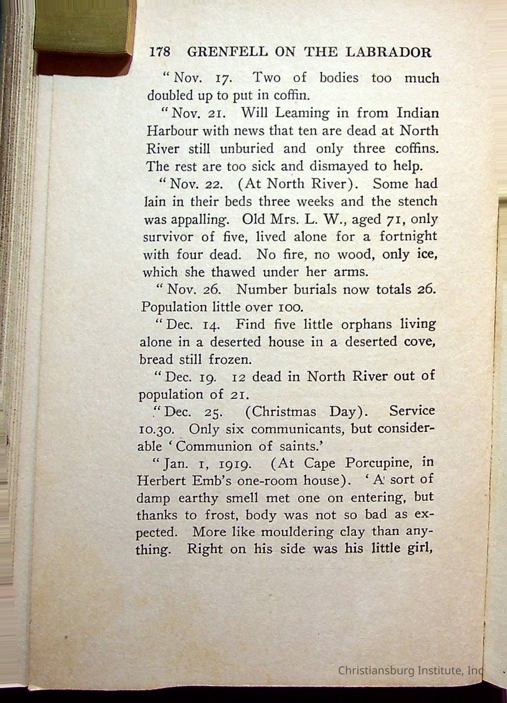 "With Grenfell on The Labrador" written by Fullerton L. Waldo and published by the Fleming H. Revell Company in the year 1920. The book was in the Christiansburg Institute library.