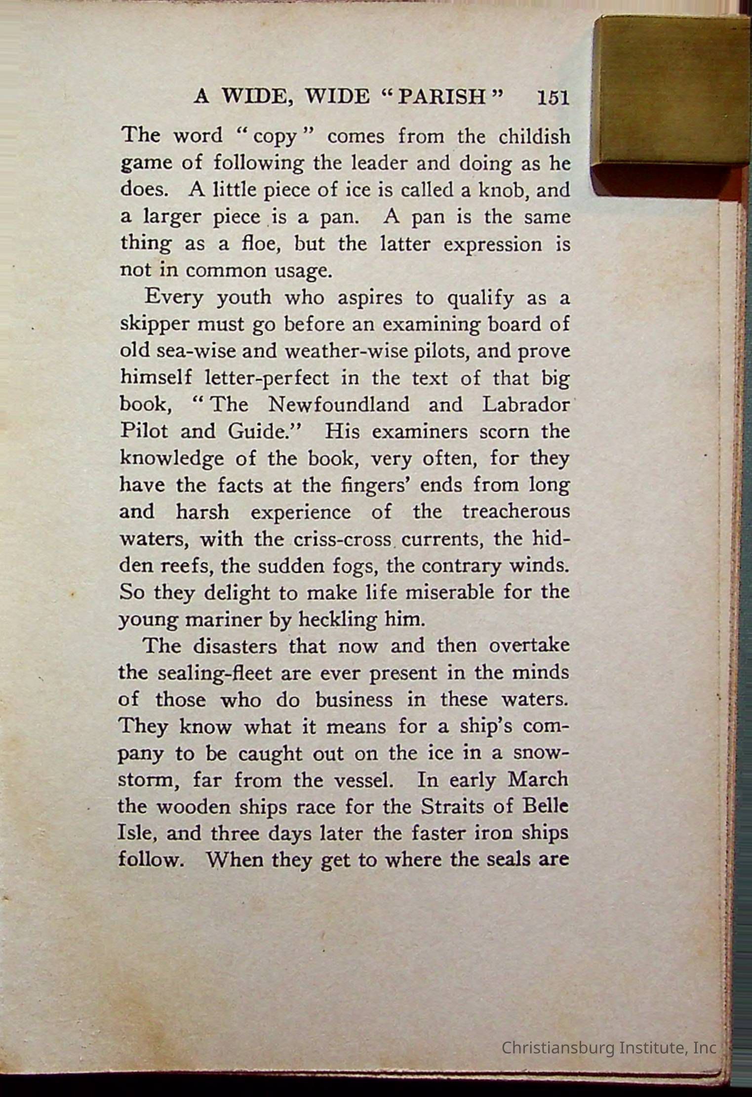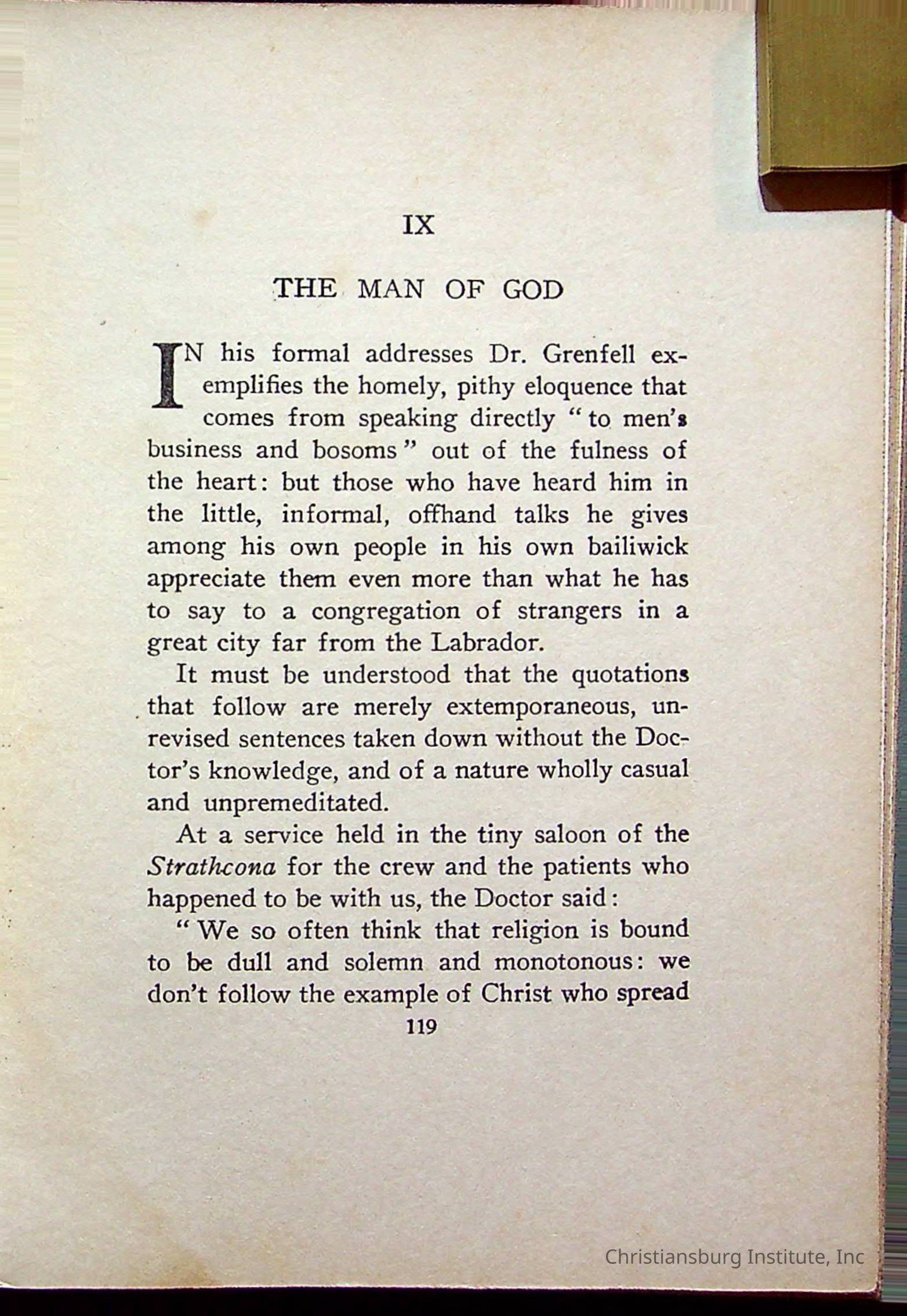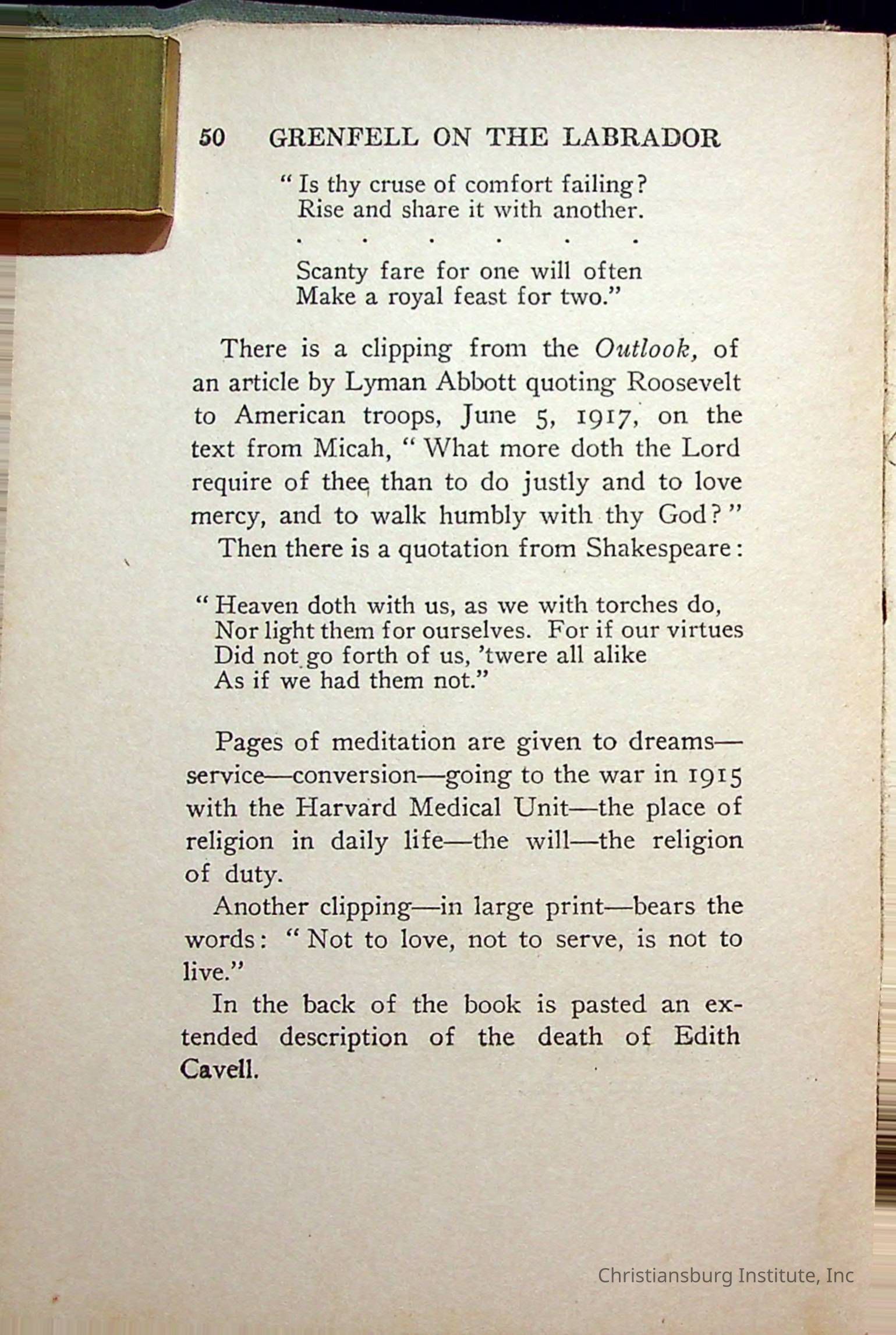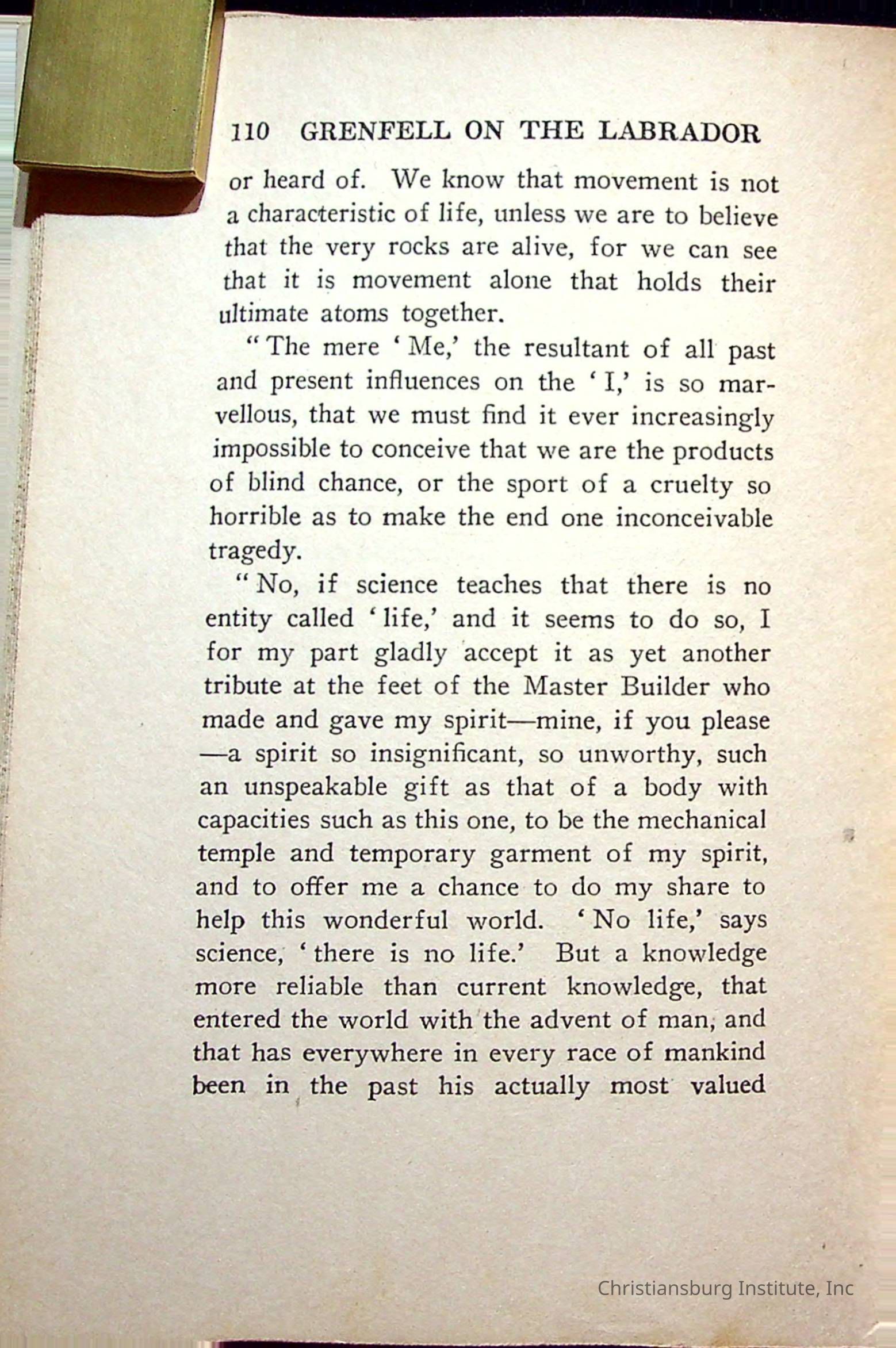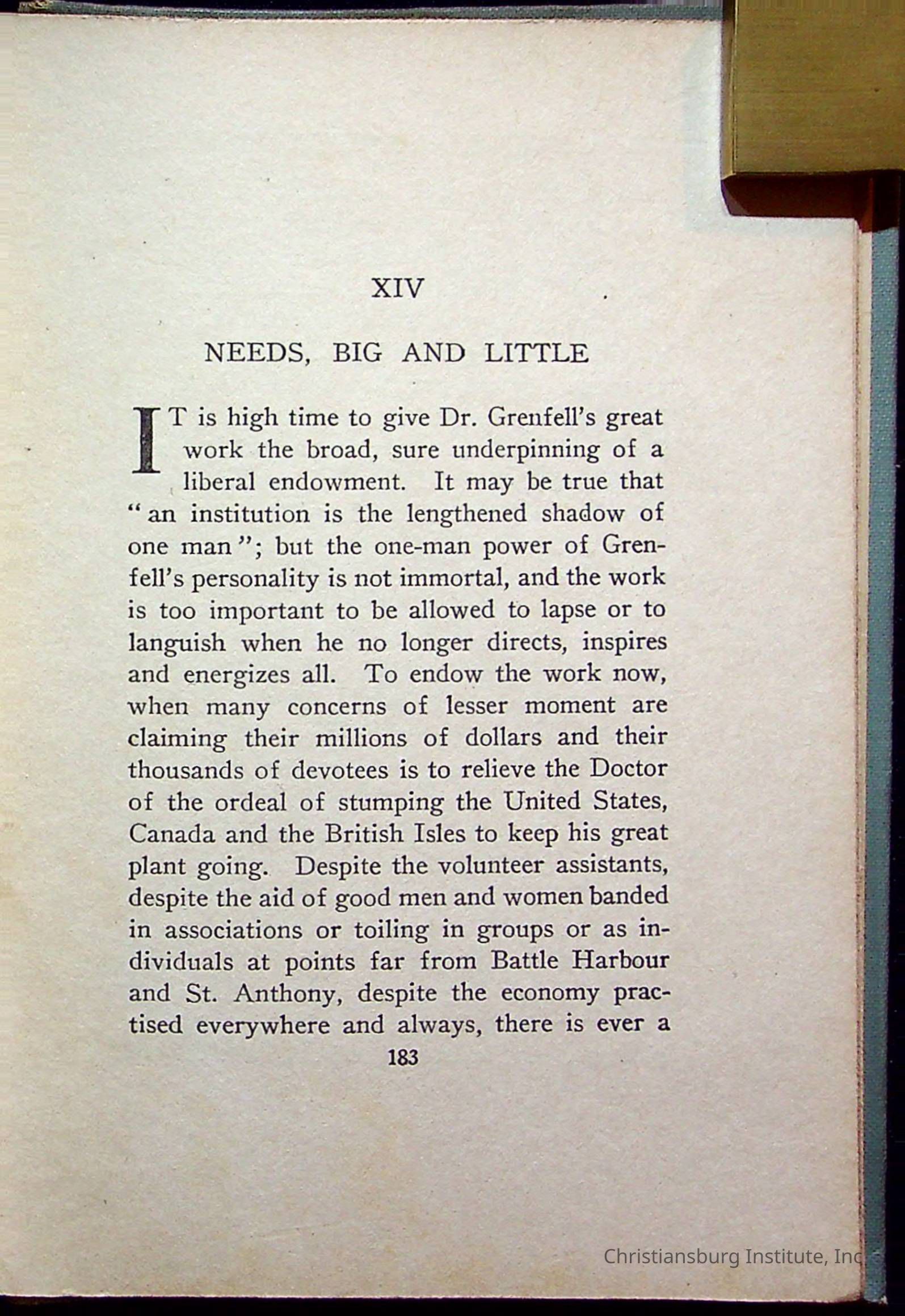 "With Grenfell on The Labrador" written by Fullerton L. Waldo and published by the Fleming H. Revell Company in the year 1920. The book was in the Christiansburg Institute library.