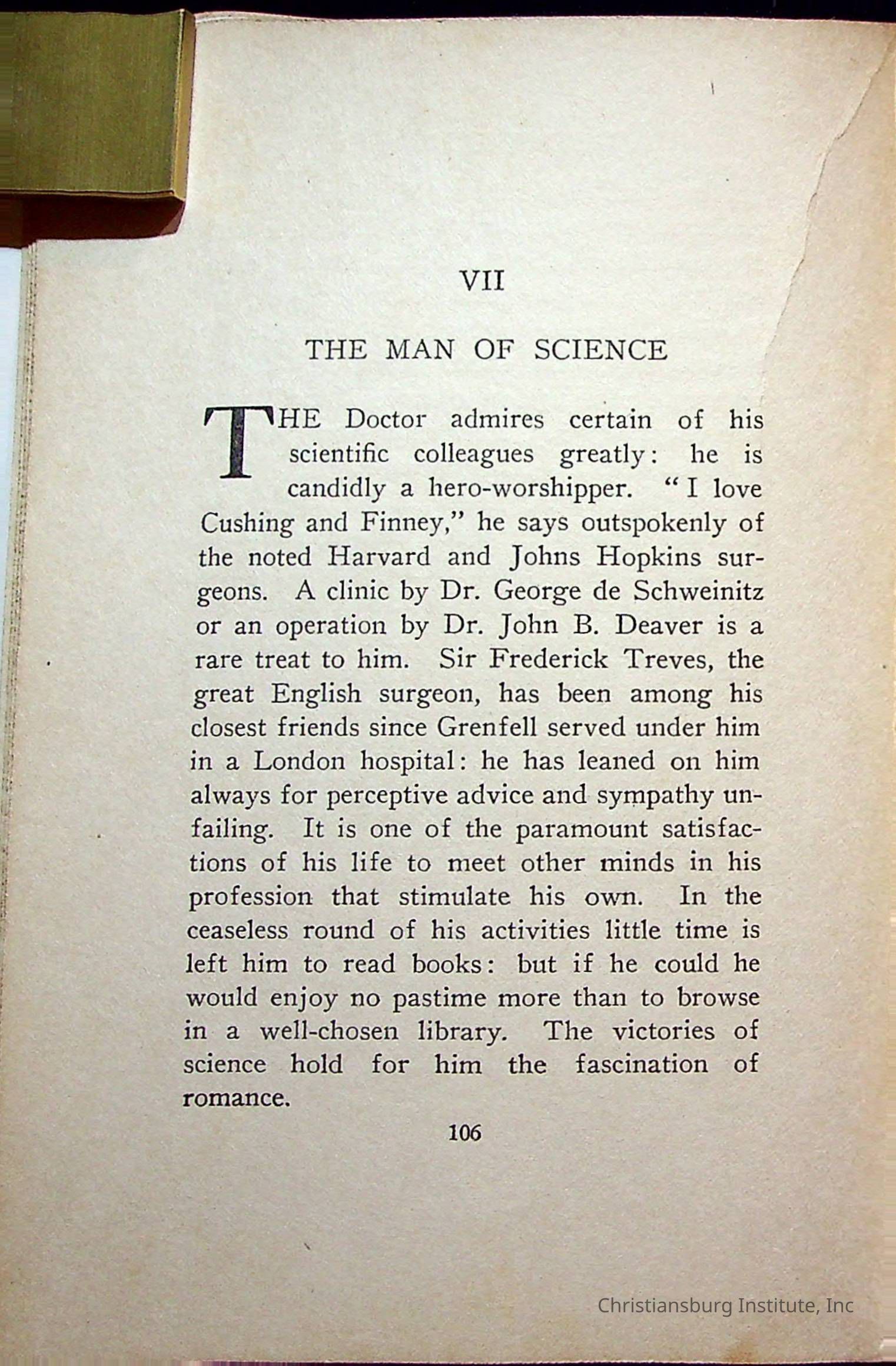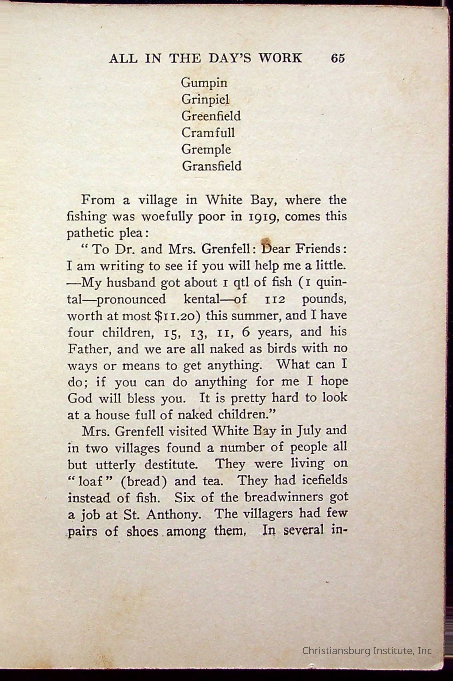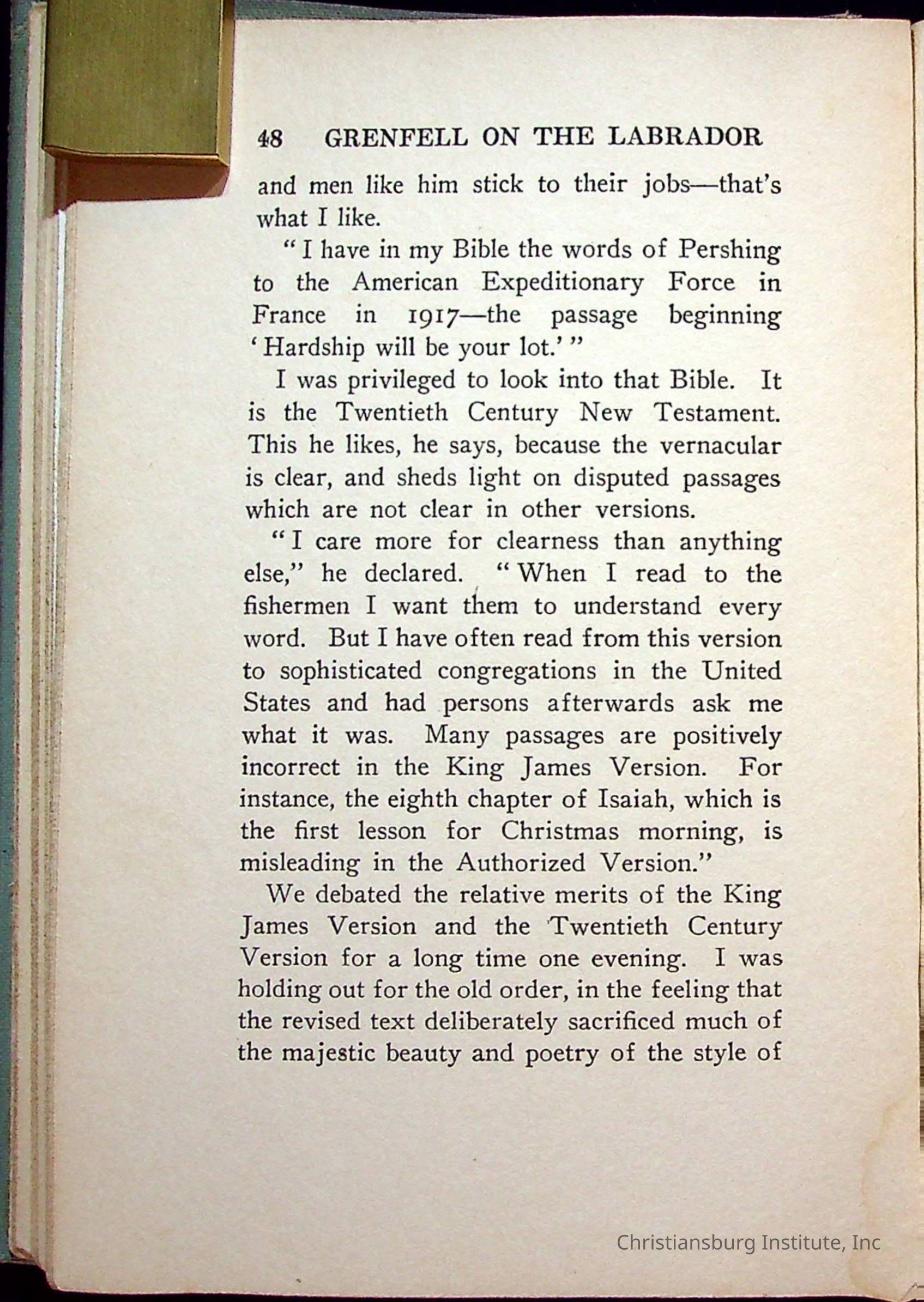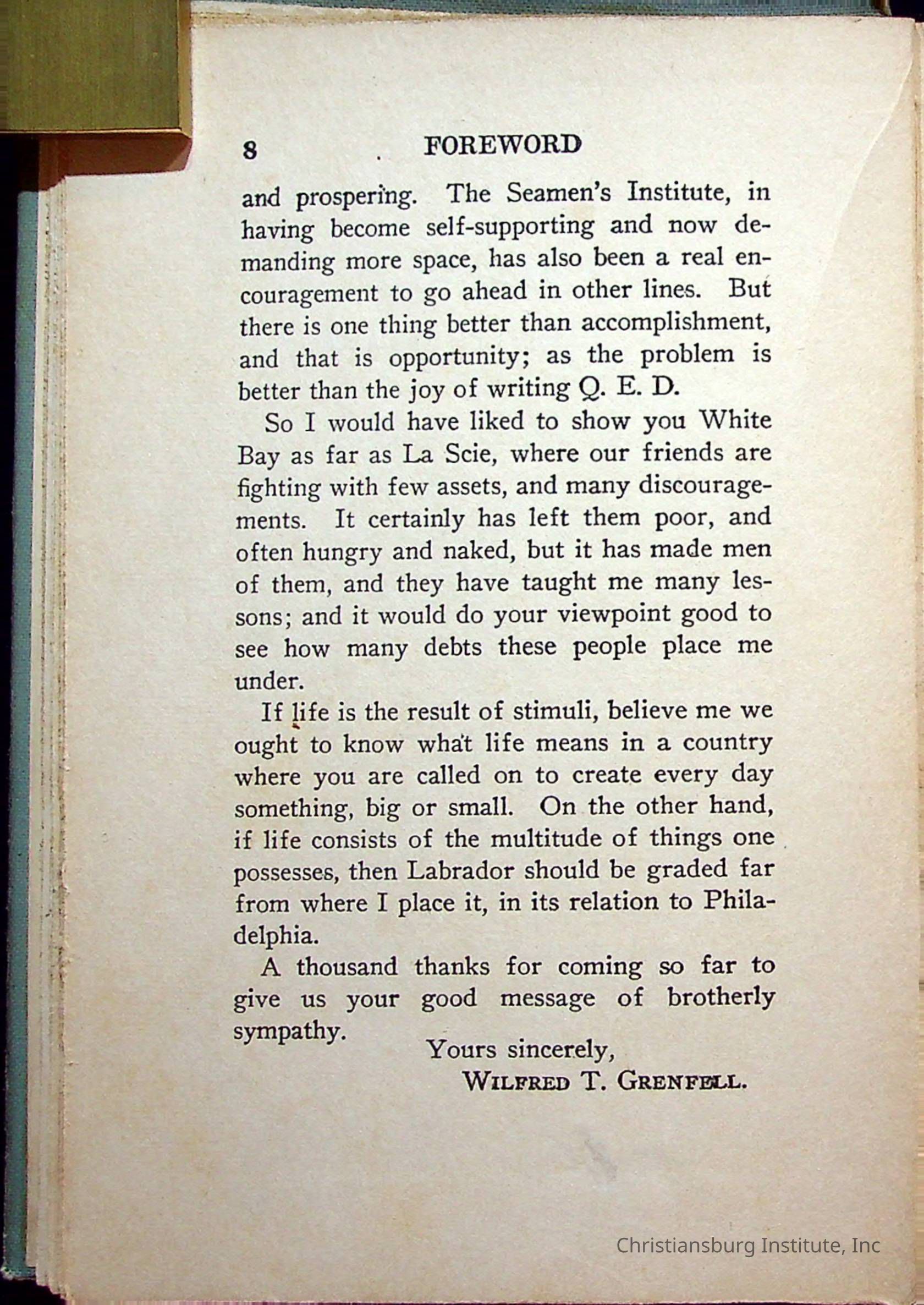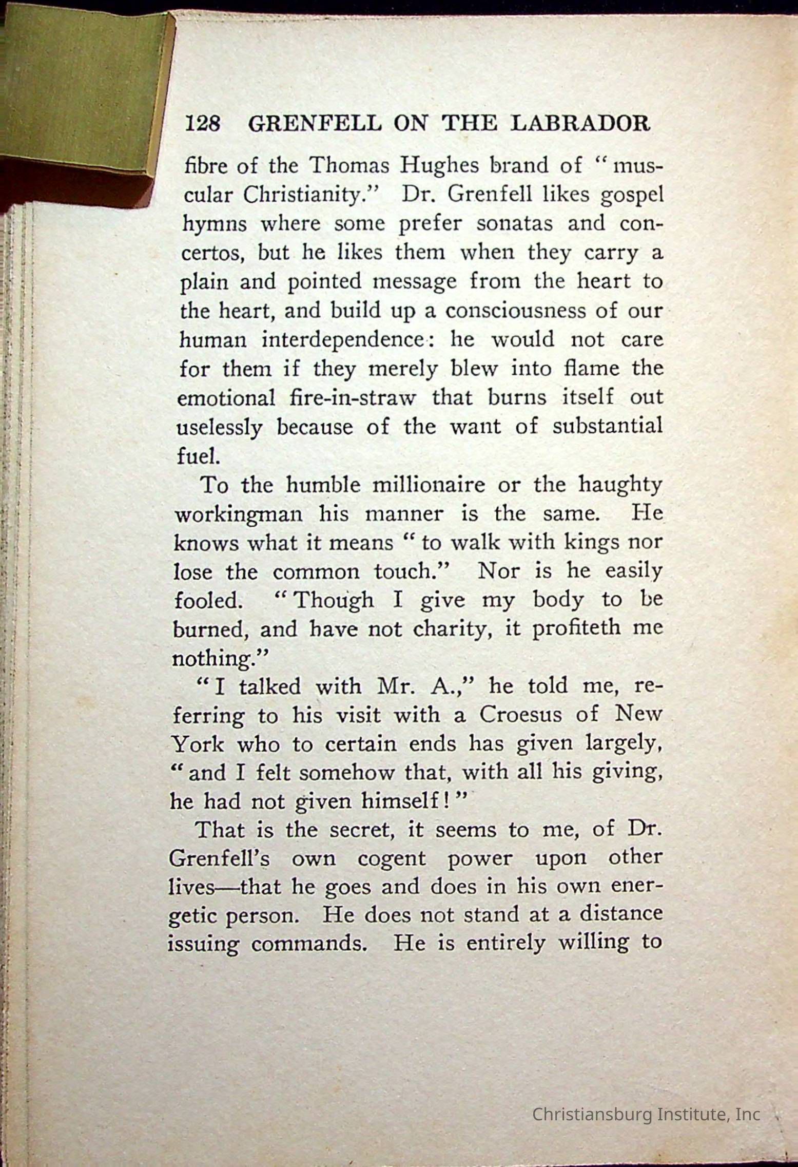 "With Grenfell on The Labrador" written by Fullerton L. Waldo and published by the Fleming H. Revell Company in the year 1920. The book was in the Christiansburg Institute library.
