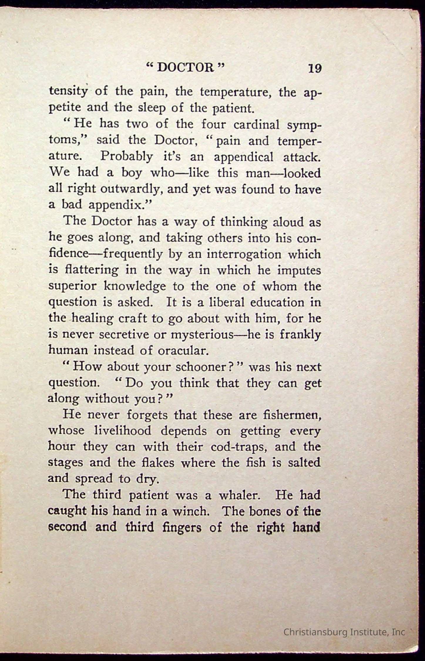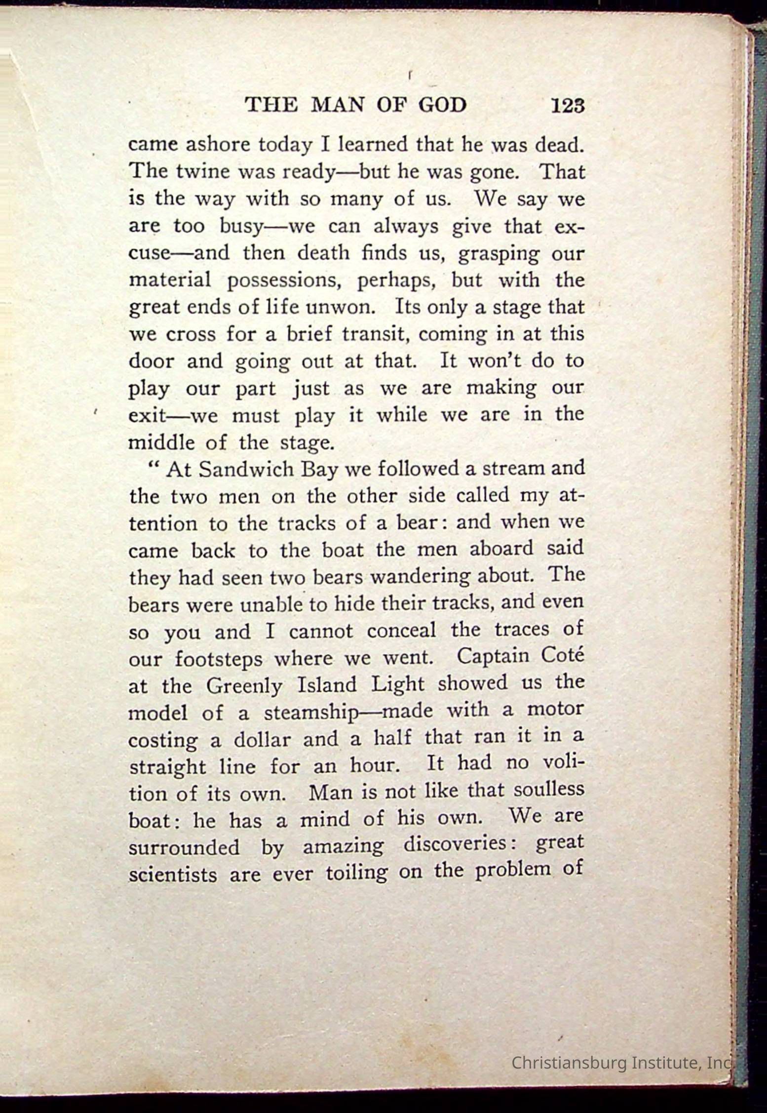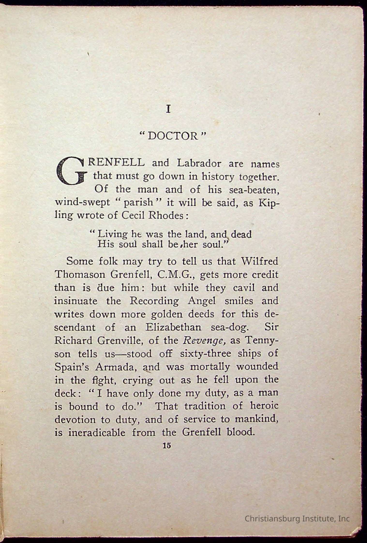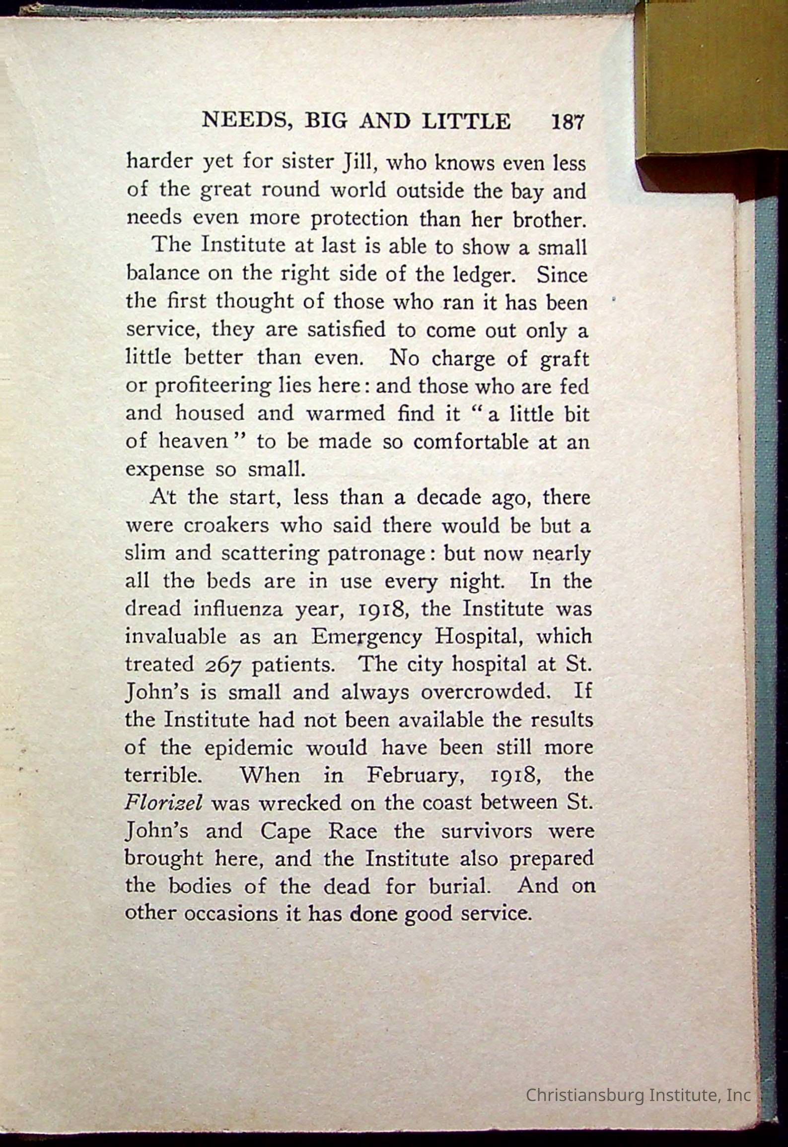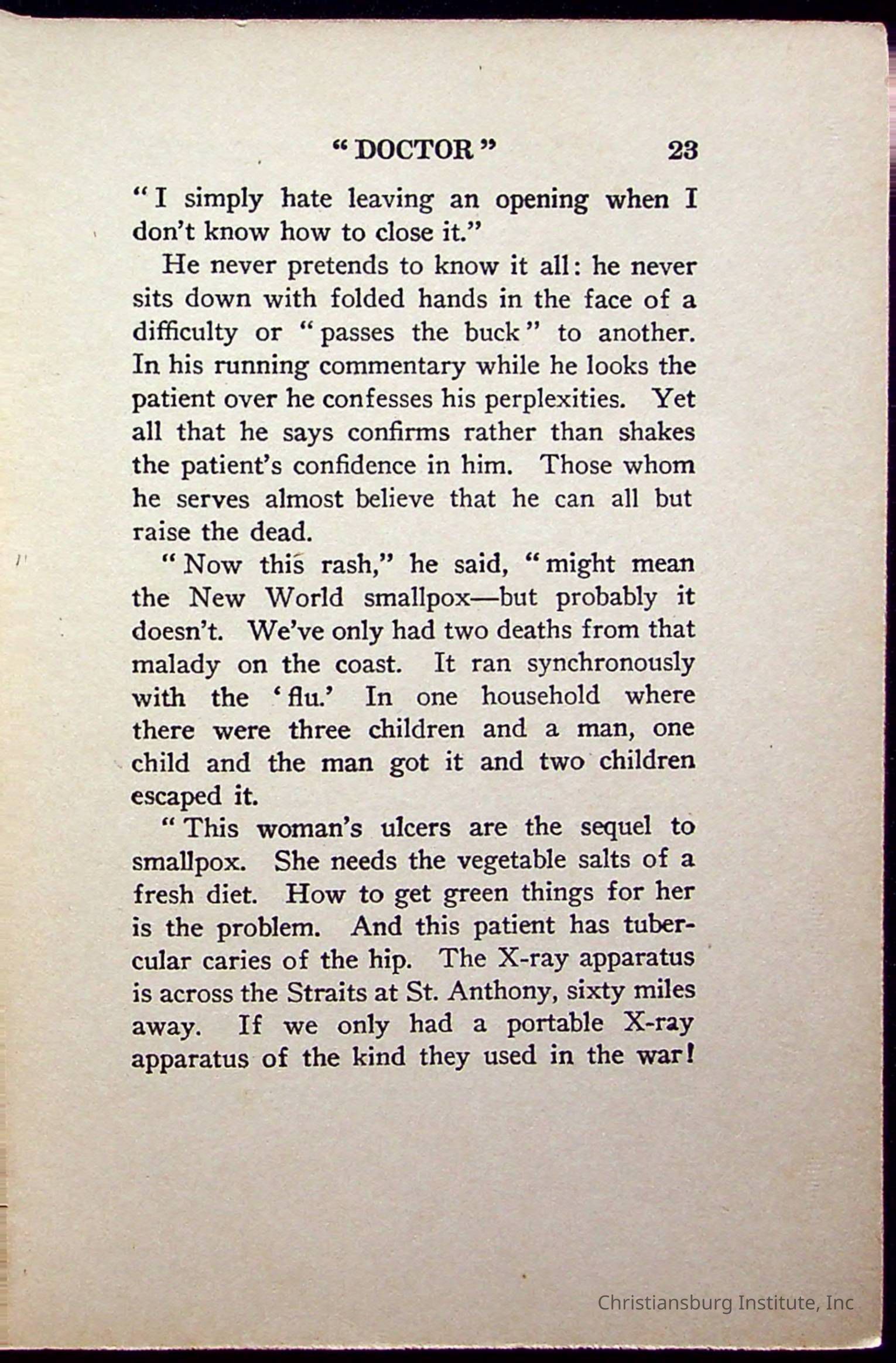 "With Grenfell on The Labrador" written by Fullerton L. Waldo and published by the Fleming H. Revell Company in the year 1920. The book was in the Christiansburg Institute library.