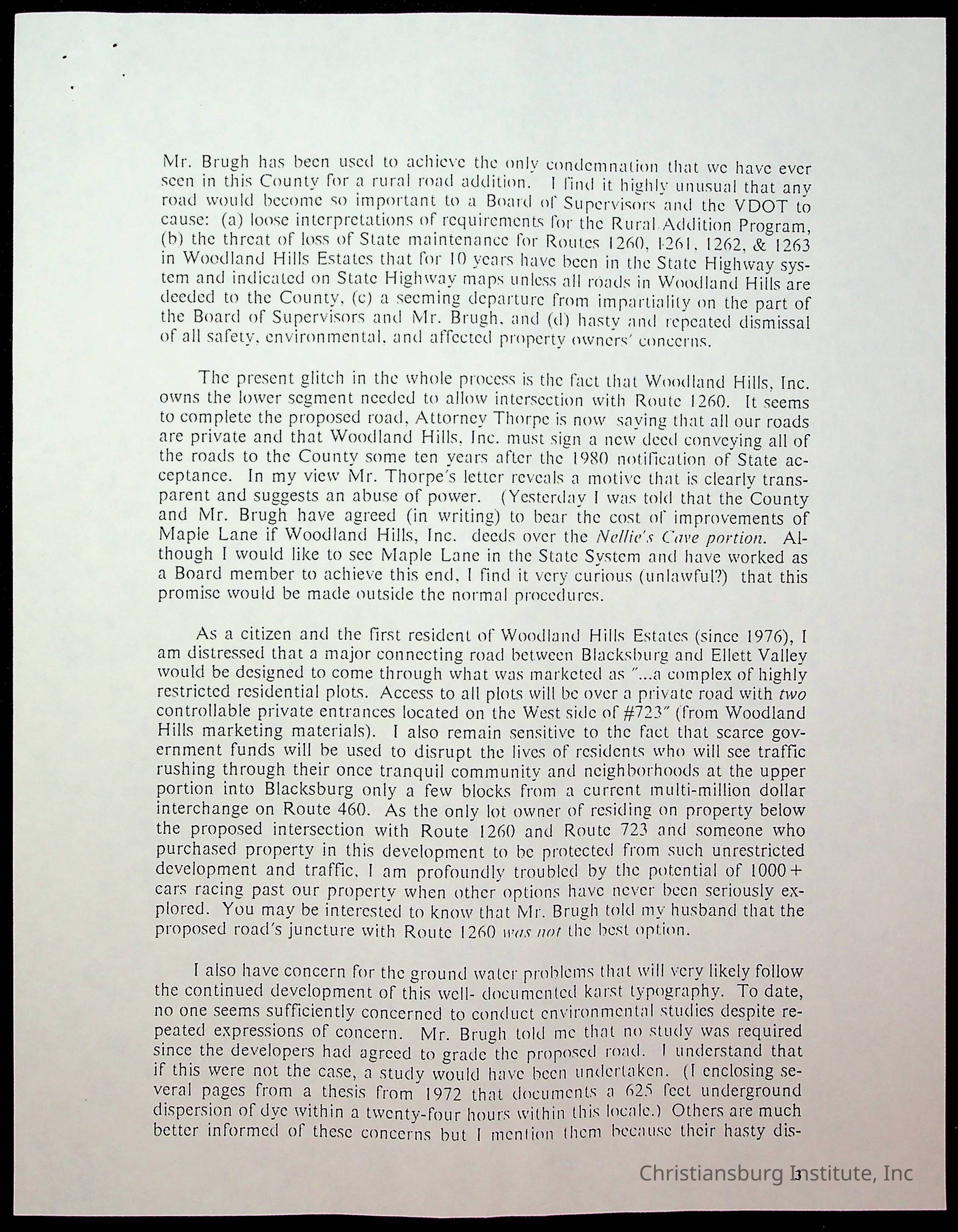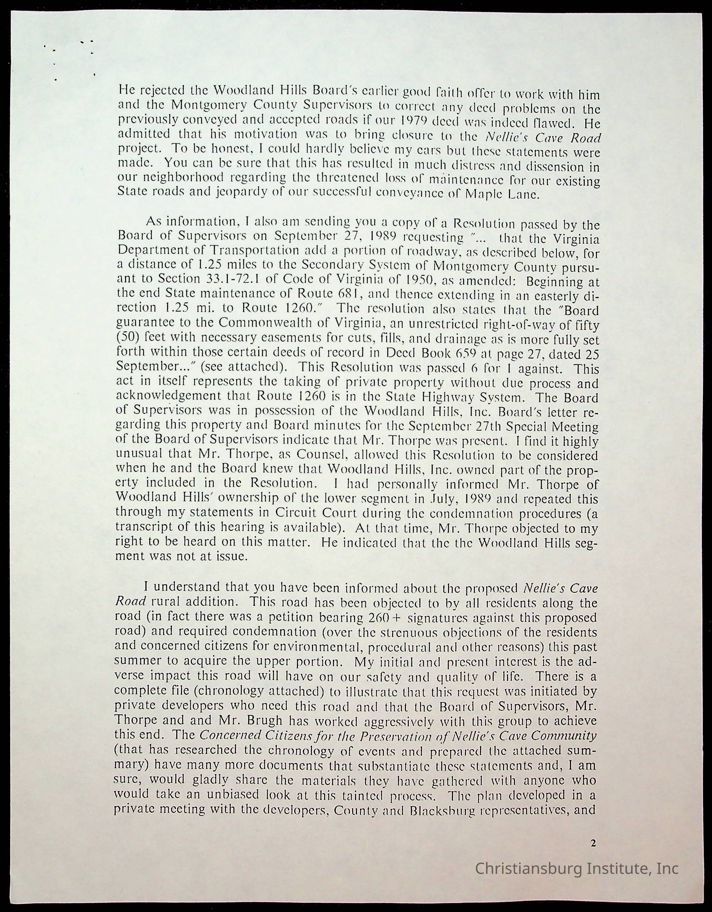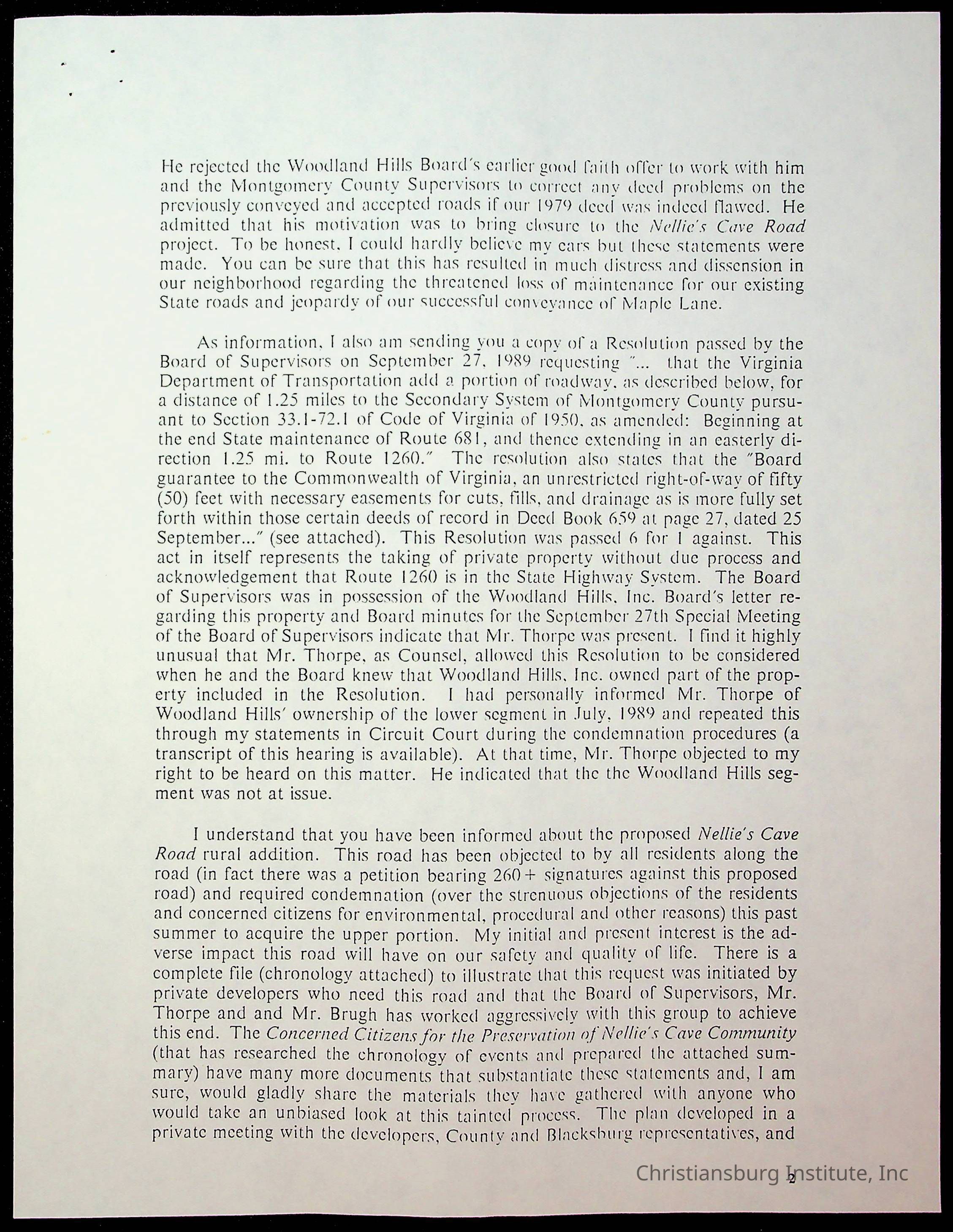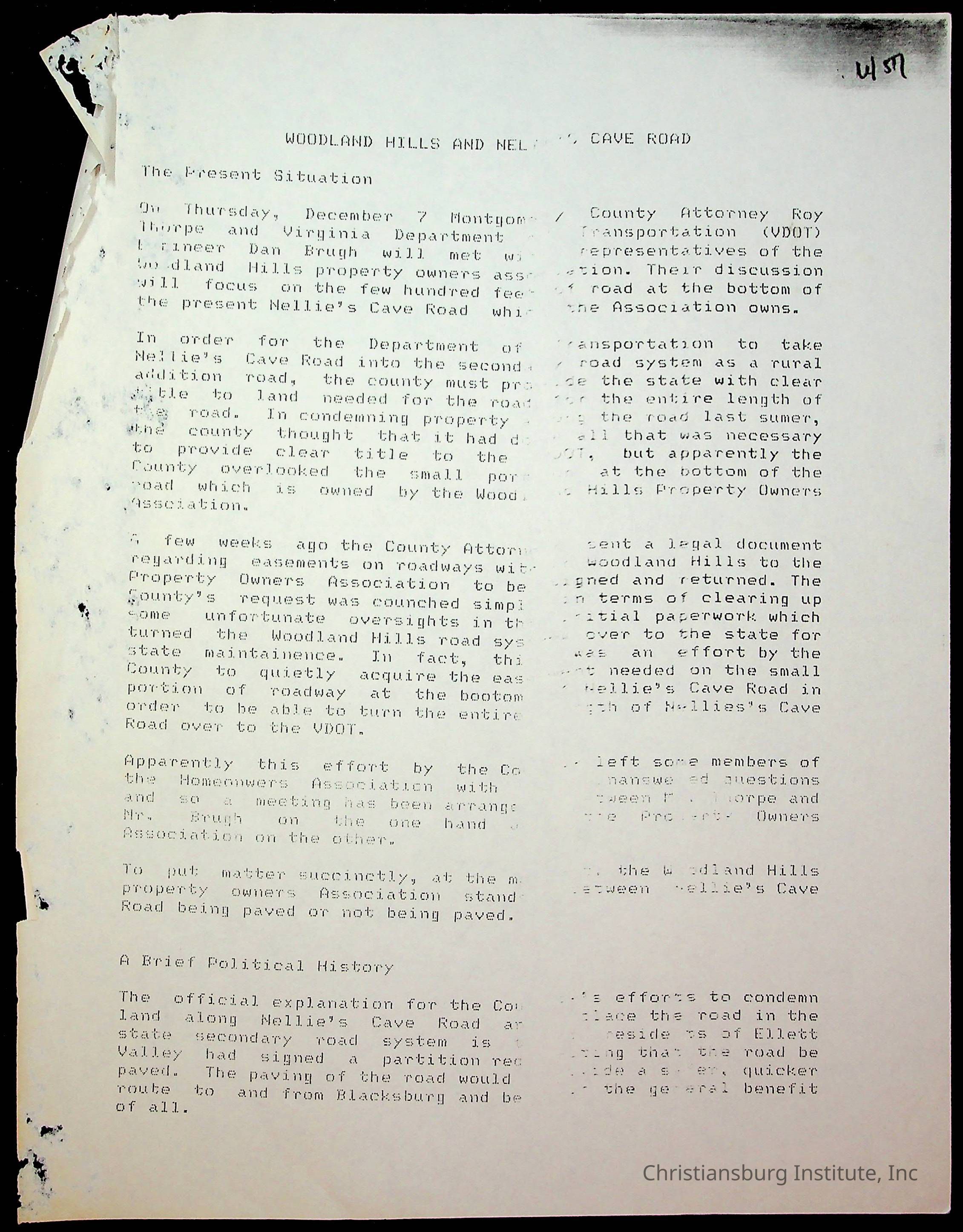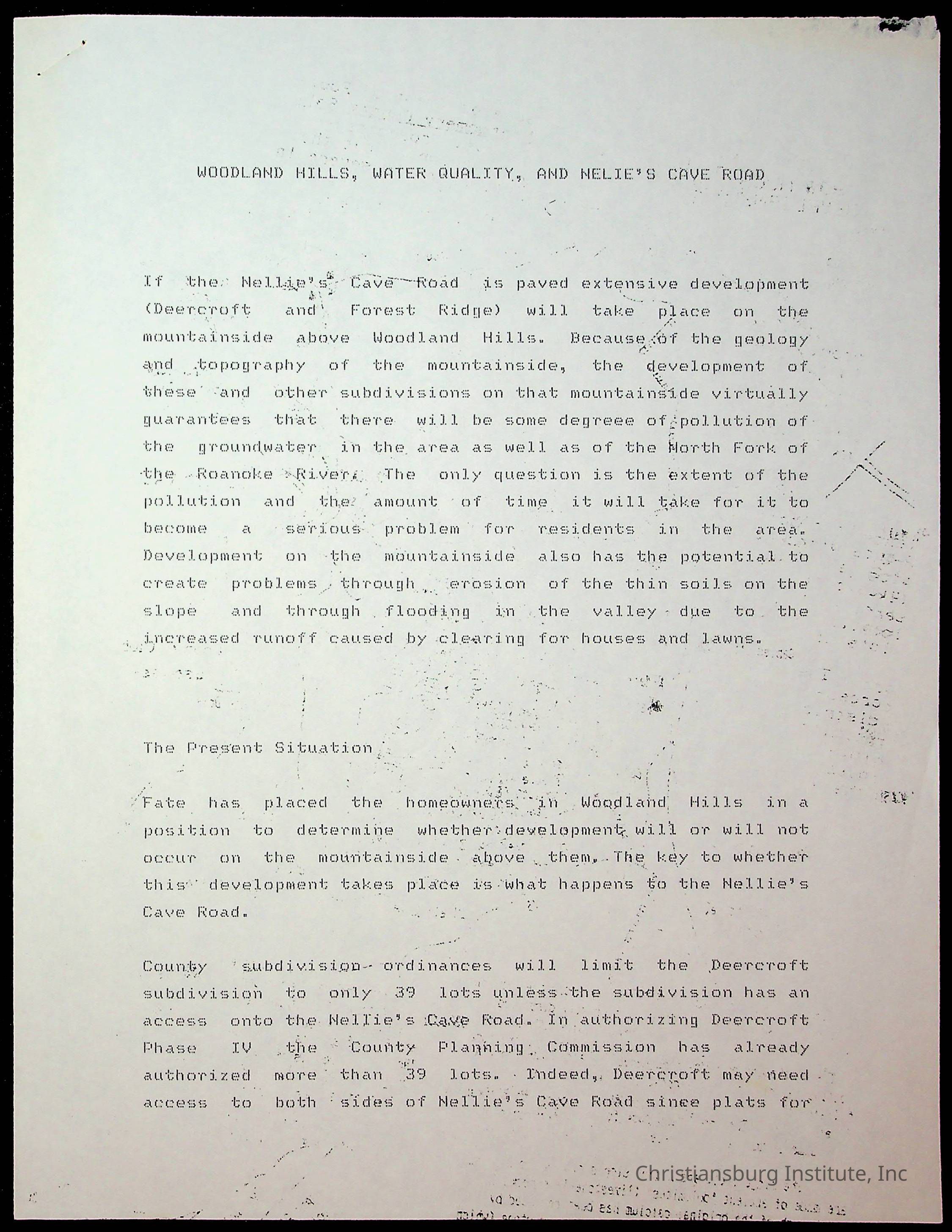 An archive of documents about the group, Woodland Hills, Inc, and their involvement with the Nellies Cave Road project, complied by Elizabeth Fine circa 1990s.