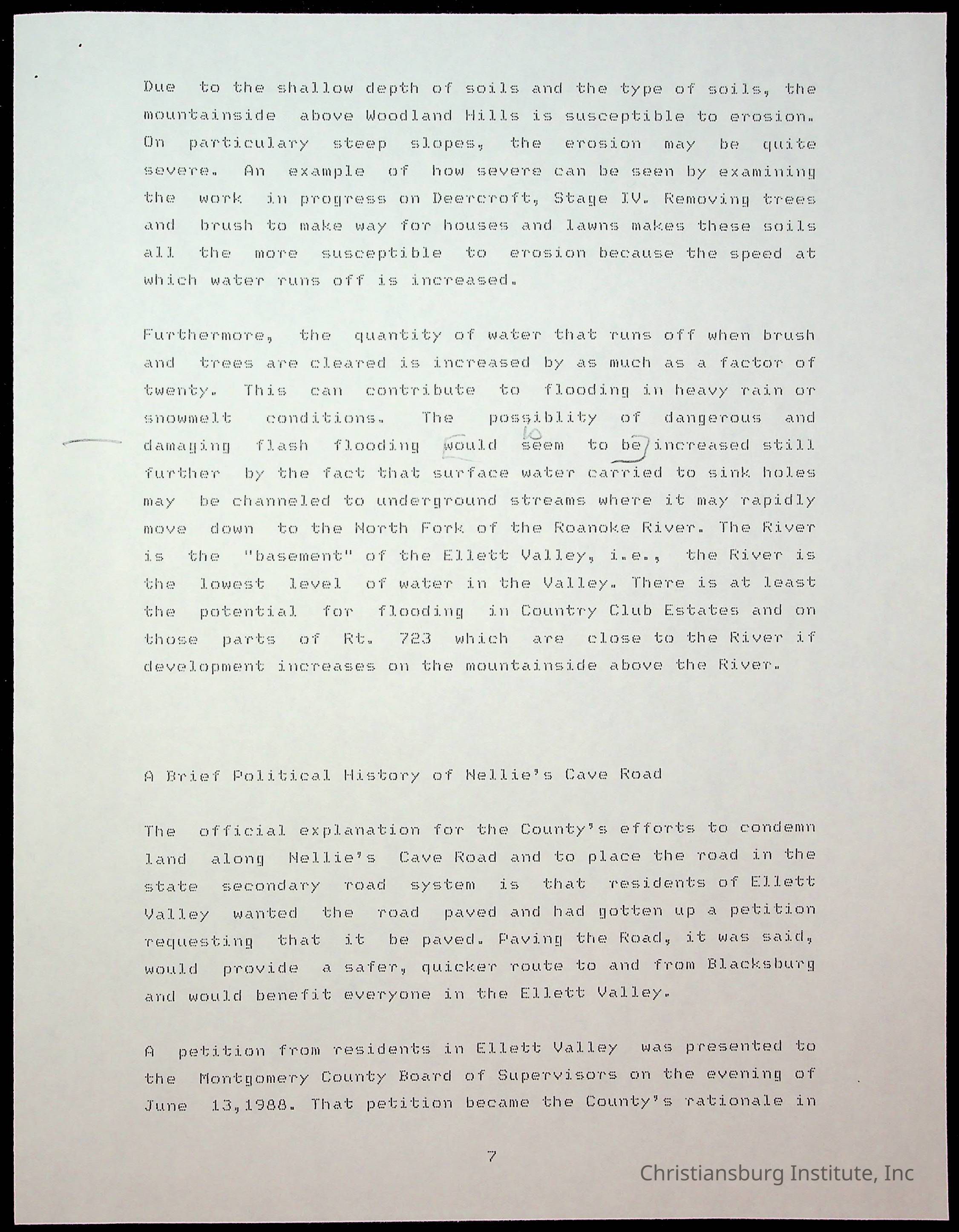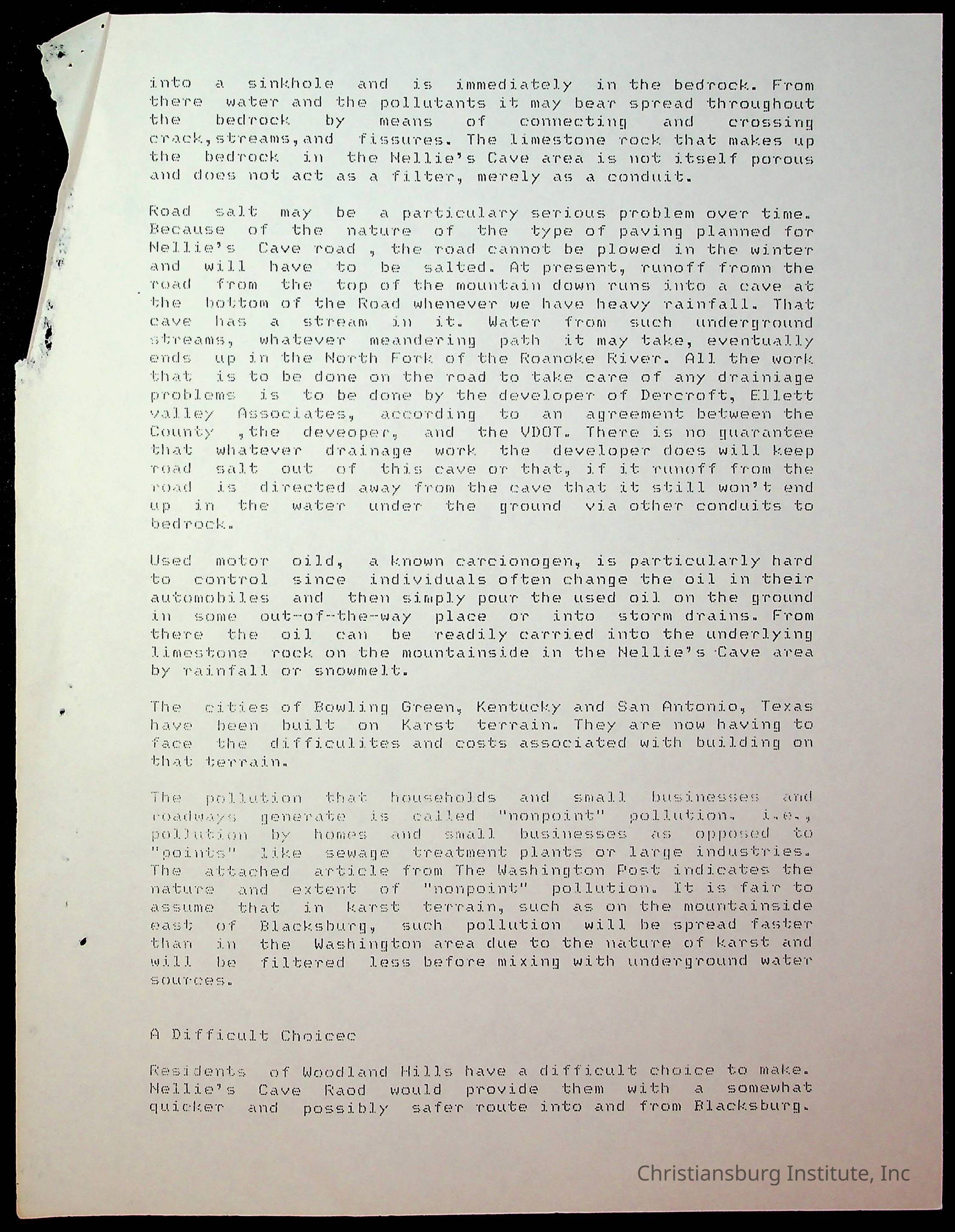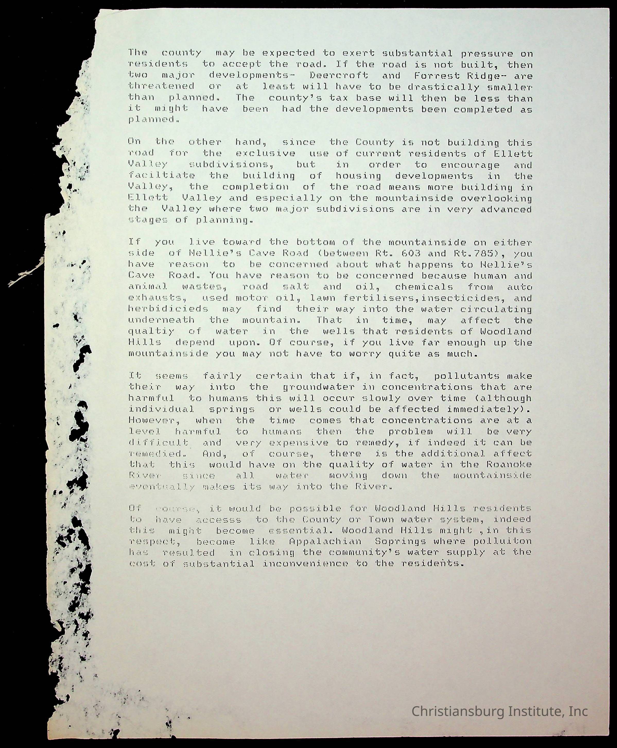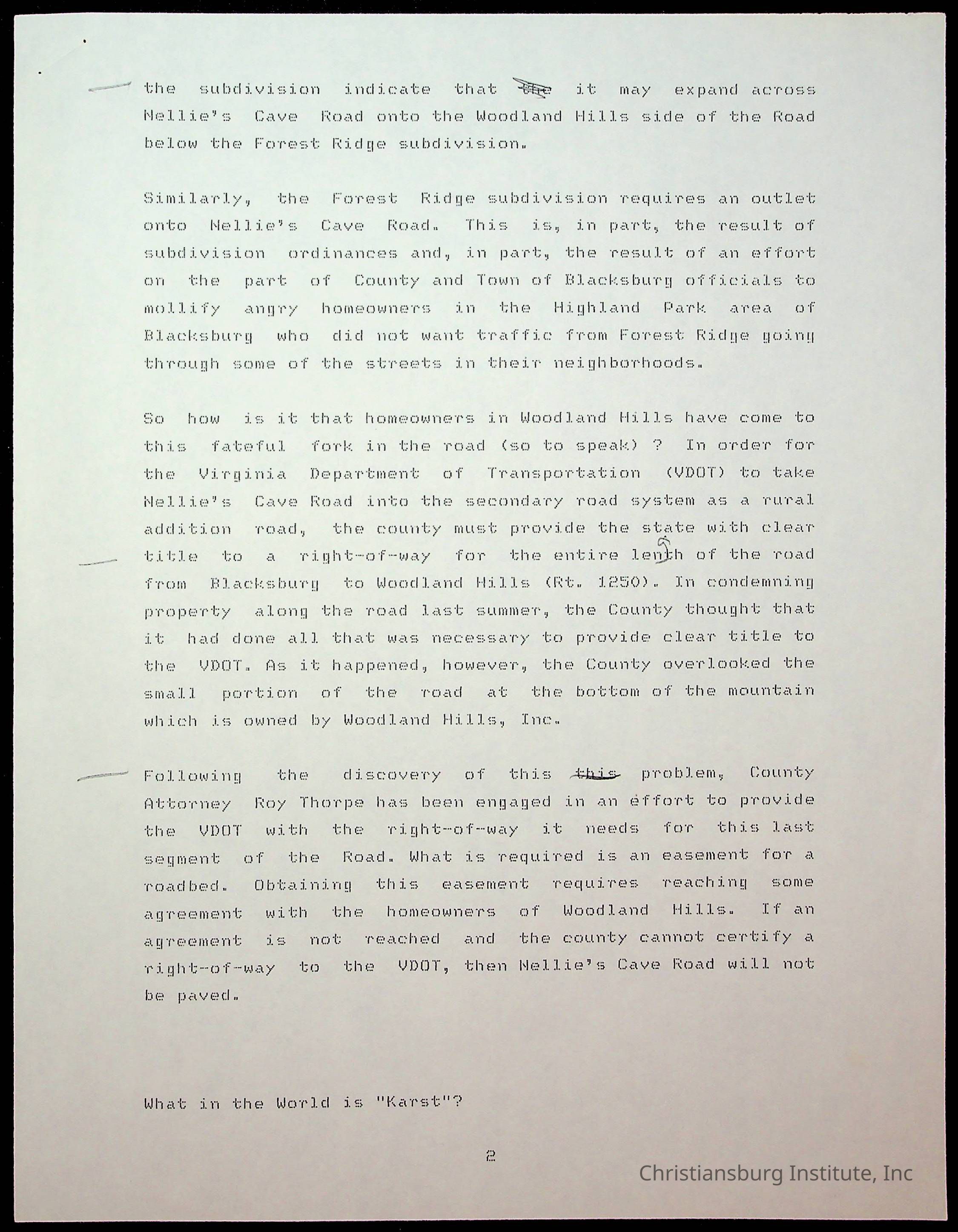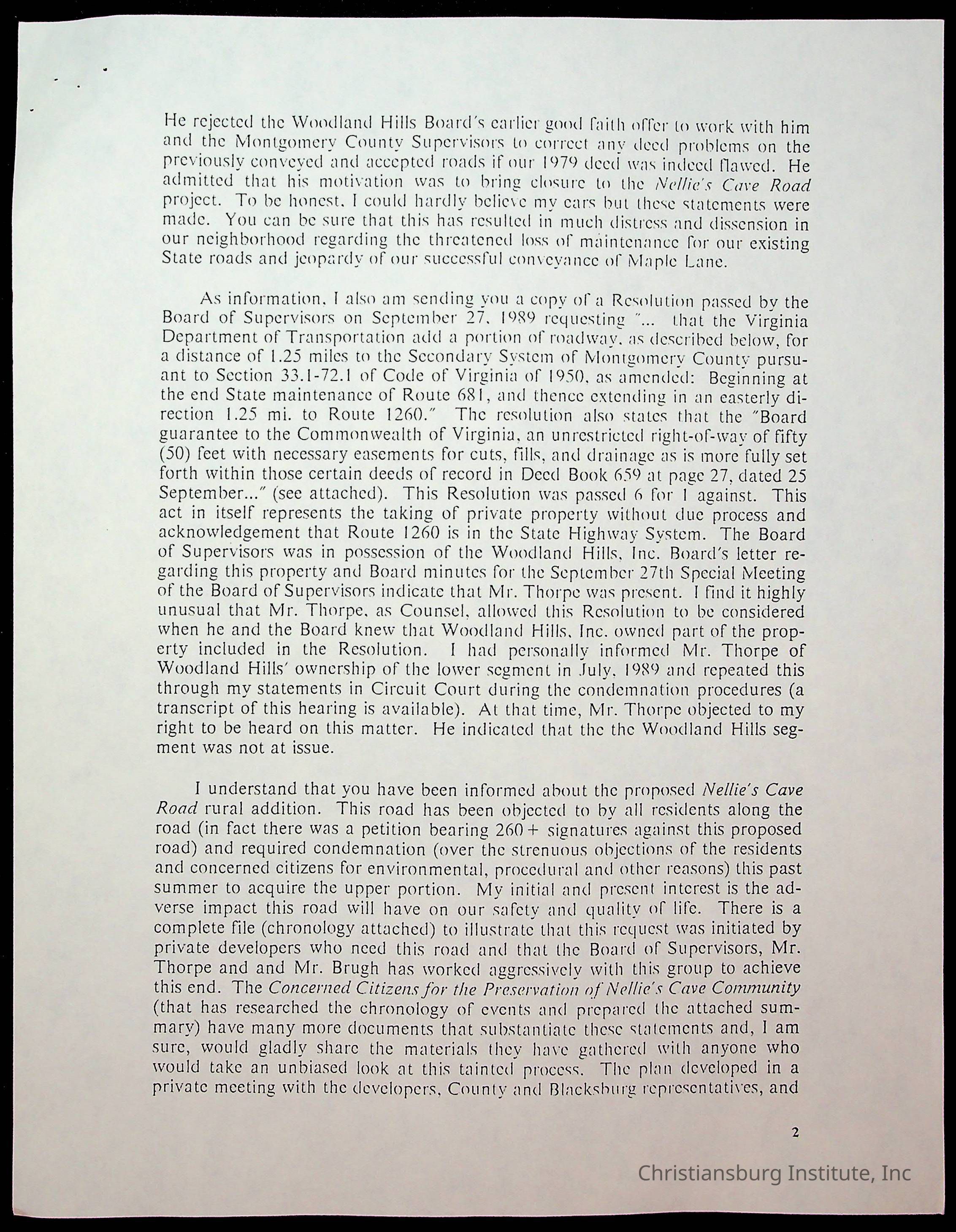 An archive of documents about the group, Woodland Hills, Inc, and their involvement with the Nellies Cave Road project, complied by Elizabeth Fine circa 1990s.