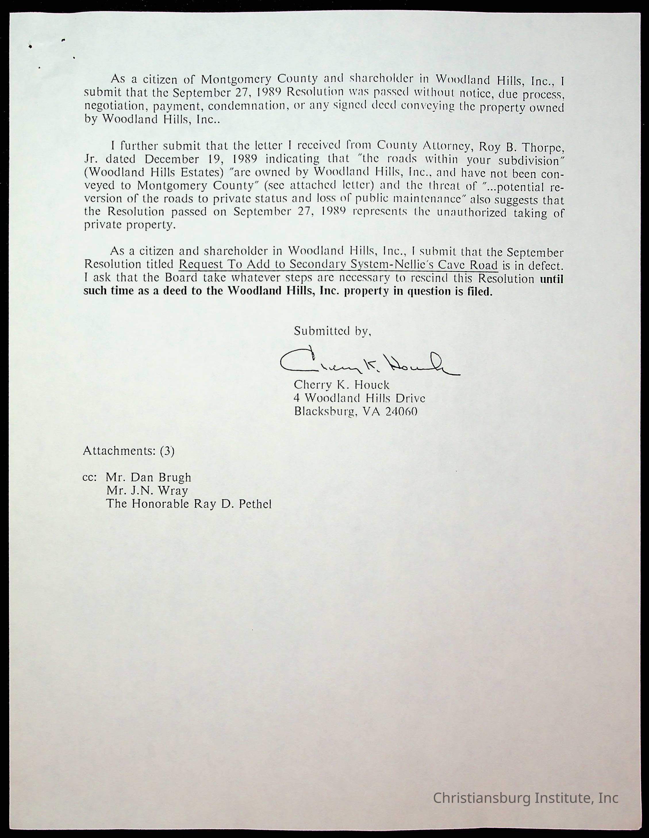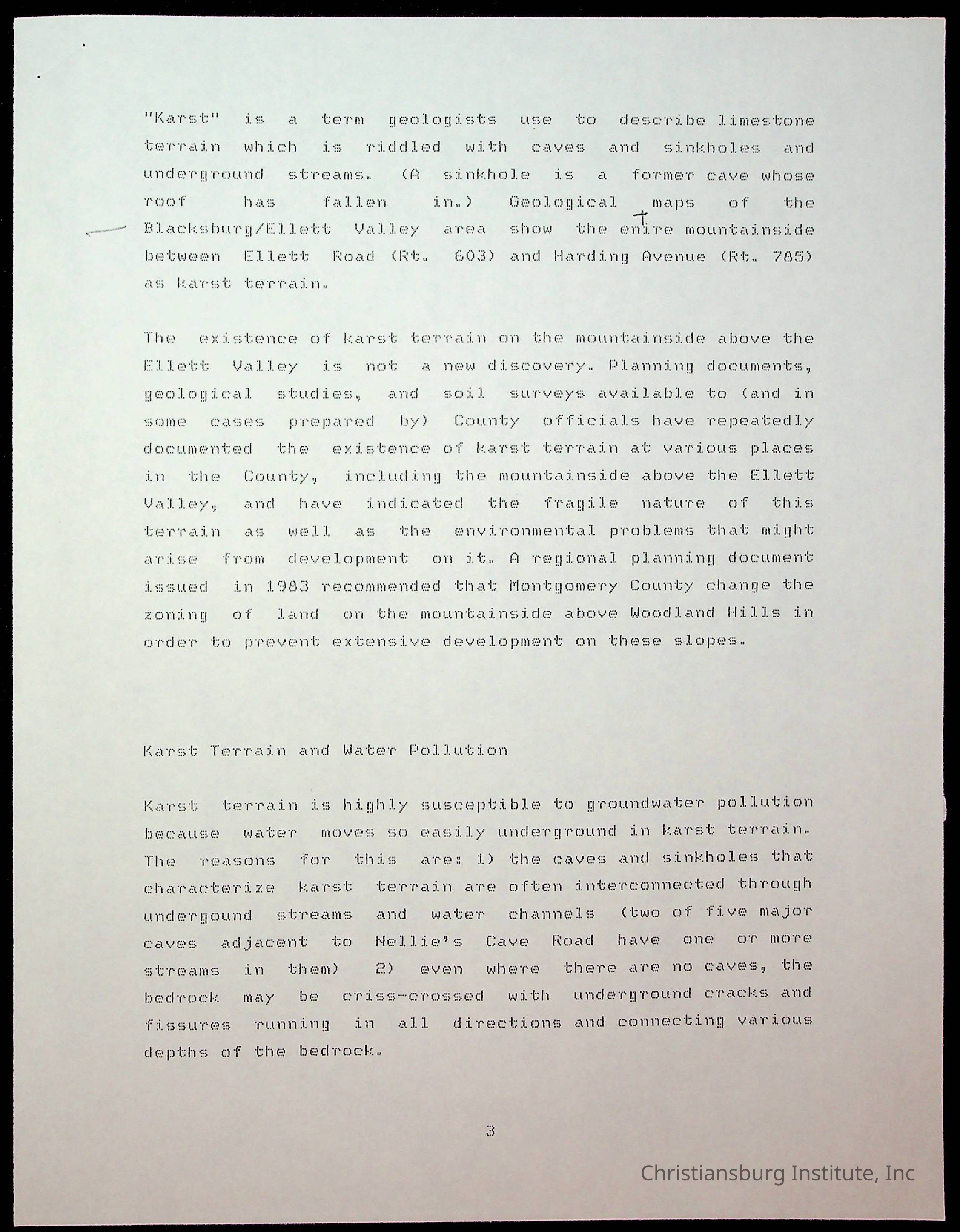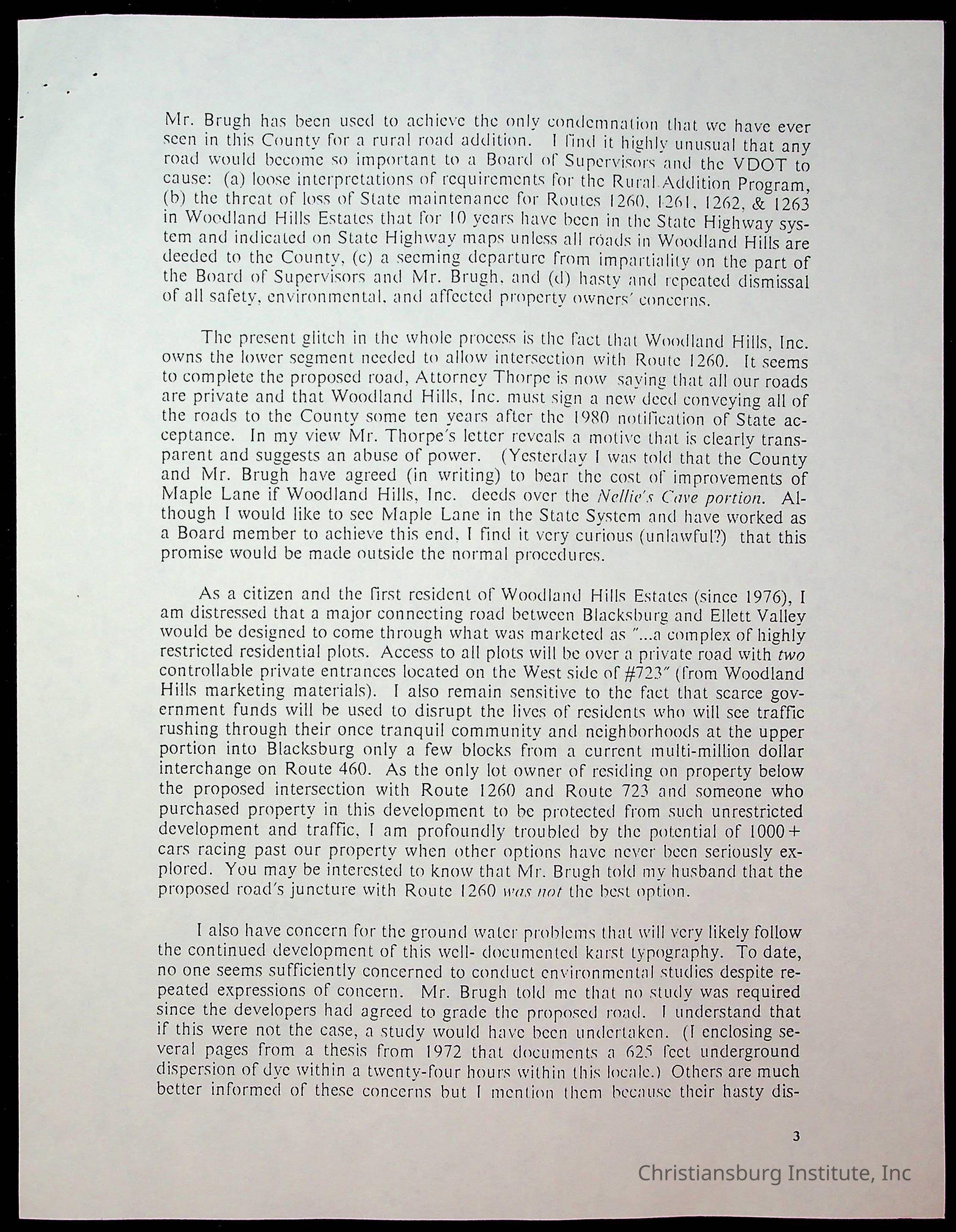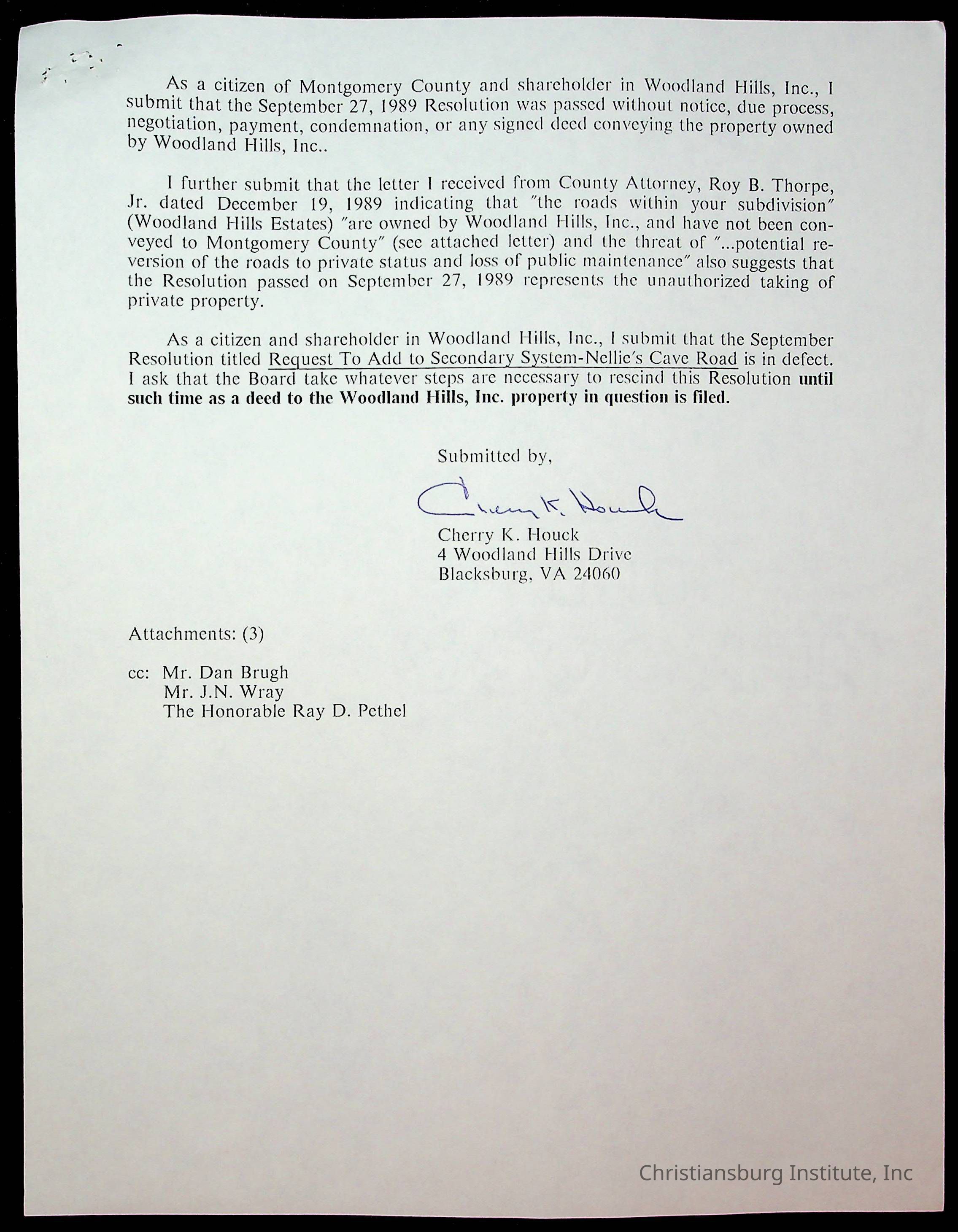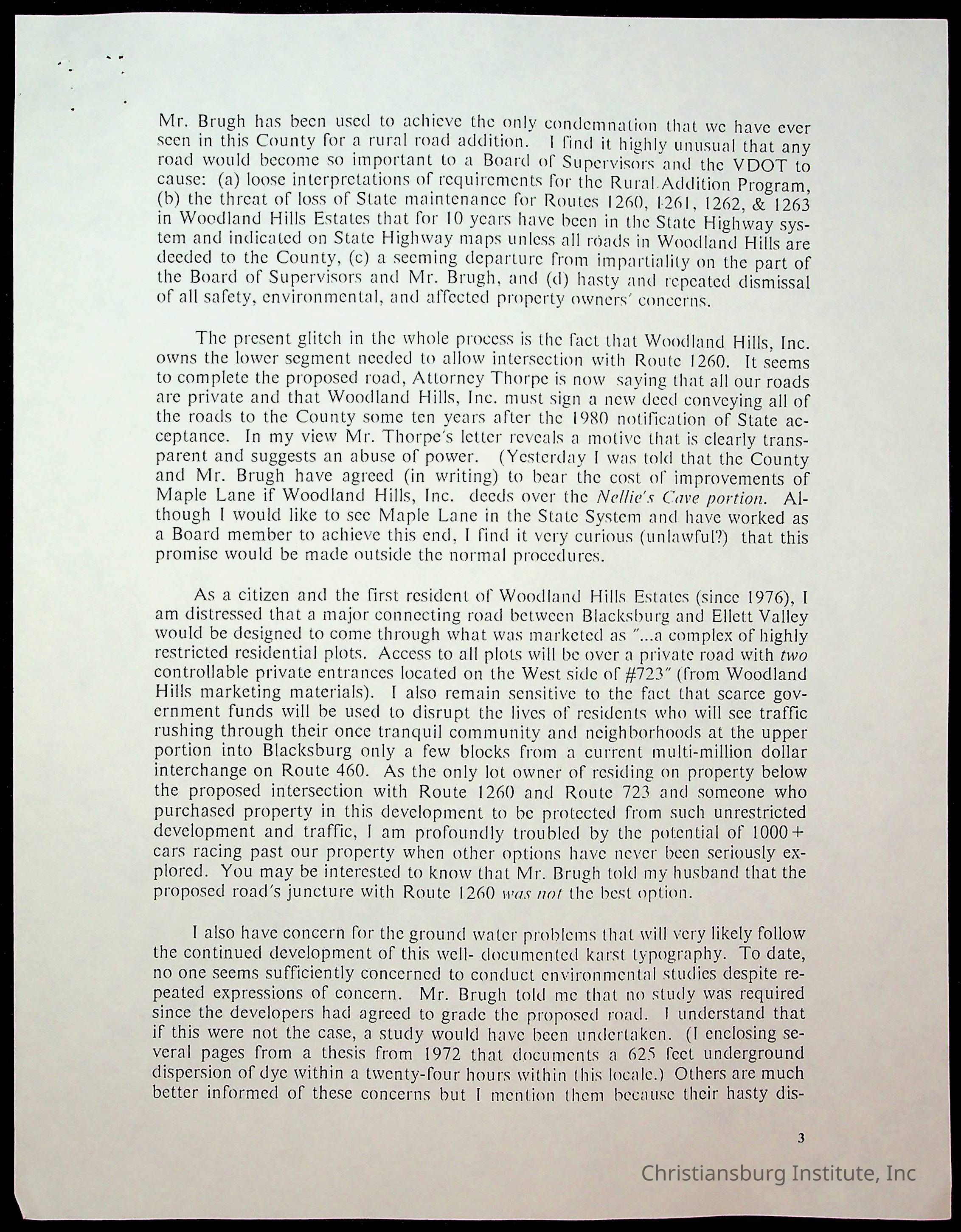 An archive of documents about the group, Woodland Hills, Inc, and their involvement with the Nellies Cave Road project, complied by Elizabeth Fine circa 1990s.