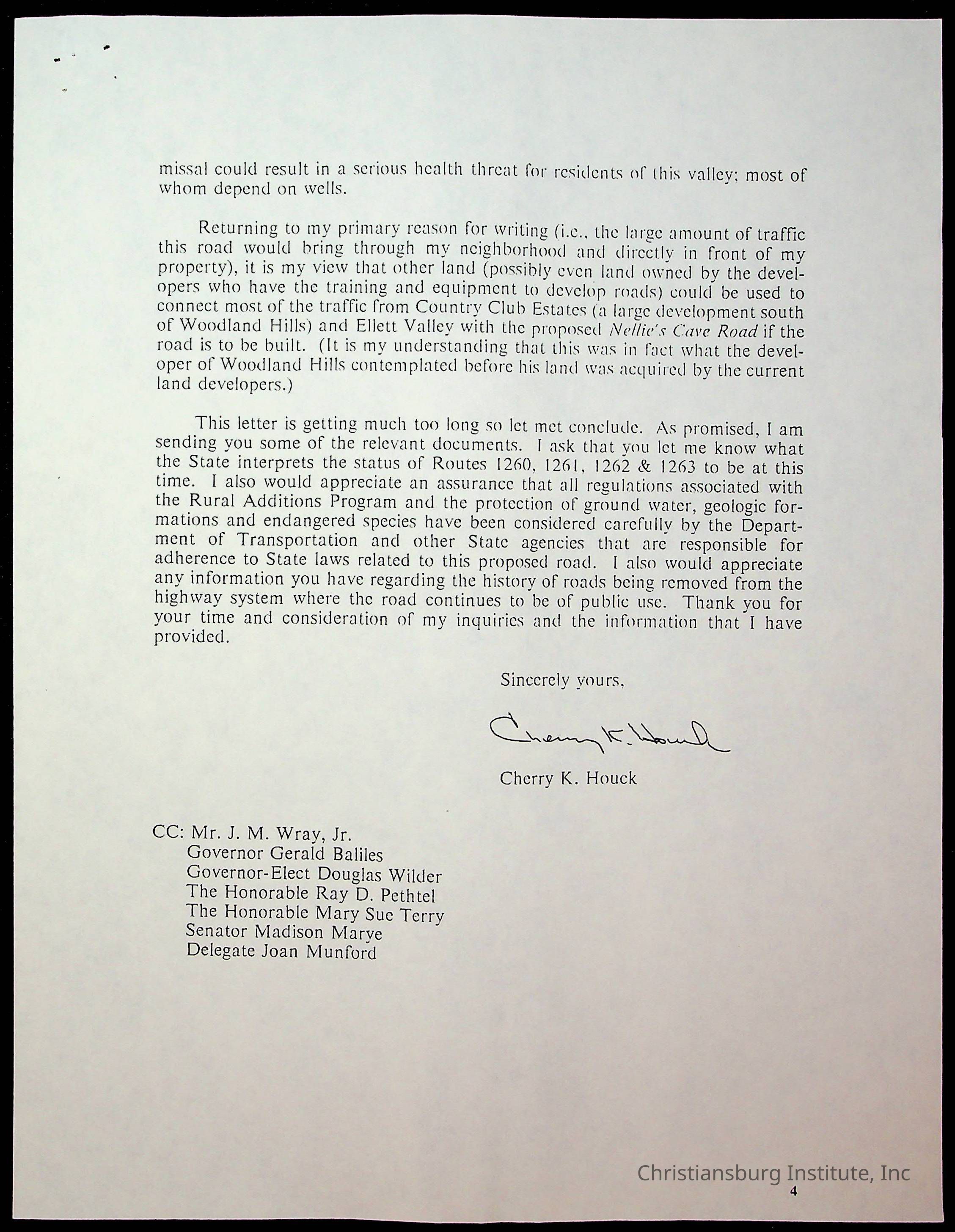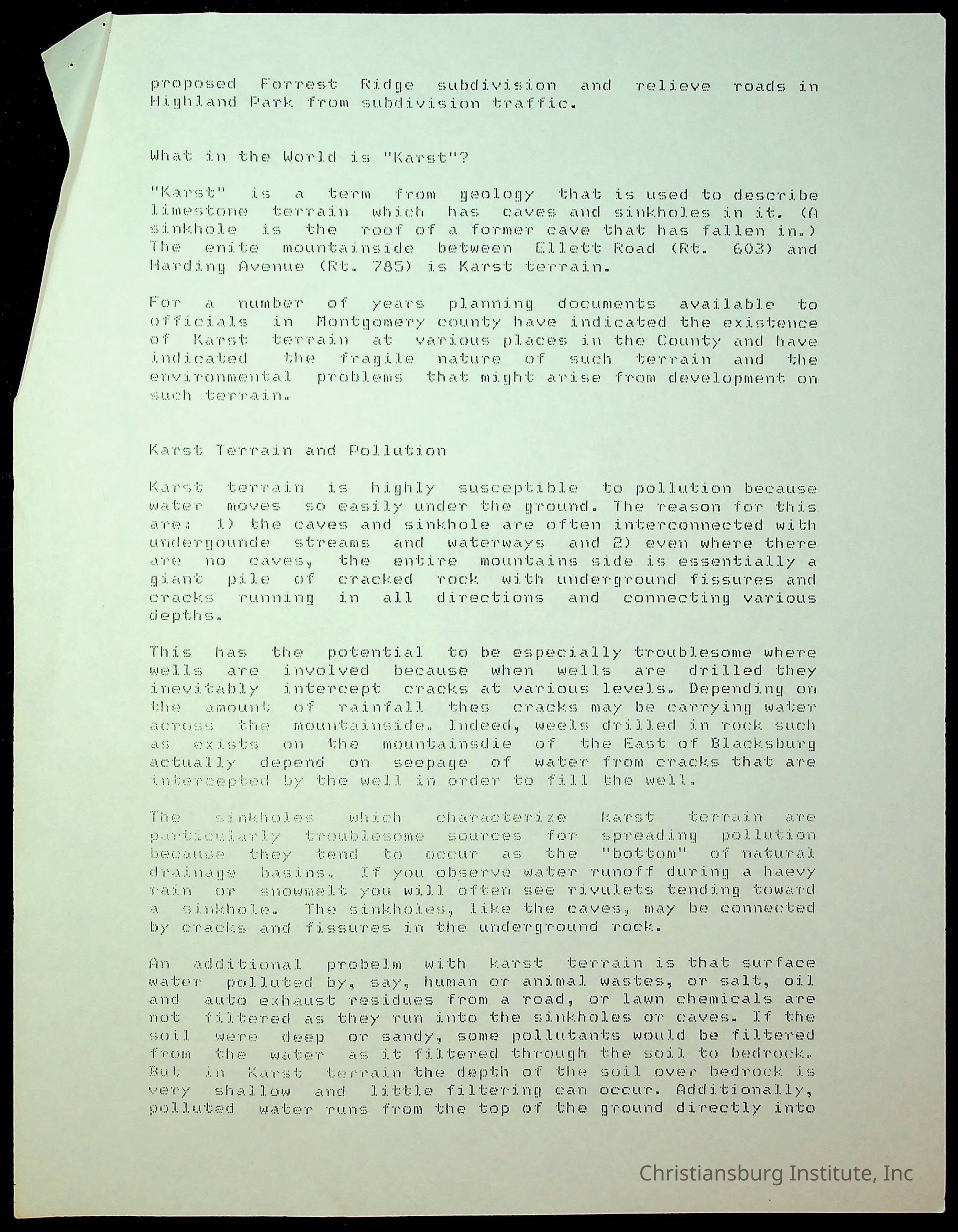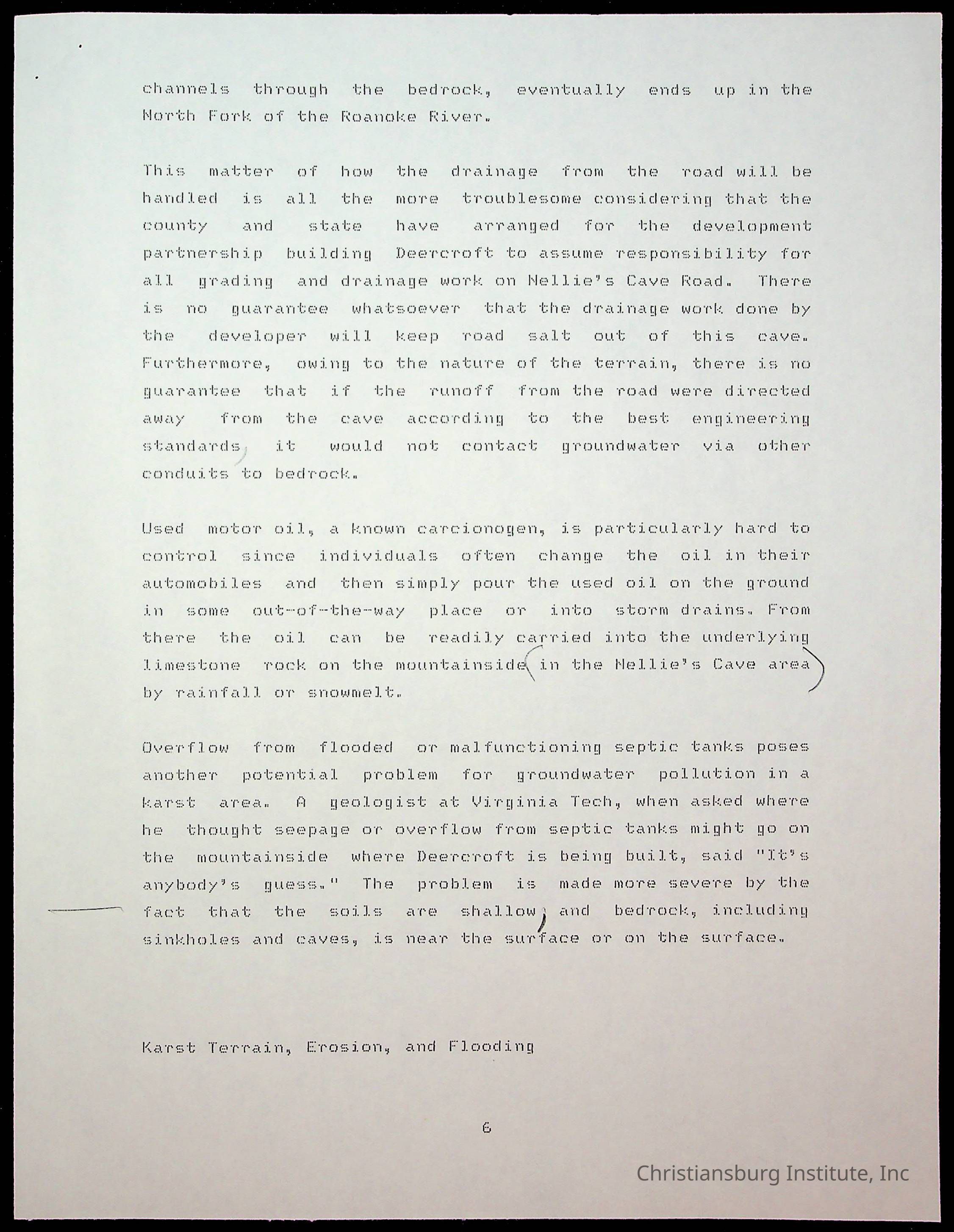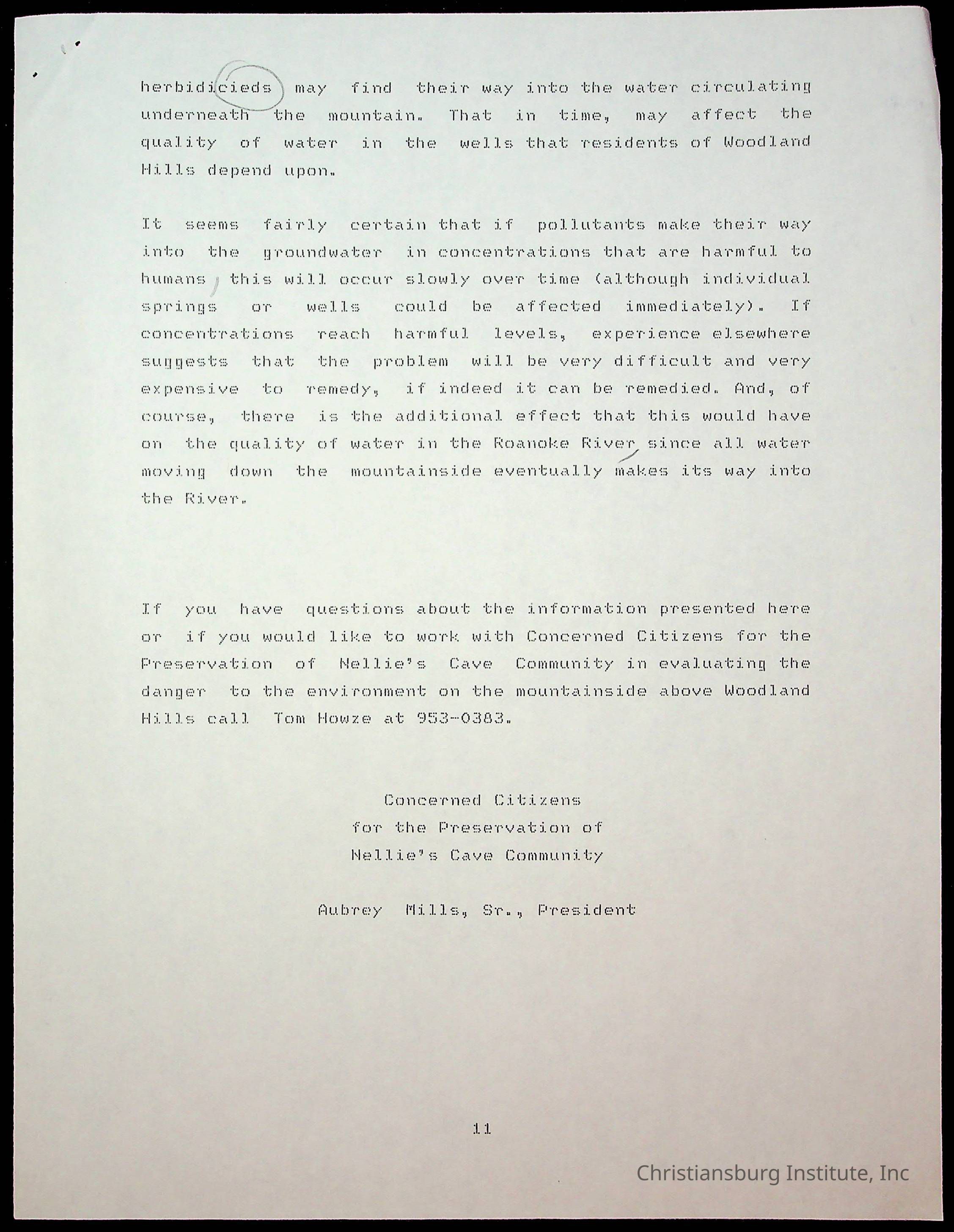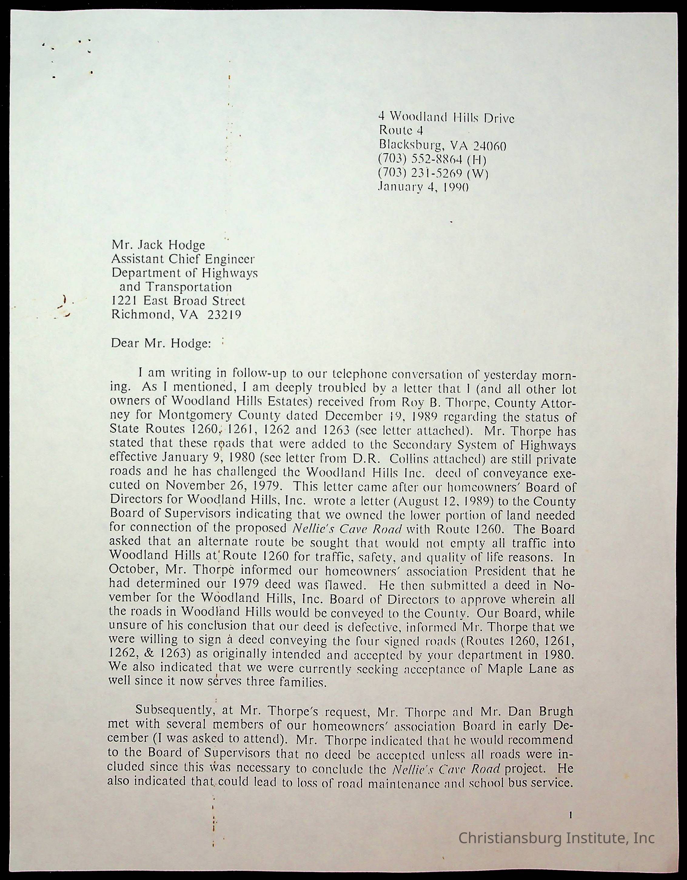 An archive of documents about the group, Woodland Hills, Inc, and their involvement with the Nellies Cave Road project, complied by Elizabeth Fine circa 1990s.