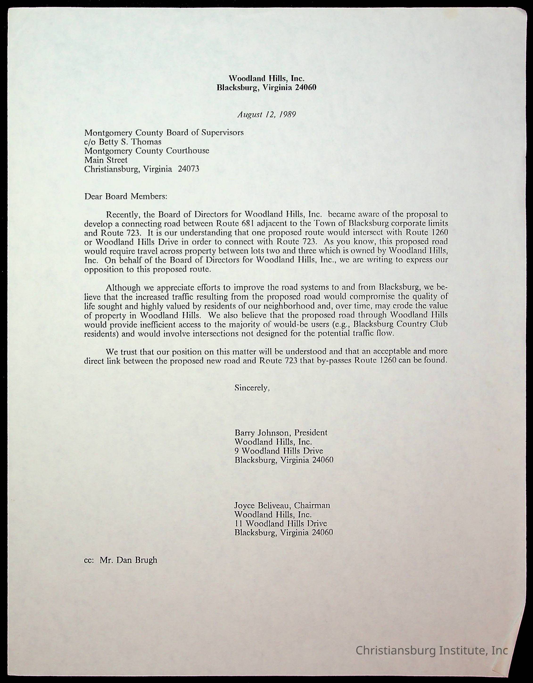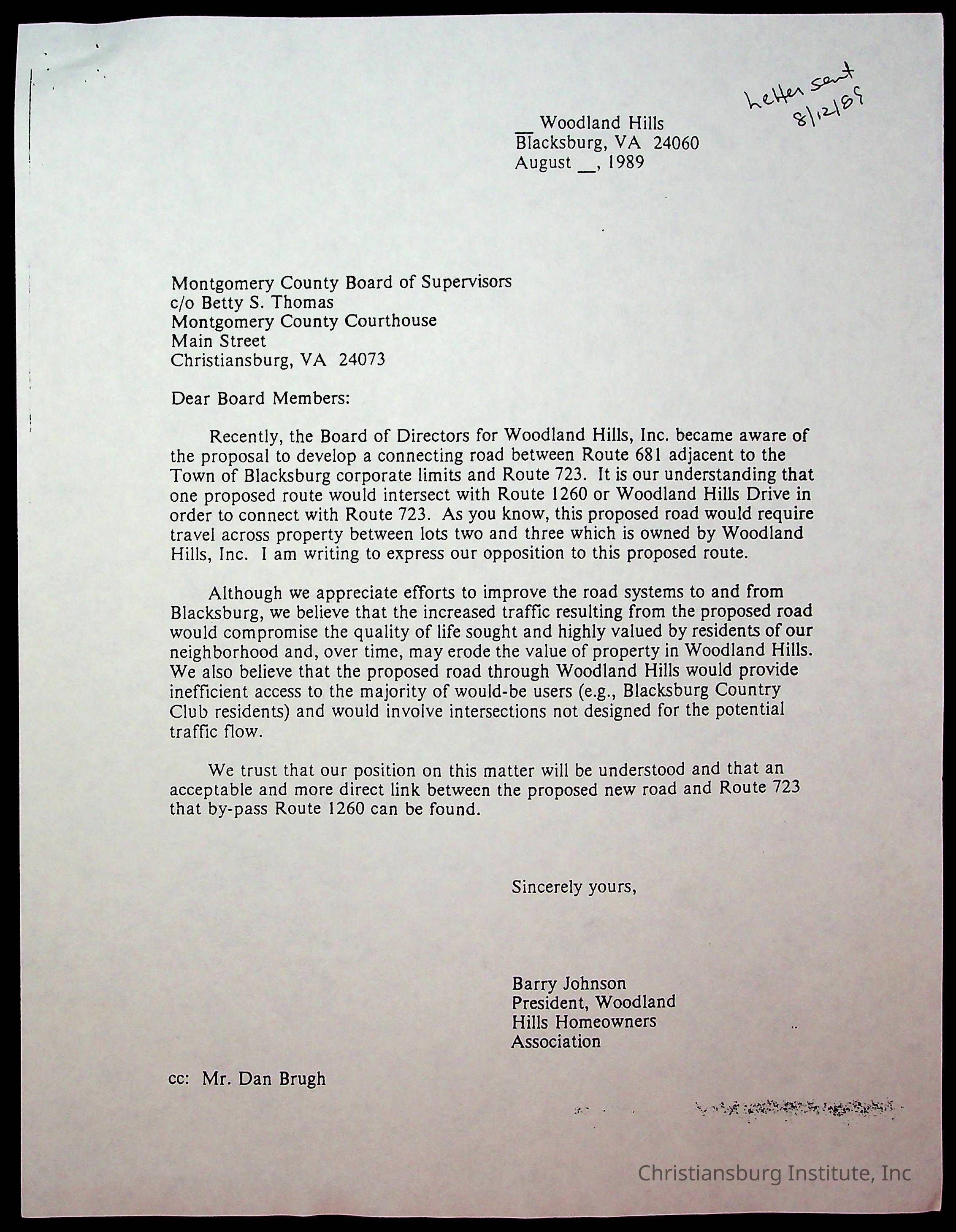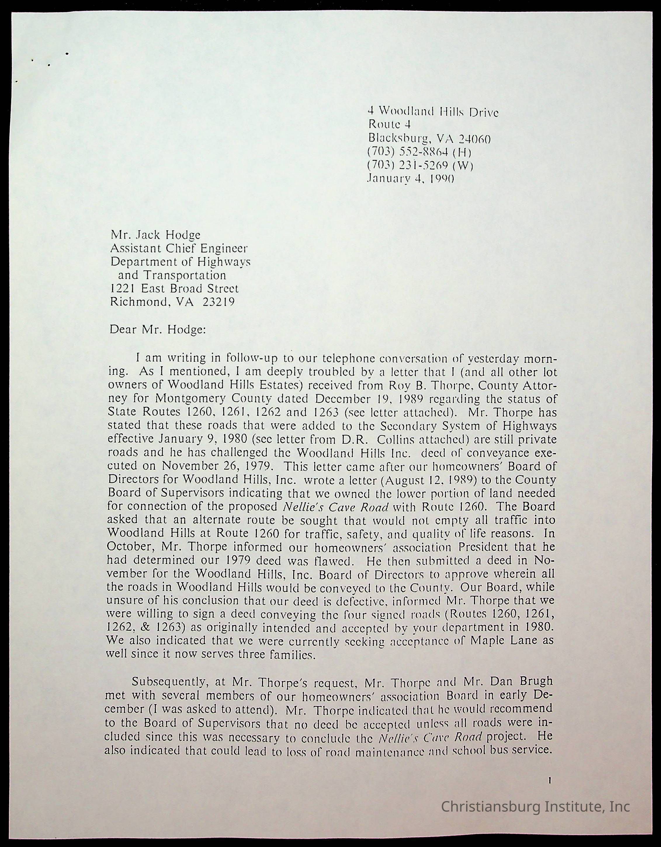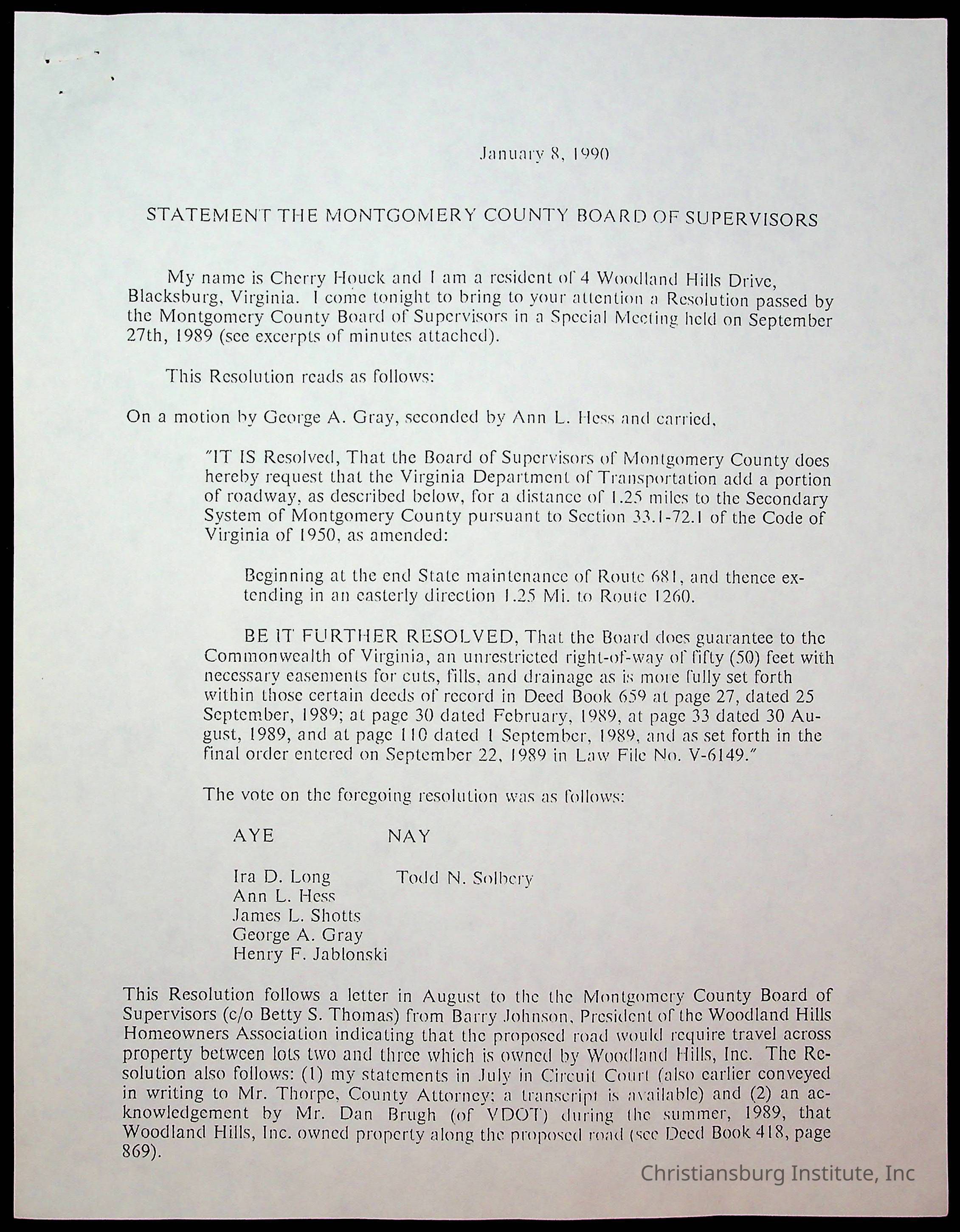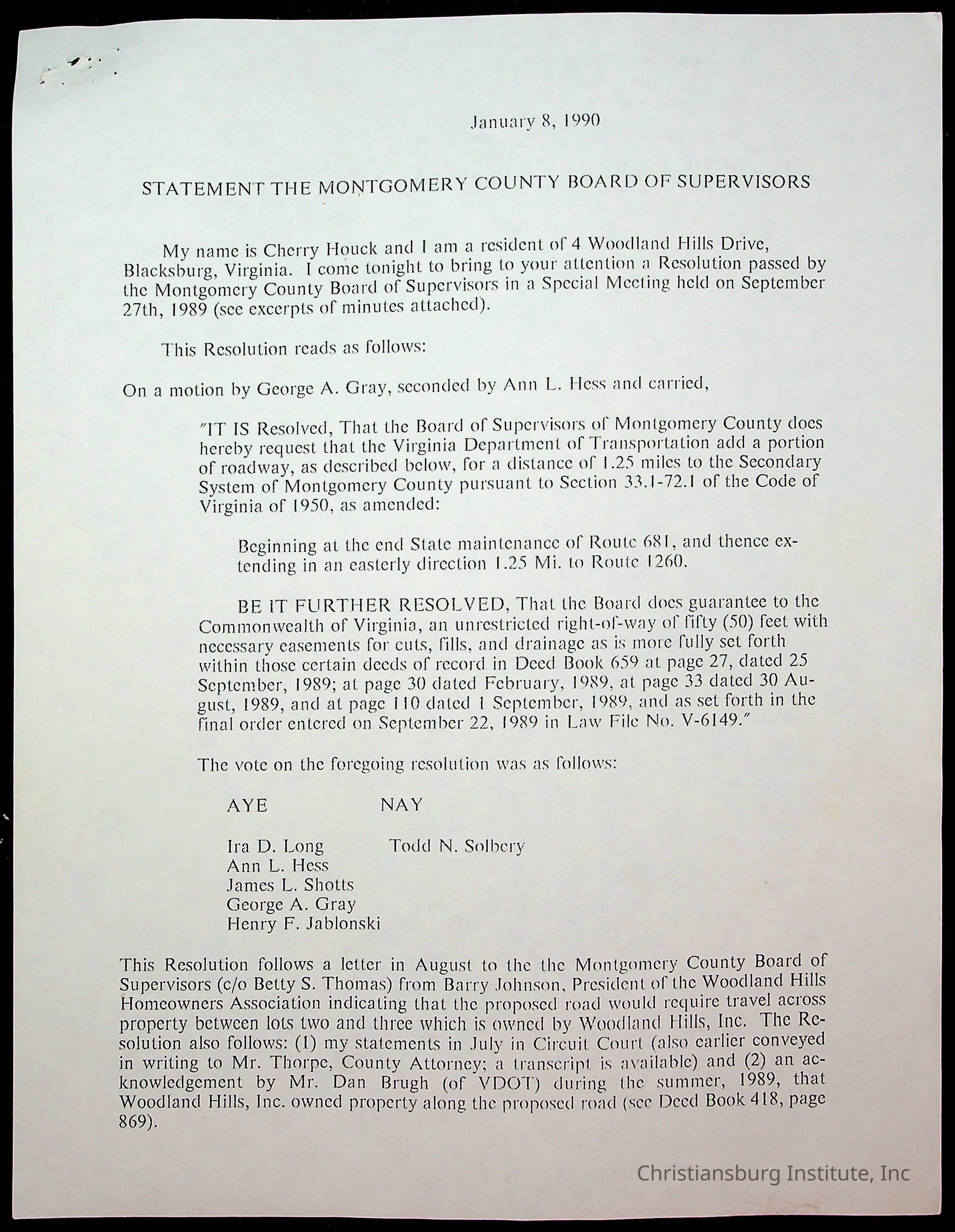 An archive of documents about the group, Woodland Hills, Inc, and their involvement with the Nellies Cave Road project, complied by Elizabeth Fine circa 1990s.