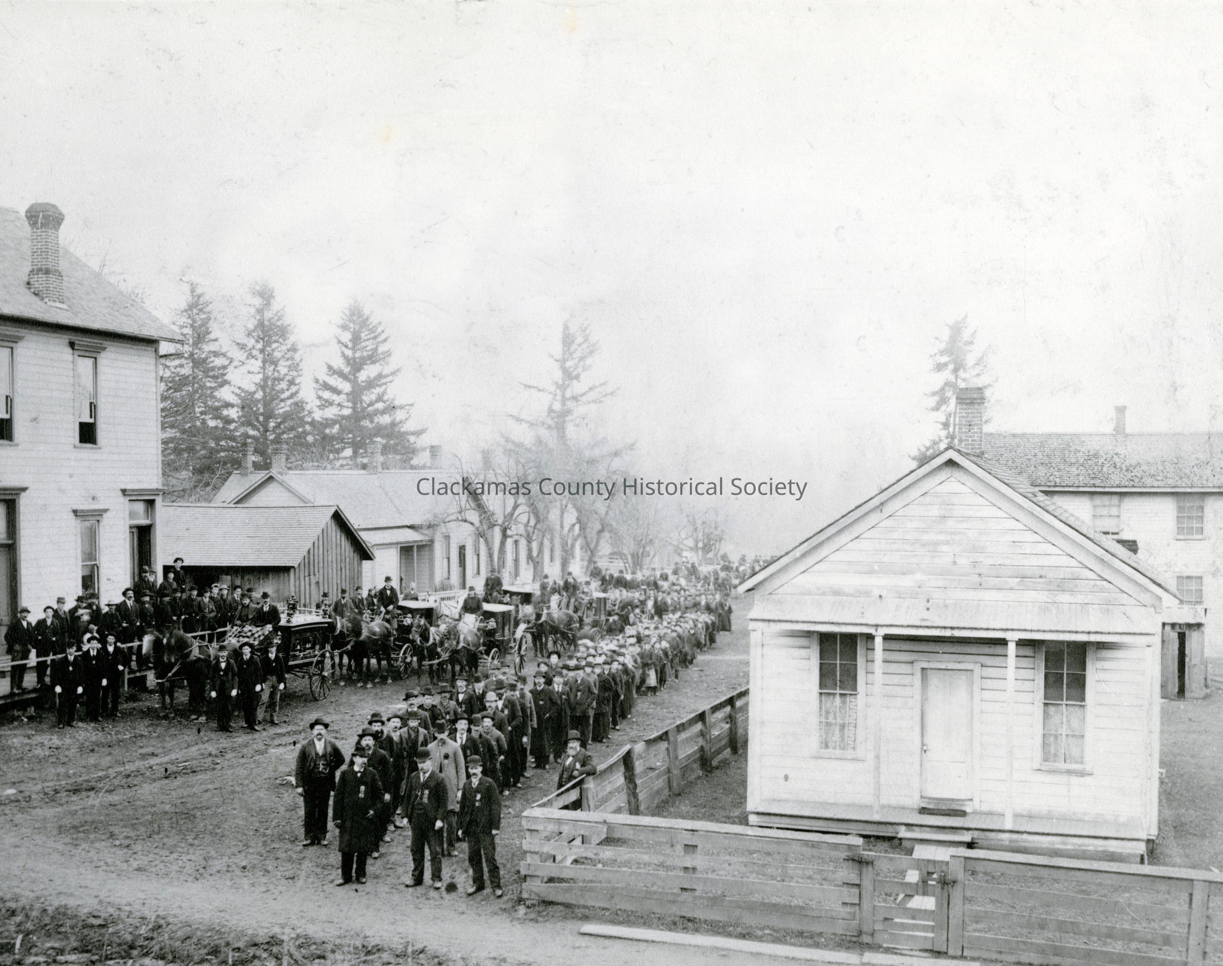 Funeral of Mrs. George (Dena) Prosser, corner of Durham and Church Streets, Oswego, Oregon. Odd Fellows Hall is on the left and still stands (2025).Made/Created