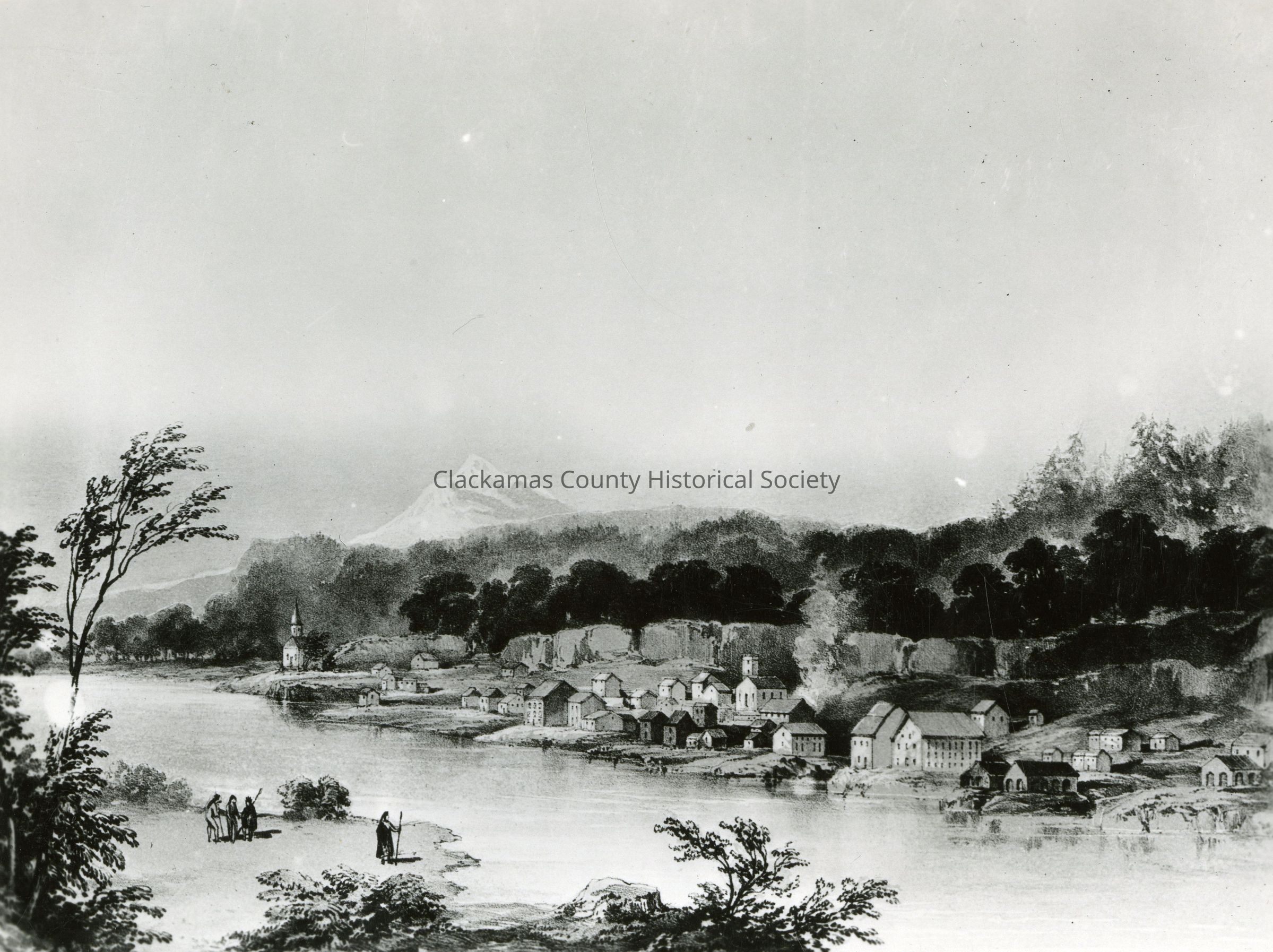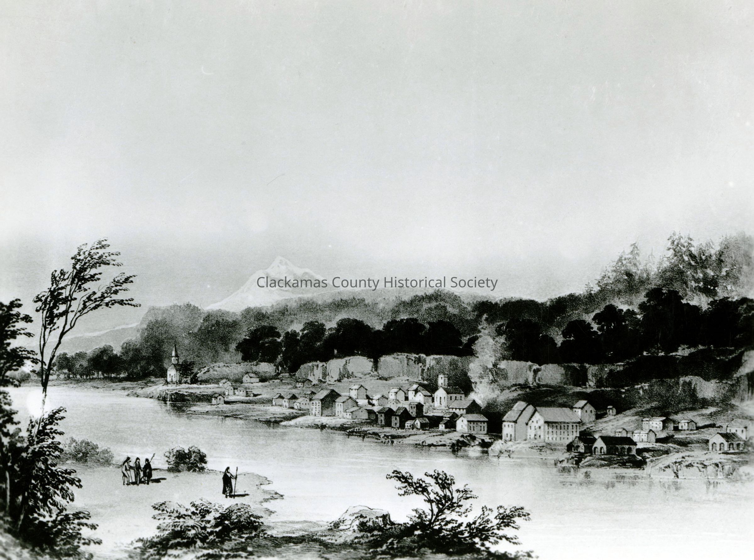 First Painting of Oregon City by British Capt. Sir Henry Warre. This American village on the Willamette River in 1846 had two churches, 100 houses, and its own local government. All had grown up after 5 years of immigration. This Library of Congress Color Painting was used in 20 Apr 1959 Life magazine.Made/Created