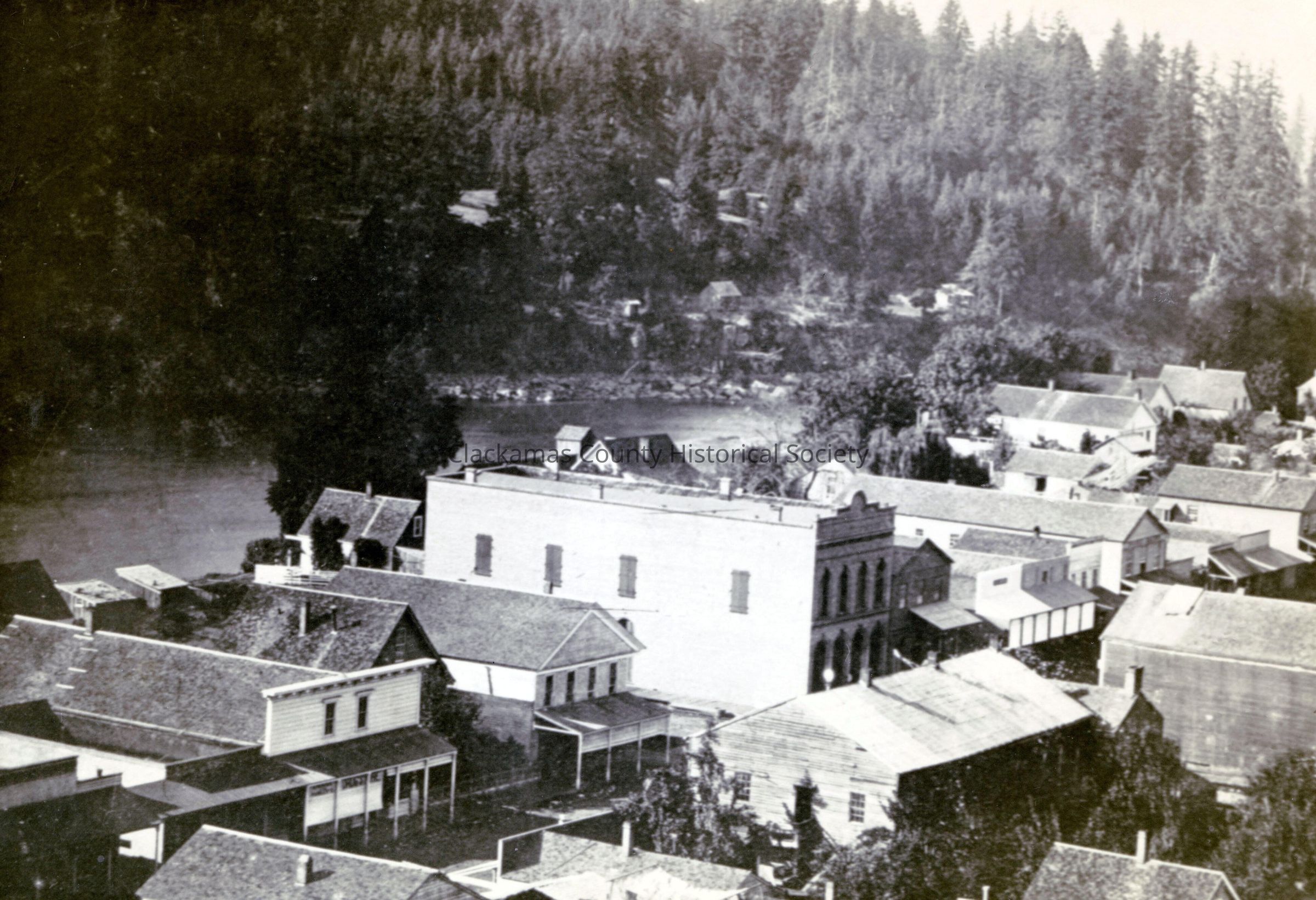 Charles Pope Hardware and Hall at the corner of 4th and Main Streets. 1874, as viewed from the Bluff.Made/Created