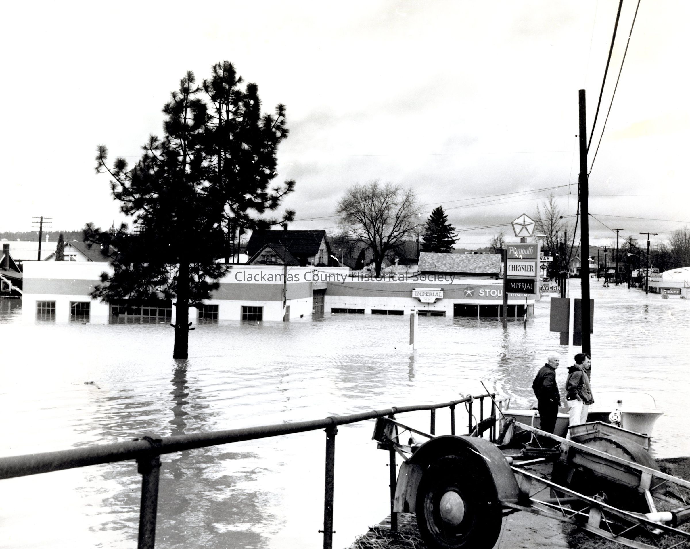 1964 flood. Stout's Motors. Oregon City. Motorboats and people. Flooded commercial area.Made/Created