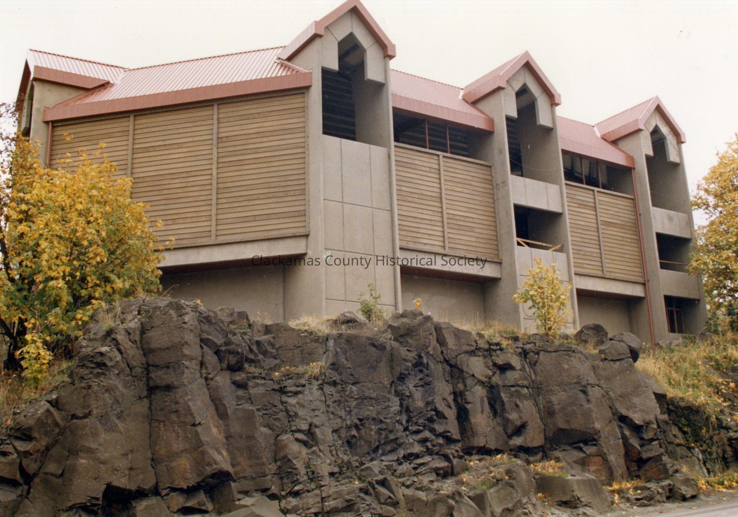 On back - MUSEUM OF HISTORY -- Overlooking the Willamette River Falls, 1/4 miles south of the railroad underpass on highway 99E. Building is built on basalt rock on the S.E. edge of the 99E (the old highway south to Salem). Picture taken for Fund Raising Public Relations effort by Marilynn and Paul, 1885Made/Created