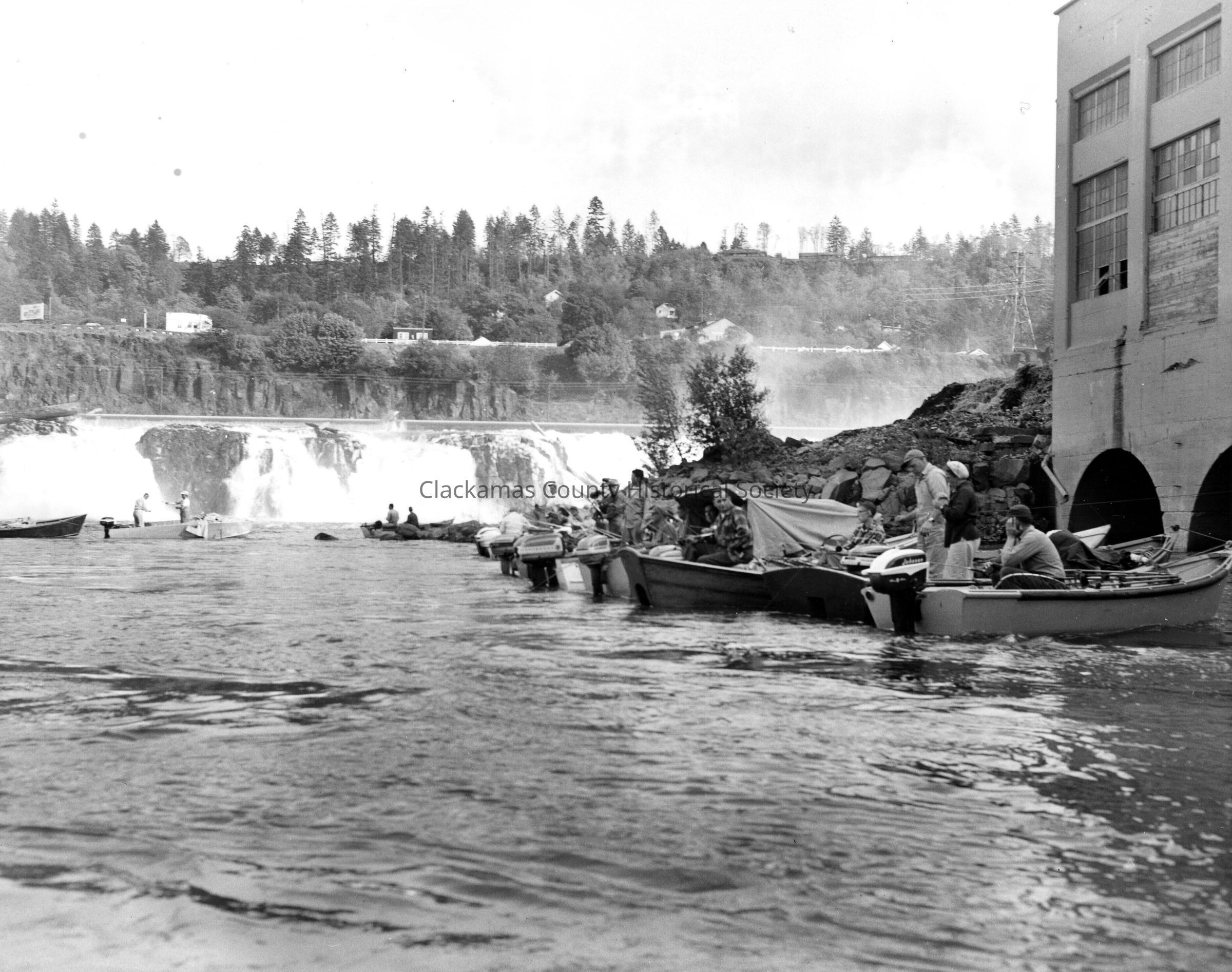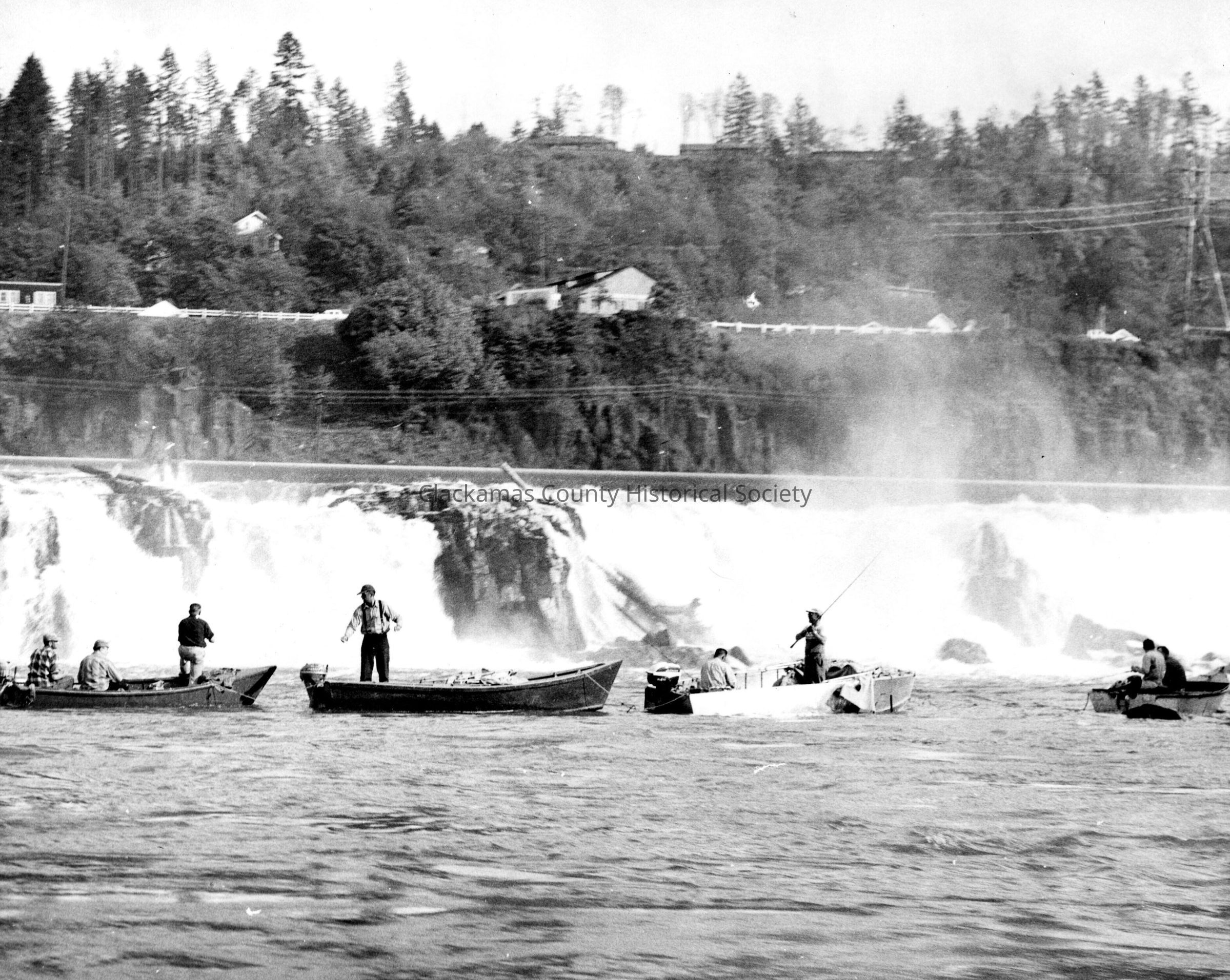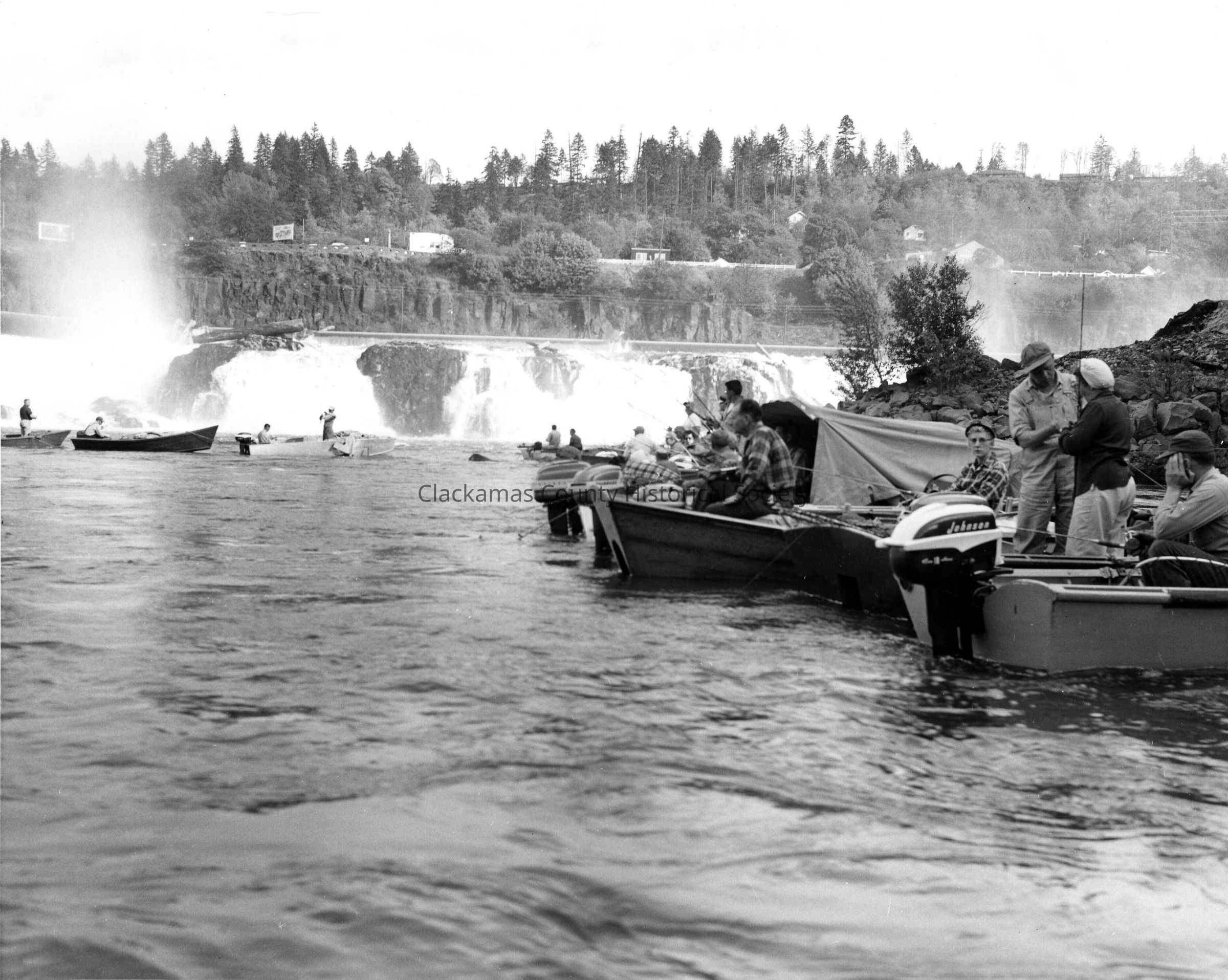 Fishing at Willamette Falls. "Hoglines". Boats, fishermen.Made/Created