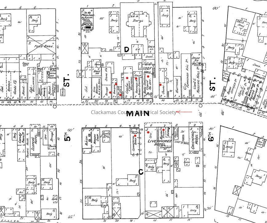 Flood of 1890. Main Street of Oregon City looking south after water had receded. Between Alley and 6th Street. Unidentified people. (See Sanborn Map below for location of visible structures)