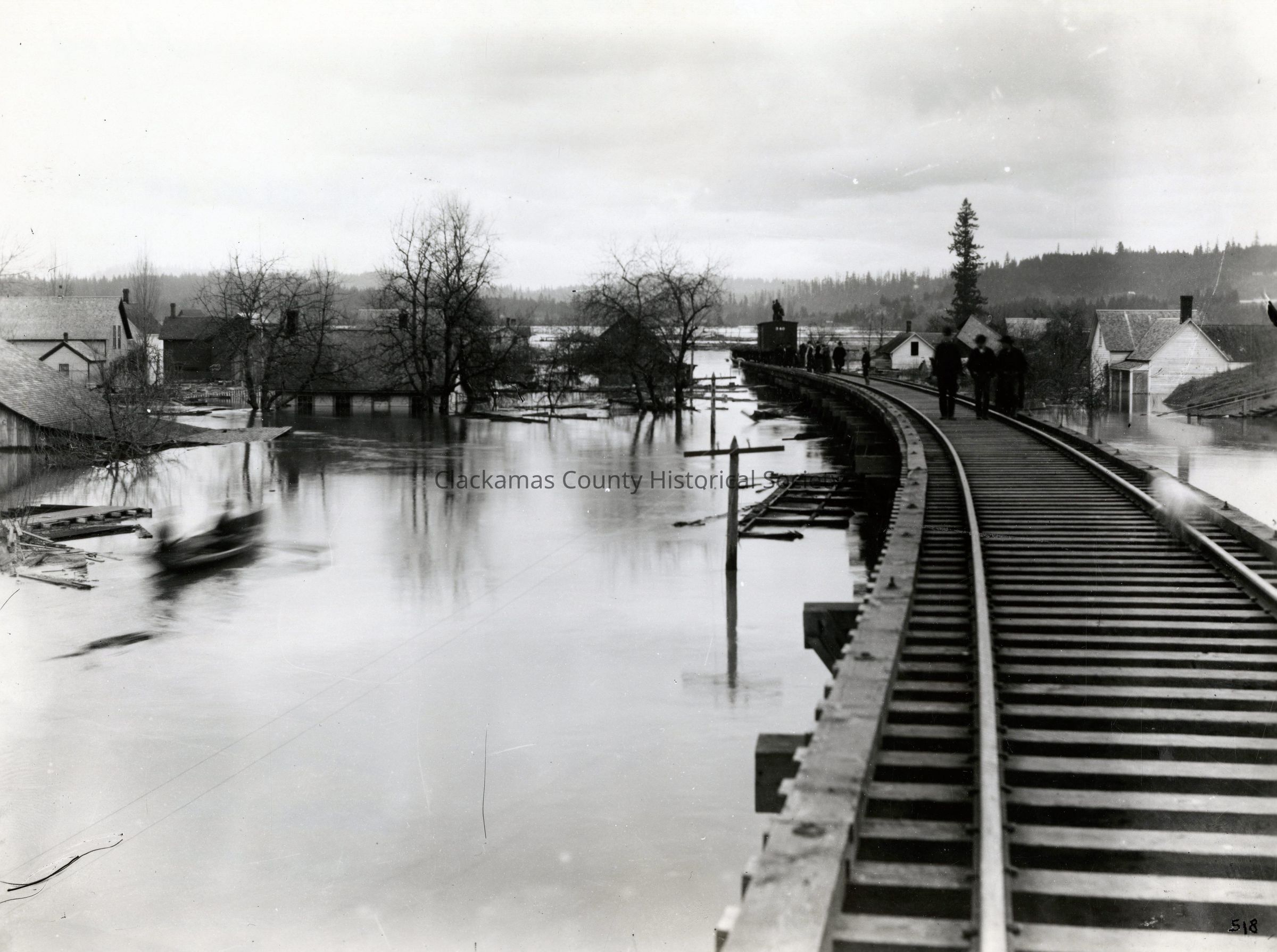 The 1890 Willamette River Flood. Showing Goose Flats from Railroad tracks looking east at 13th Street to Green Point. People walking on the tracks.