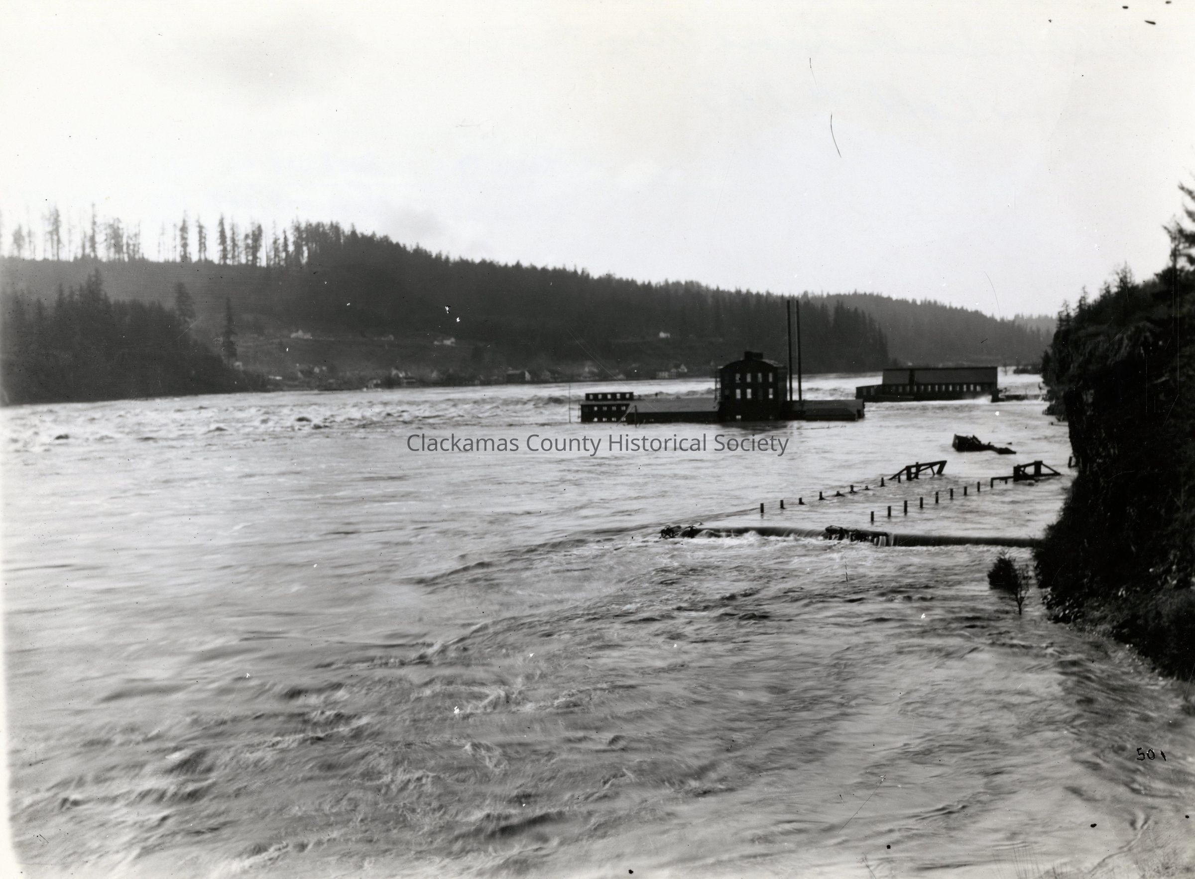 The 1890 Flood of the Willamette River looking at: the West Linn locks, Crown Paper Mill, and Willamette Pulp Mill. #501