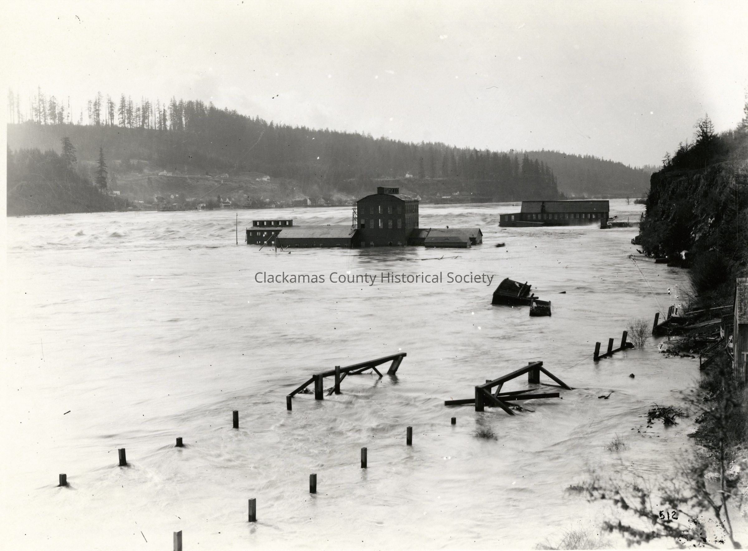 The 1890 Flood of the Willamette River looking at: the West Linn locks, Crown Paper Mill, and Willamette Pulp Mill. #512