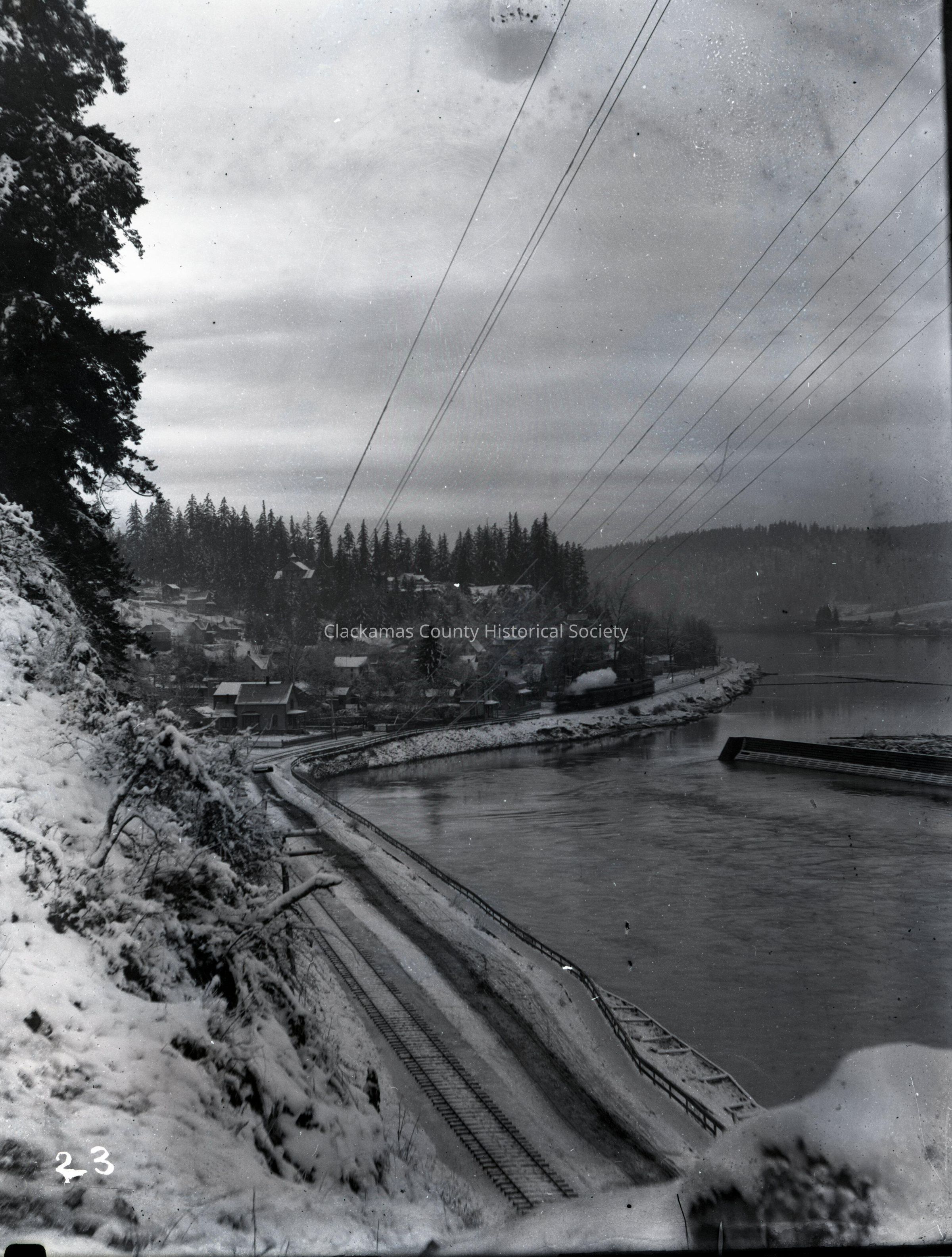 Canemah, looking south. Railroad tracks and walkway from a bluff, showing snow in 1899. Glass and film negatives in envelopes with photograph attachedMade/Created