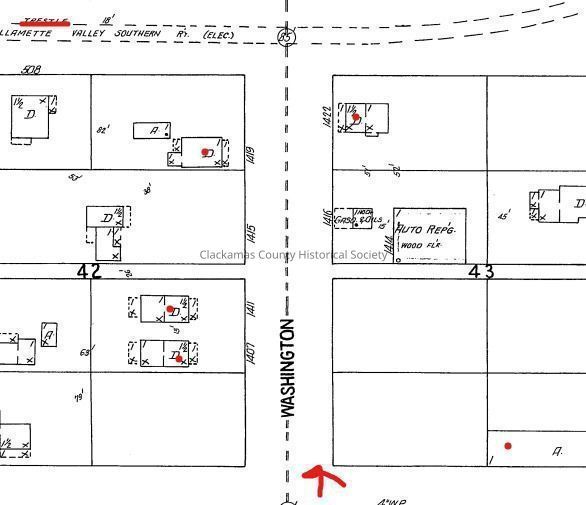 Update: Looking north on Washington at the 14th Street cross street. See Sanborn Map below. The WIllamette Valley Southern Railway was on a trestle when it crossed over Washington at 15th Street.Made/Created