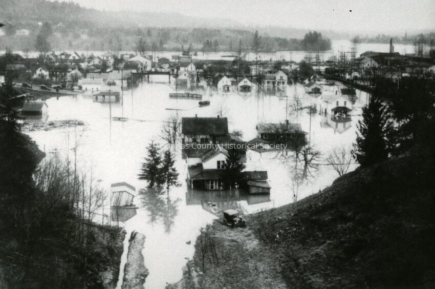Jan 1923 Flood in Oregon City. The view is from 14th Street Hill and Washington Street.Made/Created