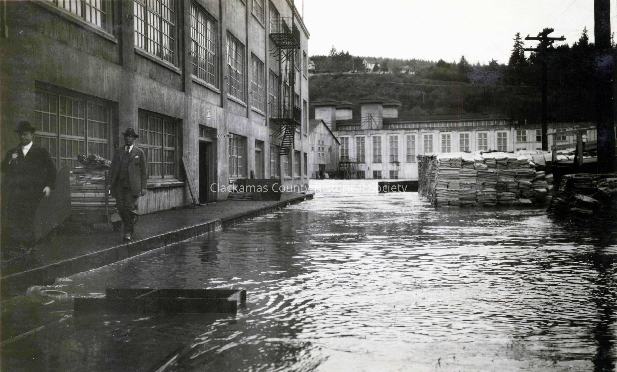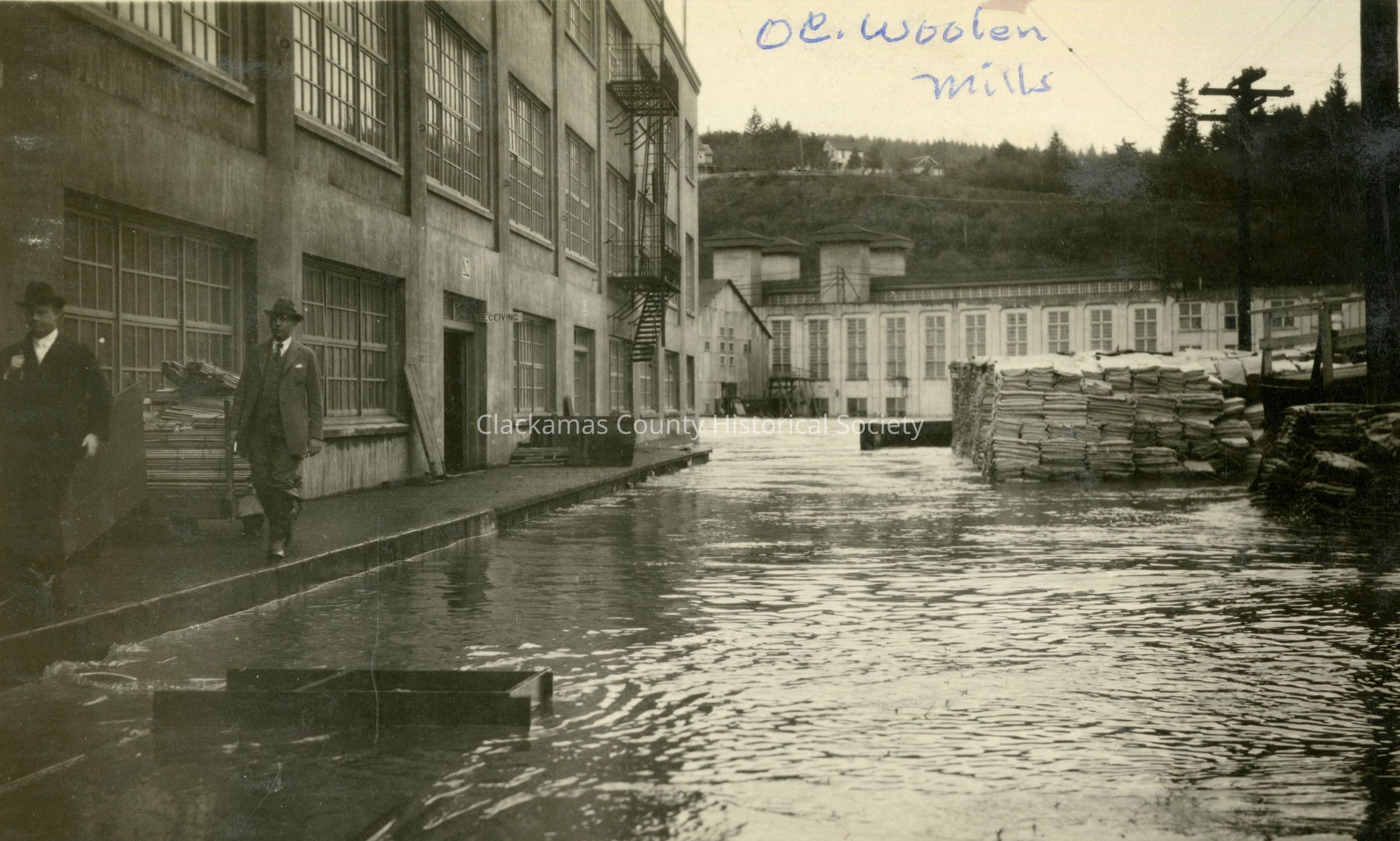 Oregon City Woolen Mills, flood of 1922. Unidentified people in photo. Postcard photo.Made/Created