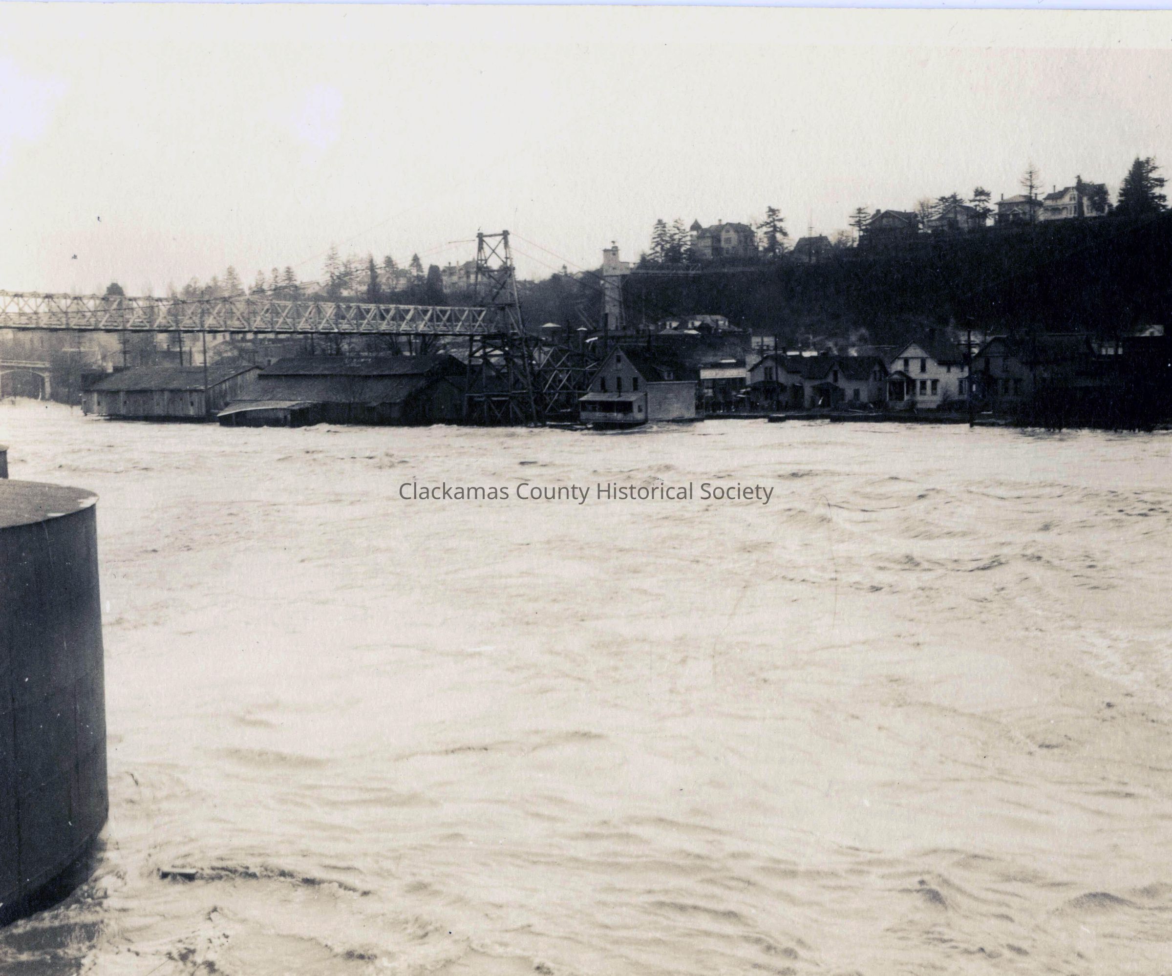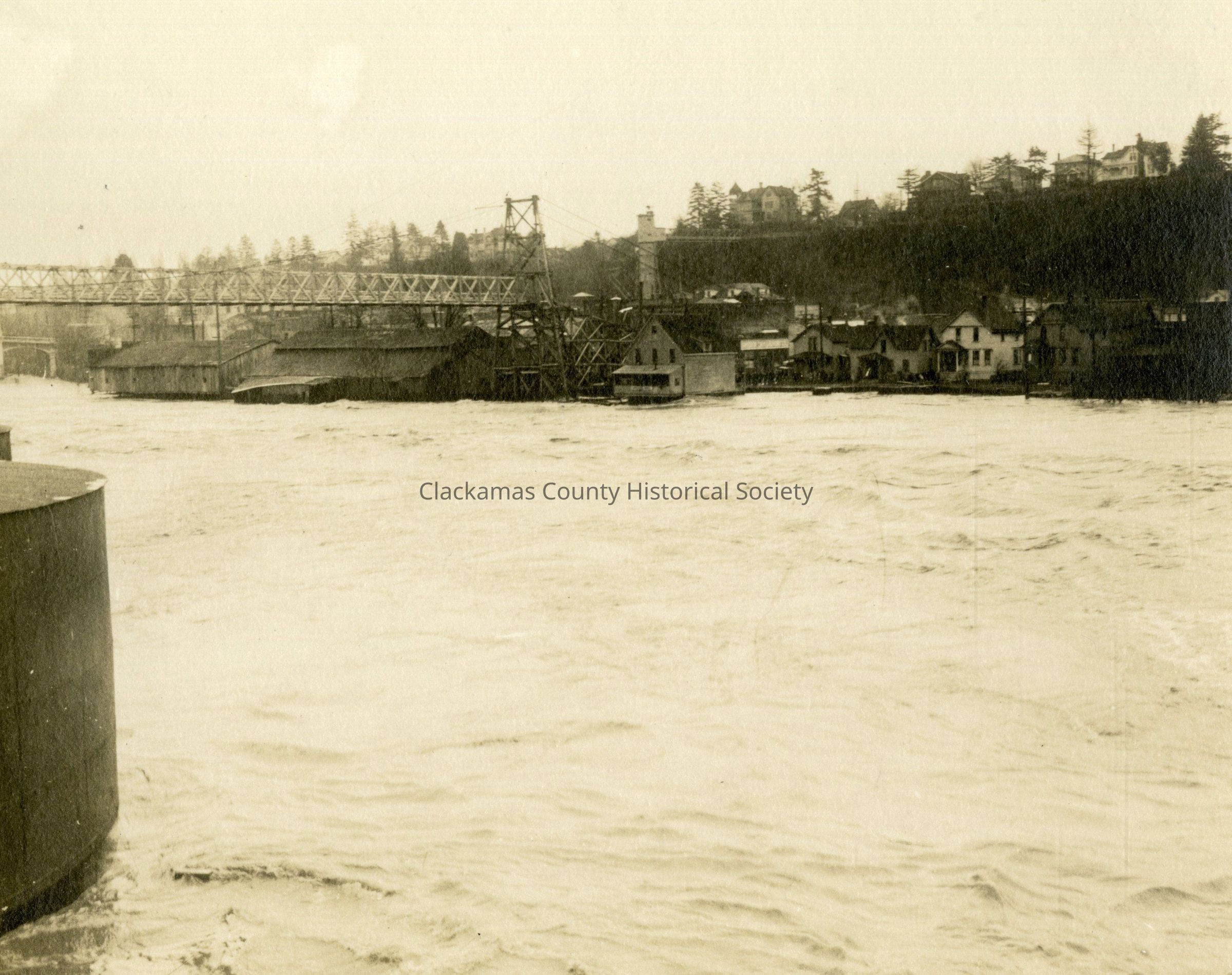 1922 Flood, Oregon City. Temporary Pedestrian Suspension Bridge in background.Made/Created