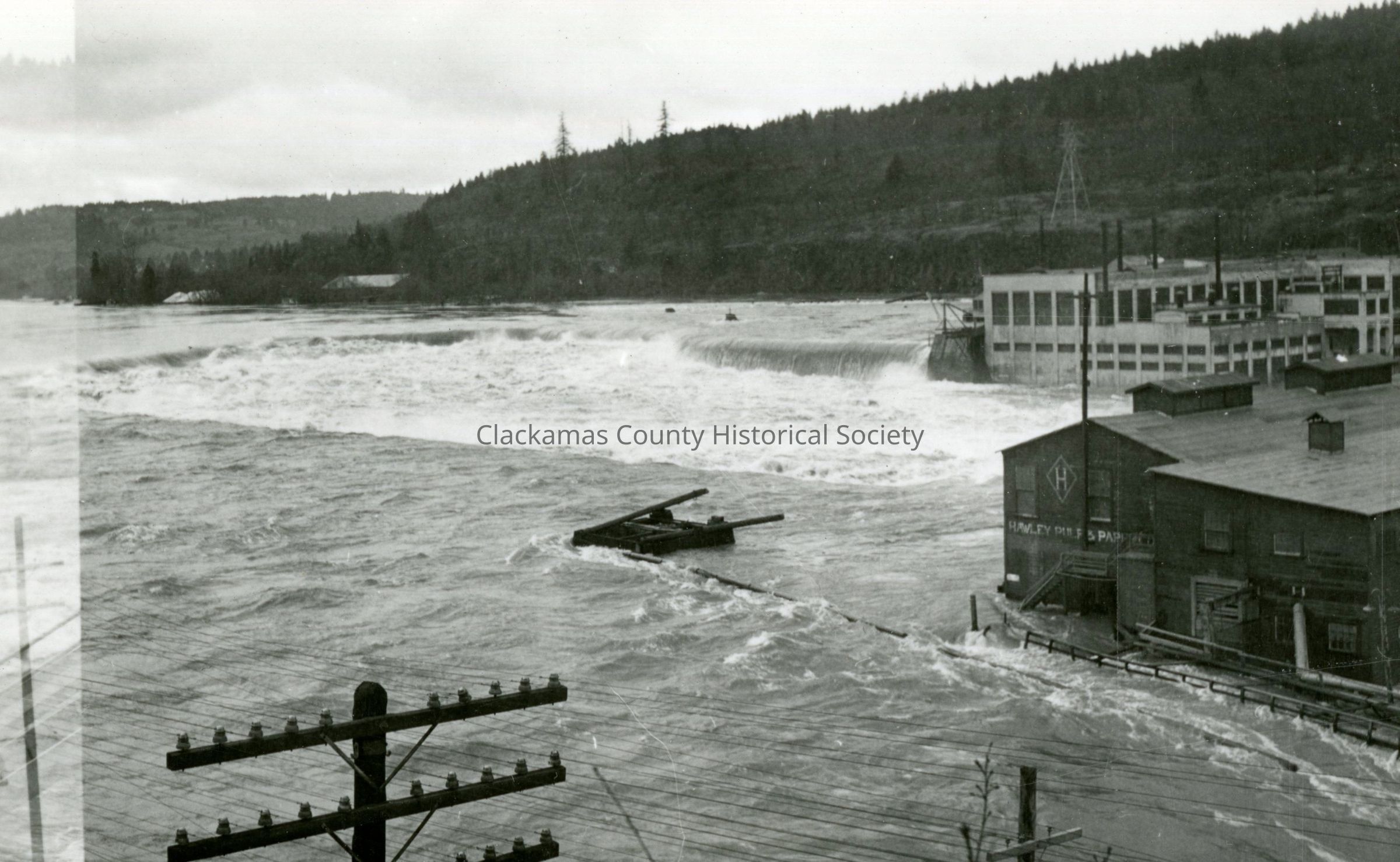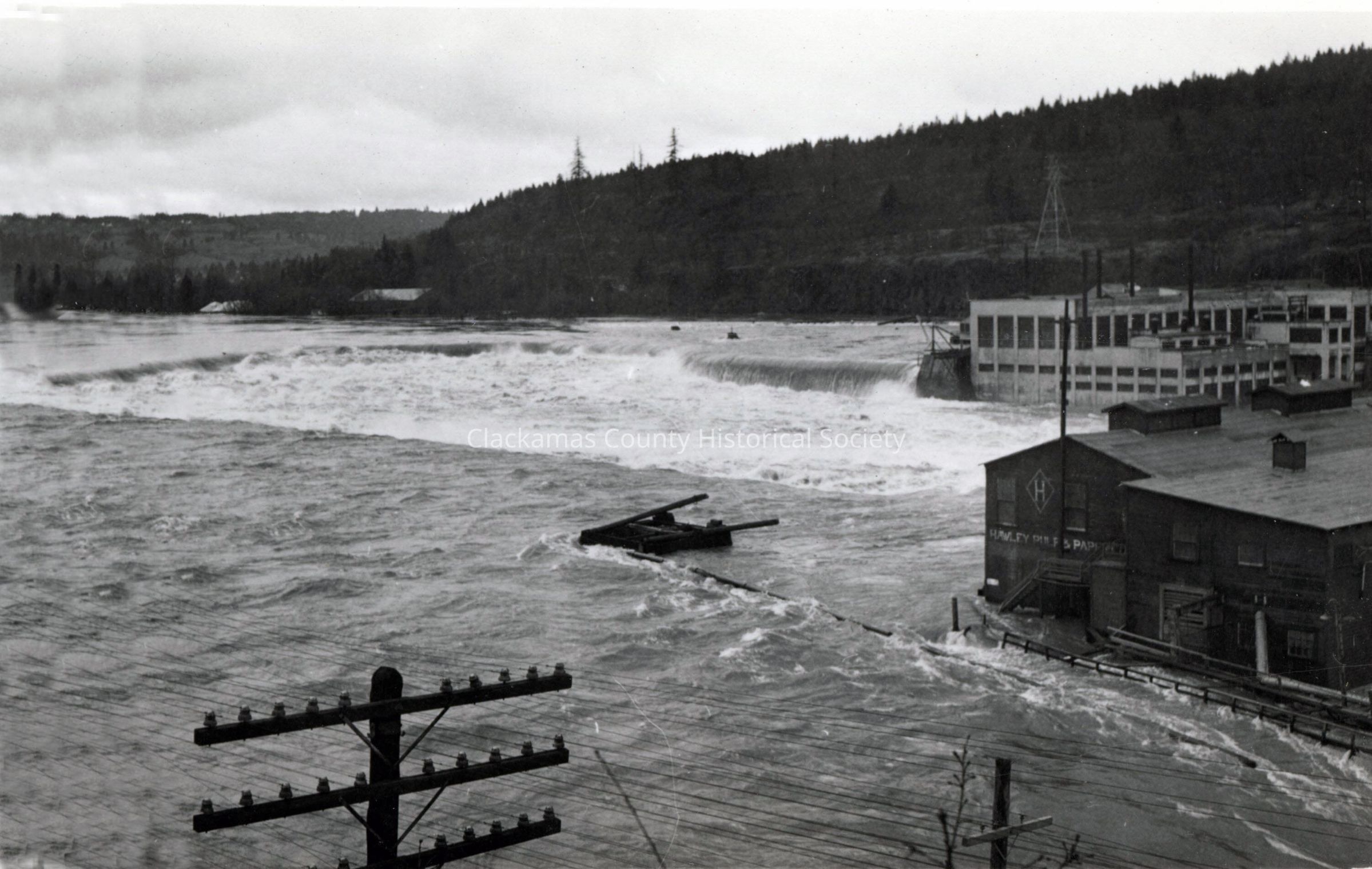 1943 flood, Oregon City. Willamette Falls and mills on West Linn side of river in photo.Made/Created