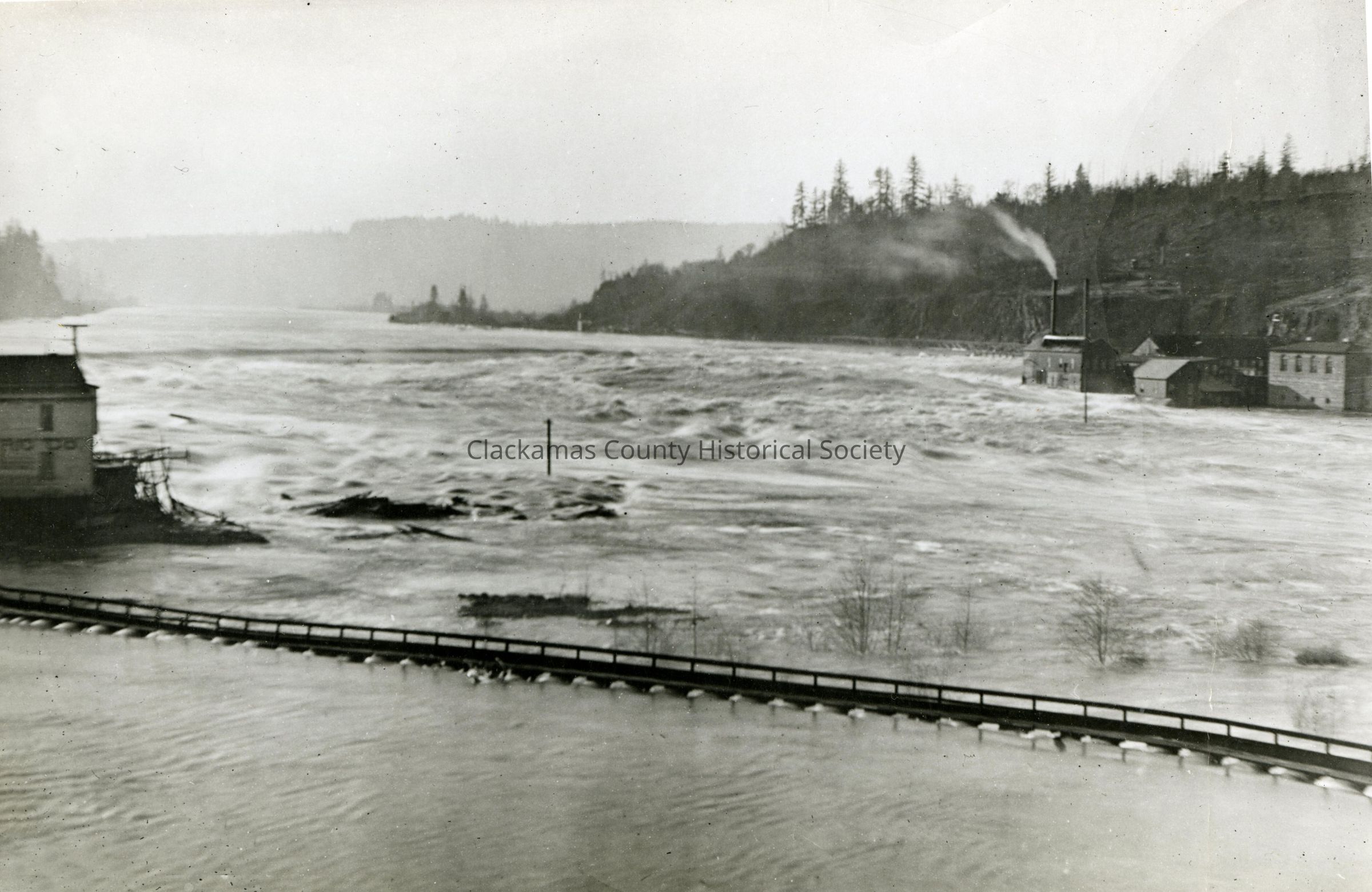 Willamette River Flood, 1943, Willamette Falls and Mills.