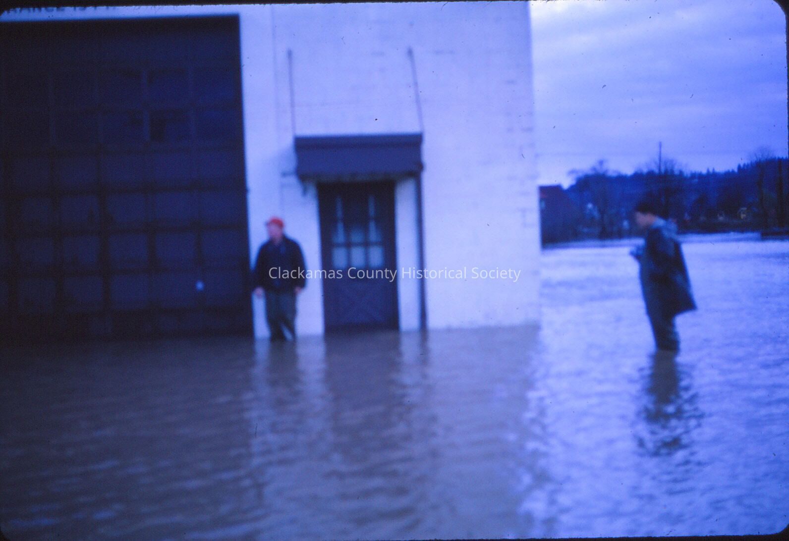 Photograph taken during the 1964 Oregon City, Oregon Willamette River Flood of Wymore Trucking building located at 16th and Main.