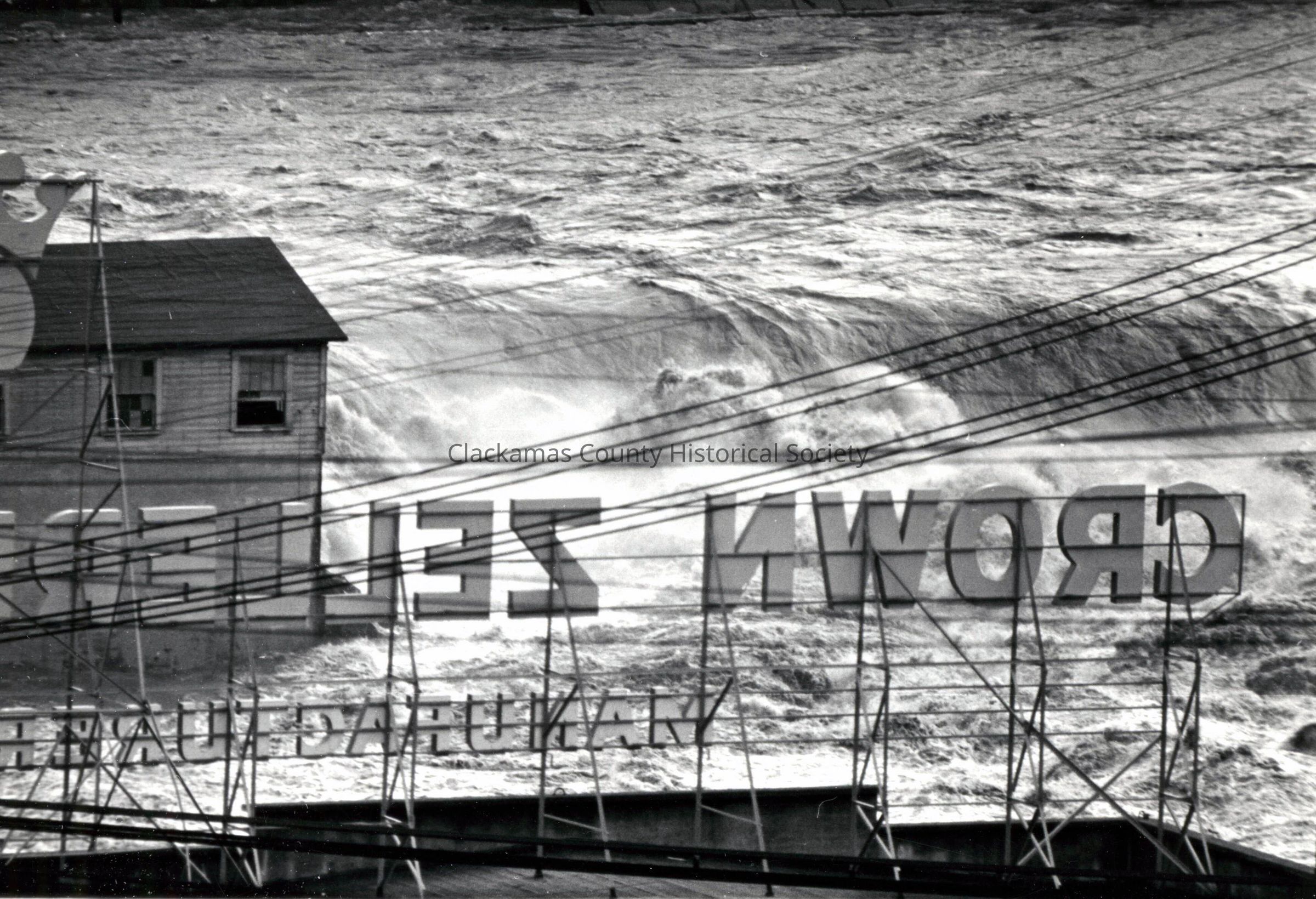 1964-1965 Flood. Crown Zellerbach Mill and Willamette Falls. Backside of Crown Zellerbach sign..Made/Created