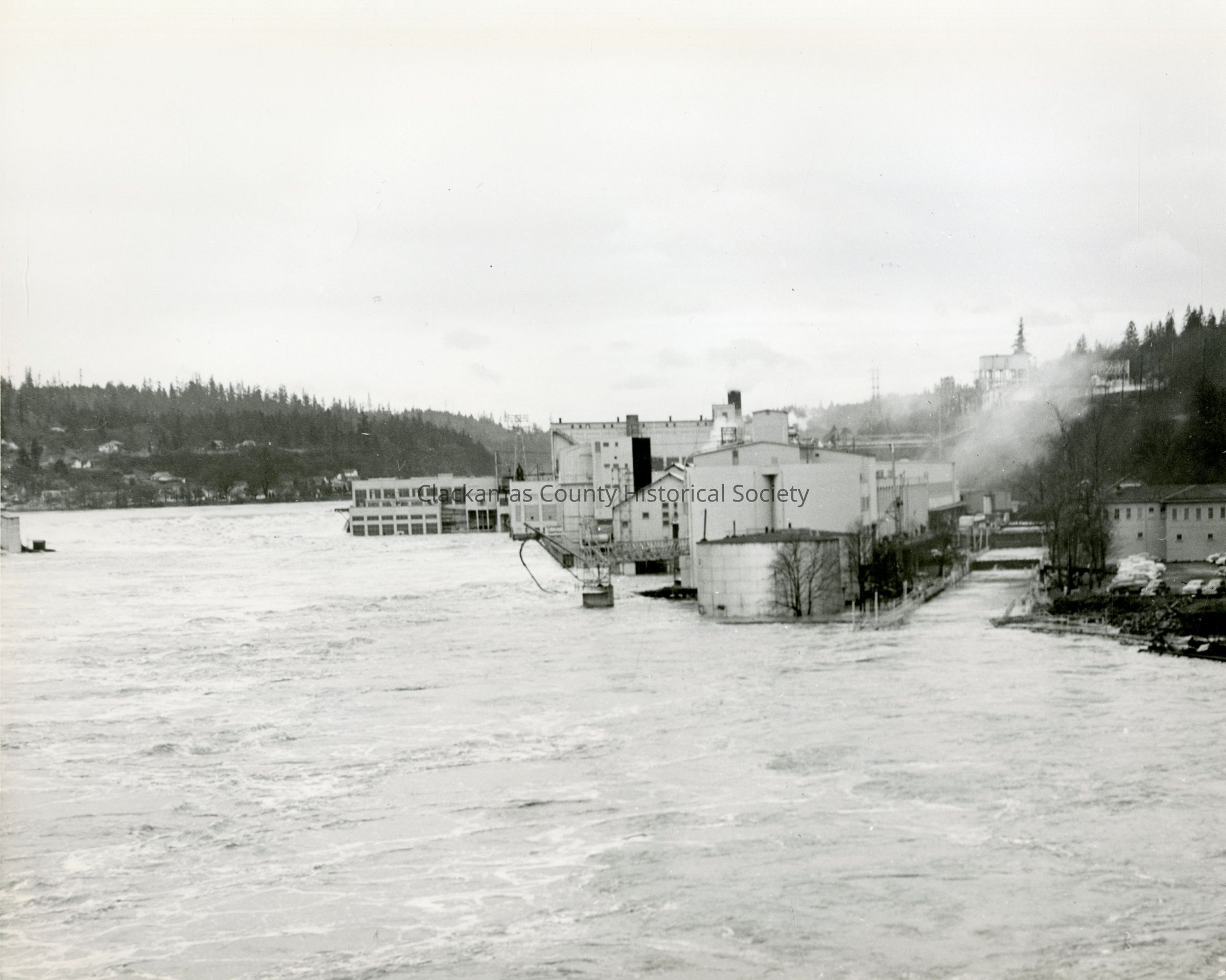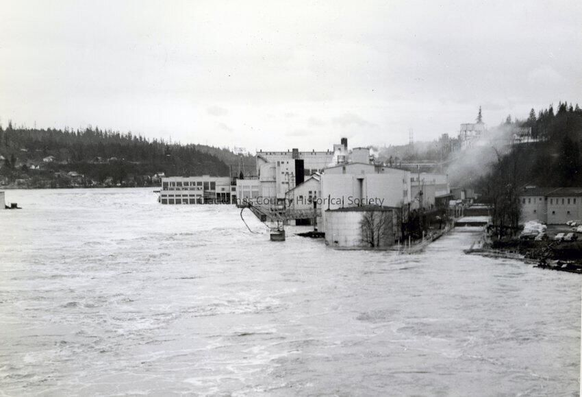 Flood of 1964. 5 Views: P-1598 (A) West Linn Mills upriver view; P-5235 B) Raging river looking across the river; p-5236 (C) View of lower basin of Willamette Falls showing West Linn Mills; p-5237 (D) Looking at river and West Linn Mills; and P-5237 (E) View from Oregon City side looking up river.
