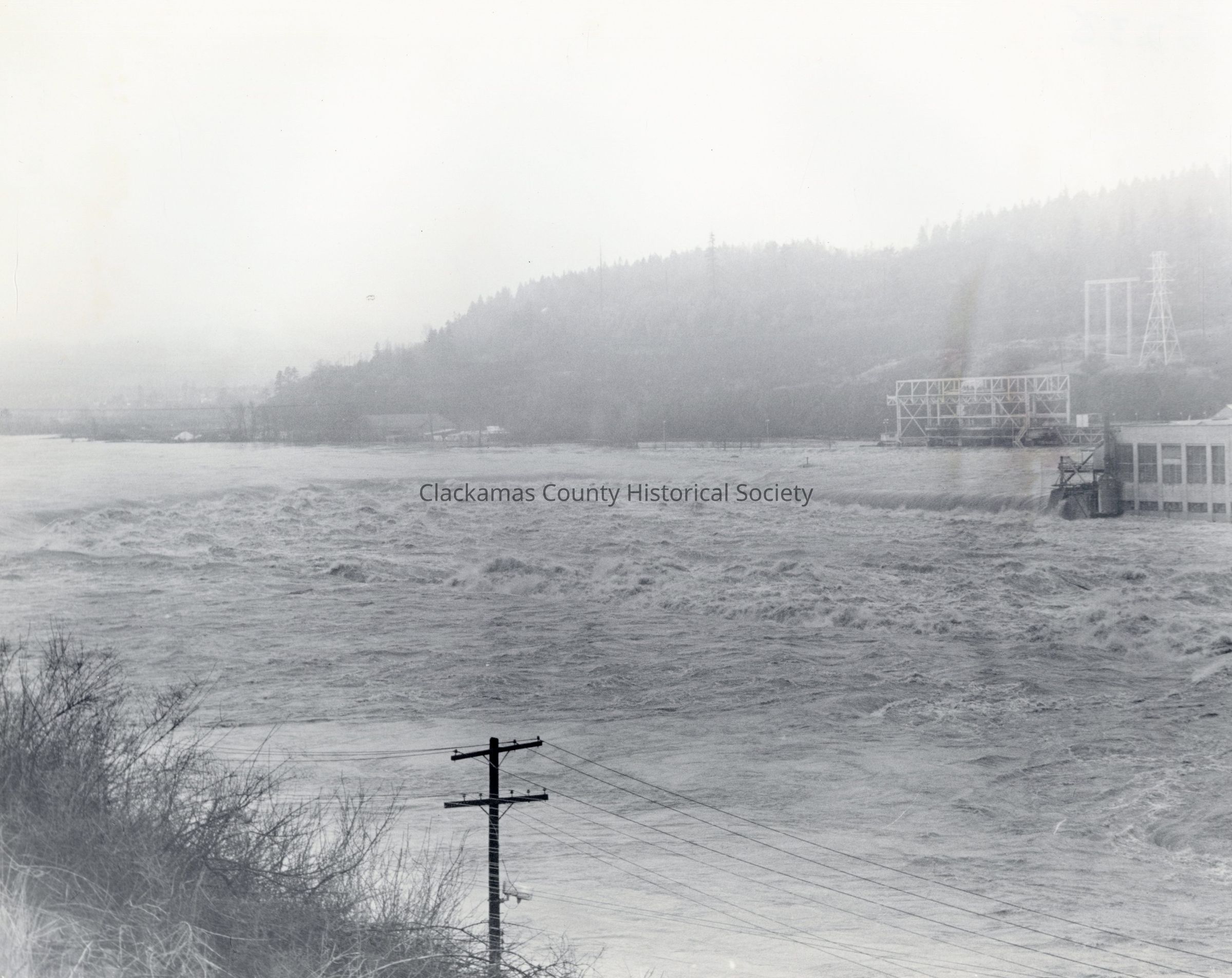 Flood of 1964. 5 Views: P-1598 (A) West Linn Mills upriver view; P-5235 B) Raging river looking across the river; p-5236 (C) View of lower basin of Willamette Falls showing West Linn Mills; p-5237 (D) Looking at river and West Linn Mills; and P-5237 (E) View from Oregon City side looking up river.
