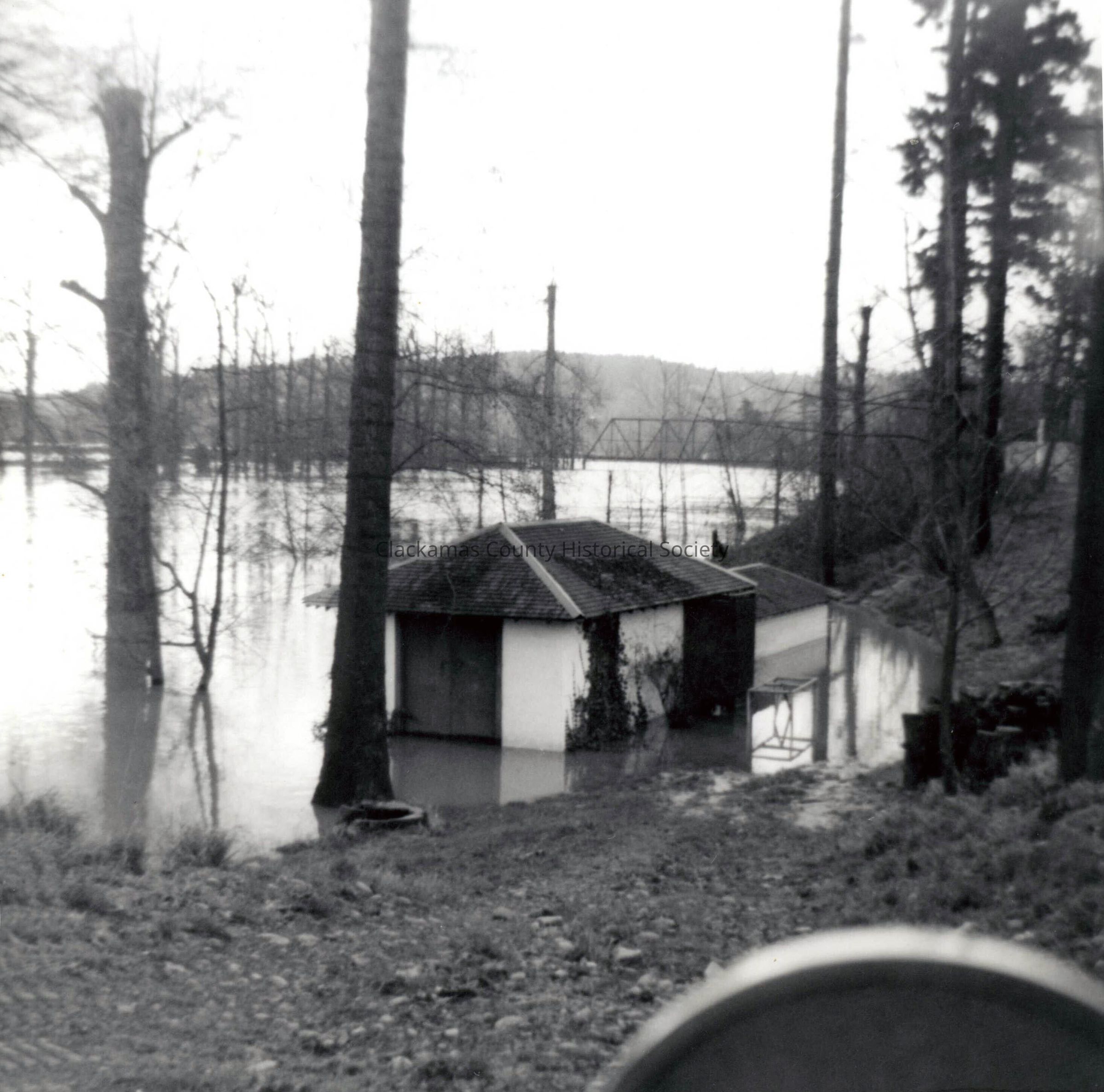 1964 Flood. Harvey Cross Park in Gladstone. Bridge "Interurban Bridge?" in the background. Clackamas RiverMade/Created